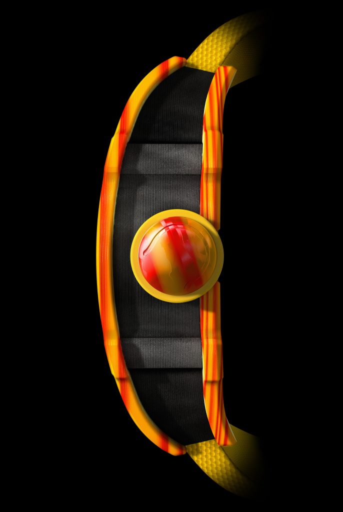 La terre battue est connue pour accentuer les effets. La RM 27-03 ne ménage pas les siens, comme en témoignent les couleurs jaune et rouge de son boîtier en Quartz TPT®, hommage à la patrie originelle de Rafa. L’intensité remarquable des coloris a été obtenue par l’imprégnation de résines teintées dans des couches de silice de 45 microns grâce au procédé unique de dépose mis au point par North Thin Ply Technology (NTPT®) et qui permet d’intercaler ces fibres avant de les chauffer ensuite à 120°C. Dans le cas particulier de l’obtention d’une nouvelle couleur avec du Quartz TPT®, la stabilité des coloris développée selon les normes REACH, en tenant compte des préoccupations de biocompatibilité et d’inaltérabilité constitue une véritable prouesse de la part des ingénieurs de Richard Mille et de NTPT. Une fois le composite obtenu, la finalisation du boîtier et l’usinage des matériaux exige encore de nombreuses heures de travail.