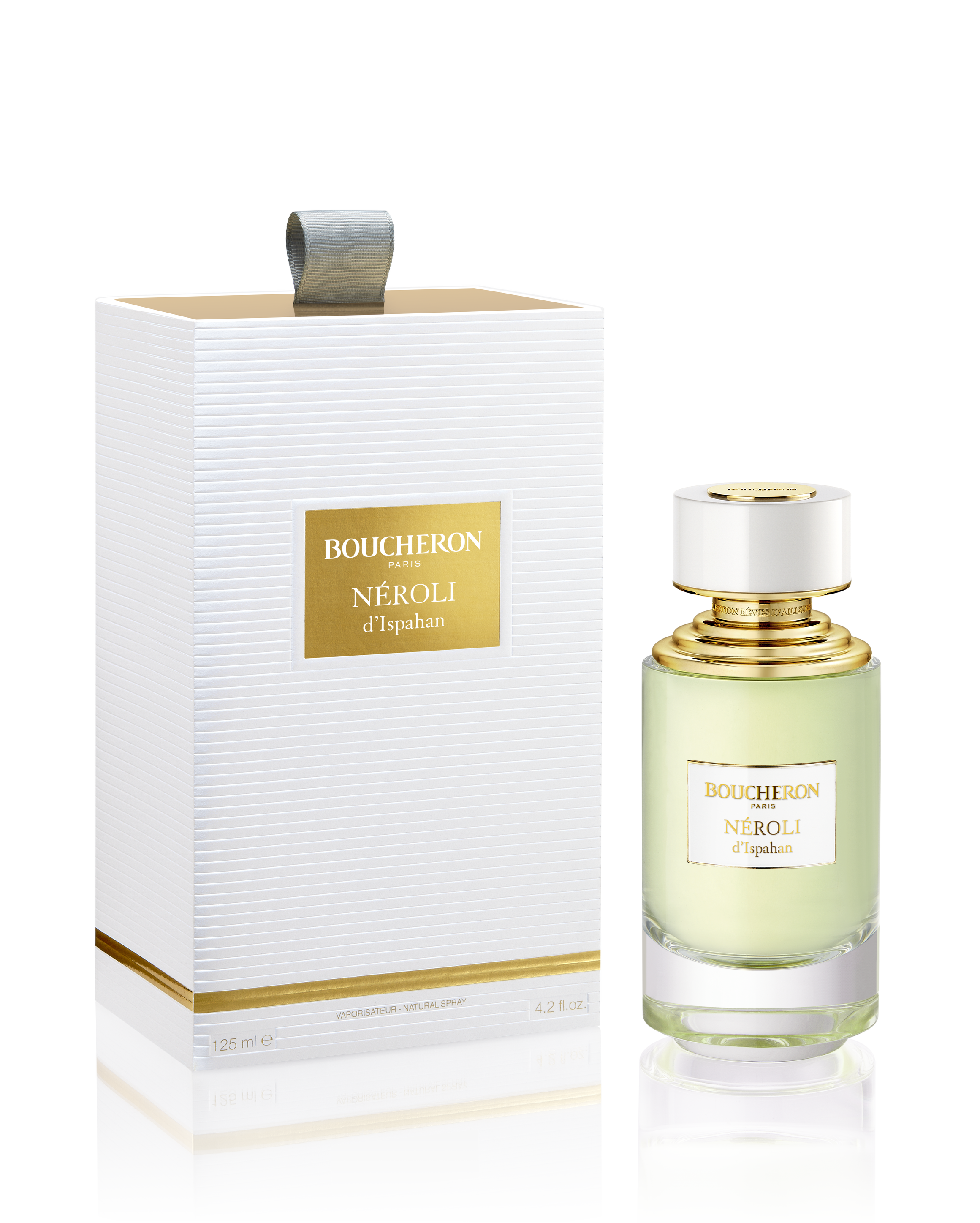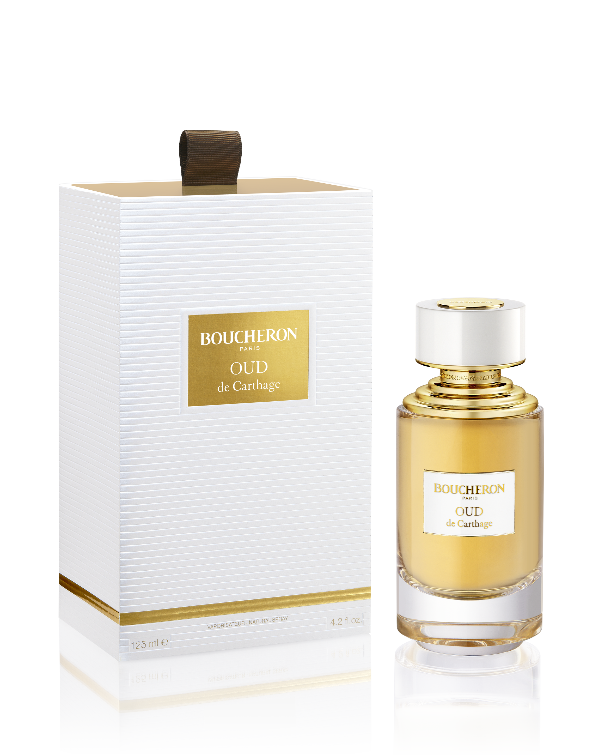 Chaque parfum de la collection se présente dans un luxueux coffret habillé de papier matière blanc immaculé, orné d’un double godron doré et au nom inscrit sur un rectangle d’or. Une discrète boucle de ruban gros grain, motif iconique de la Maison Boucheron, à la couleur de la fragrance permet de révéler d’un geste le flacon.