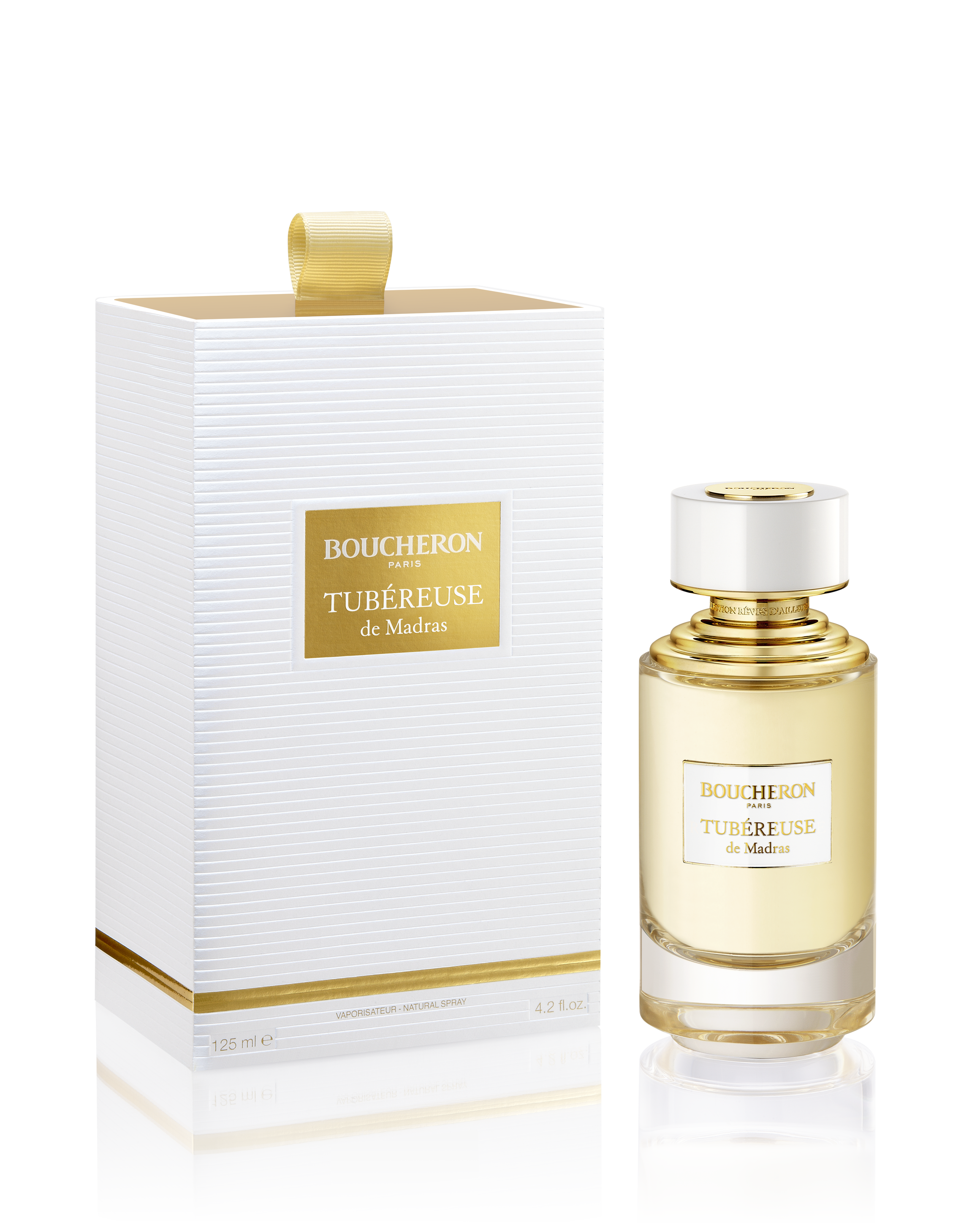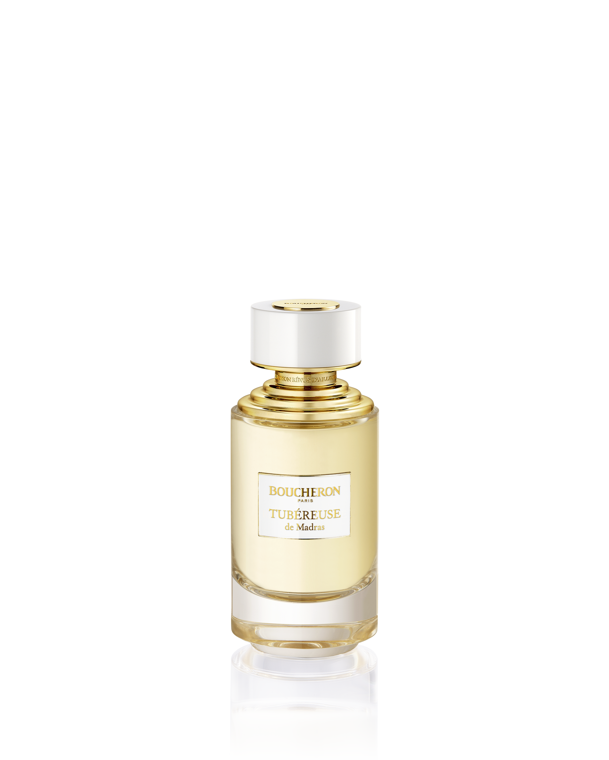 La légendaire cité indienne de Madras, berceau de l’exploitation de la Tubéreuse, offre aux explorateurs Boucheron une culture foisonnante de vie, d’espoir et de générosité, ainsi que le caractère sacré de cette fleur, au centre de toutes les croyances. Comme si elle avait conscience de ses charmes capiteux, la Tubéreuse dresse ses pétales blancs en étoile aux vents alizés de l’Inde Orientale. Son coeur, d’un jaune pâle, évoque la pureté du Diamant Jonquille. La Tubéreuse est un joyau de sensualité qui se prête à toutes les interprétations. Elle révèle ici sa puissance addictive par ses facettes veloutées, crémeuses et solaires. Un jeu de textures pour atteindre l’équilibre parfait. Un floral blanc tubéreuse, onctueux et solaire En tête, les pétales riches et délicats de la Fleur d’Oranger illuminent la Feuille de Violette, dévoilant une nature luxuriante par ses facettes végétales et fraiches. Le Fruit de la Passion, pulpeux et acidulé, vient compléter ce trésor olfactif par ses couleurs resplendissantes. L’exotisme de l’Ylang Ylang et la douceur amandée de la Fleur de Frangipanier confèrent à ce coeur floral une intensité solaire qui sublime la majesté envoûtante d’une Infusion de Tubéreuse. Le parfum voluptueux de la Vanille apporte en fond une fluidité réconfortante accentuée par le sillage sensuel et addictif de l’Absolu de Tubéreuse. Onctueux et confortable, le Santal se pare des effluves enivrants de cette fleur sacrée.