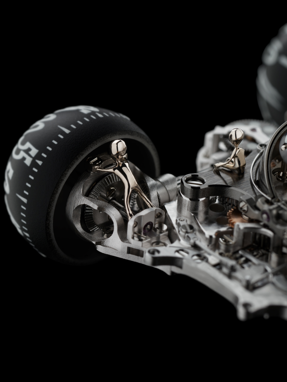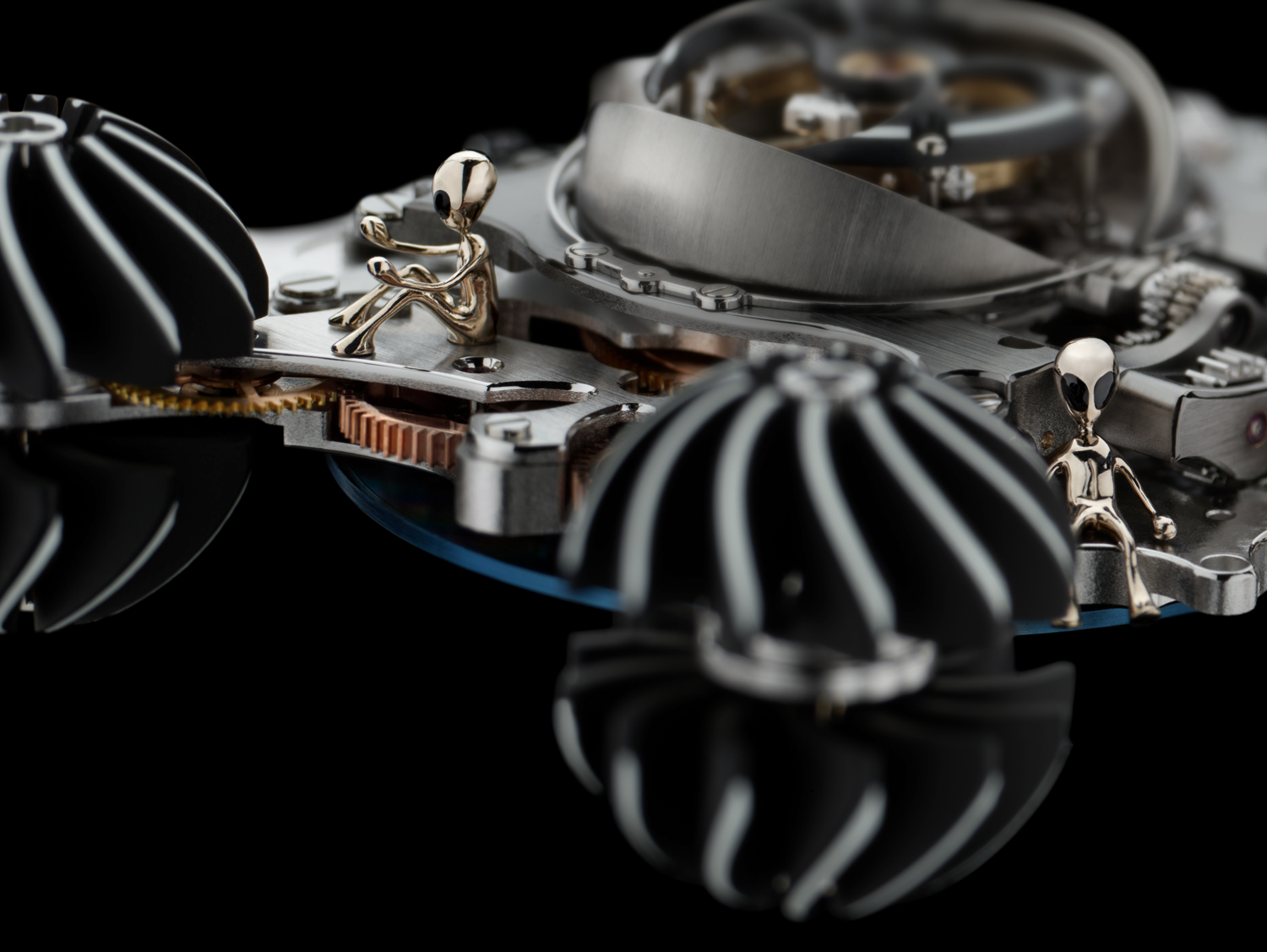 Un équipage d’aliens, réalisés individuellement à la main en or blanc. Le commandant extra-terrestre de la HM6 Alien Nation est calé dans son cockpit extérieur, alors que la bonne marche du moteur HM6 est supervisée par 5 aliens placés à l’intérieur, sur le mouvement. Il faut regarder attentivement pour les trouver: la délicatesse de ces sculptures microscopiques créées par le graveur Olivier Kuhn est sidérante. Leurs bras et cous sont plus fins qu’un grain de sable… Chaque alien est unique, et un équipage de 6 exige plus d’un mois de travail artisanal intense à plein temps.