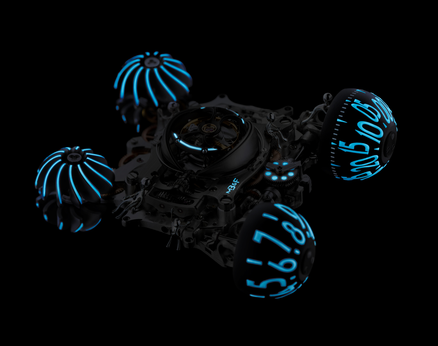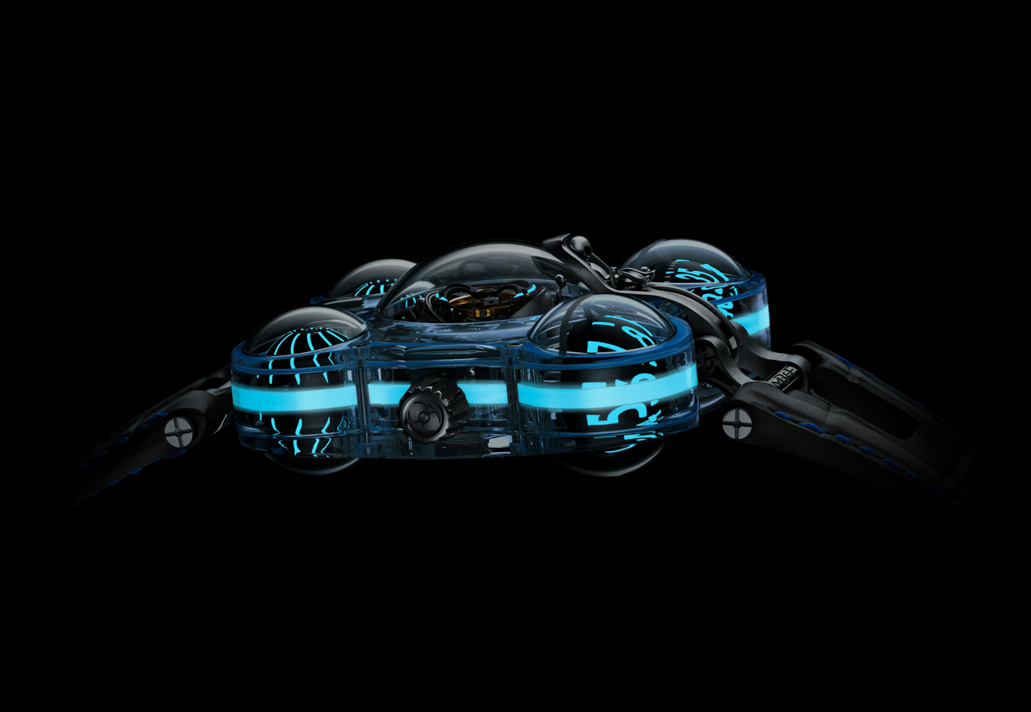 Il fait noir dans l’espace… Le vaisseau spatial HM6 s’illumine dans la nuit grâce à un mélange de Super-LumiNova – accentuant certaines parties du mouvement – et d’AGT Ultra, la matière luminescente produite par Ambient Glow Technology et sublimée par notre ami James Thompson/Black Badger.