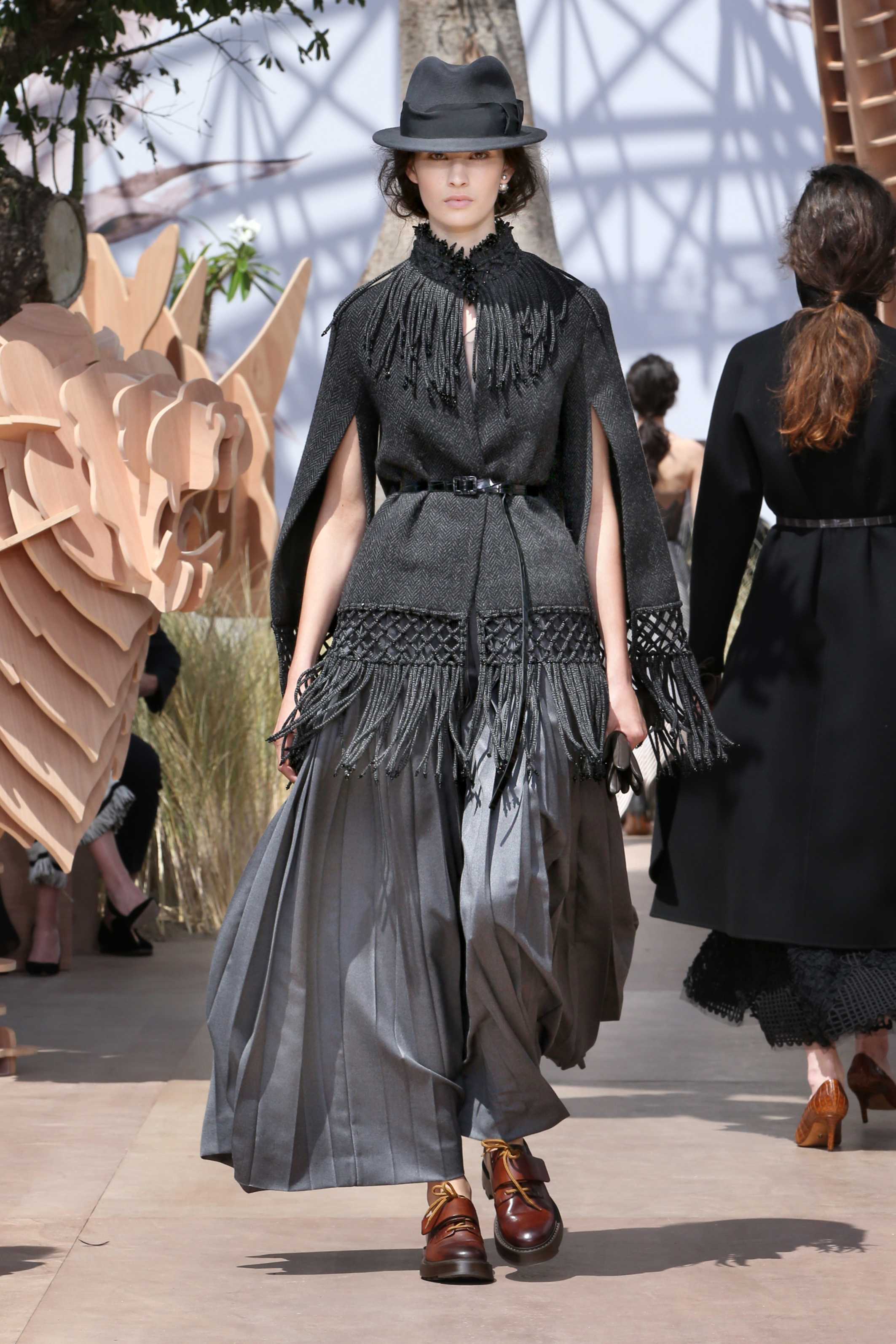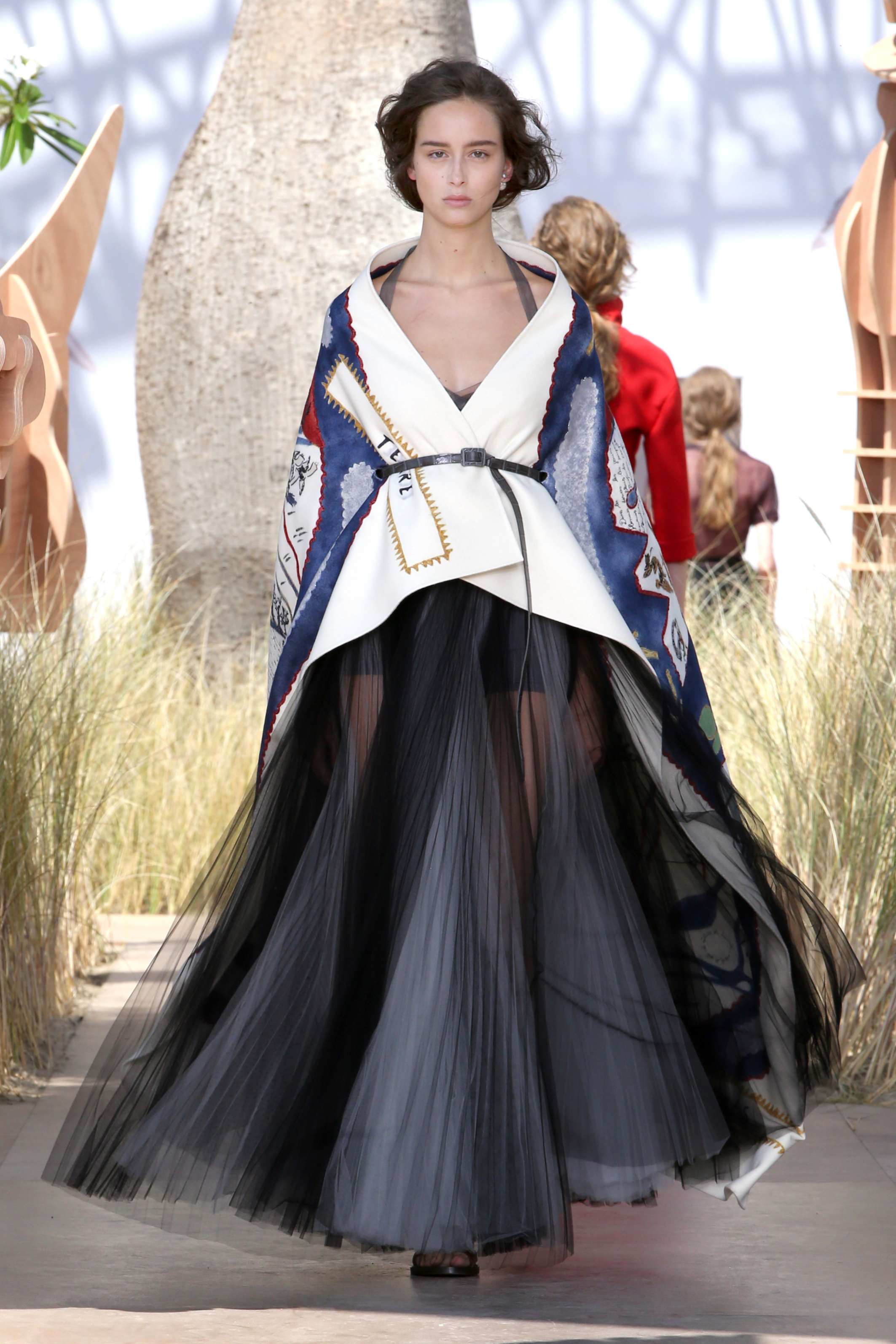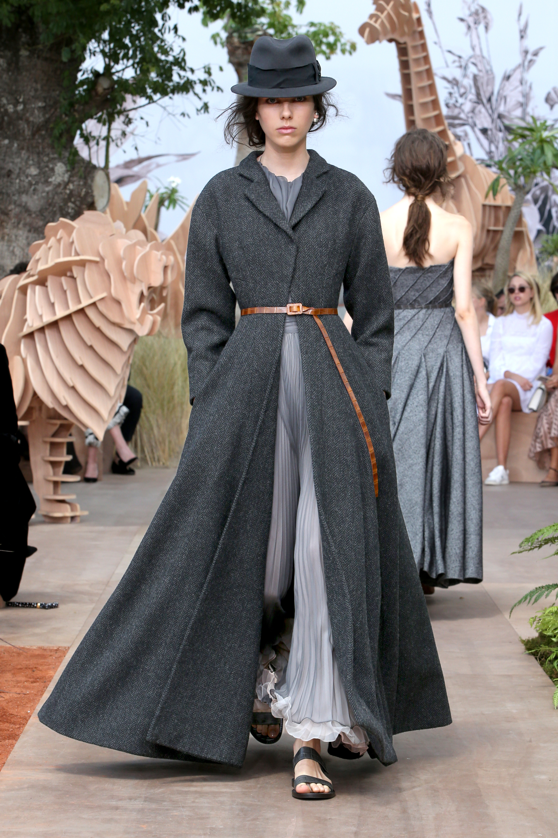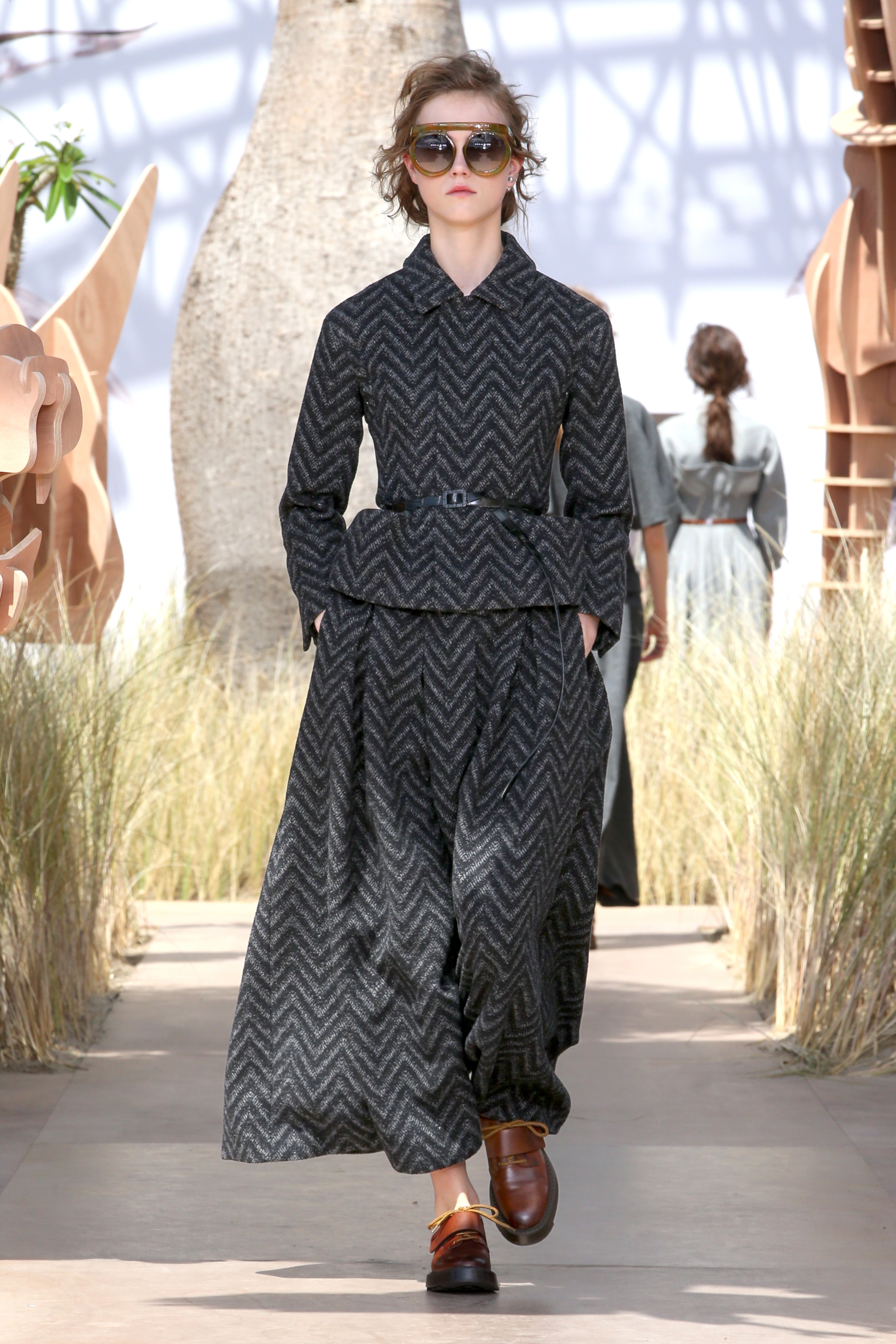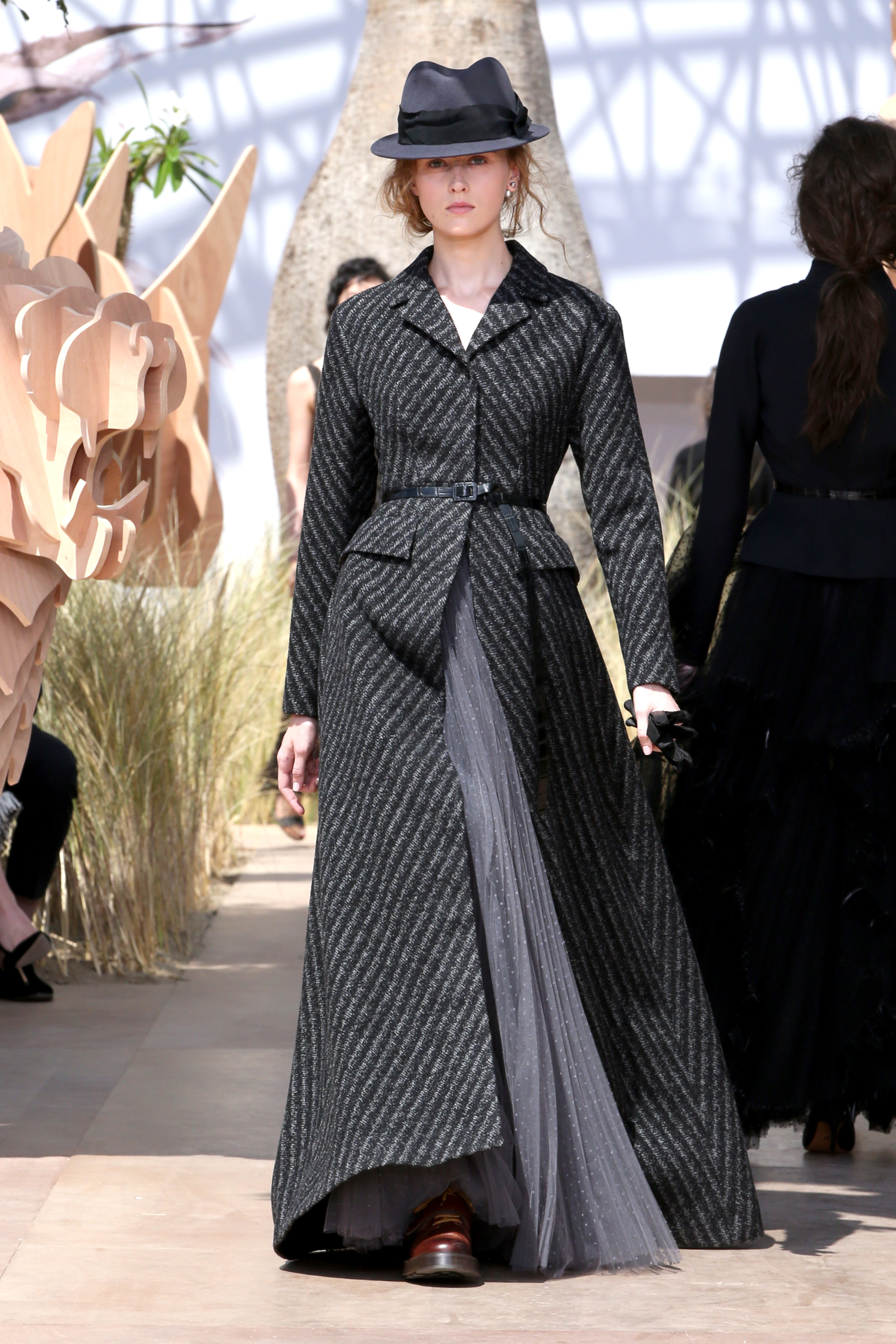 L’atlas symbolise, pour Maria Grazia Chiuri, une envie d’ailleurs, le besoin de voyager pour découvrir le monde et se découvrir soi-même, pour ressentir une émotion, grandir et évoluer. Il rappelle son voyage de Rome à Paris ou son exploration de l’héritage Dior. Turbulente comme les premières exploratrices, qui étaient capables de dépasser les frontières géographiques et mentales, elle est attirée par ces héroïnes et leur manière d’utiliser les éléments de la garde-robe masculine en les mélangeant à des pièces ethniques. Ces tissus d’homme transformés, grâce à la sensibilité de la créatrice et aux nouvelles technologies, en surfaces chatoyantes, en clairs-obscurs, s’invitent sur les vestes, les manteaux, les chemisiers, les combinaisons, qui ressemblent à de petits blousons d’aviateur et s’ouvrent en jupes-culottes plissées. Tandis que le feutre masculin de Stephen Jones, créateur des chapeaux Dior depuis vingt ans cette année, s’inspire de celui d’exploratrices telles que Freya Stark.