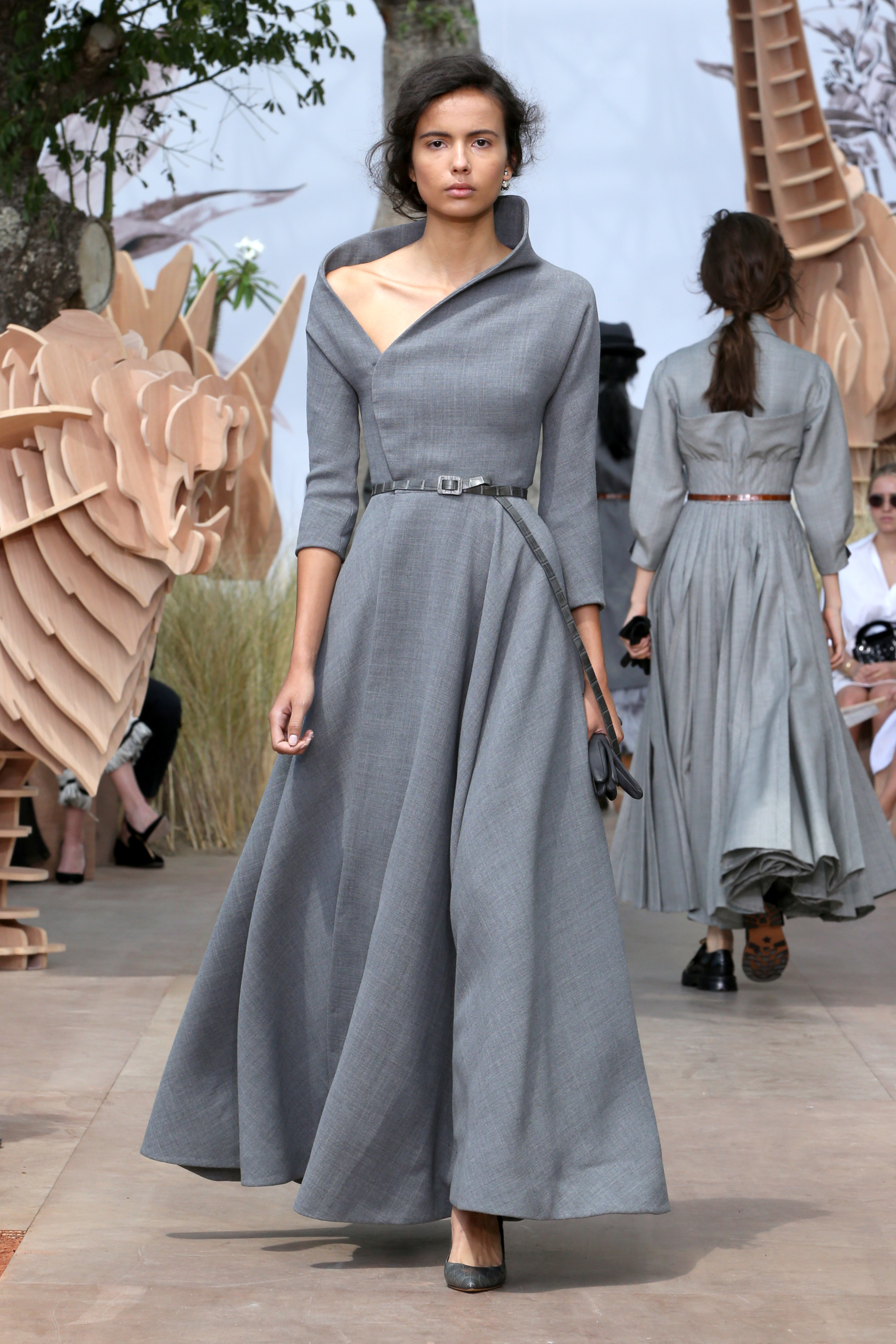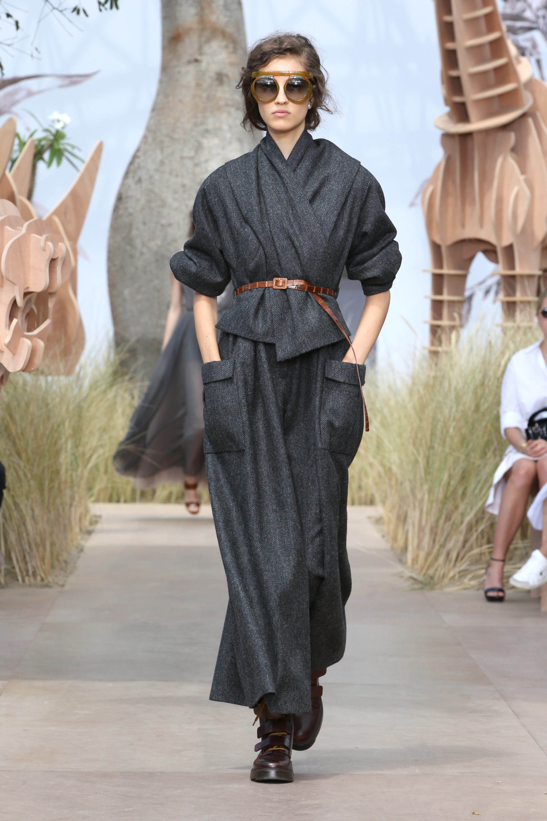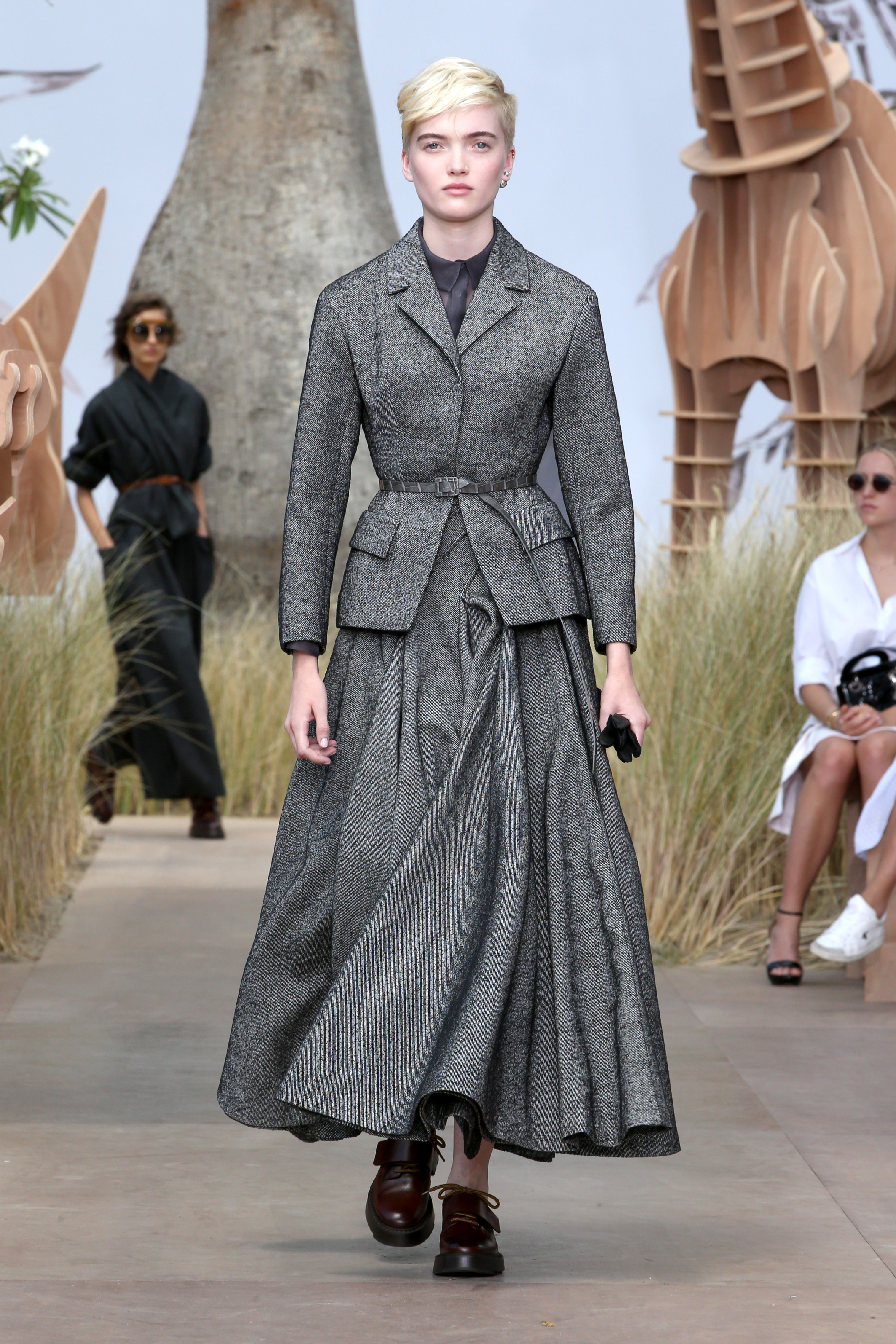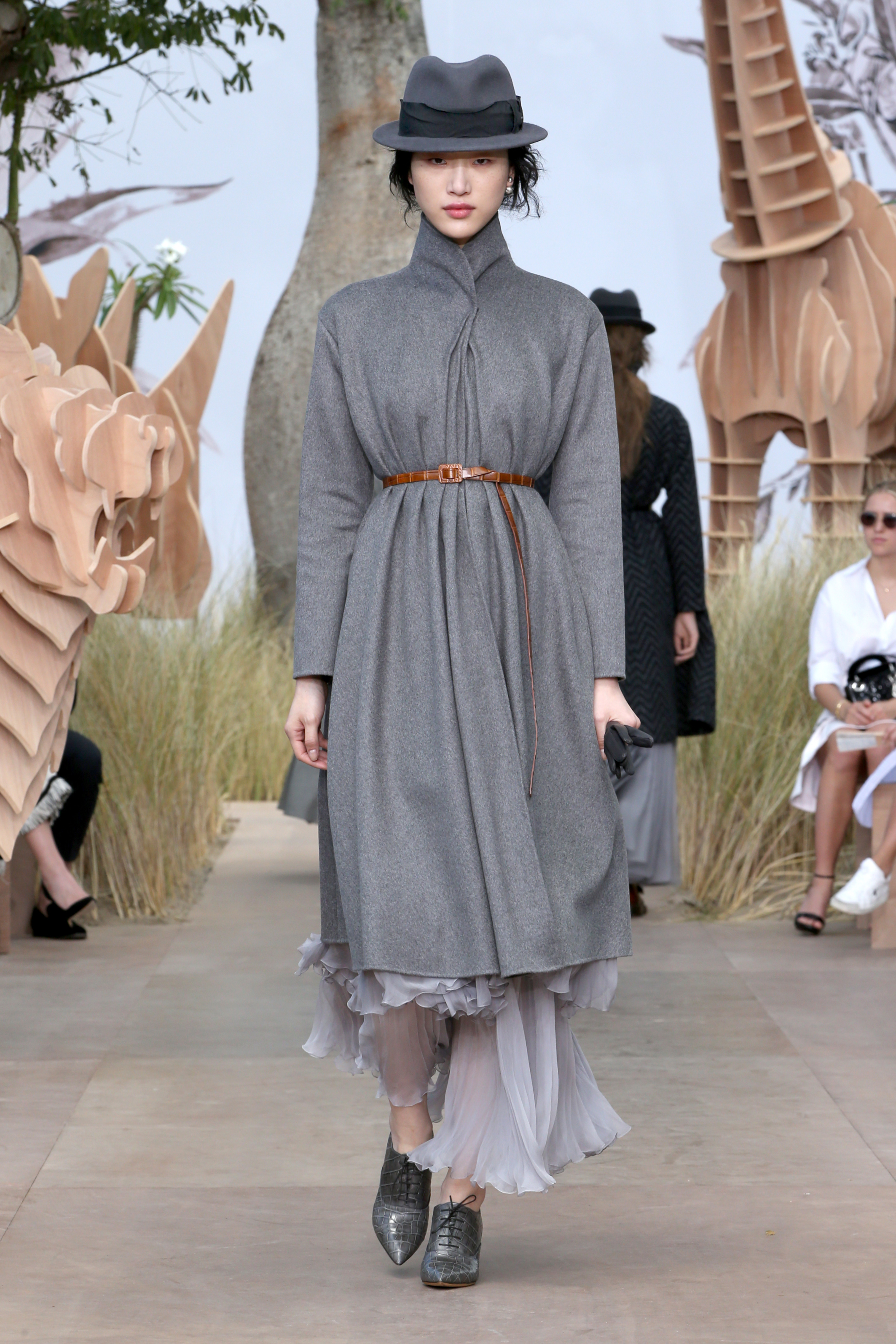L’atlas symbolise, pour Maria Grazia Chiuri, une envie d’ailleurs, le besoin de voyager pour découvrir le monde et se découvrir soi-même, pour ressentir une émotion, grandir et évoluer. Il rappelle son voyage de Rome à Paris ou son exploration de l’héritage Dior. Turbulente comme les premières exploratrices, qui étaient capables de dépasser les frontières géographiques et mentales, elle est attirée par ces héroïnes et leur manière d’utiliser les éléments de la garde-robe masculine en les mélangeant à des pièces ethniques. Ces tissus d’homme transformés, grâce à la sensibilité de la créatrice et aux nouvelles technologies, en surfaces chatoyantes, en clairs-obscurs, s’invitent sur les vestes, les manteaux, les chemisiers, les combinaisons, qui ressemblent à de petits blousons d’aviateur et s’ouvrent en jupes-culottes plissées. Tandis que le feutre masculin de Stephen Jones, créateur des chapeaux Dior depuis vingt ans cette année, s’inspire de celui d’exploratrices telles que Freya Stark.