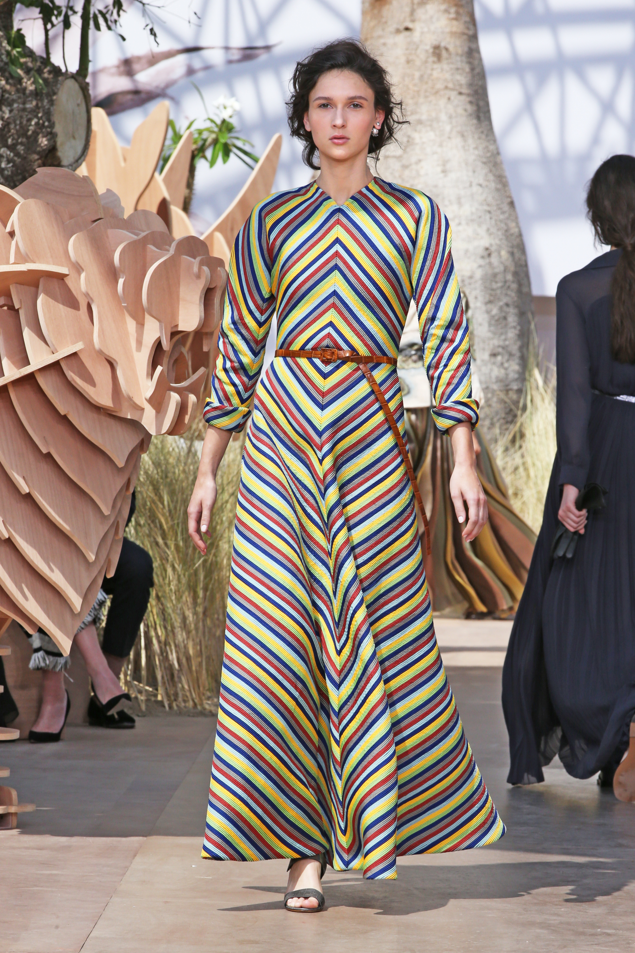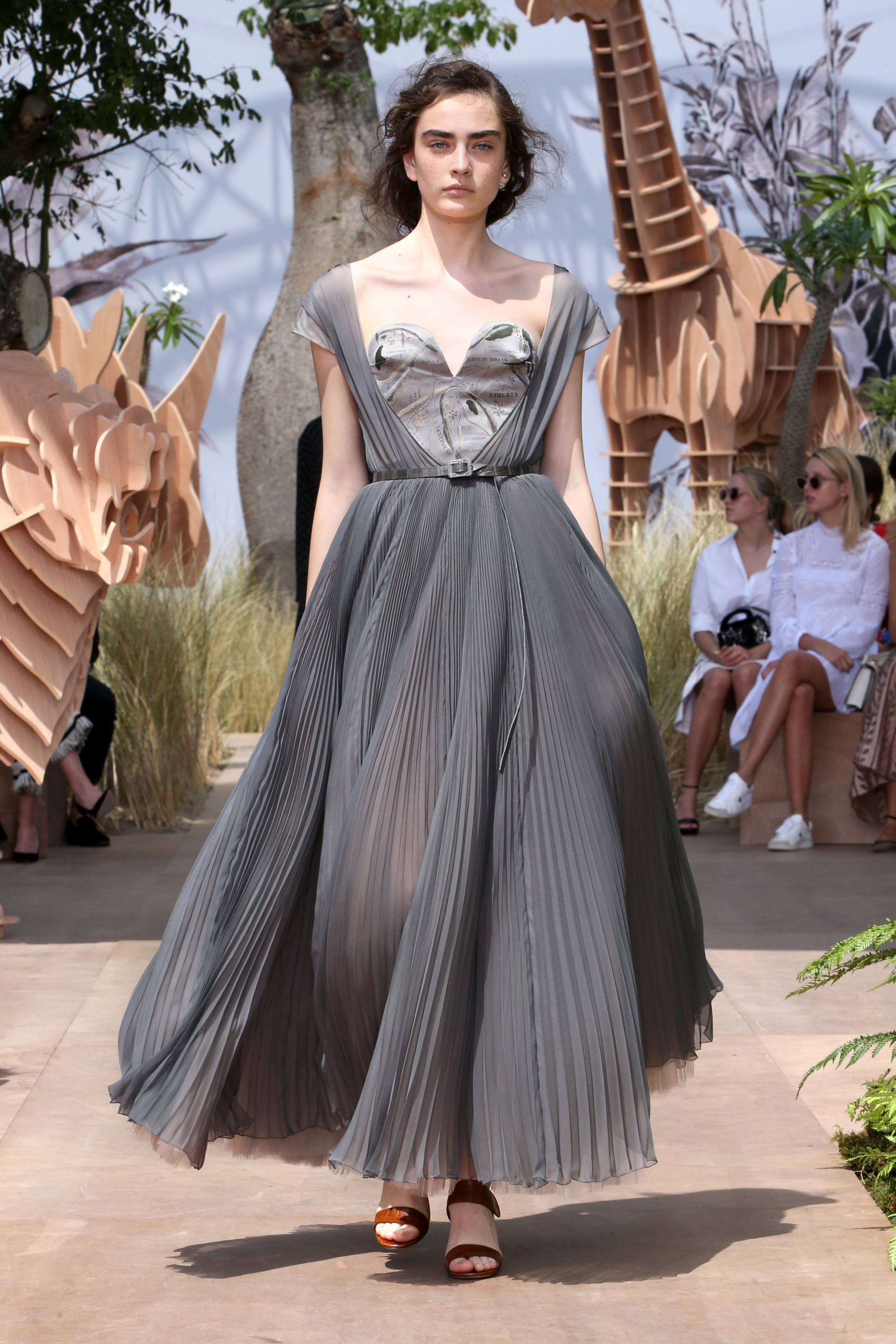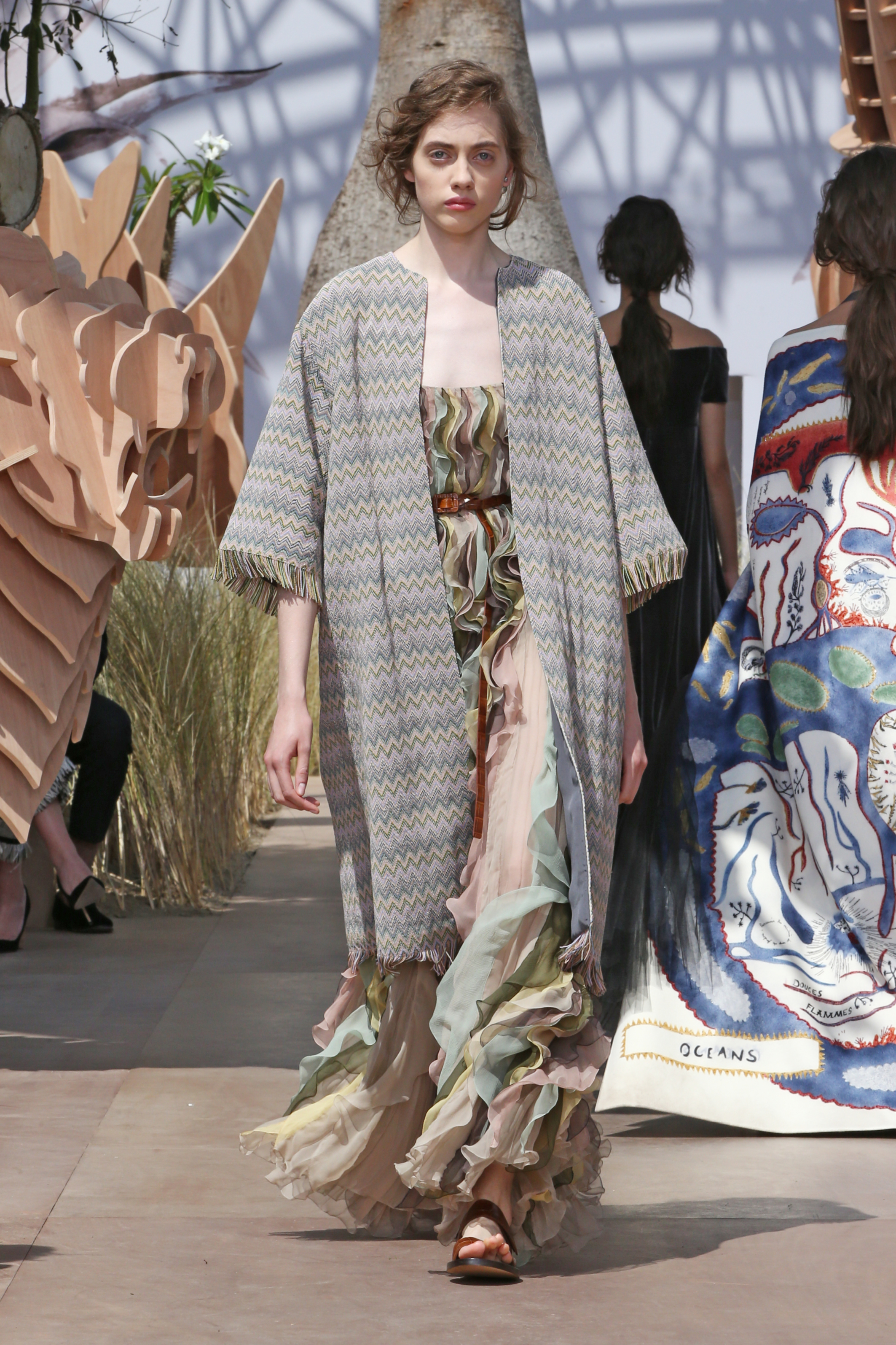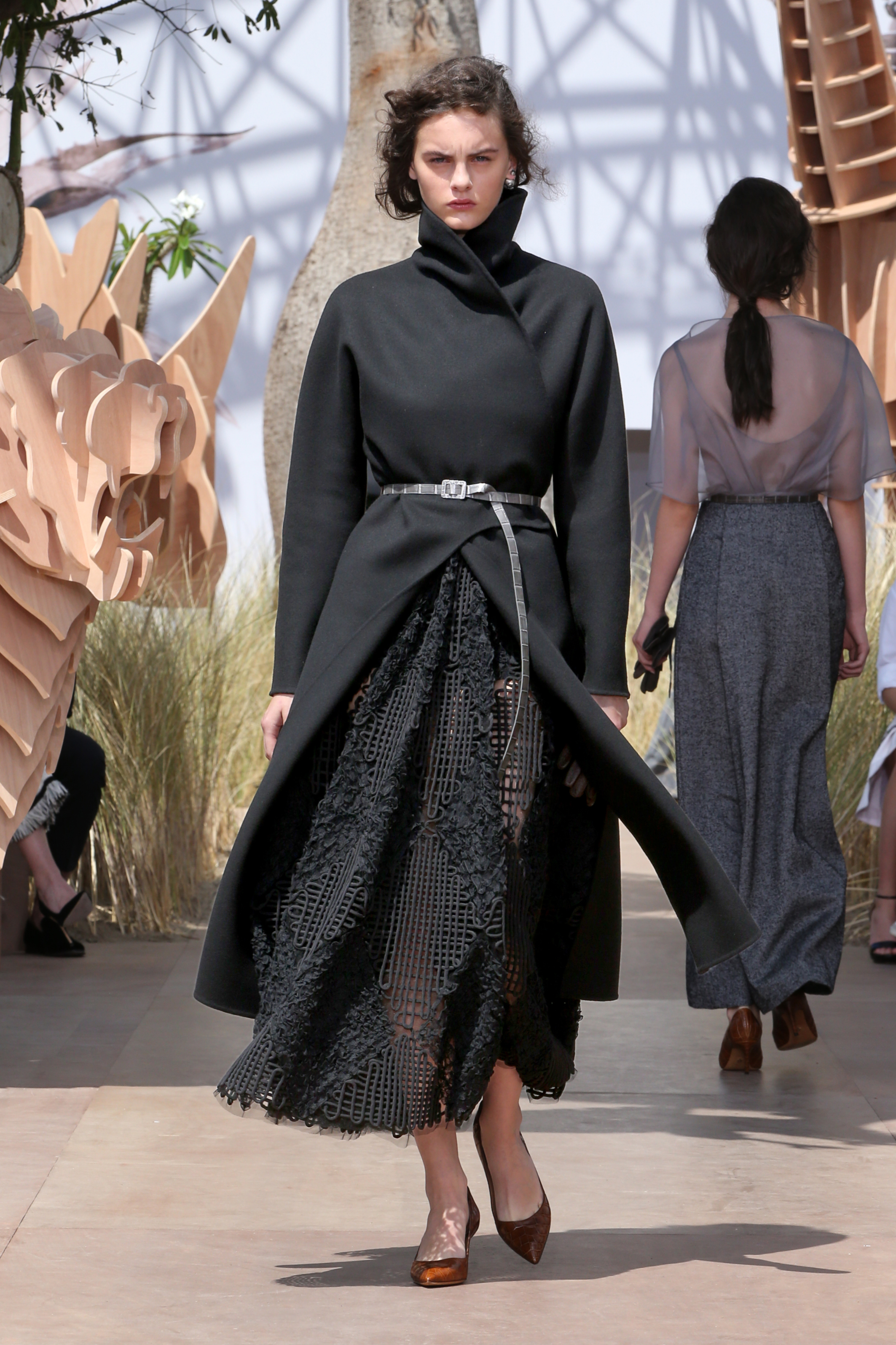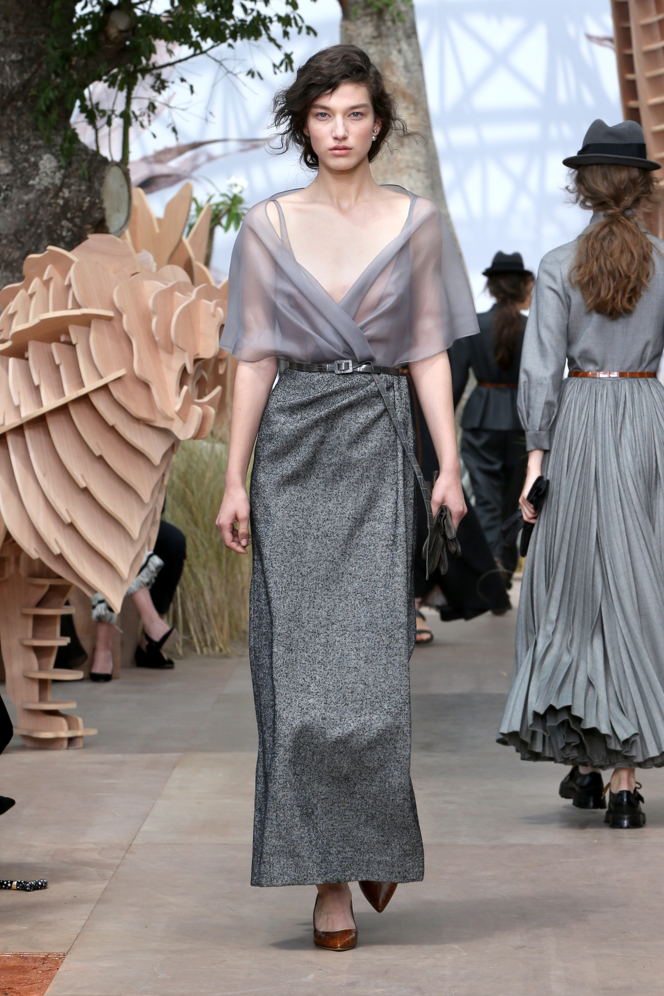 L’atlas symbolise, pour Maria Grazia Chiuri, une envie d’ailleurs, le besoin de voyager pour découvrir le monde et se découvrir soi-même, pour ressentir une émotion, grandir et évoluer. Il rappelle son voyage de Rome à Paris ou son exploration de l’héritage Dior. Turbulente comme les premières exploratrices, qui étaient capables de dépasser les frontières géographiques et mentales, elle est attirée par ces héroïnes et leur manière d’utiliser les éléments de la garde-robe masculine en les mélangeant à des pièces ethniques. Ces tissus d’homme transformés, grâce à la sensibilité de la créatrice et aux nouvelles technologies, en surfaces chatoyantes, en clairs-obscurs, s’invitent sur les vestes, les manteaux, les chemisiers, les combinaisons, qui ressemblent à de petits blousons d’aviateur et s’ouvrent en jupes-culottes plissées. Tandis que le feutre masculin de Stephen Jones, créateur des chapeaux Dior depuis vingt ans cette année, s’inspire de celui d’exploratrices telles que Freya Stark.