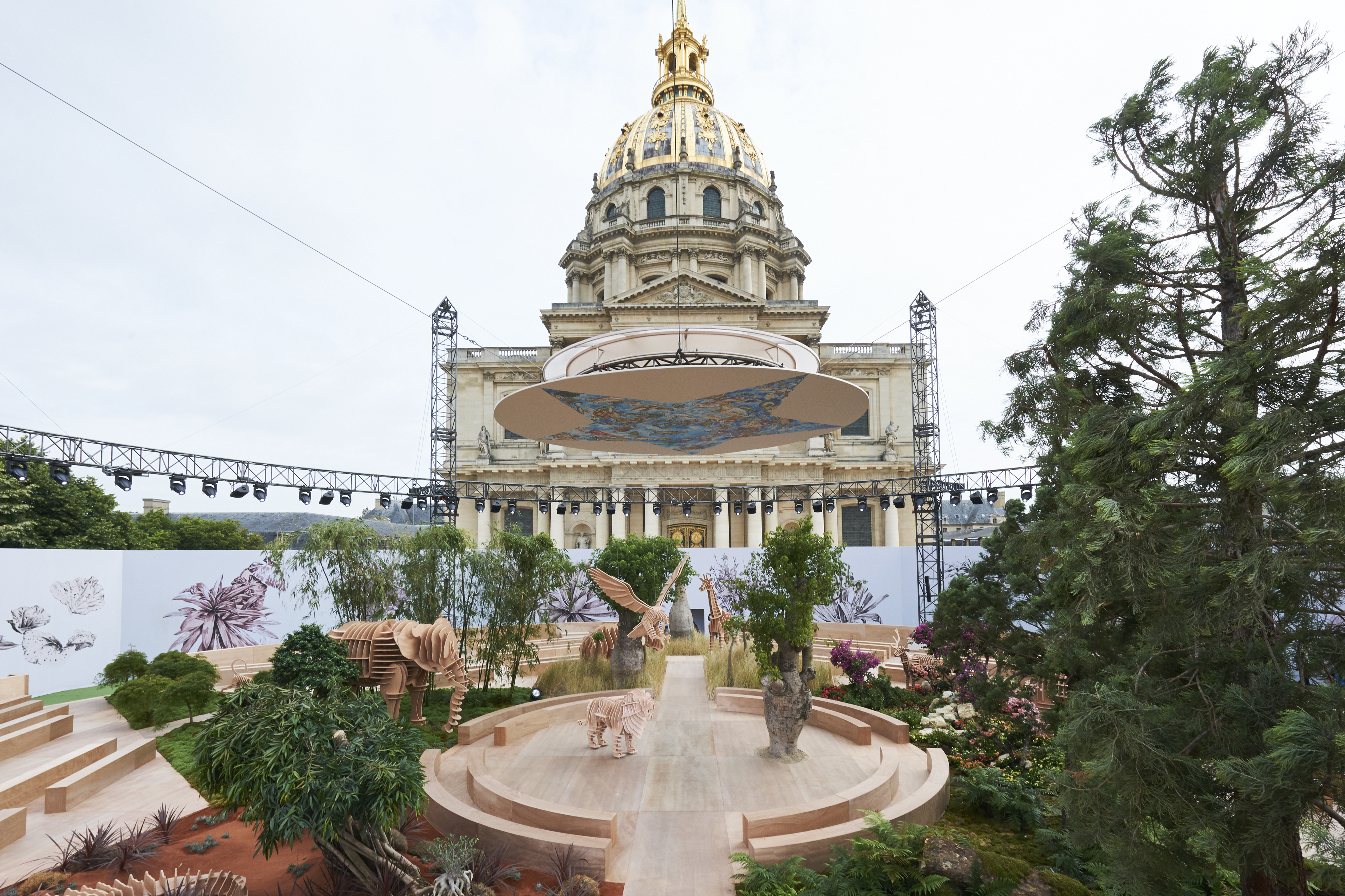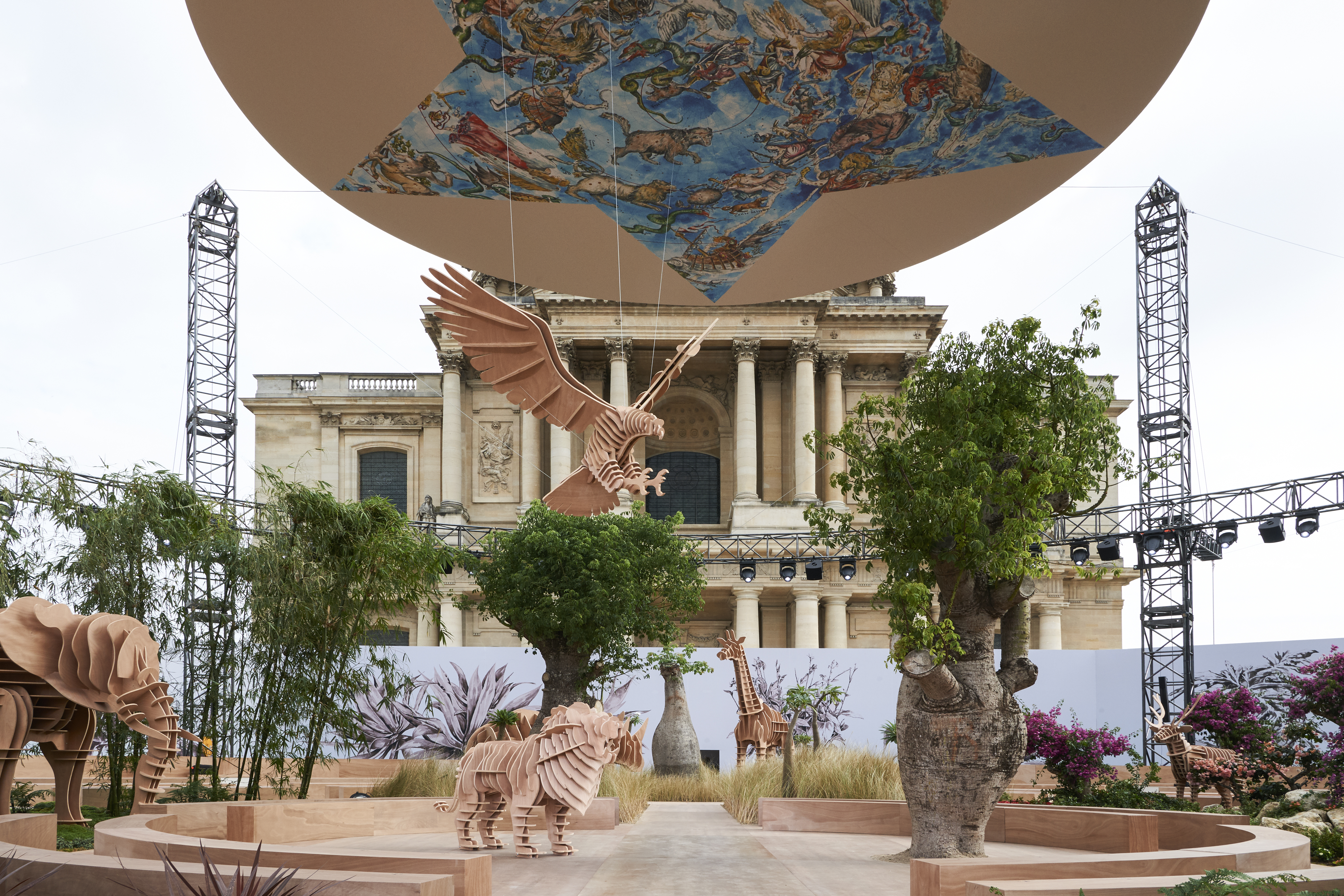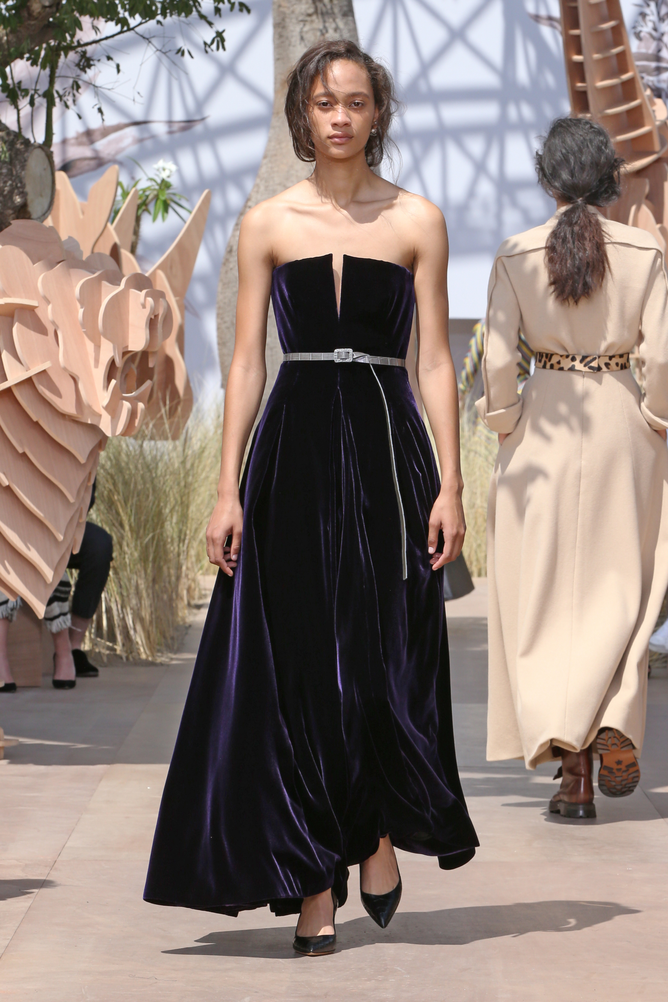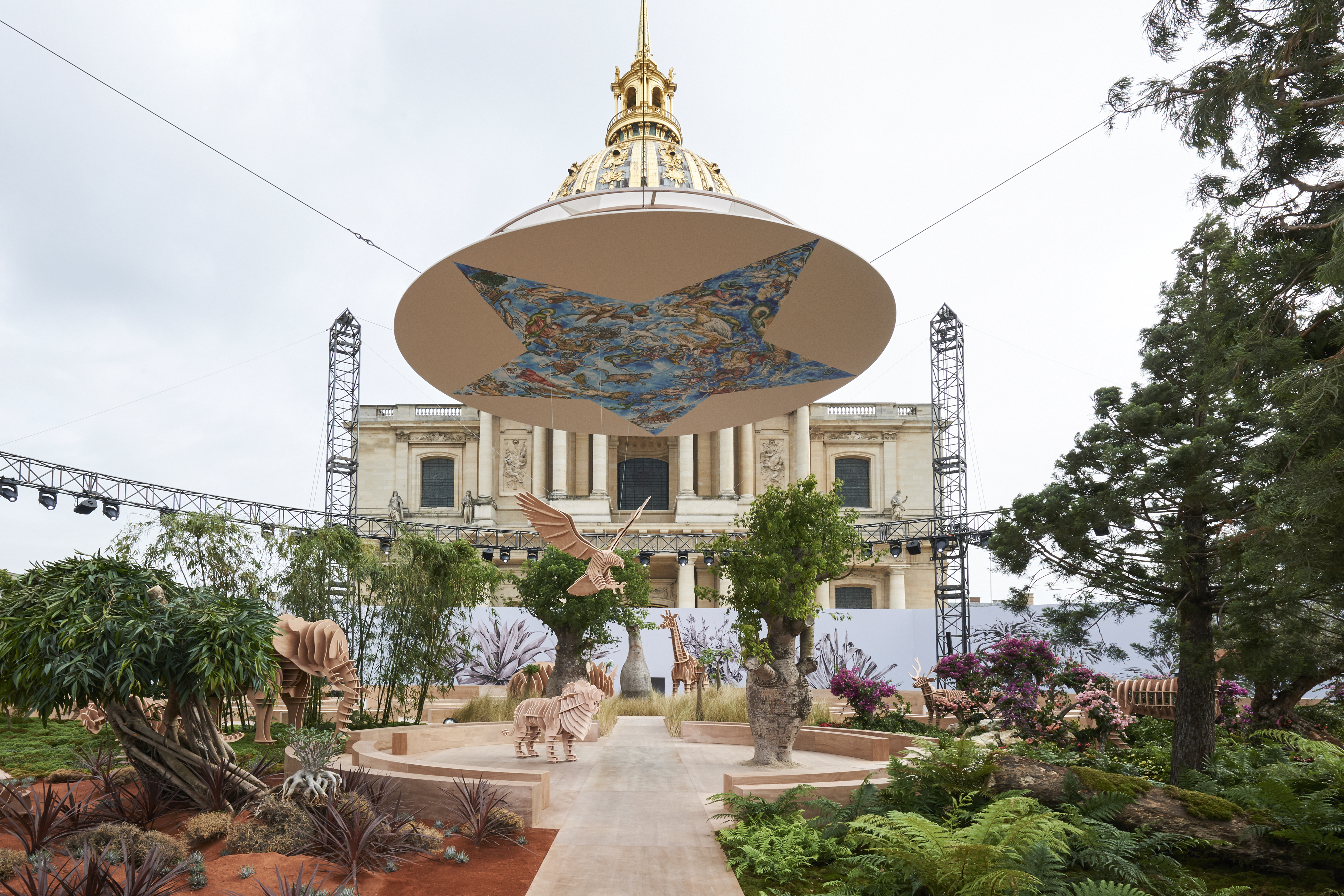 Le parcours de ce retour aux origines devient, pour Maria Grazia Chiuri, une topographie des émotions : les couleurs, les fleurs ou les jeux de tarot brodés deviennent eux-mêmes comme des atlas sur des capes et des robes de soirée en tulle et en soie, grises poudrées de rose, ou dans les couleurs nocturnes du velours. Cette féerie, renvoyant à une cartographie imaginaire qui invente et renverse notre point de vue, nous rappelle les tableaux de ces intérieurs aux atlas muraux et aux mappemondes : ils nous racontent la puissance de l’errance littéraire au féminin, pétrie d’explorations culturelles et de style. Pietro Ruffo, artiste avec lequel Maria Grazia Chiuri partage un lien créatif, a imaginé, pour décor, la voûte céleste et la Terre, tracées d’un geste poétique.