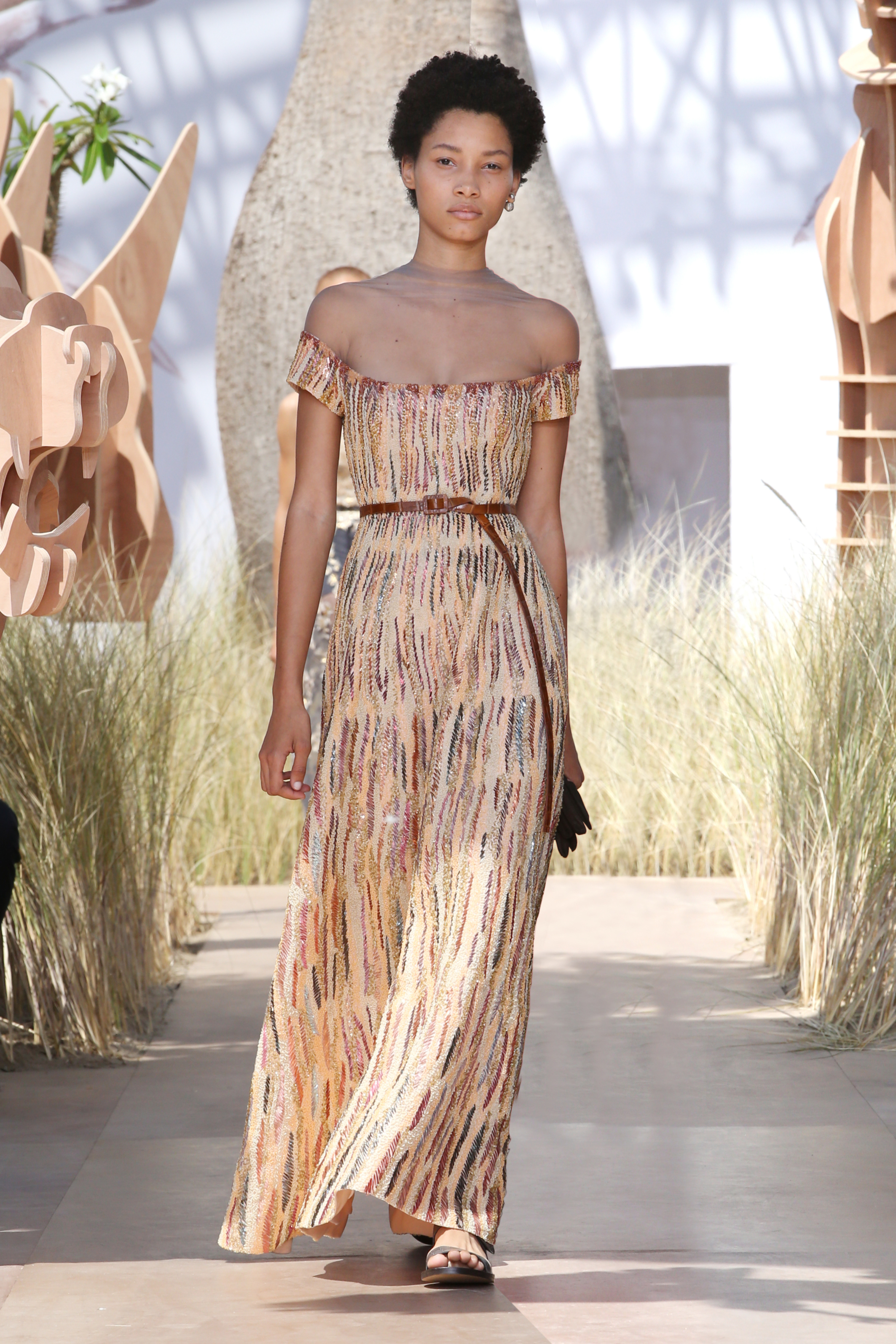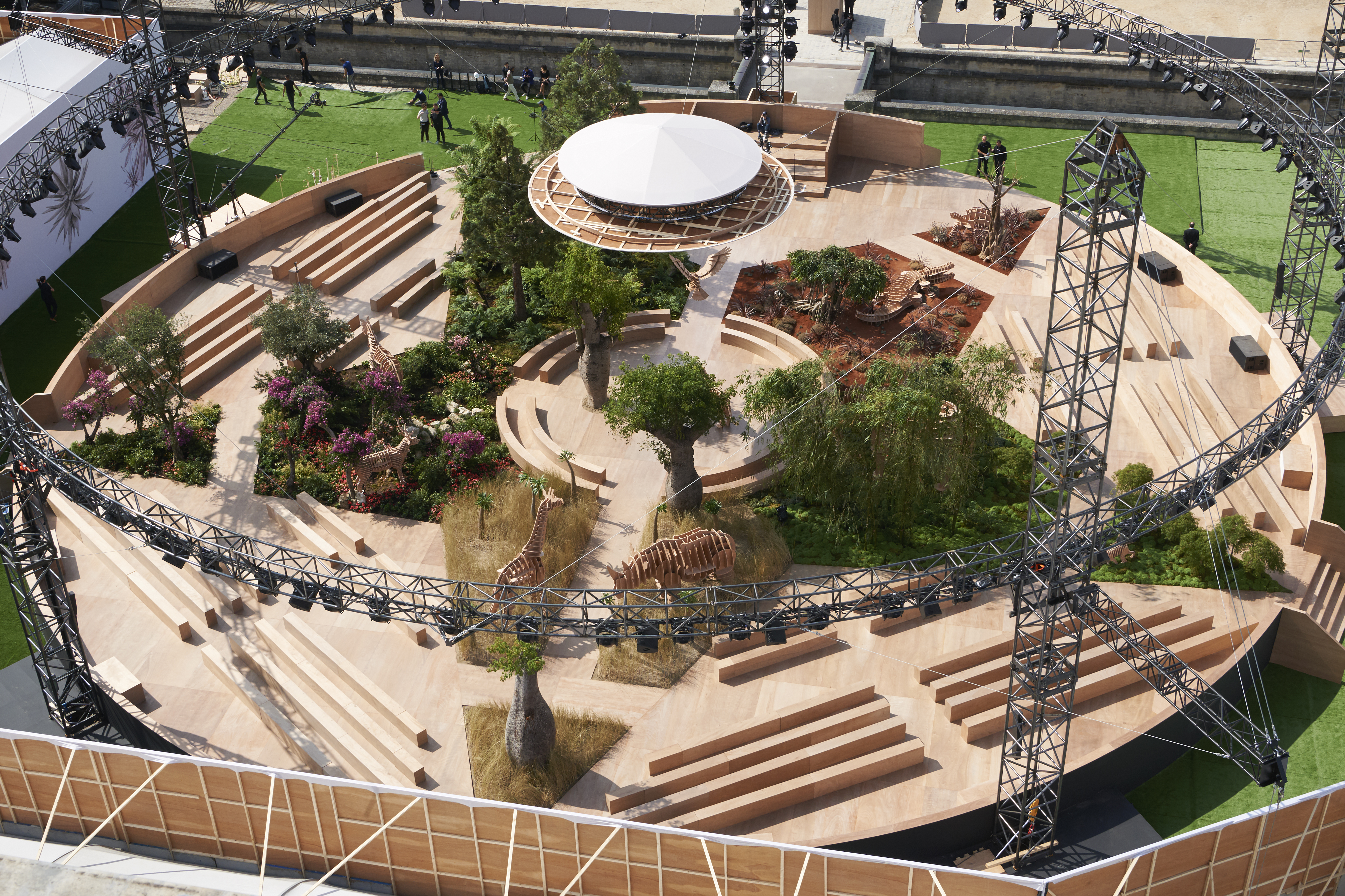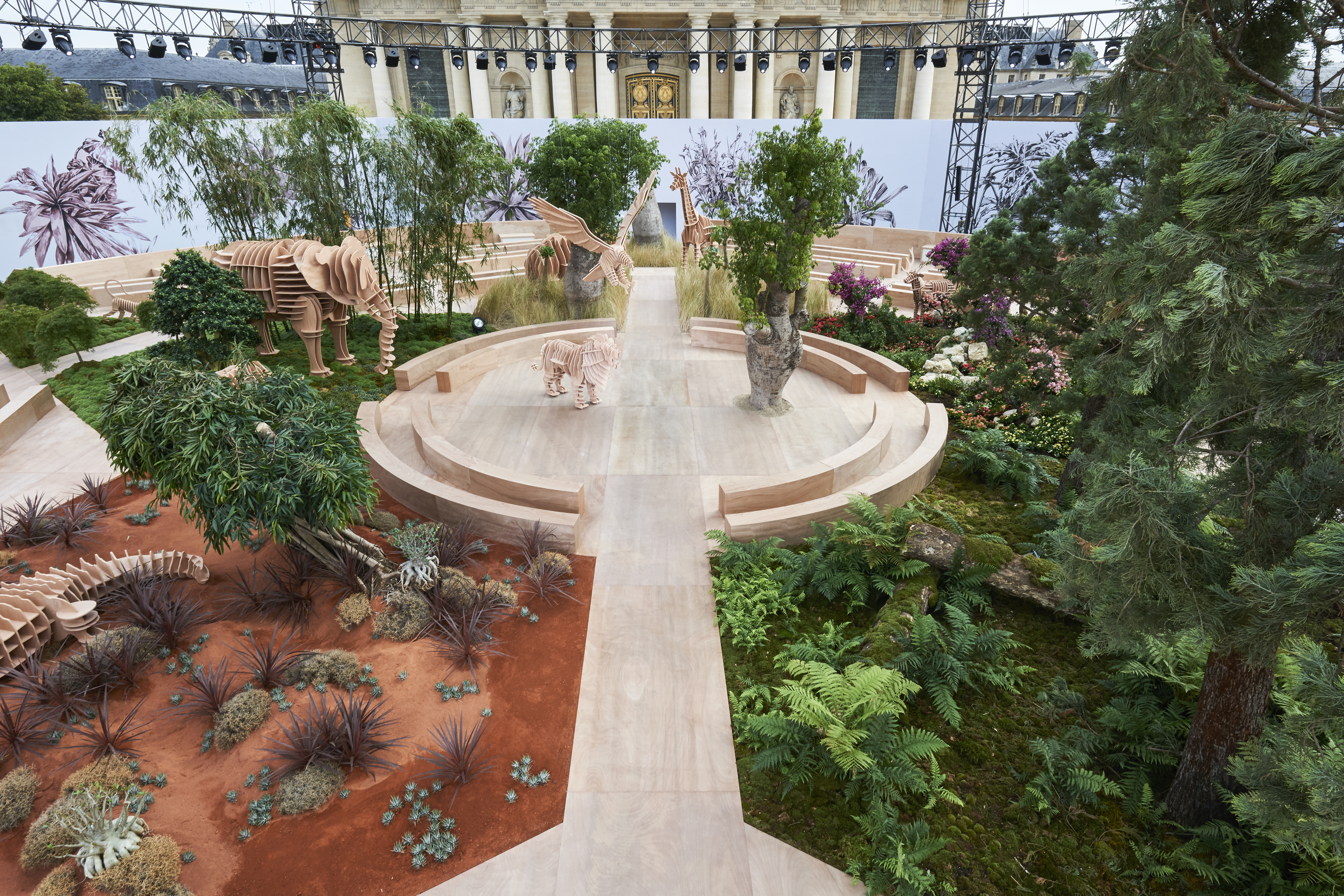 Le parcours de ce retour aux origines devient, pour Maria Grazia Chiuri, une topographie des émotions : les couleurs, les fleurs ou les jeux de tarot brodés deviennent eux-mêmes comme des atlas sur des capes et des robes de soirée en tulle et en soie, grises poudrées de rose, ou dans les couleurs nocturnes du velours. Cette féerie, renvoyant à une cartographie imaginaire qui invente et renverse notre point de vue, nous rappelle les tableaux de ces intérieurs aux atlas muraux et aux mappemondes : ils nous racontent la puissance de l’errance littéraire au féminin, pétrie d’explorations culturelles et de style. Pietro Ruffo, artiste avec lequel Maria Grazia Chiuri partage un lien créatif, a imaginé, pour décor, la voûte céleste et la Terre, tracées d’un geste poétique.