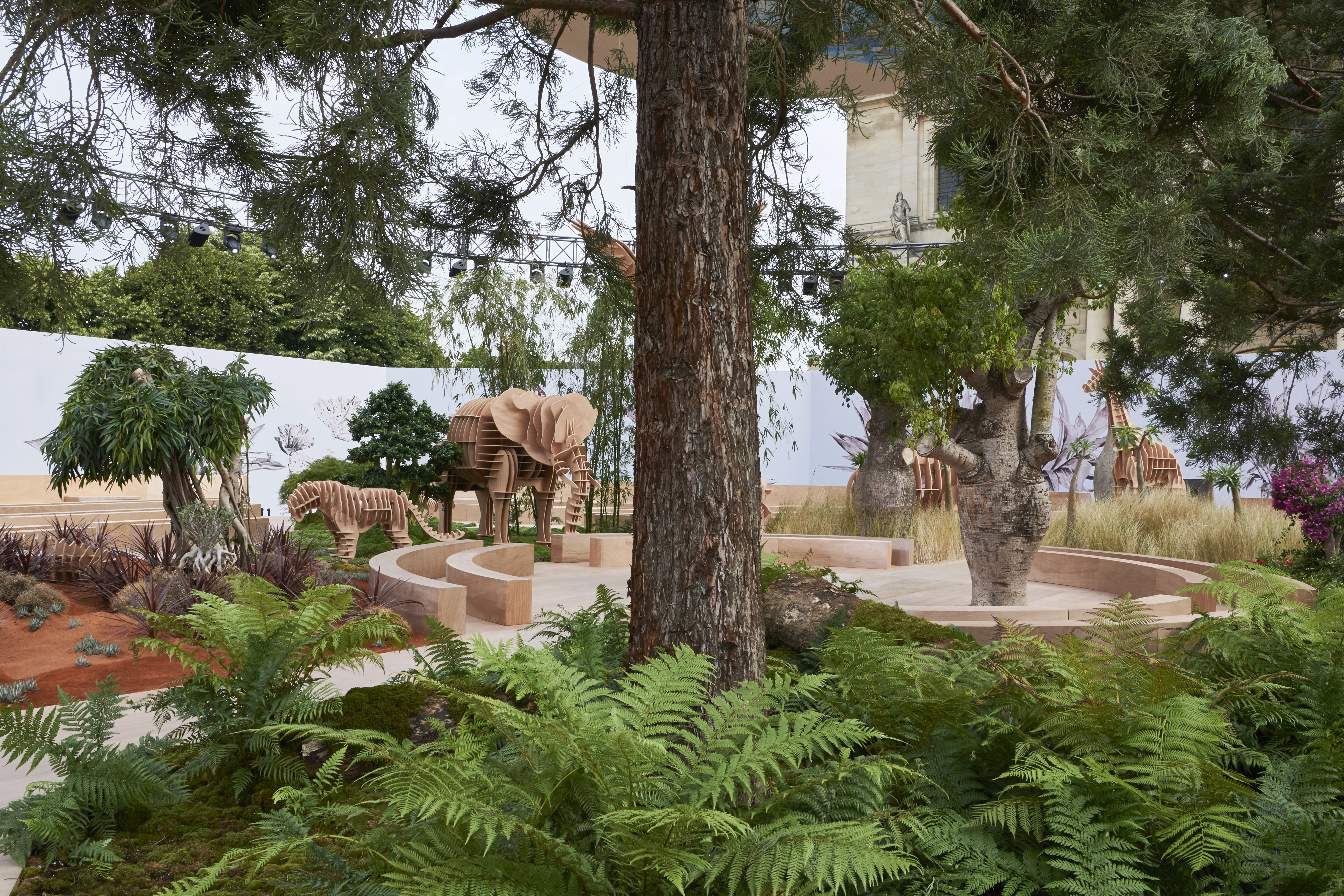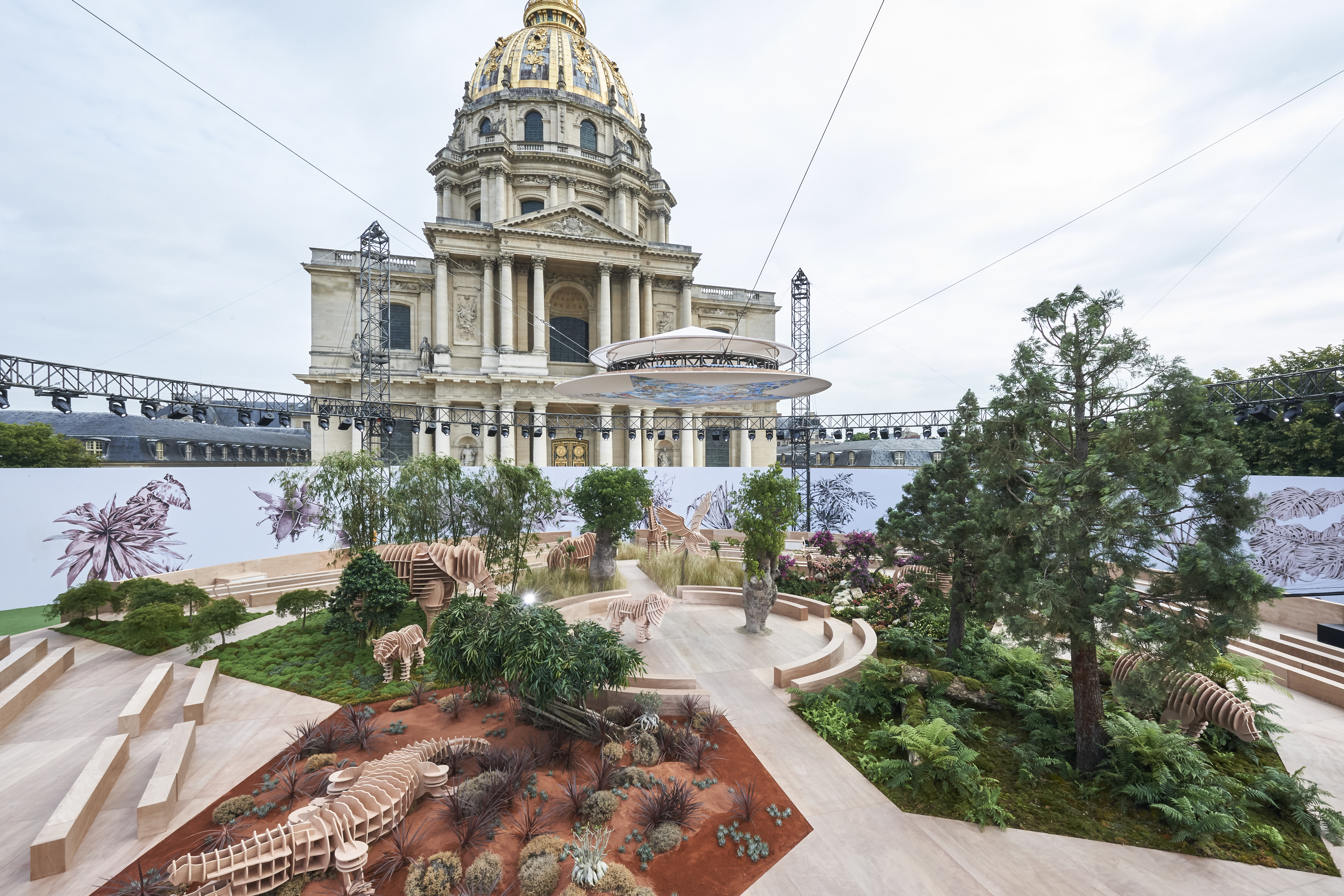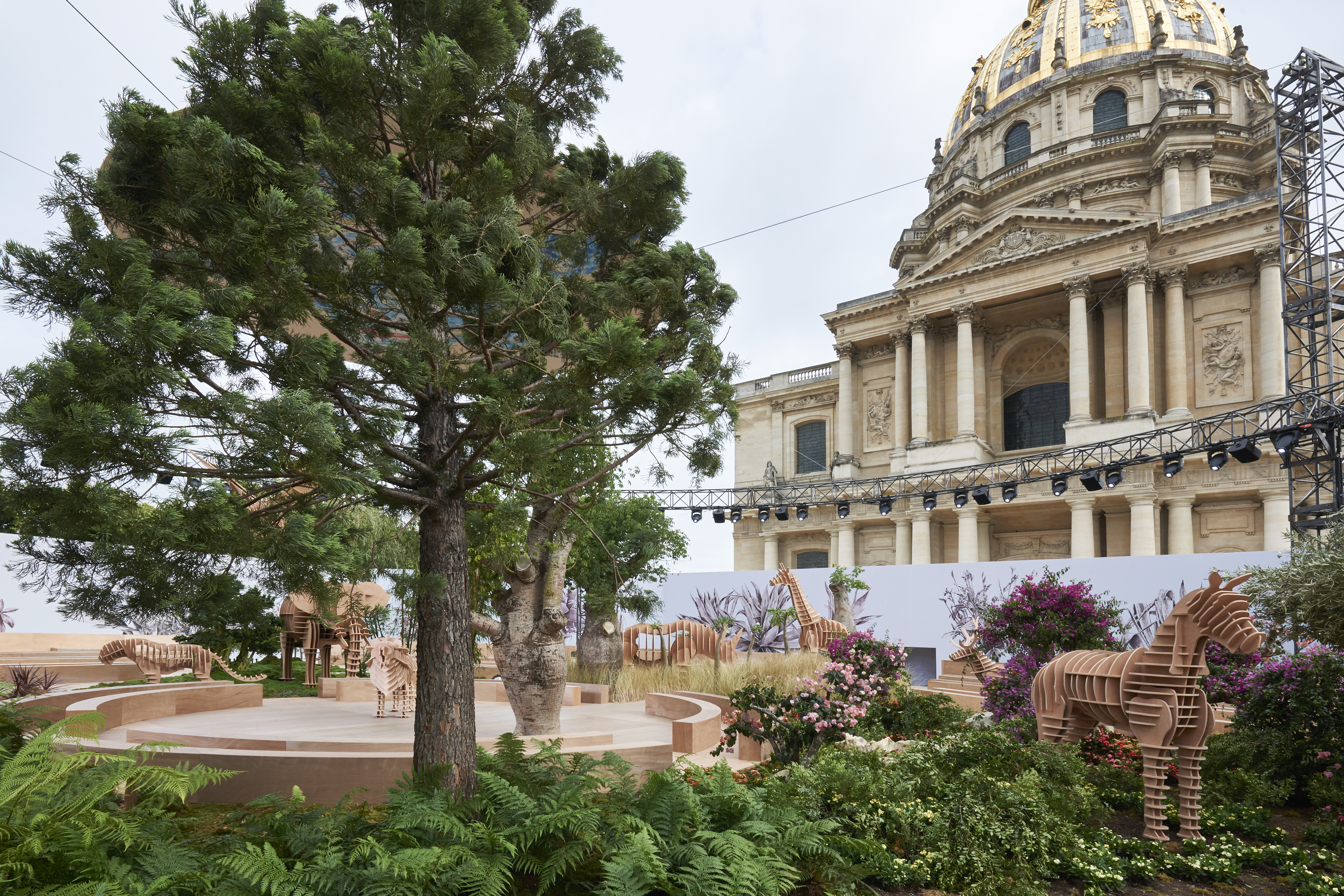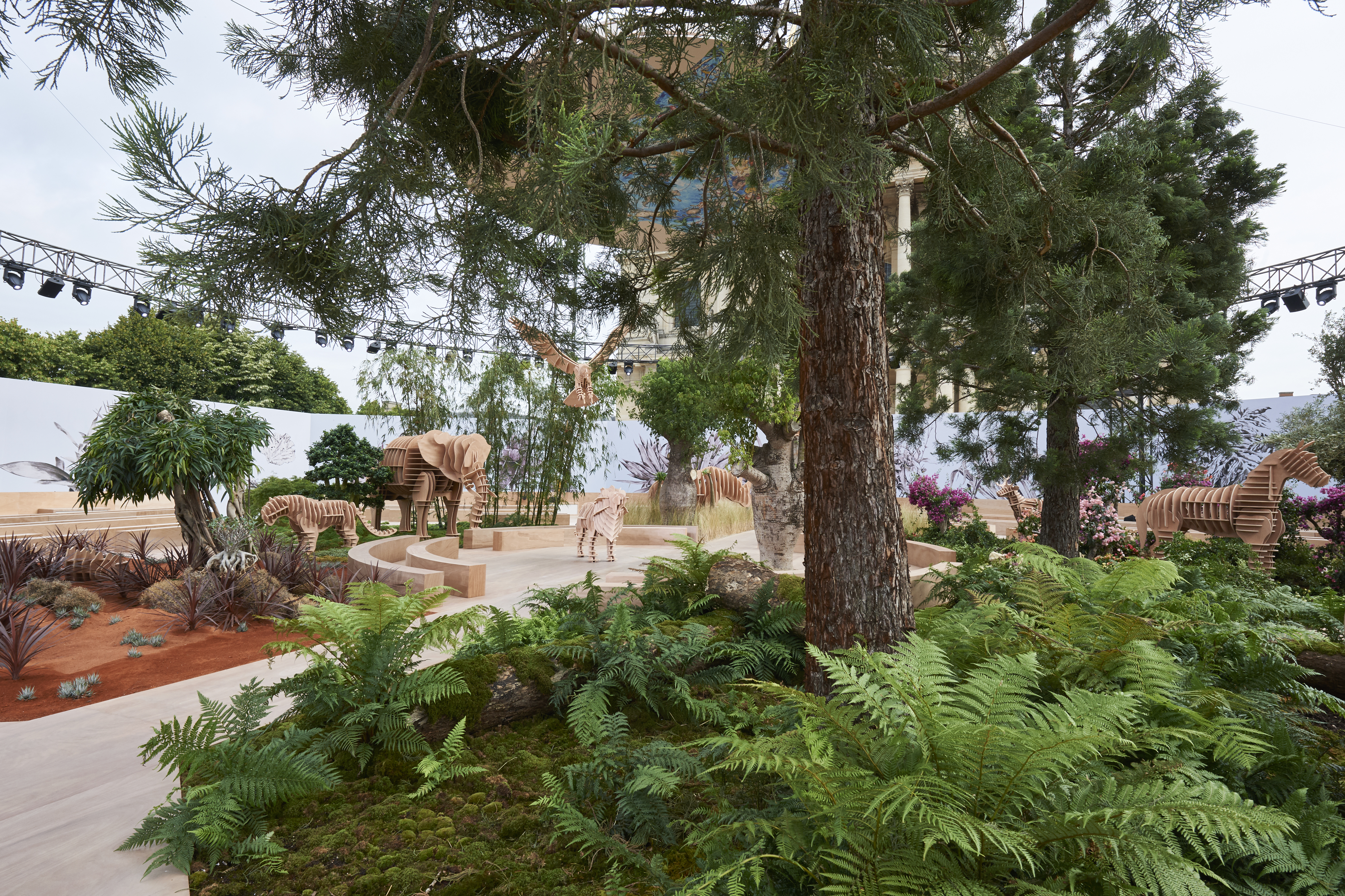 Le parcours de ce retour aux origines devient, pour Maria Grazia Chiuri, une topographie des émotions : les couleurs, les fleurs ou les jeux de tarot brodés deviennent eux-mêmes comme des atlas sur des capes et des robes de soirée en tulle et en soie, grises poudrées de rose, ou dans les couleurs nocturnes du velours. Cette féerie, renvoyant à une cartographie imaginaire qui invente et renverse notre point de vue, nous rappelle les tableaux de ces intérieurs aux atlas muraux et aux mappemondes : ils nous racontent la puissance de l’errance littéraire au féminin, pétrie d’explorations culturelles et de style. Pietro Ruffo, artiste avec lequel Maria Grazia Chiuri partage un lien créatif, a imaginé, pour décor, la voûte céleste et la Terre, tracées d’un geste poétique.