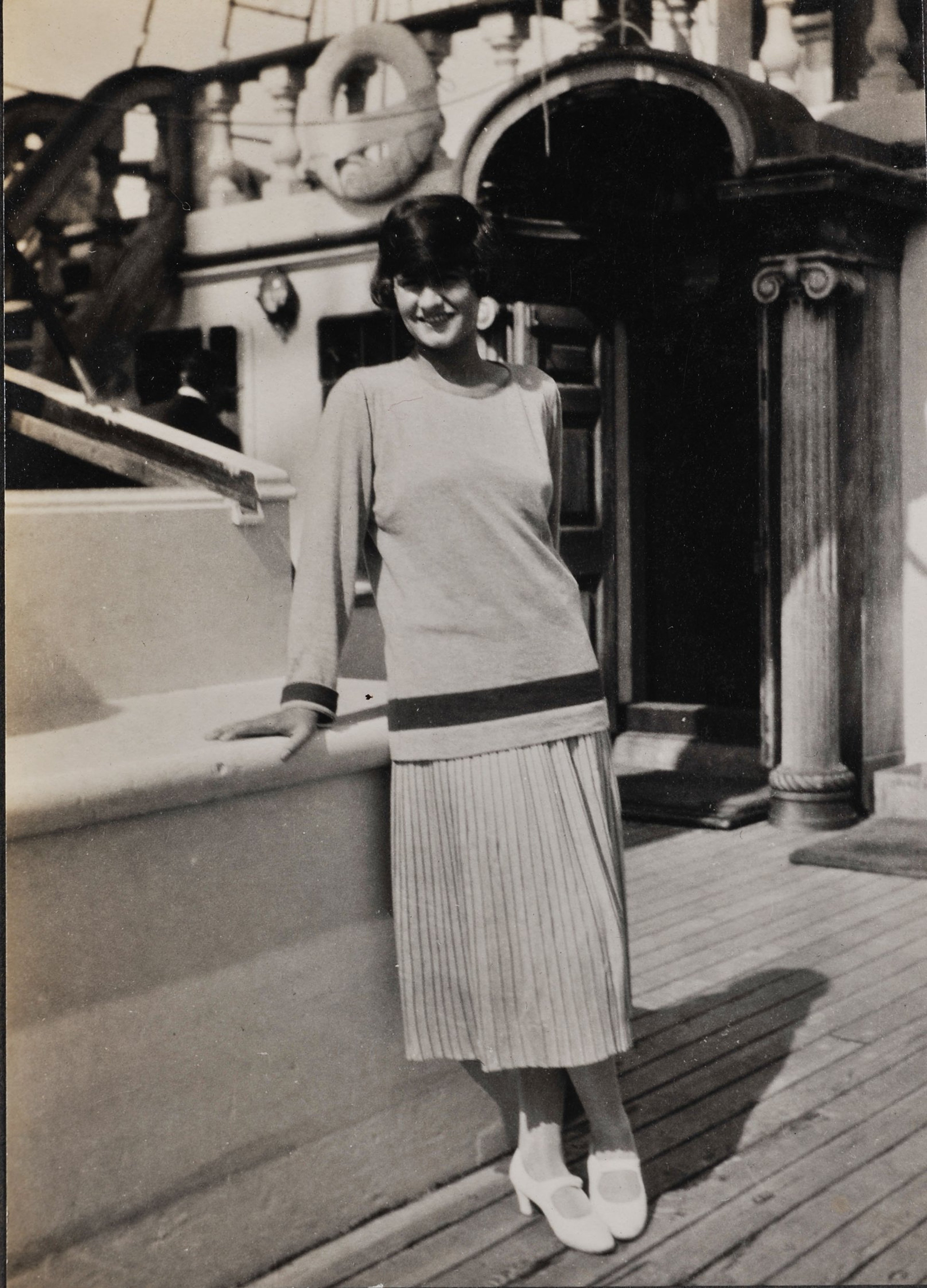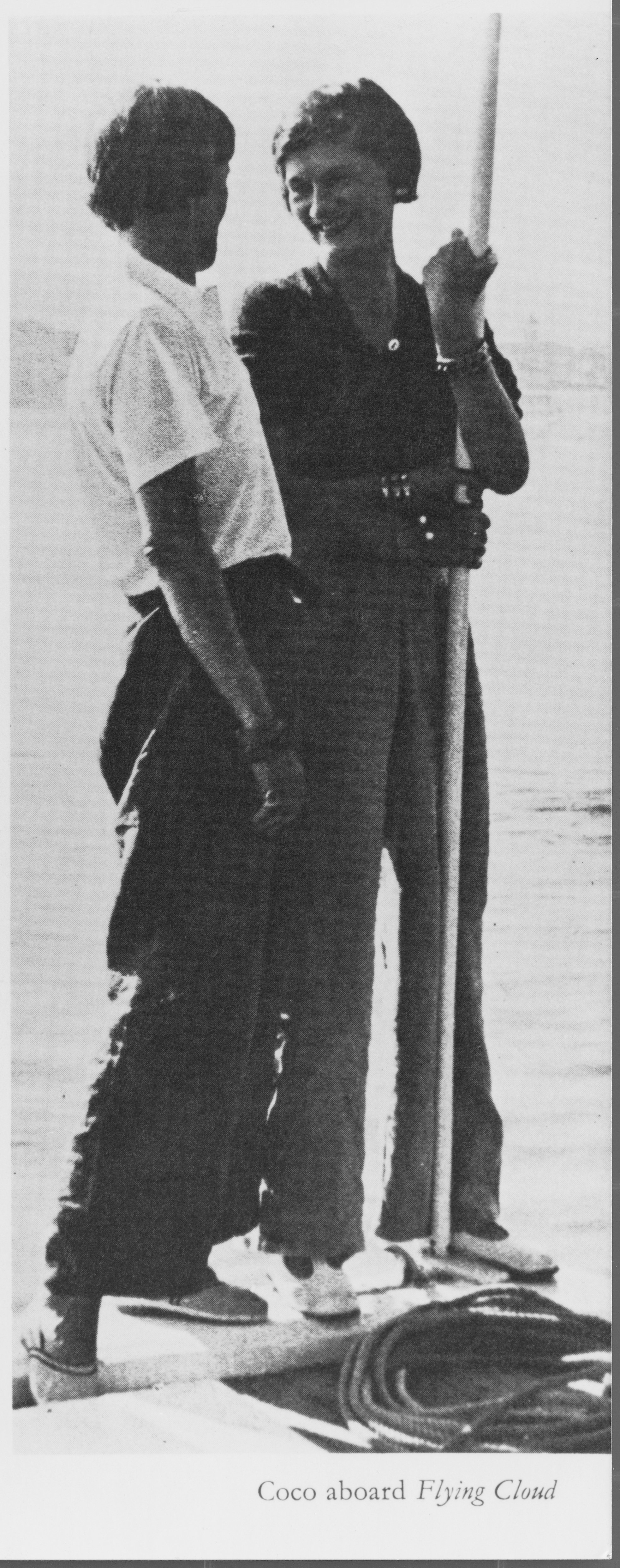 Rien qui ne réponde mieux à son esthétique que ce cadre de vie où tout se réduit à l’essentiel, où la perfection de chaque forme sort d’une fonction éprouvée : la rotondité parfaite d’une bouée, la découpe aigüe d’une voile très blanche, la subtile intrication des nœuds de cordage dont le dessin, à la fois souple et fort, retrouve celui de l’arabesque et de l’entrelacs. Rien qui ne s’adapte mieux à sa vision de la mode que ces marinières de jersey rayé, ces pantalons larges et souples, ces cravates noires et un peu lâches, ces bérets emblématiques et jusqu’aux bracelets de montres blancs règlementaires des marins anglais, qu’exaltent les peaux cuivrées. Ils offraient comme un contrepoint masculin à l’éclat des perles dont elle fit l’un de ses fétiches, et dont elle aimait, l’été, le contraste avec la peau brunie par le soleil – ce soleil auquel elle avait été parmi les premières à s’exposer, dès les années vingt. « Une boucle d’oreille très blanche sur le lobe d’une oreille très hâlée m’enchante » disait-elle à Paul Morand.