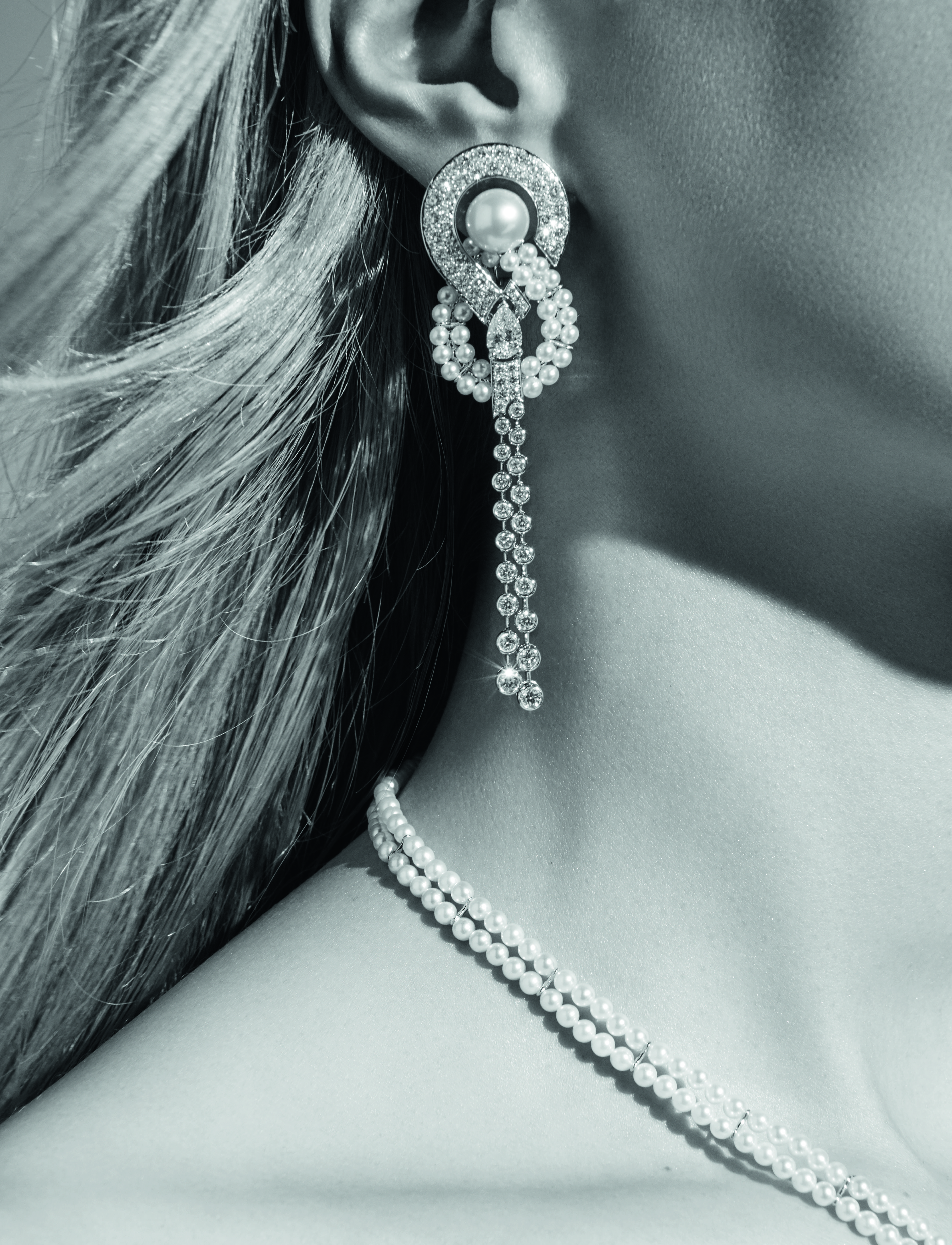 « Endless Knot » earrings in 18K white gold set with 2 pear-cut diamonds for a total weight of 1,44 carat, 68 Japanese cultured pearls and 132 brilliant-cut diamonds.