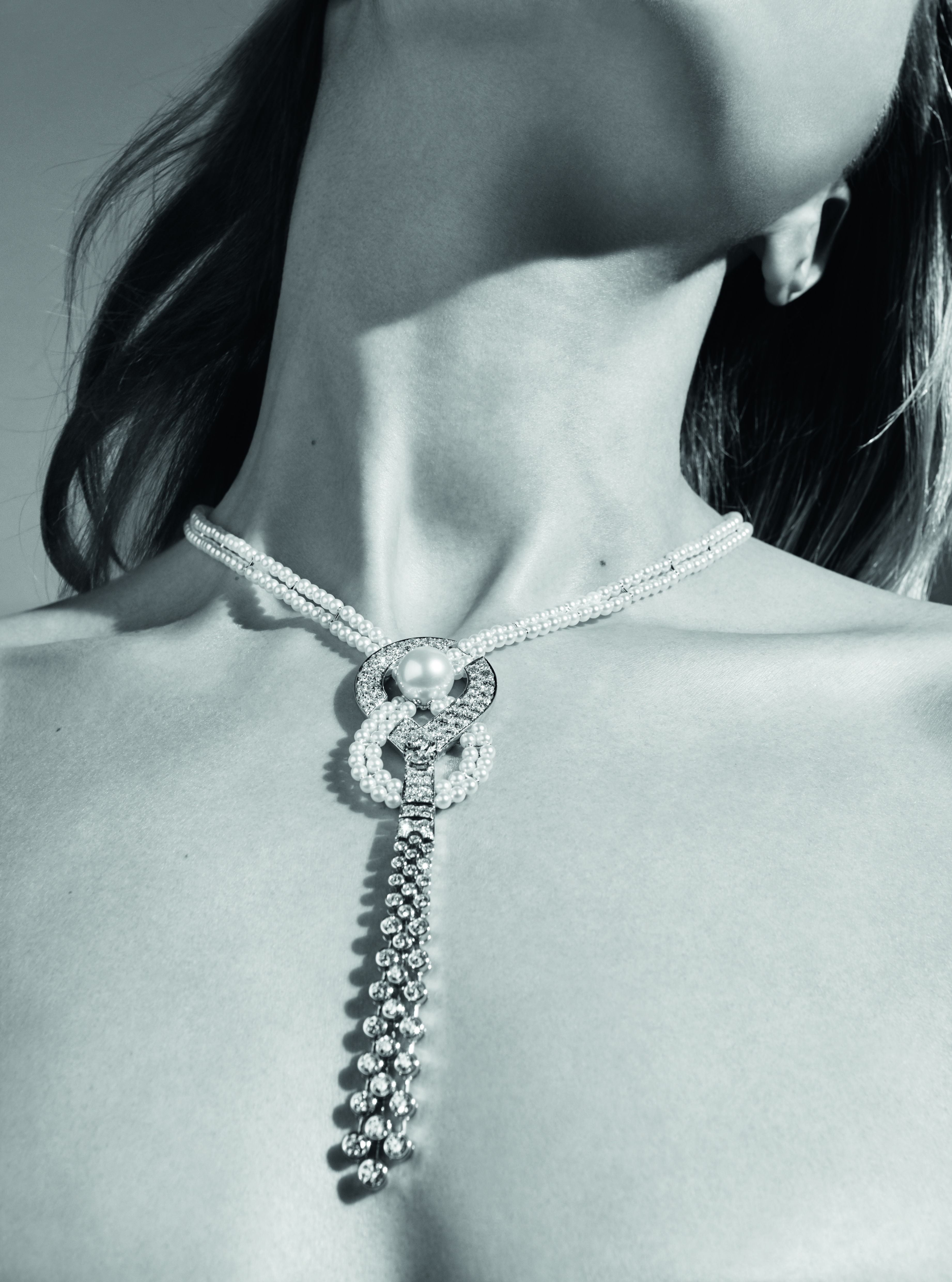 « Endless Knot » necklace in 18K white gold set with a pear-cut diamond of 1,52 carat, 3 round-cut diamonds for a total weight of 0,95 carat, 1 Indonesian cultured pearl, 320 Japanese cultured pearls and 93 brilliant-cut diamonds.