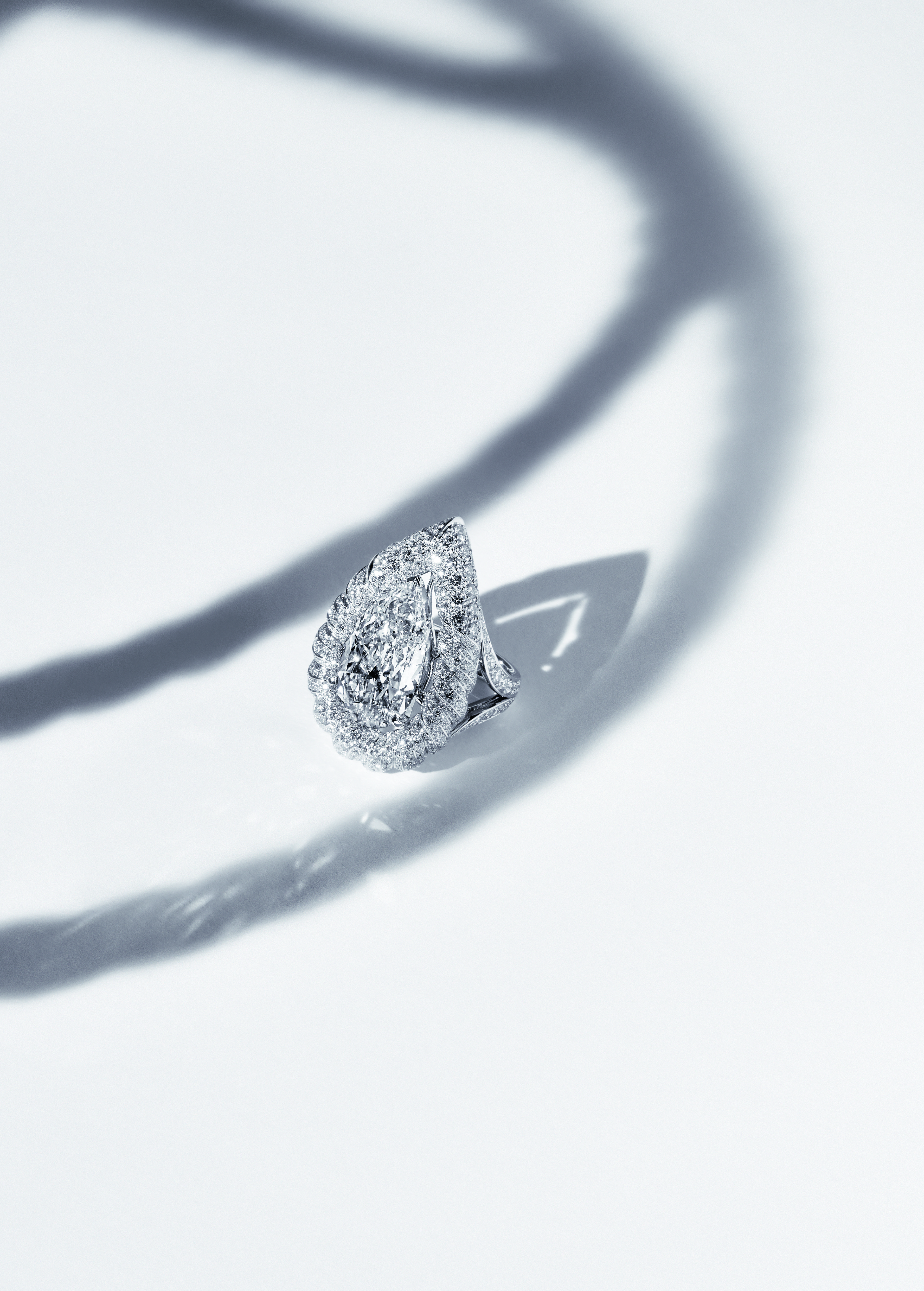 « Endless Knot » ring in 18K white gold set with a pear-cut diamond of 12,83 carats and 486 brilliant-cut diamonds.