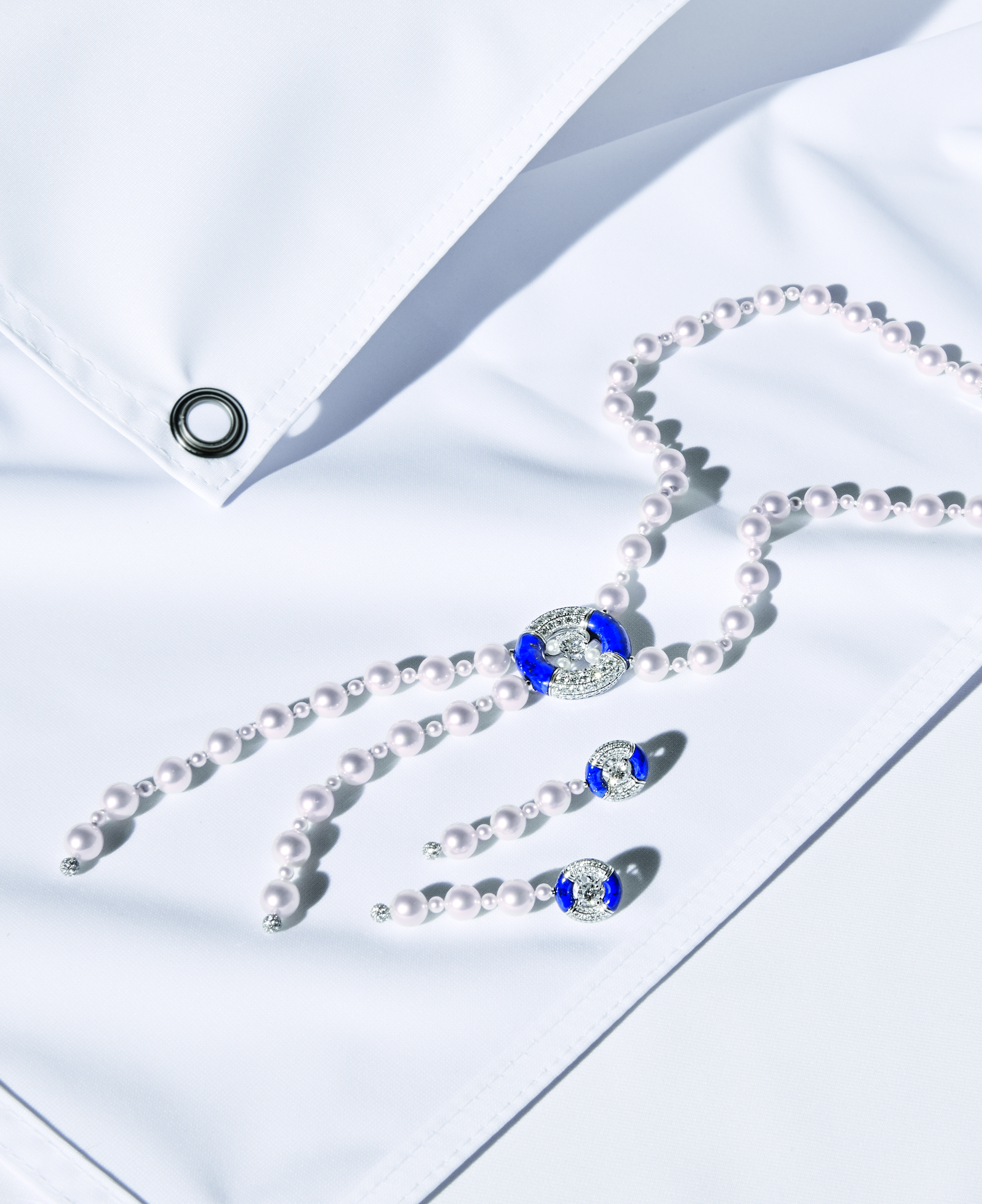 « Precious Float » necklace in 18K white gold set with a round-cut diamond of 1,50 carat, 100 Japanese cultured pearls, Lapis Lazulis and 232 brilliant-cut diamonds. « Precious Float » earrings in 18K white gold set with 2 round-cut diamonds for a total weight of 1,02 carat, 12 Japanese cultured pearls, Lapis Lazulis and 171 brilliant-cut diamonds.