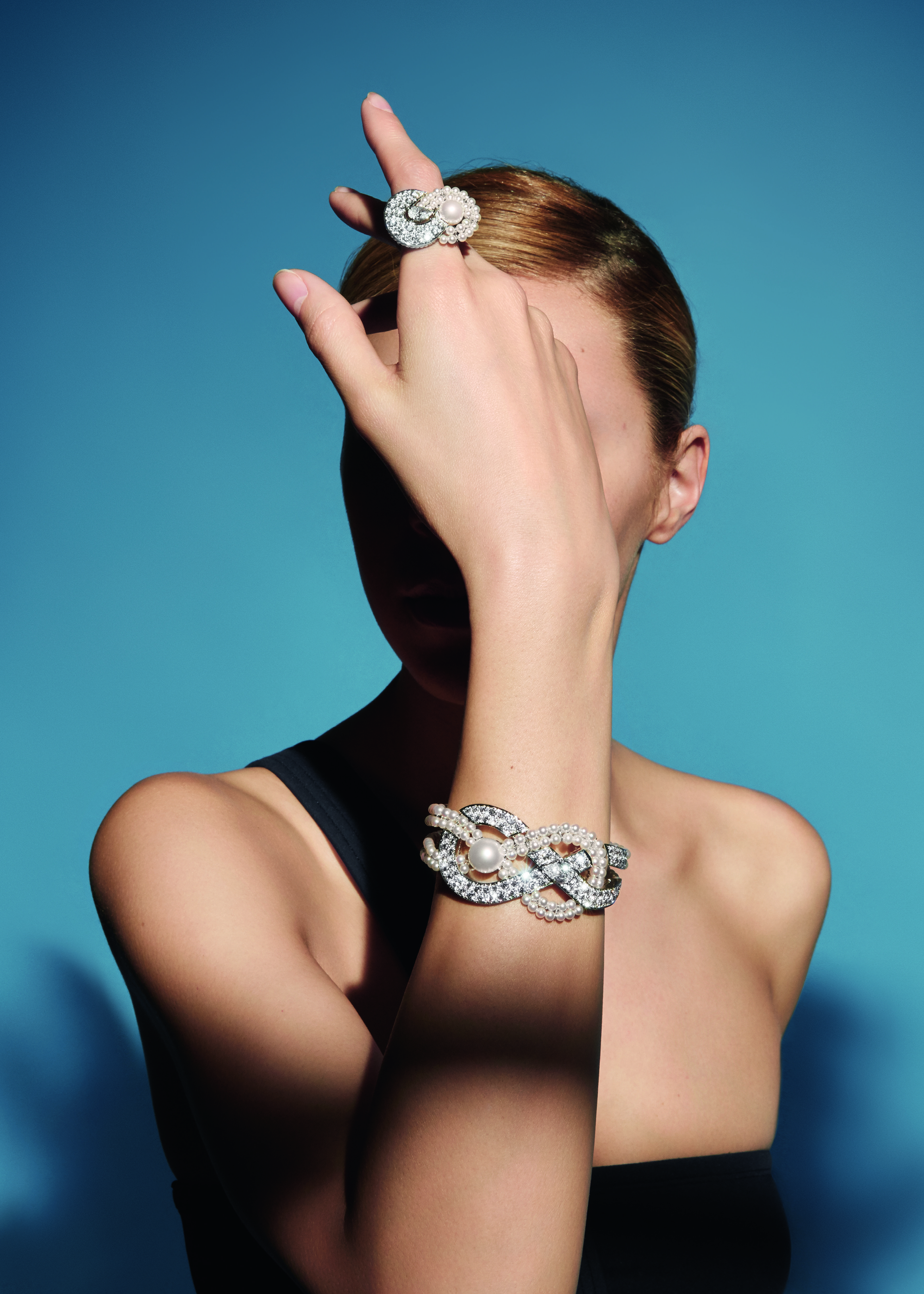 « Endless Knot » ring in 18K white gold set with a pear-cut diamond of 1,01 carat, 26 Japanese cultured pearls and 22 brilliant-cut diamonds. « Endless Knot » bracelet in 18K white gold set with a pear-cut diamond of 1,51 carat, 1 Indonesian cultured pearl, 165 Japanese cultured pearls and 99 brilliant-cut diamonds.