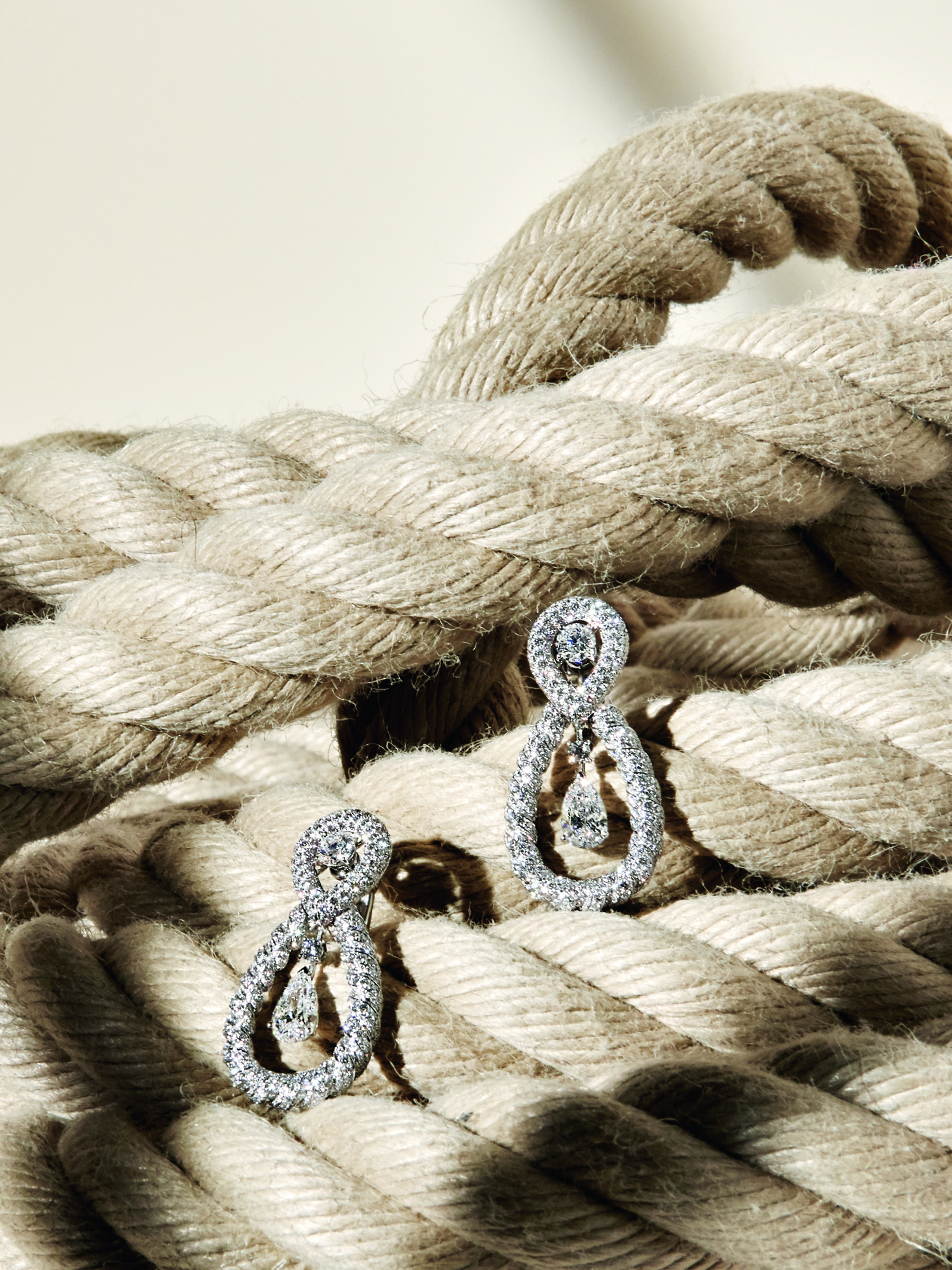 « Endless Knot » earrings in 18K white gold set with 2 pear-cut diamonds for a total weight of 4,67 carats, 2 round-cut diamonds for a total weight of 2,02 carats and 1408 brilliant- cut diamonds.