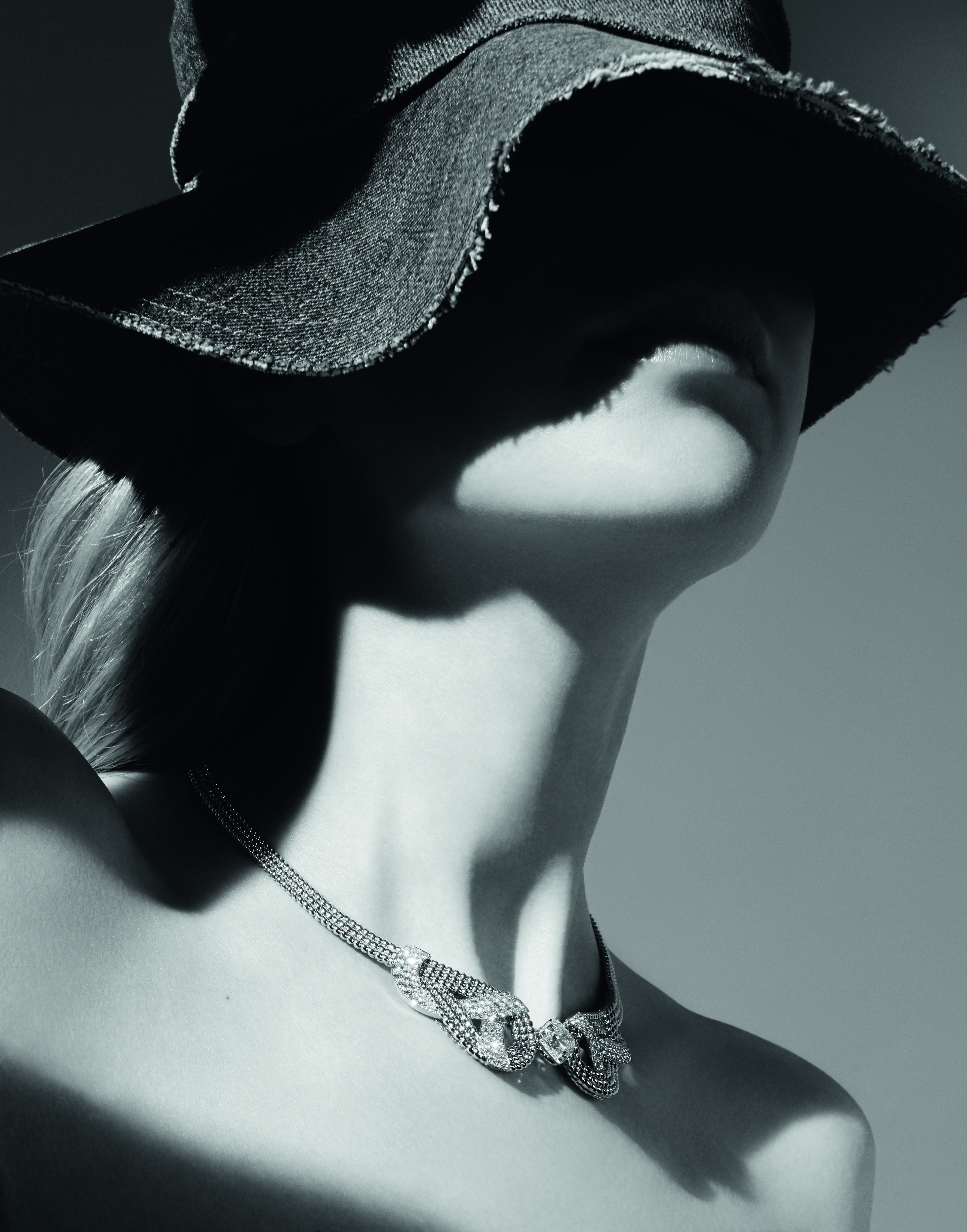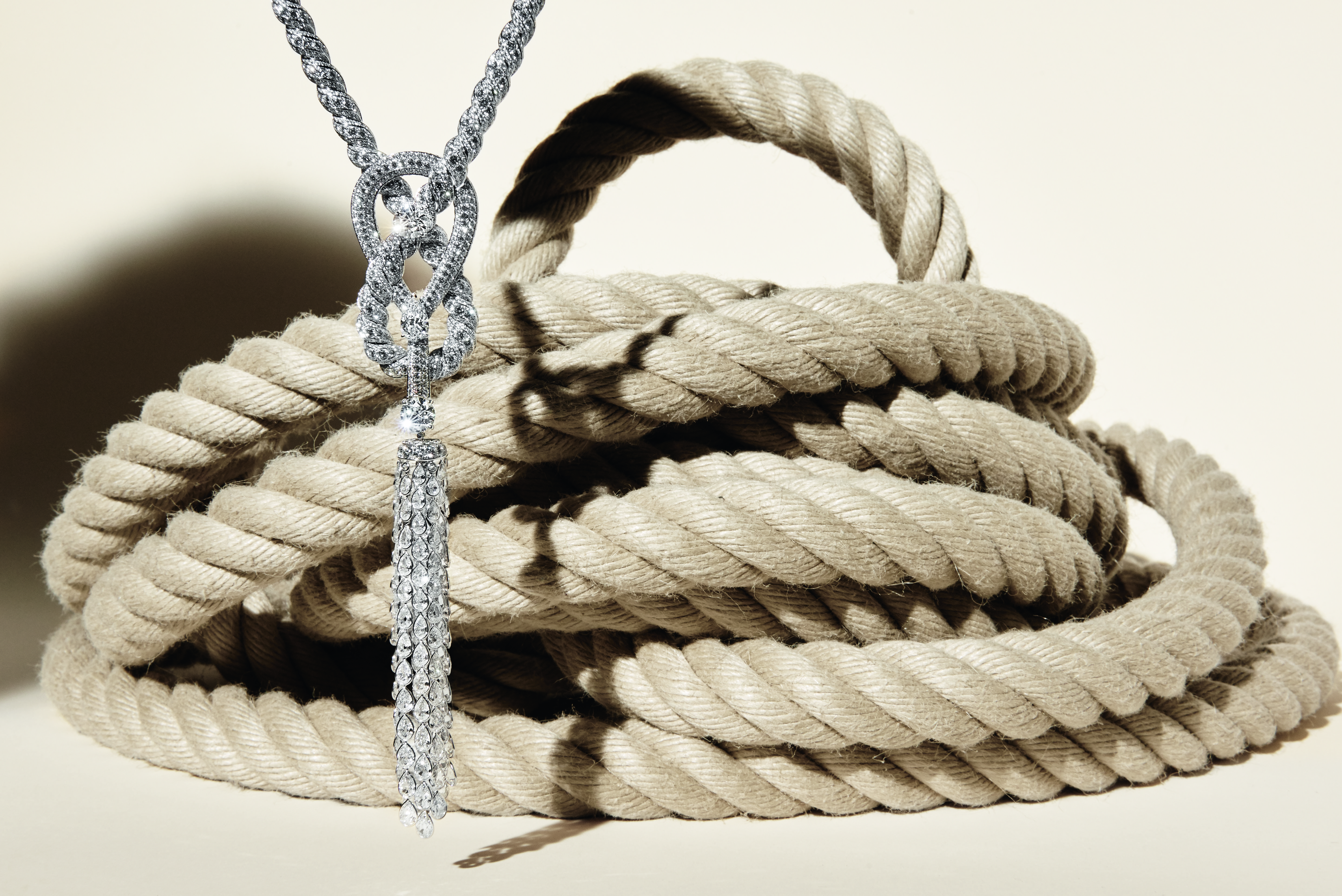 « Endless Knot » necklace in 18K white gold set with a round-cut diamond of 3,51 carats and 2 pear-cut diamonds for a total weight of 6,19 carats, 2637 round-cut diamonds and 106 rose-cut diamonds.
