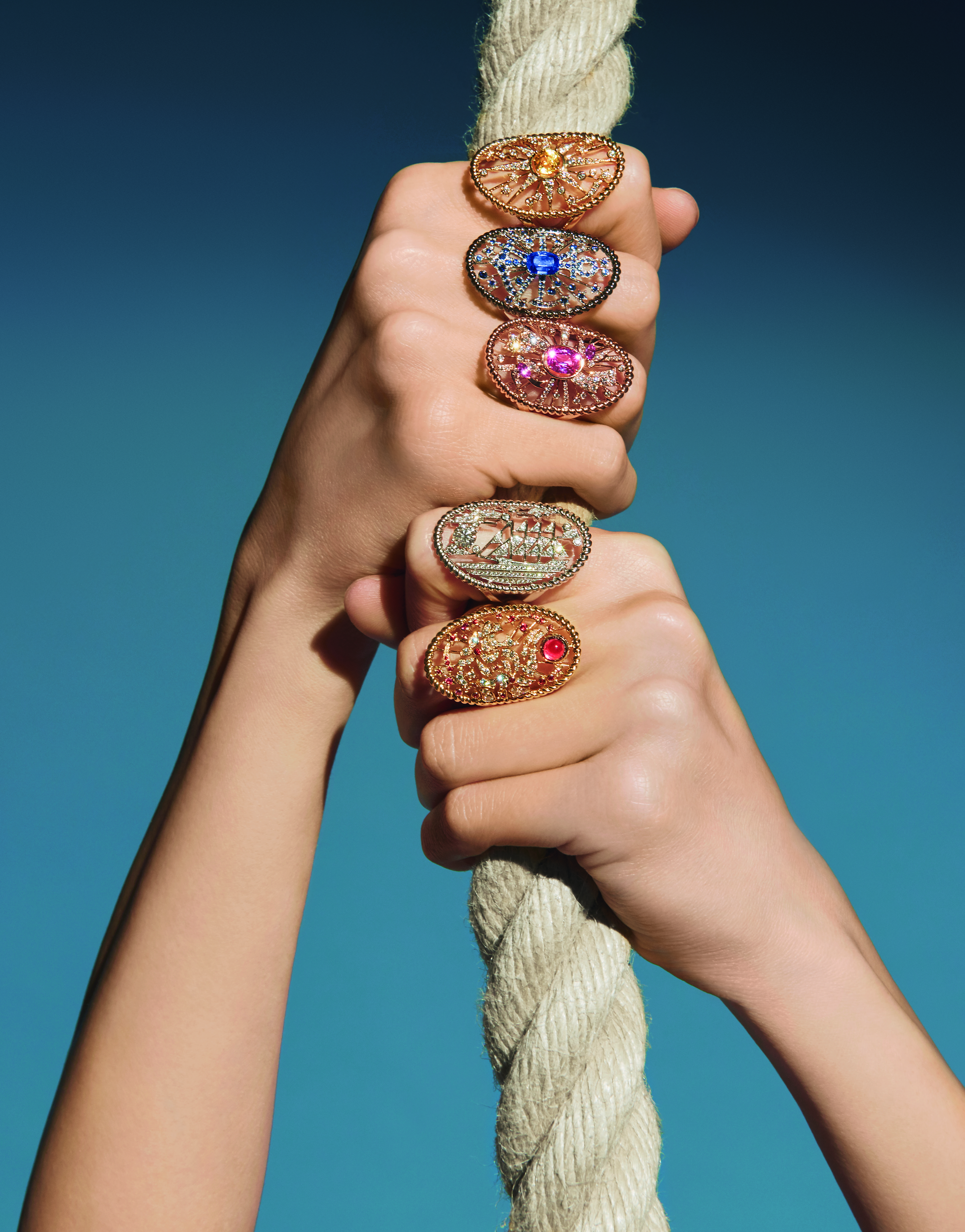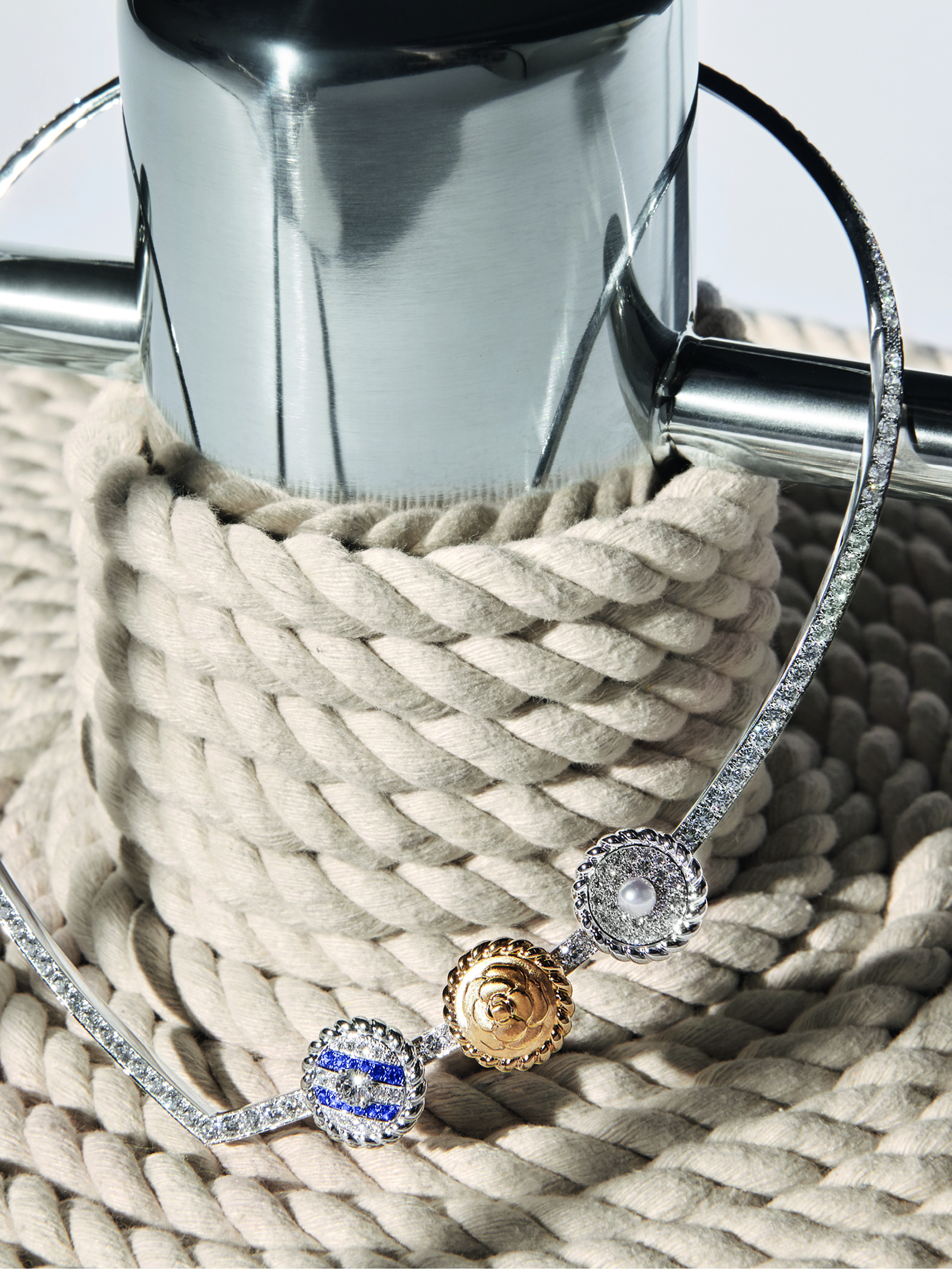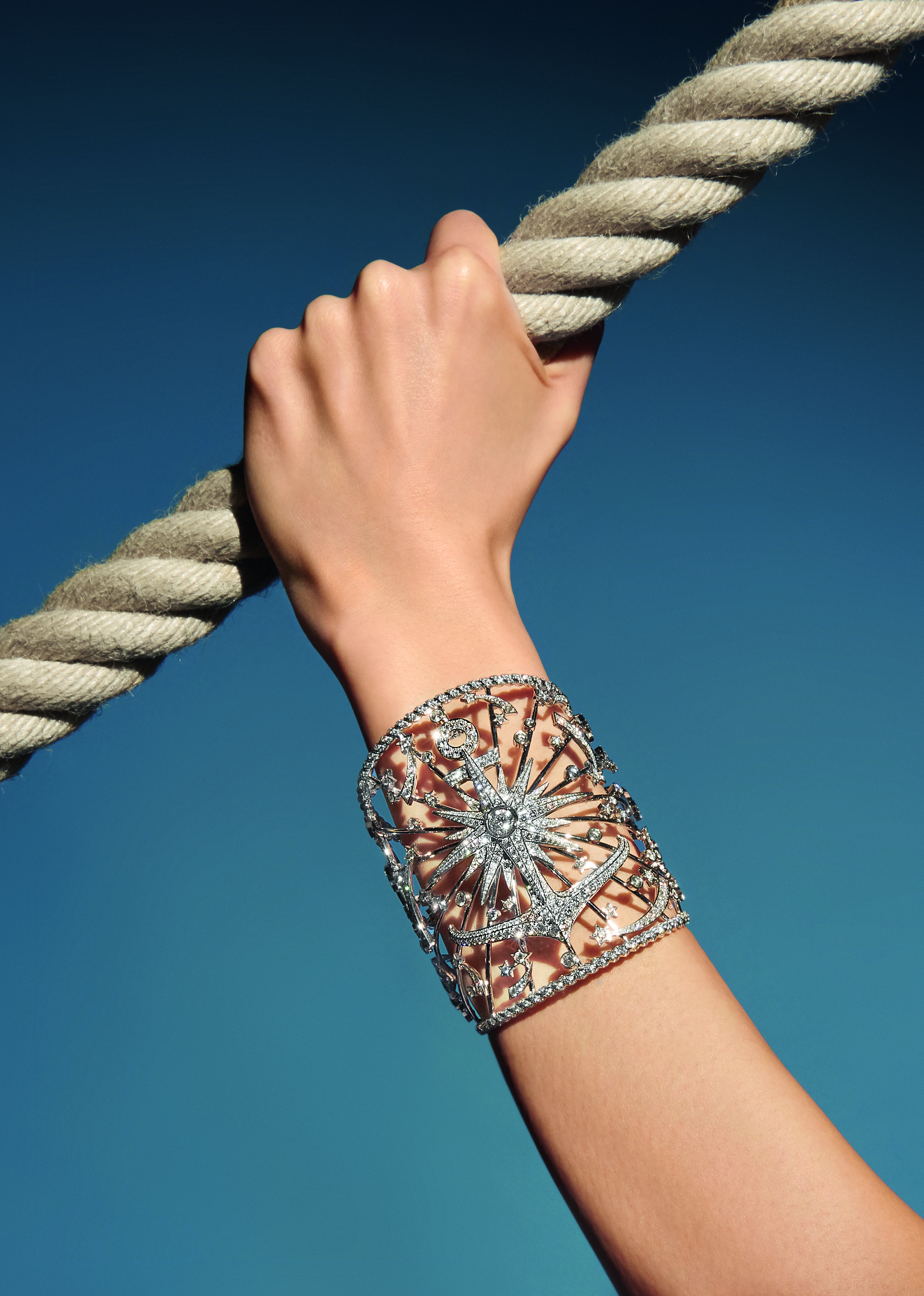 Le premier joue, en les sublimant, avec les éléments les plus simples, les plus nécessaires de la vie à bord : de bouées en or blanc, lapis-lazuli et perles de culture de la ligne Precious Float ; cordages d’or et diamants pour Sparkling Lines ; ancres d’amarrage en or blanc, perles et saphirs de Yachting Day ; voilures, boussoles et tatouages, en or blanc ou jaune, saphirs et diamants pour Sailor Tatoo… Sans oublier les nuances infinies des grandes étendues marines, de la transparence des eaux claires de Turquoise Waters en or blanc, saphirs et diamants, ou au bleu sombre et profond de la haute mer de la parure Deep Blue en saphirs, or blanc et diamants.