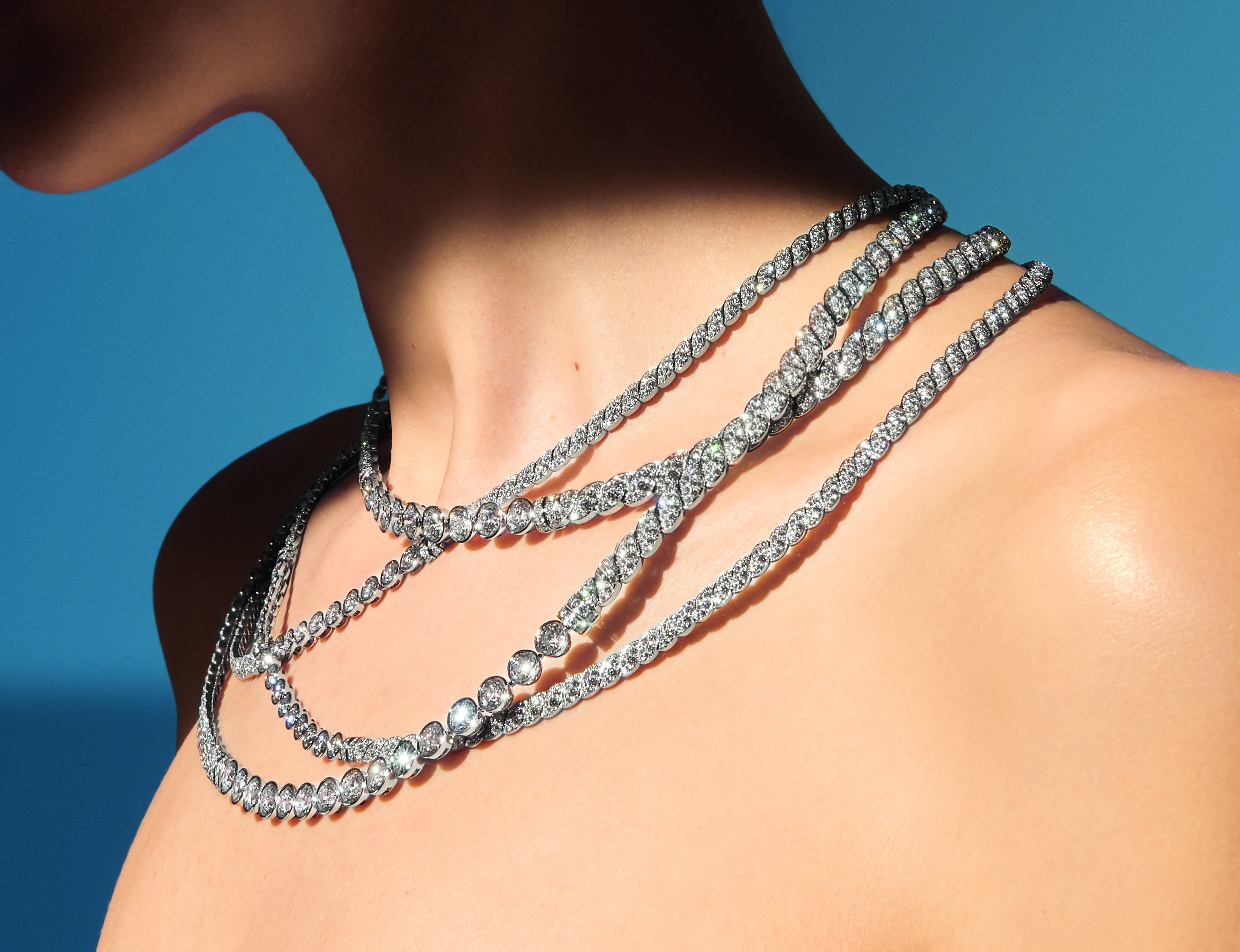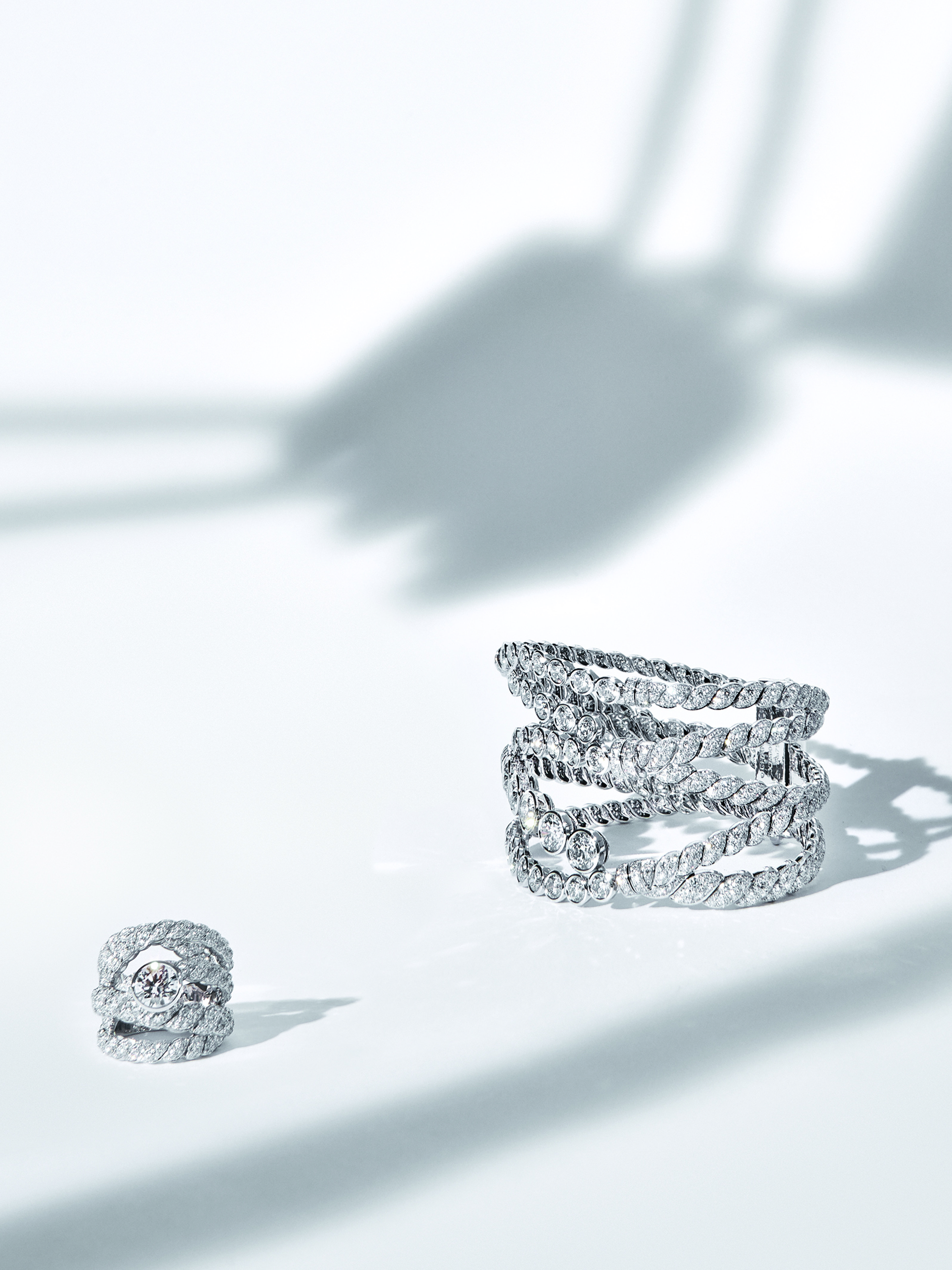 Points d’orgue de cette collection dédiée à la lumière dorée du soleil et à la fraîcheur de la brise méditerranéenne, deux pièces uniques, au travail d’orfèvrerie virtuose : un collier plastron, tressage d’or blanc, de saphirs et de perles de culture dans la ligne Azurean Braid, et un cordage souple d’or blanc et de diamants dans la ligne Endless Knot.
