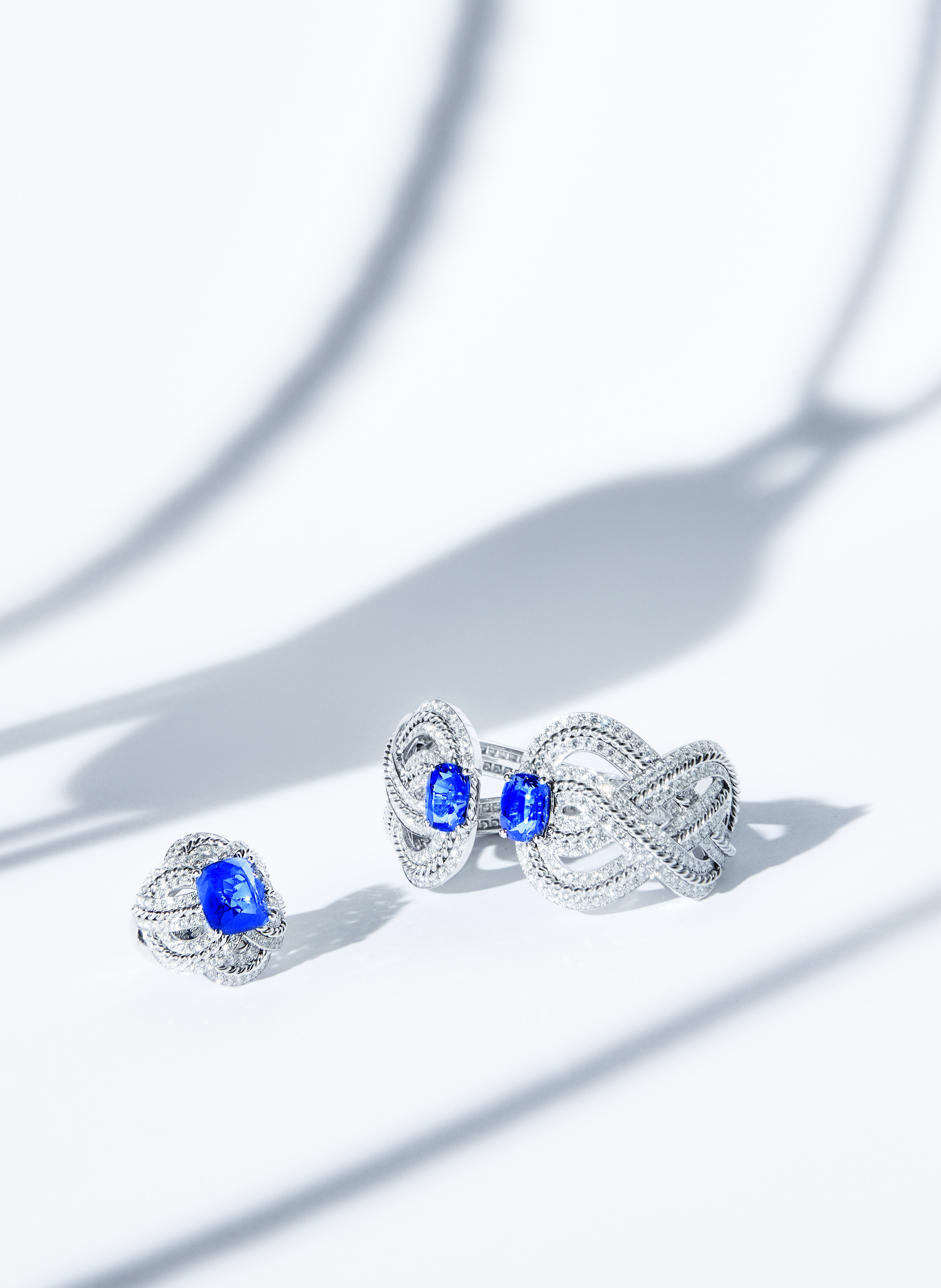 « Azurean Braid » ring in 18K white gold set with a cushion-cut blue sapphire of 11,49 carats and 112 brilliant-cut diamonds. « Azurean Braid » bracelet in 18K white gold set with 2 cushion-cut blue sapphires for a total weight of 14,96 carats and 390 brilliant-cut diamonds.