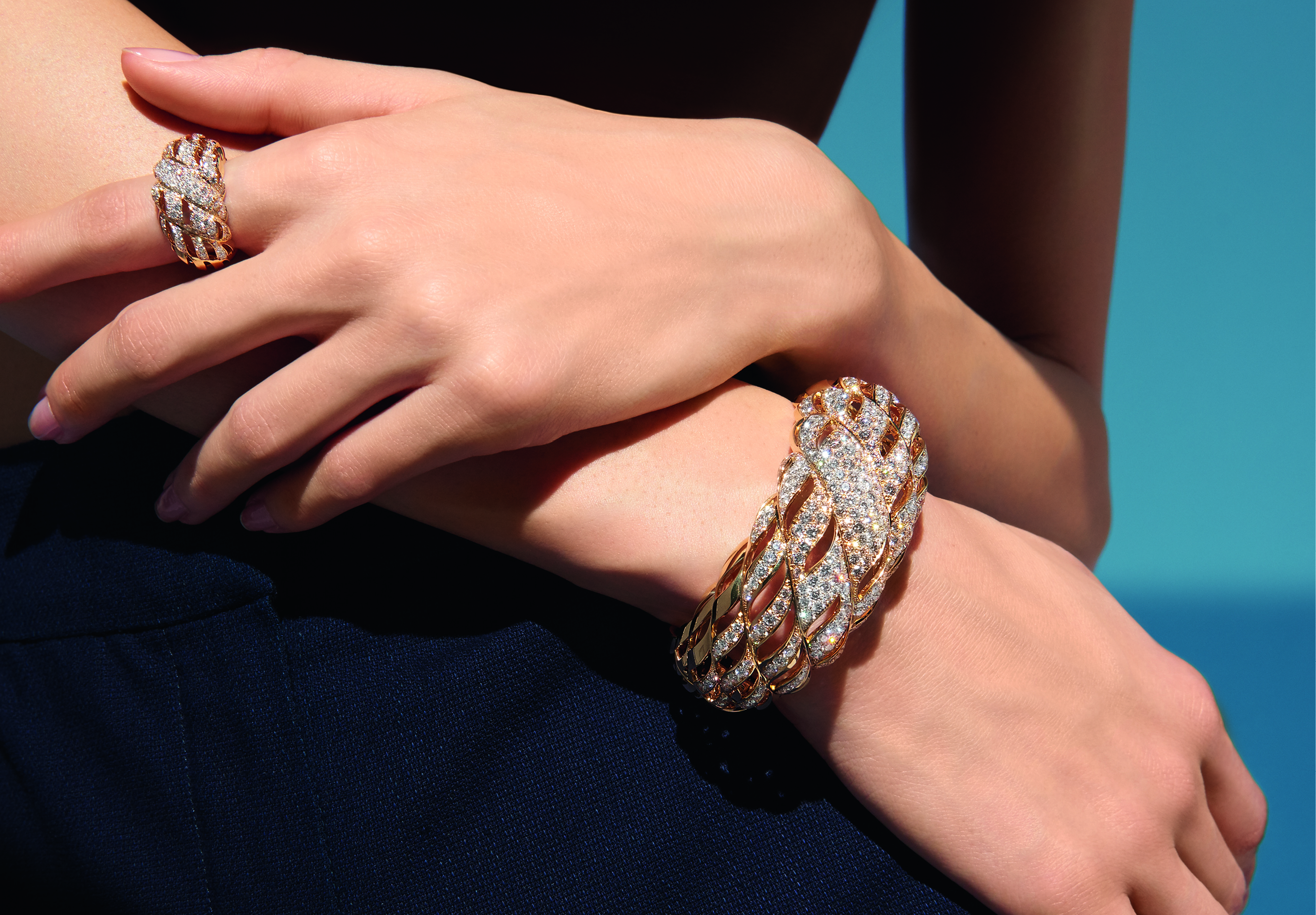 « Sunny Rope » ring in 18K yellow gold set with 177 brilliant-cut diamonds. « Sunny Rope » bracelet in 18K yellow gold set with 321 brilliant-cut diamonds.