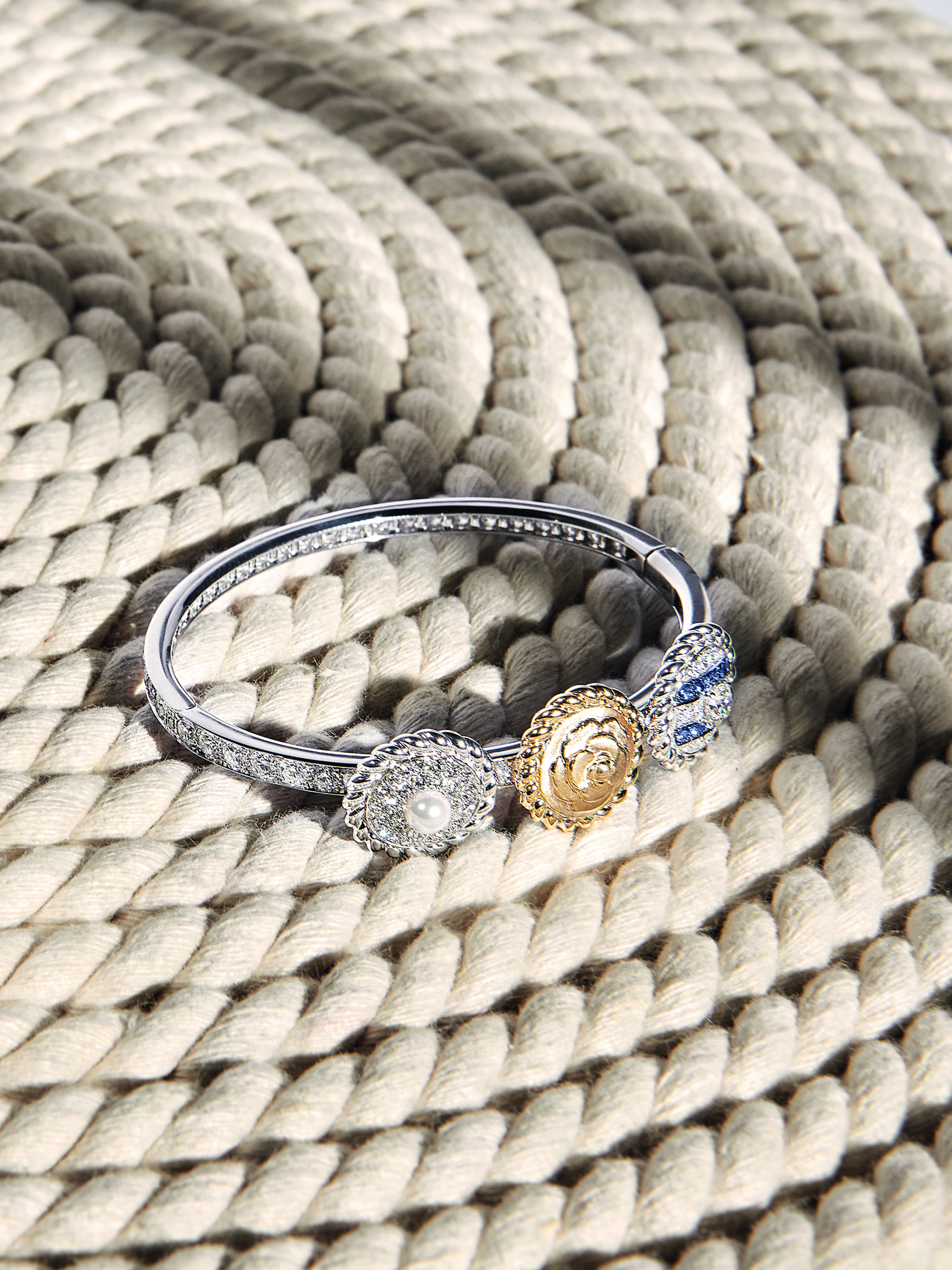 « Sailor Suit » bracelet in 18K white and yellow gold set with a round-cut diamond, 12 blue sapphires, 1 cultured pearl and 86 brilliant-cut diamonds.