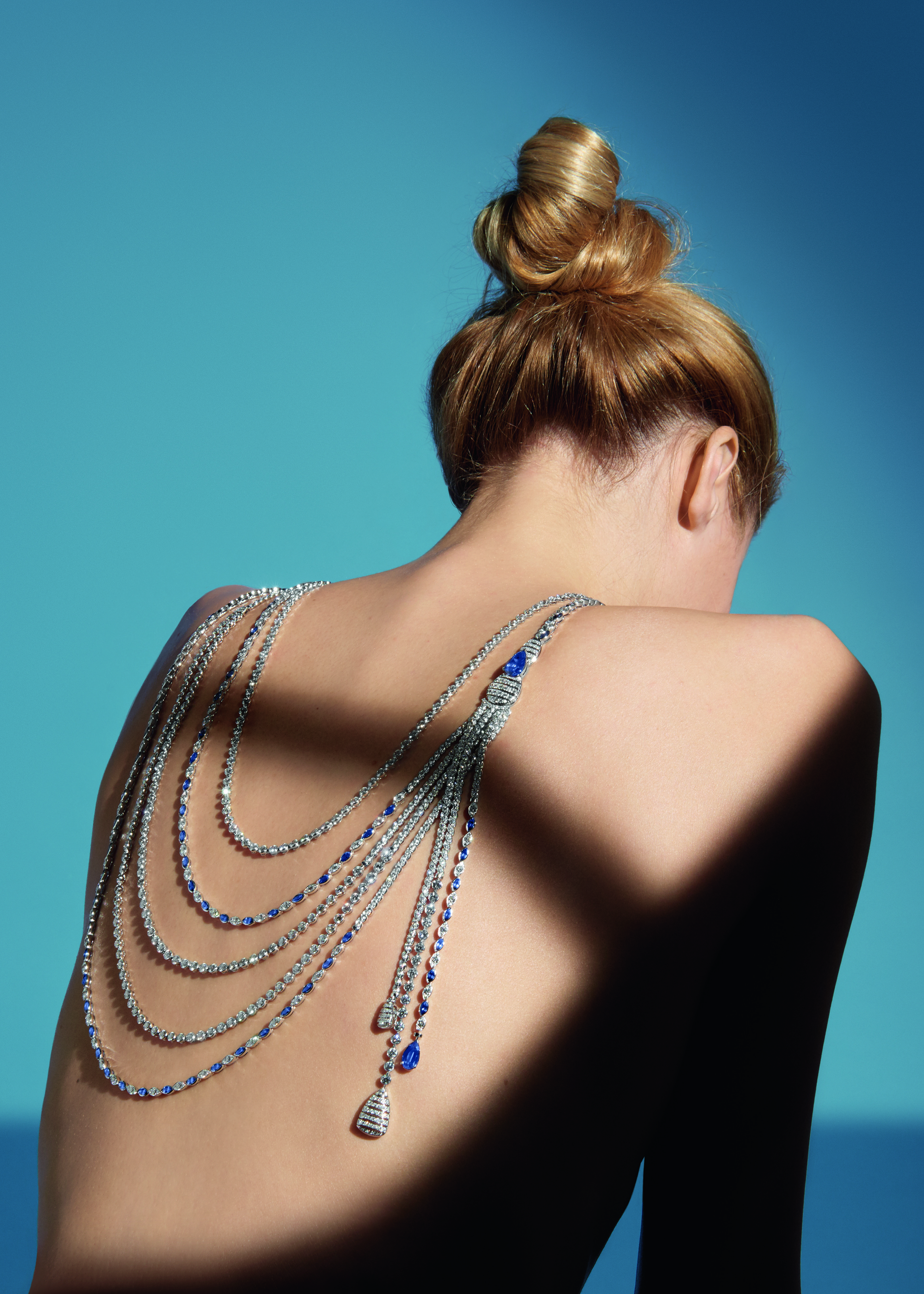 « Turquoise Waters » necklace in 18K white gold set with a pear-cut diamond of 2,58 carats, 12 cushion-cut blue sapphires, 34 oval-cut blue sapphires, 3 pear-cut blue sapphires, 2 round-cut blue sapphires and 1552 brilliant-cut diamonds for a total weight of 23,84 carats.
