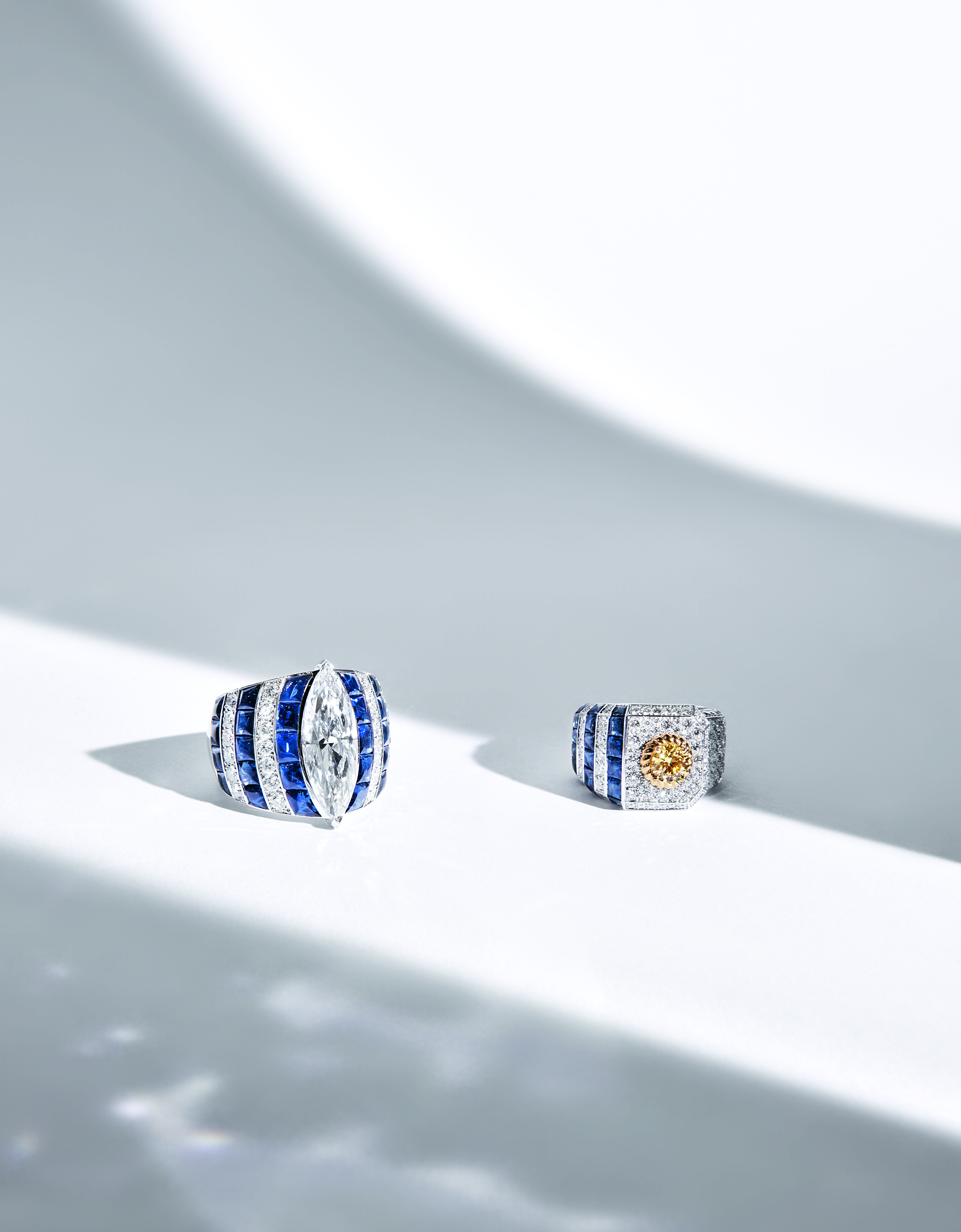 Summer Cruise » ring in 18K white gold set with a marquise-cut diamond of 5,02 carats, 28 blue sapphires and 26 brilliant-cut diamonds. « Summer Cruise » ring in 18K white and yellow gold set with a Fancy Intense Yellow round-cut diamond of 0,51 carat, 18 blue sapphires and 131 brilliant-cut diamonds.