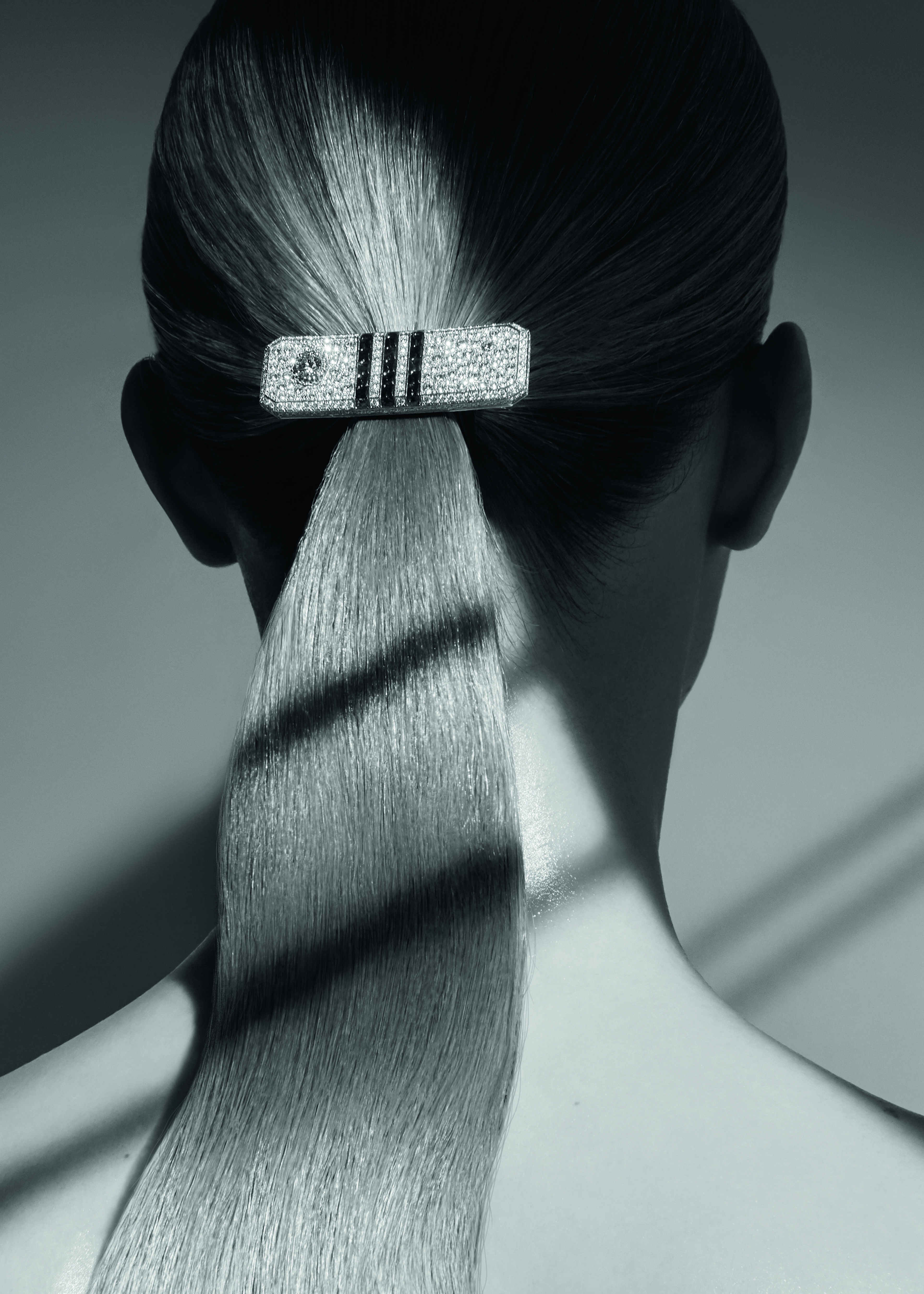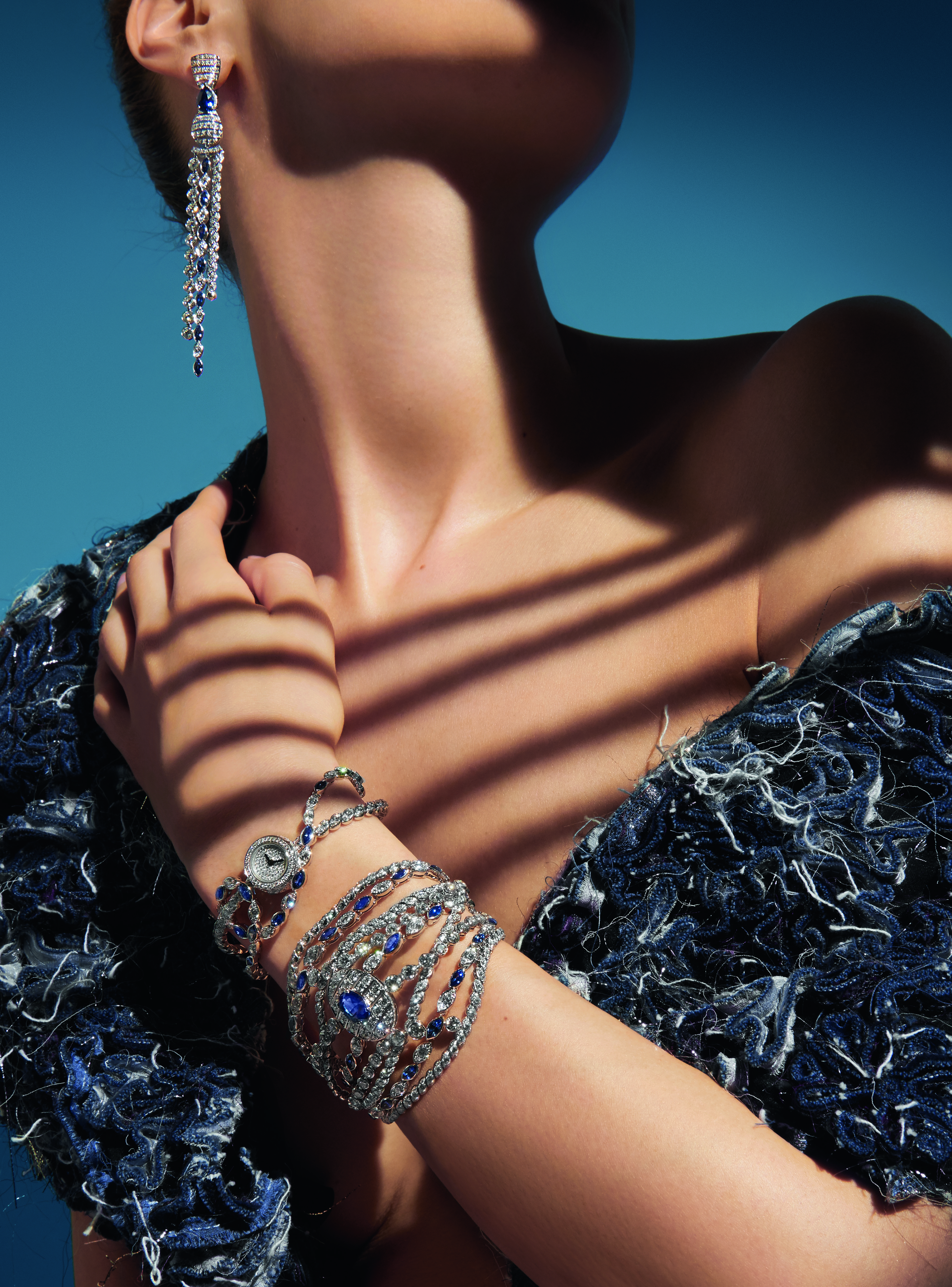 « Sapphire Stripes » earrings in 18K white gold set with 2 pear-cut blue sapphires for a total weight of 2,87 carats, 14 marquise-cut blue sapphires and 296 brilliant-cut diamonds. « Sapphire Stripes » watch in 18K white gold set with 11 marquise-cut blue sapphires and 248 brilliant-cut diamonds. « Sapphire Stripes » bracelet in 18K white gold set with an oval- cut blue sapphire of 4,11 carats, 22 marquise-cut blue sapphires, 6 round-cut diamonds and 765 brilliant-cut diamonds.