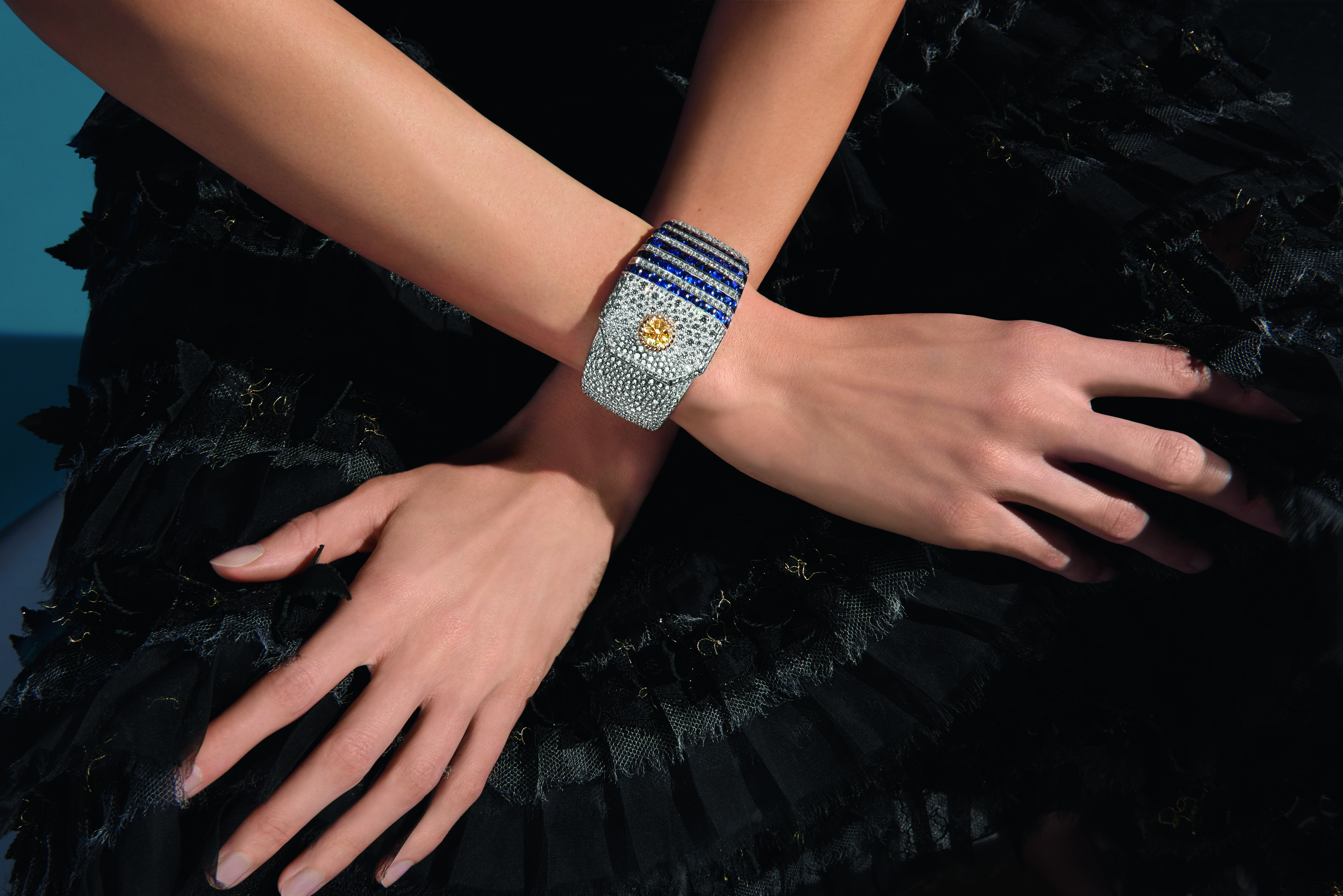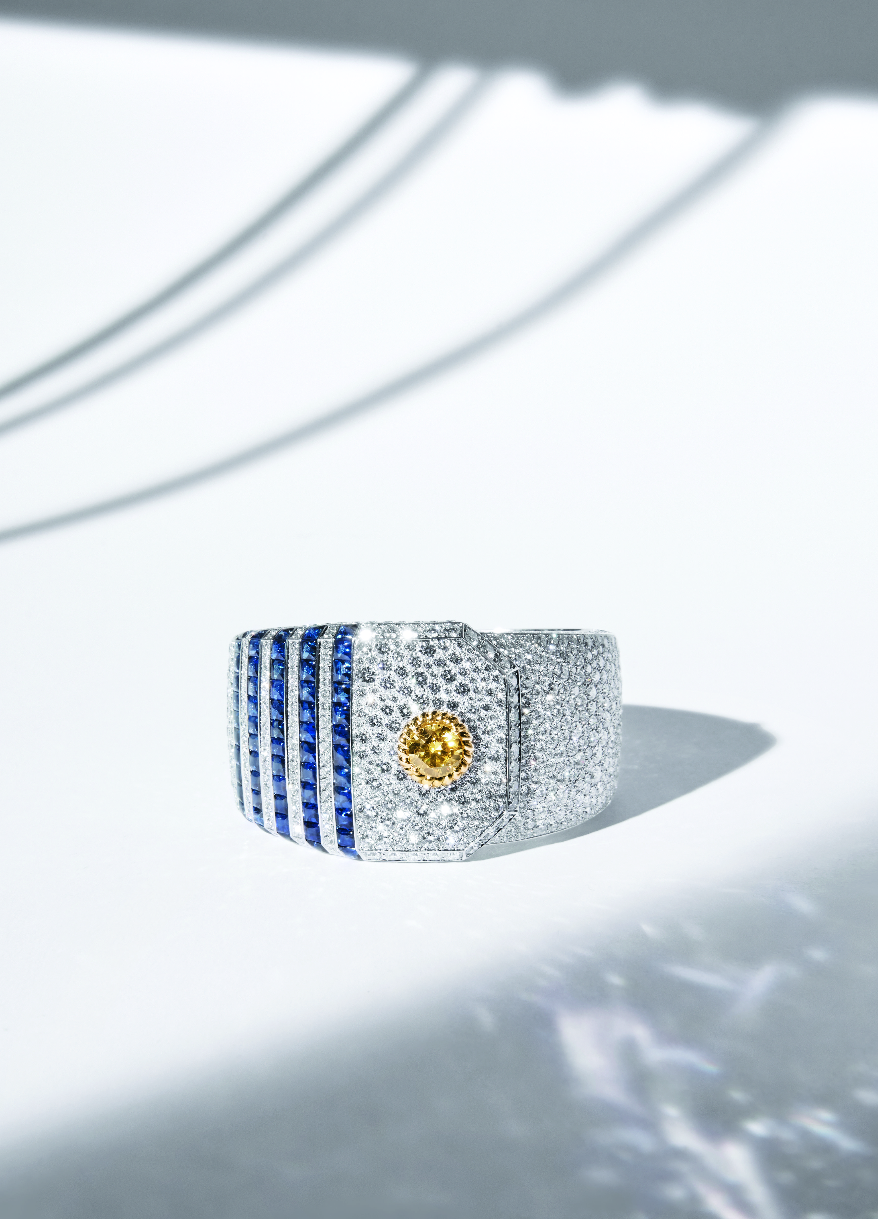 « Summer Cruise » cuff in 18K white and yellow gold set with a Fancy Intense Yellow round-cut diamond of 2 carats, 60 blue sapphires and 1306 brilliant-cut diamonds.