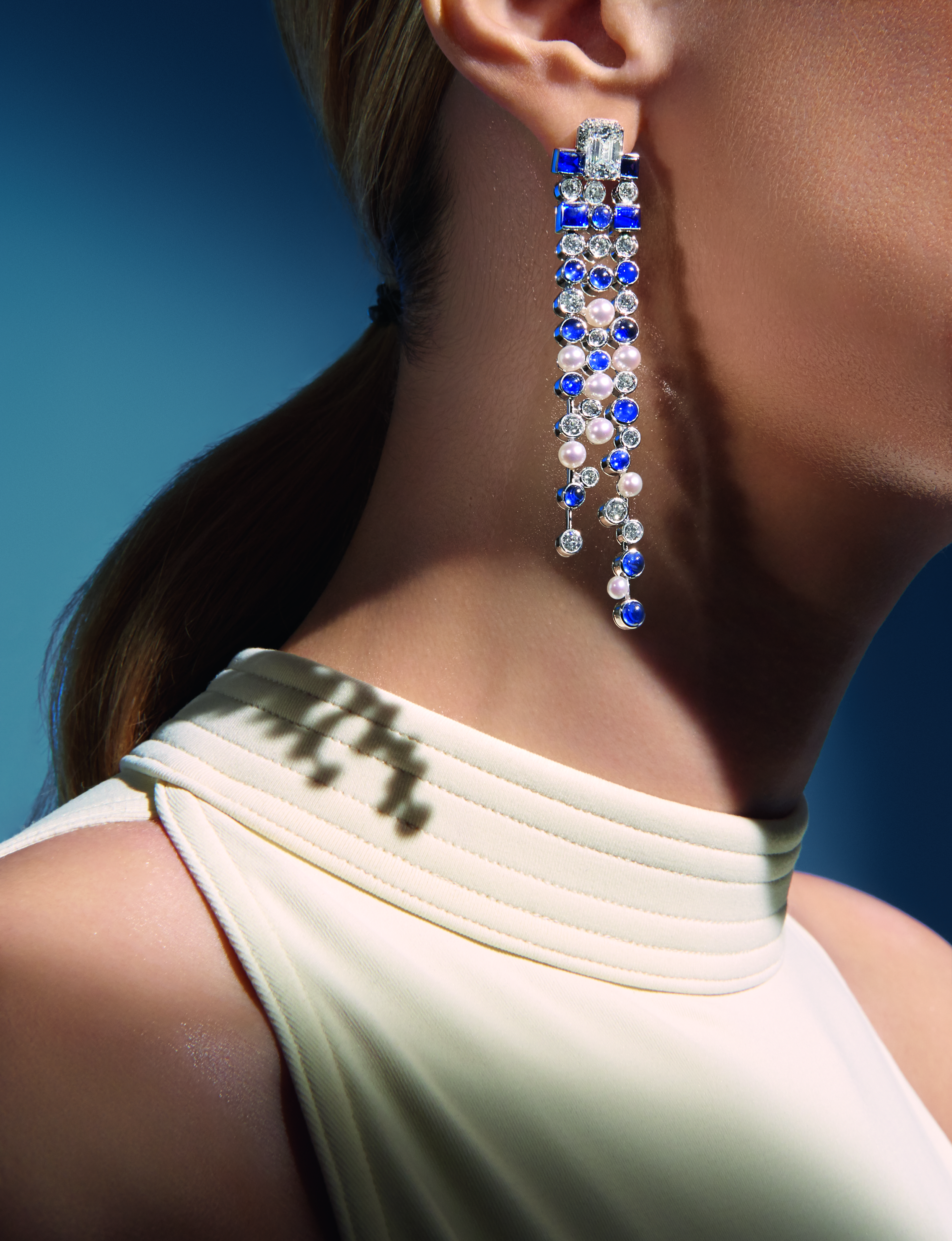 « Sapphire Stripes » earrings in 18K white gold set with 2 pear-cut blue sapphires for a total weight of 2,87 carats, 14 marquise-cut blue sapphires and 296 brilliant-cut diamonds. « Sapphire Stripes » watch in 18K white gold set with 11 marquise-cut blue sapphires and 248 brilliant-cut diamonds. « Sapphire Stripes » bracelet in 18K white gold set with an oval- cut blue sapphire of 4,11 carats, 22 marquise-cut blue sapphires, 6 round-cut diamonds and 765 brilliant-cut diamonds.