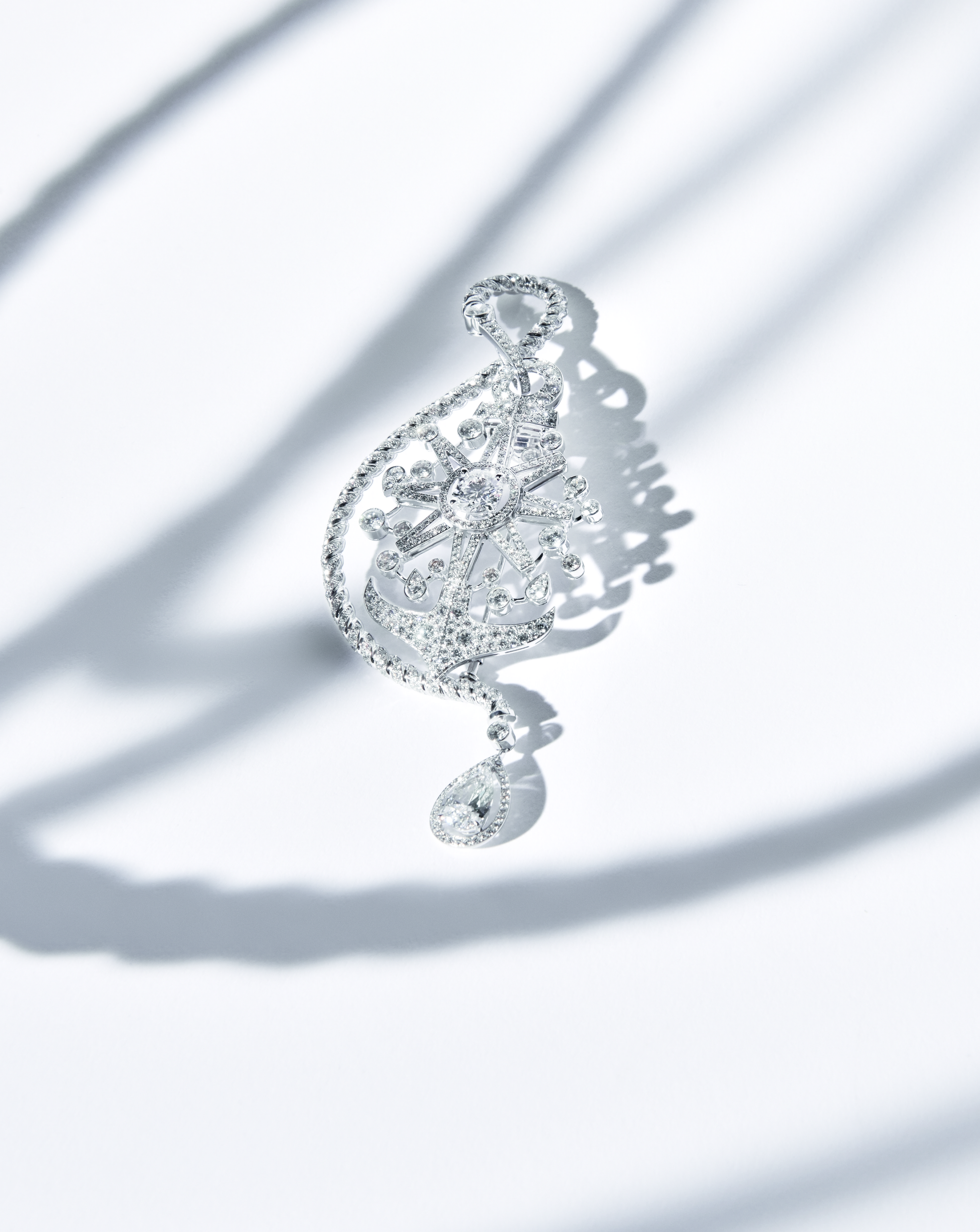 « Yachting Day » brooch in 18K white gold set with a round-cut diamond of 1,57 carat, 1 pear-cut diamond of 1,53 carat and 481 brilliant-cut diamonds.