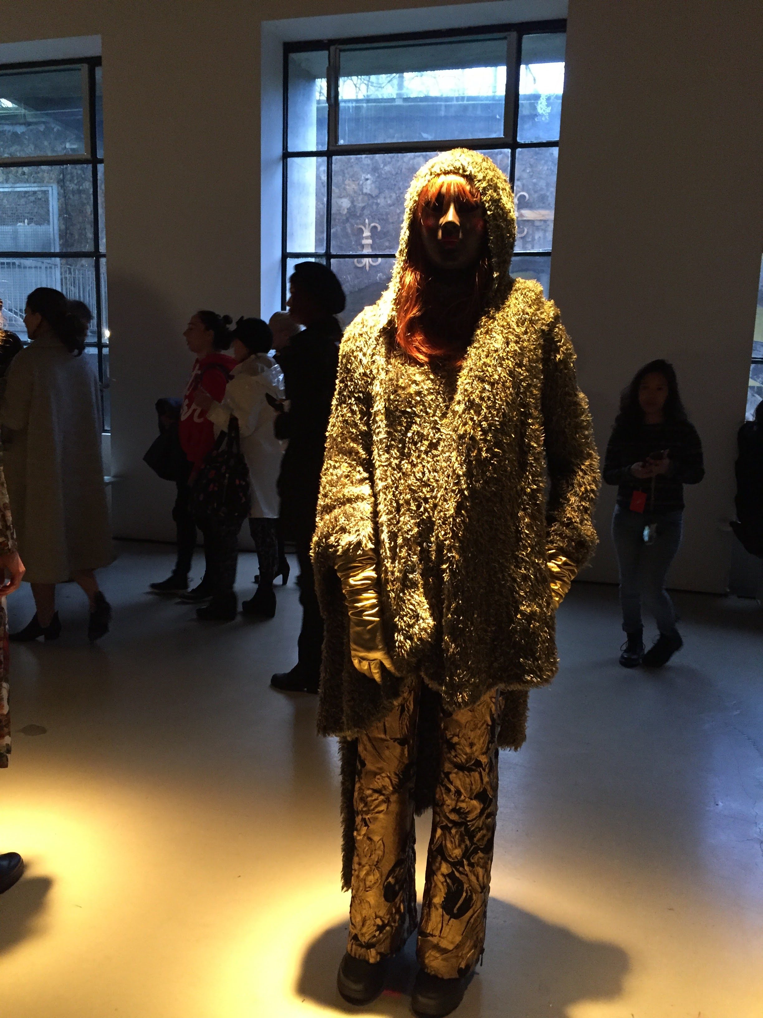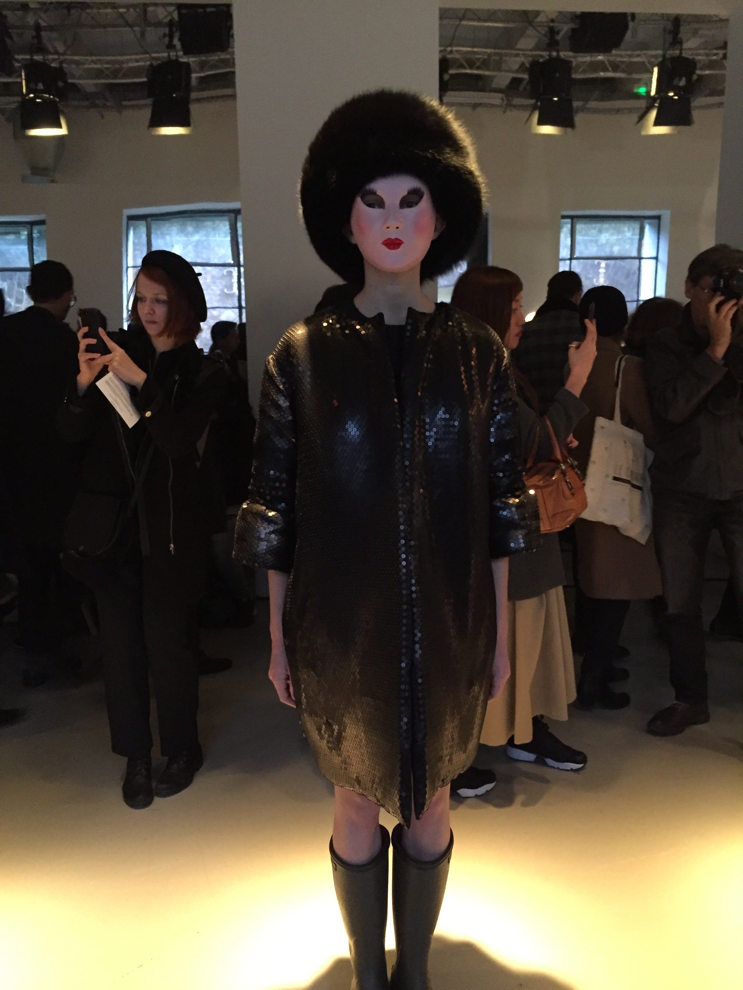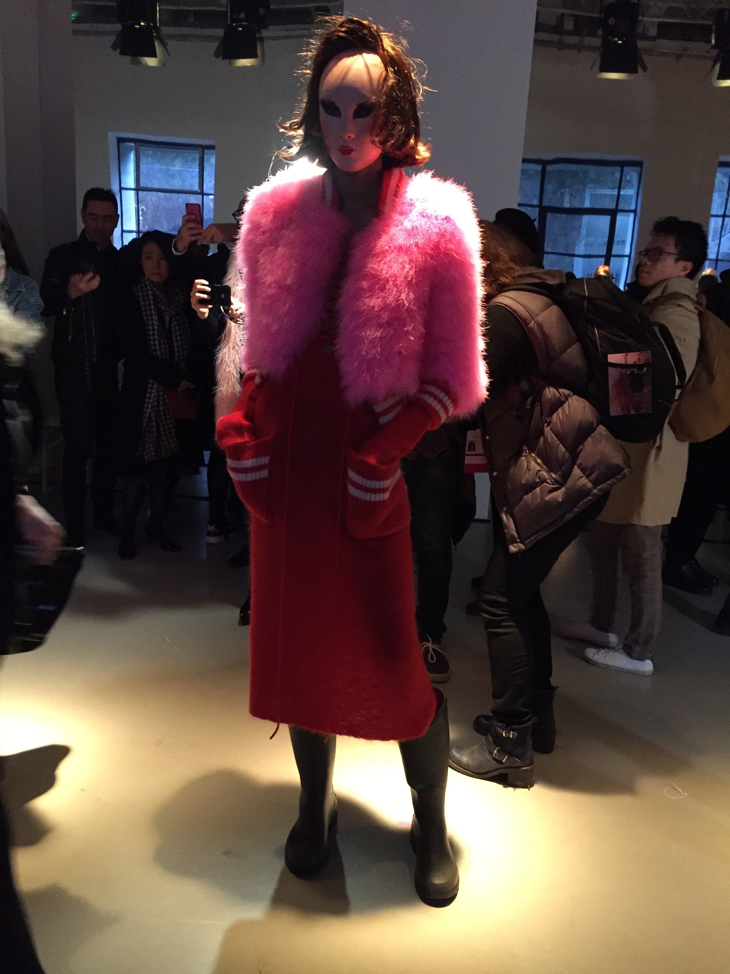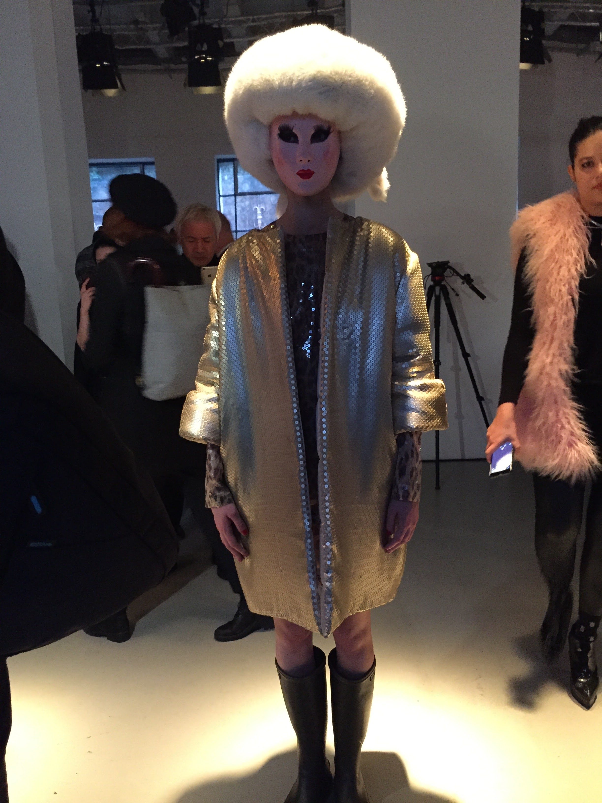 Manteaux plume à paillettes sur tuniques panthères, blousons cygnes fluos à bord-cote college sur robe tricotées, mailles fourrures de soie, pull brodés d’or, les couleurs éclatent, les silhouettes et les époques se télescopent.