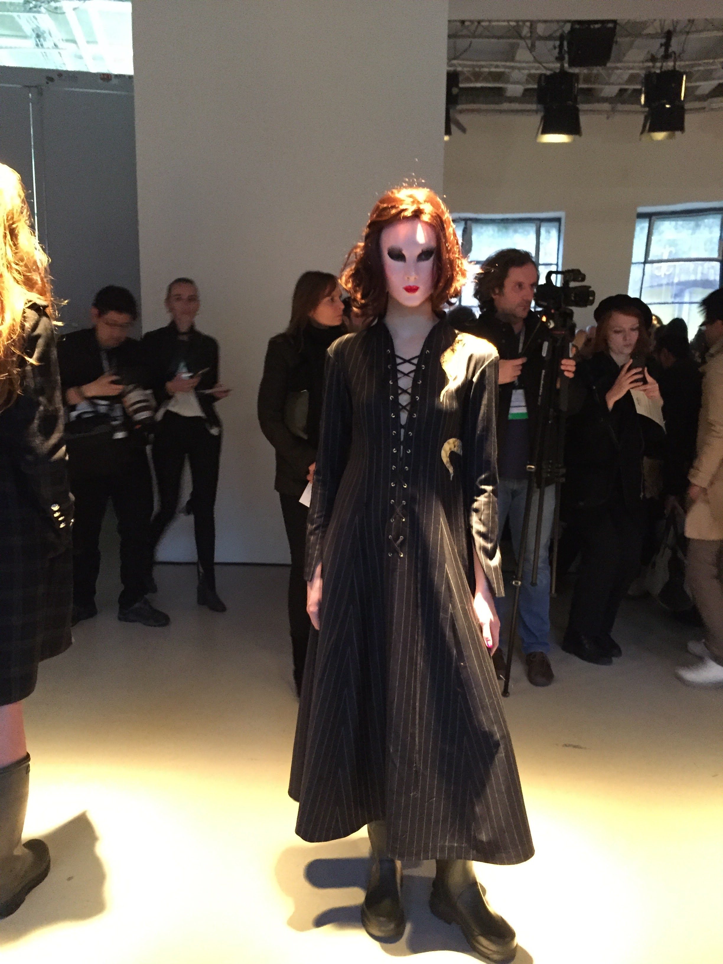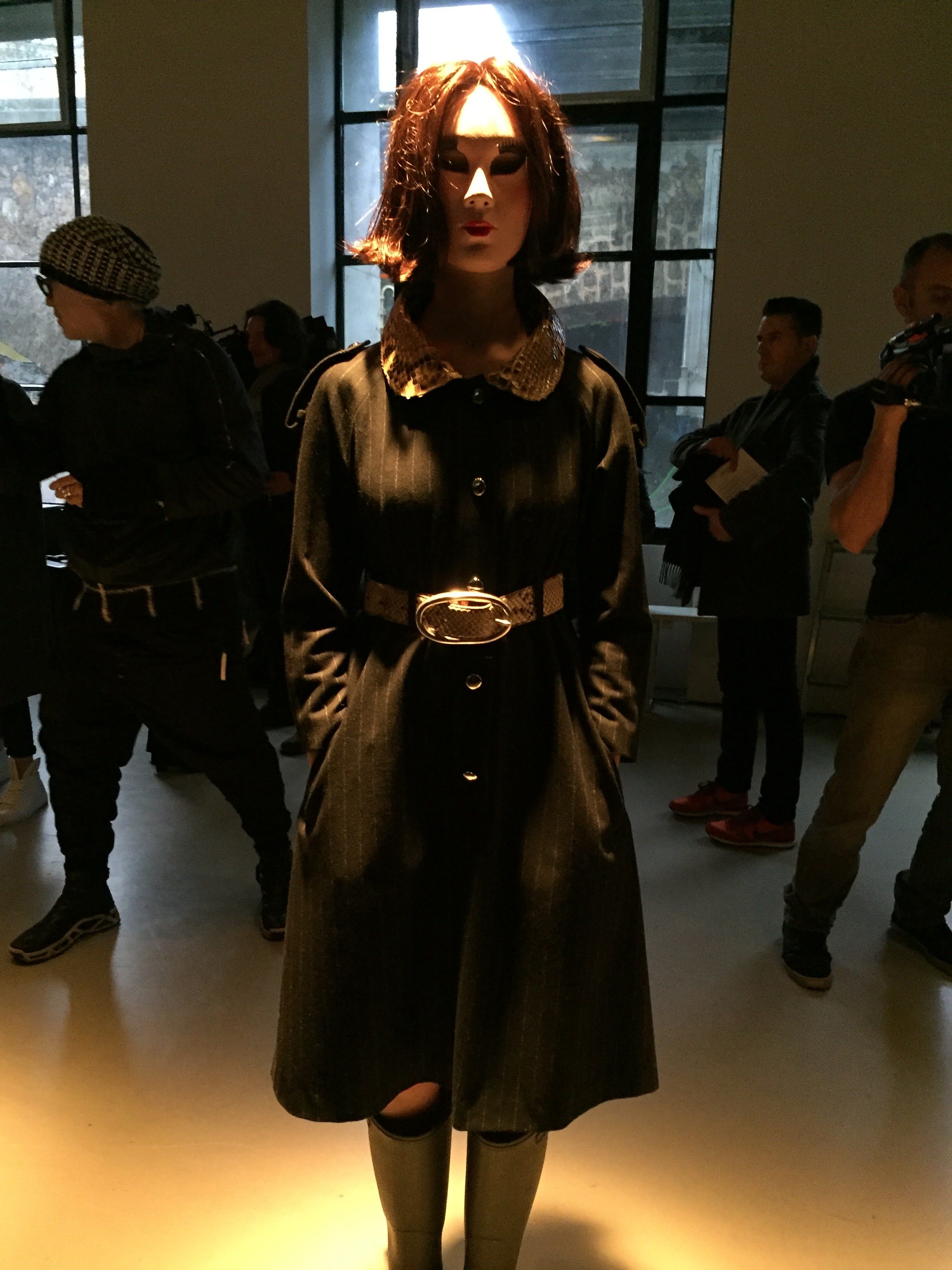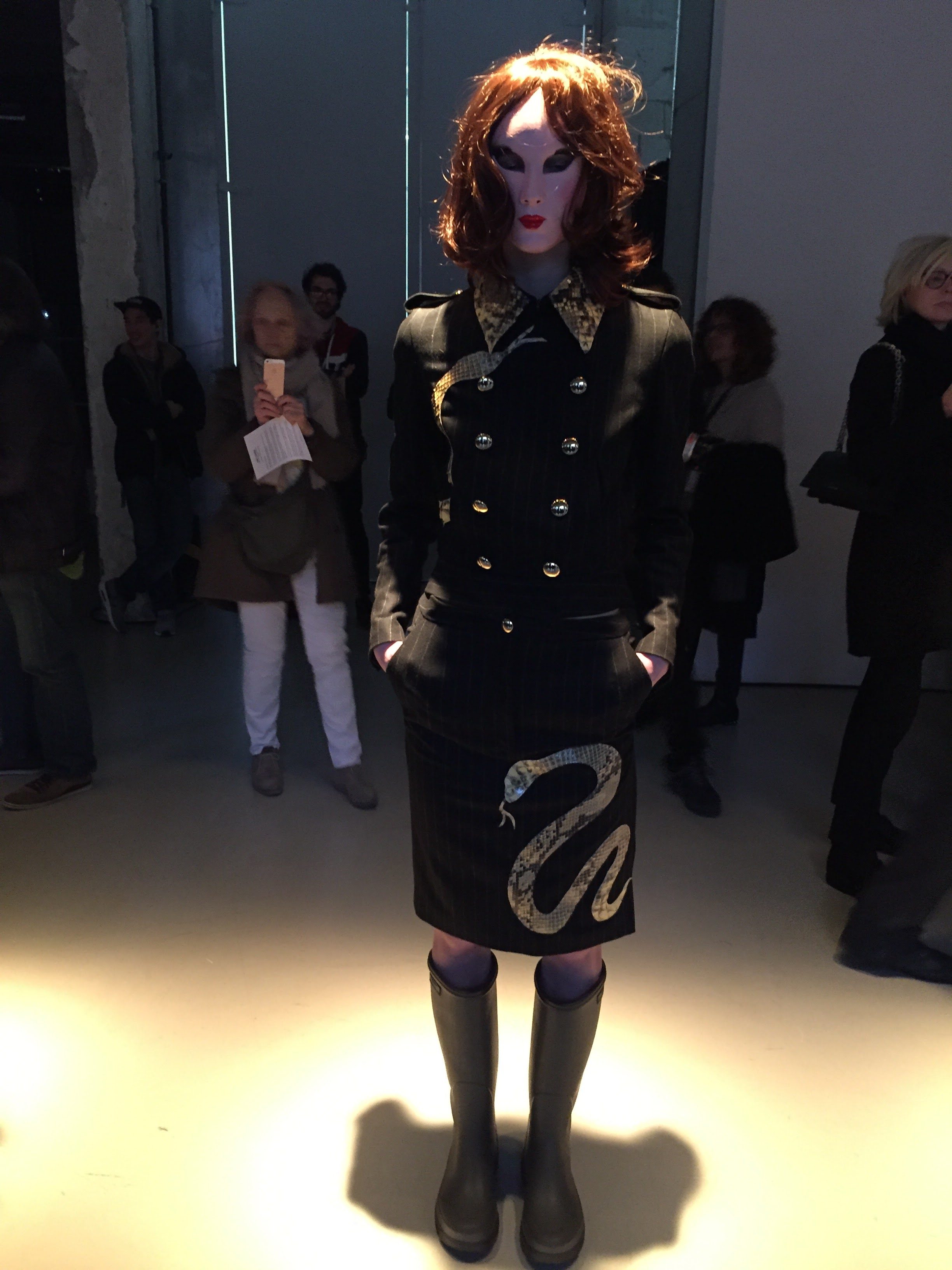 Tailleurs perfectos, pardessus impecs, jupes crayons en drap de laine rayures tennis marine envenimés de pythons sinueux. Blouses et robes de crêpe immaculé scandées d’arétes plissées noir jais
