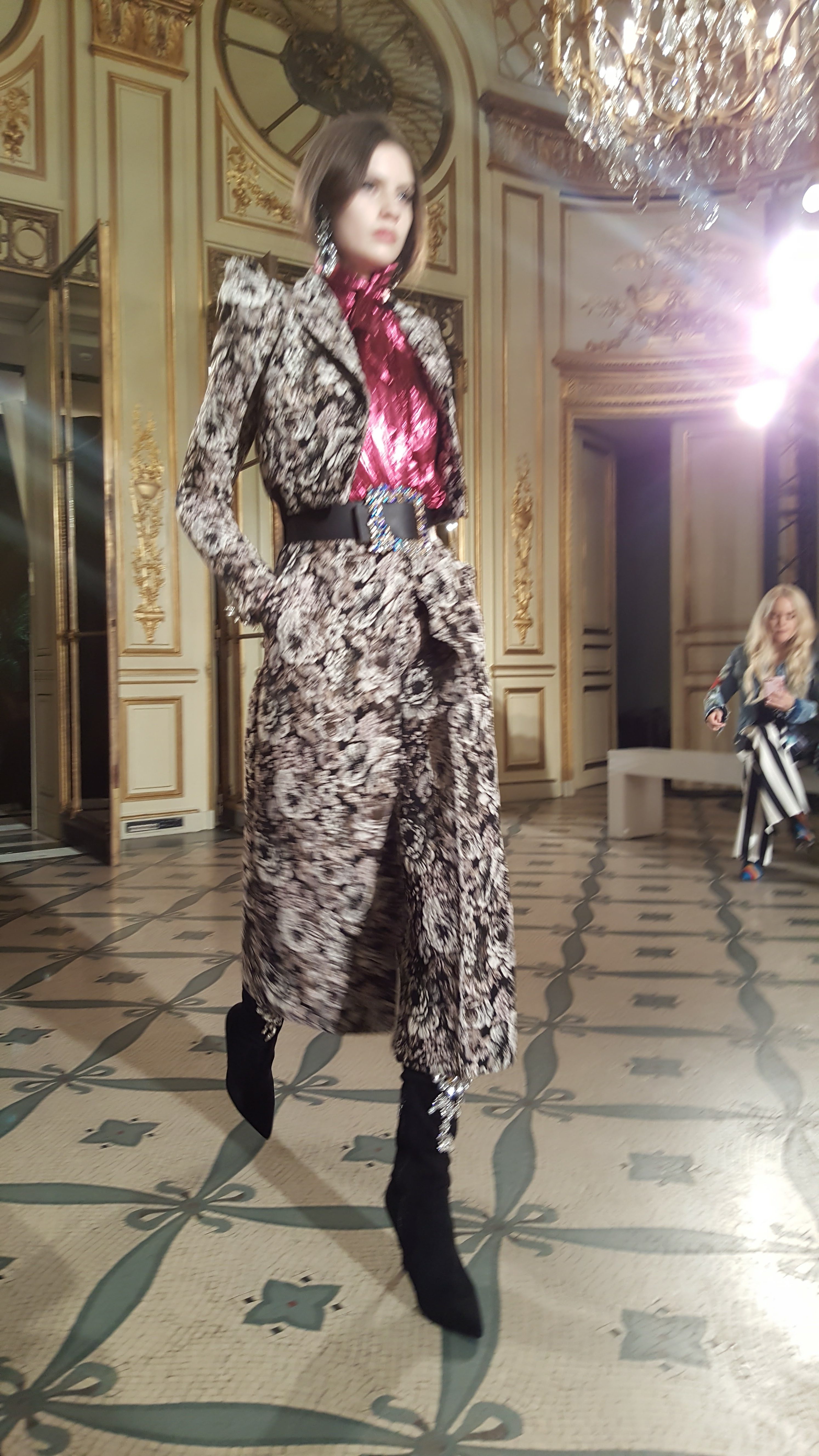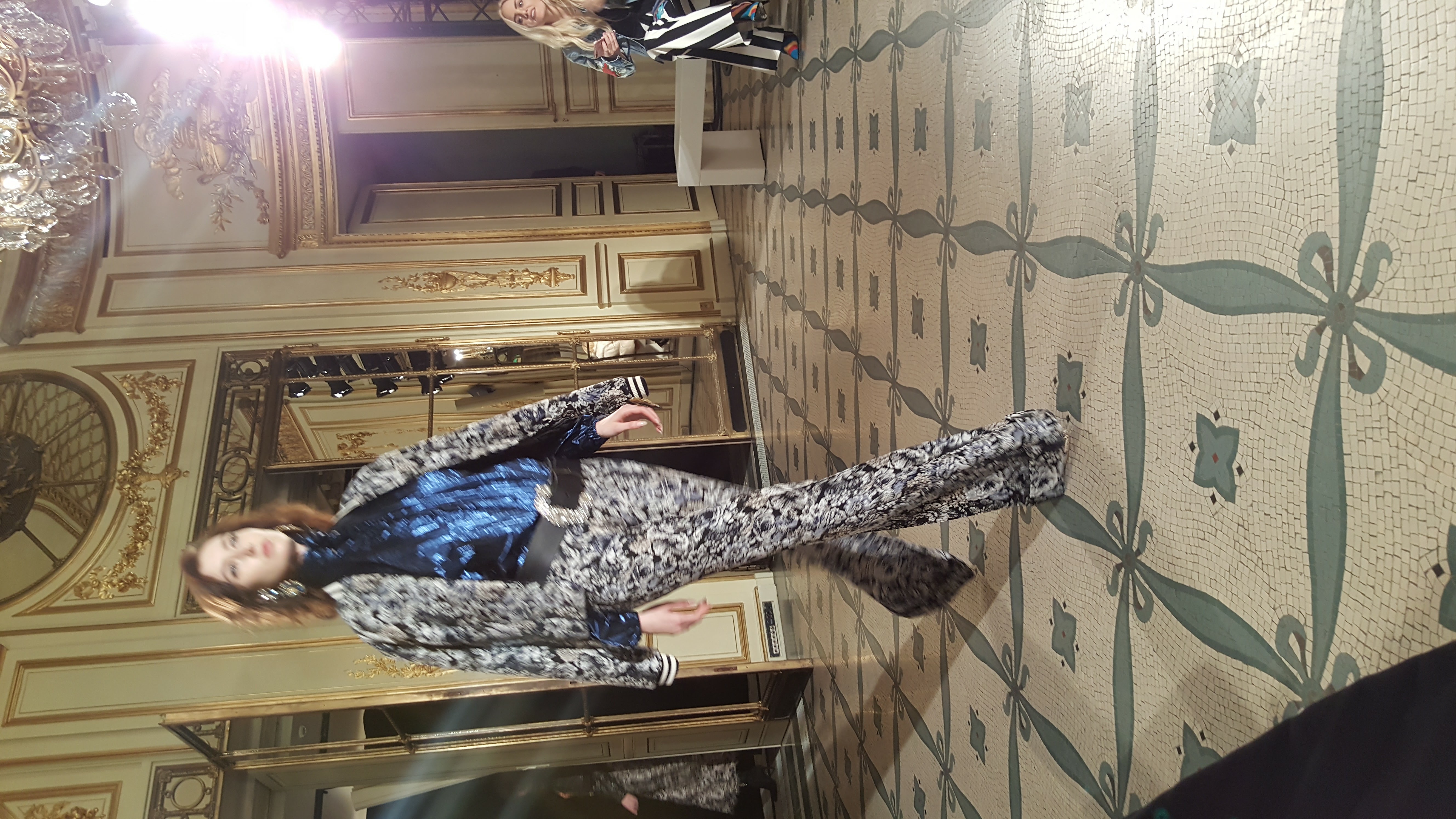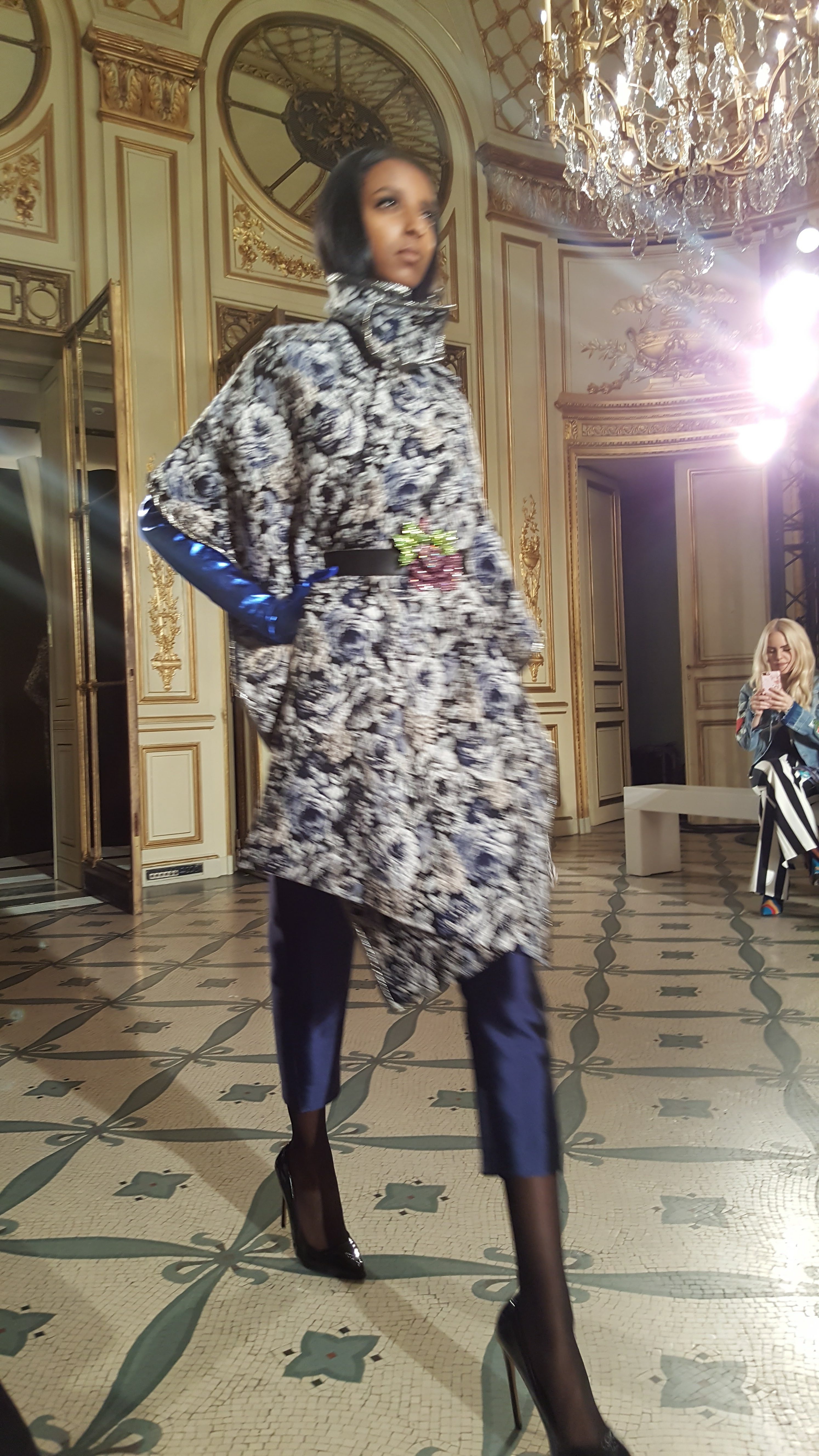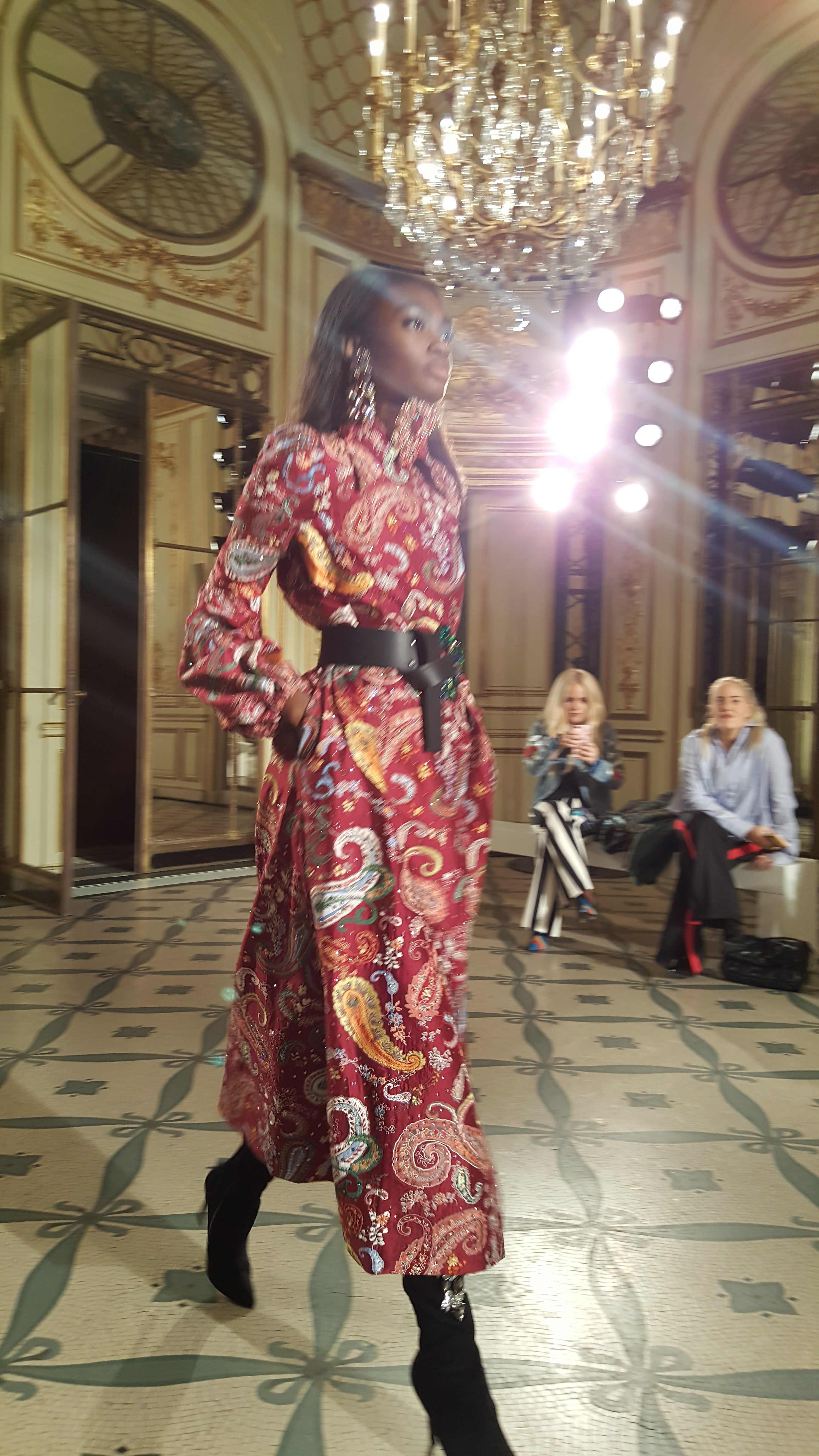 Les volants sont omniprésents sur les manches et les épaules, tandis que les plis d’origami ornent un certain nombre de robes, courtes et longues. Les manteaux aux imprimés Paisley et les cristaux embellissent les créations pour une allure « cocktail du soir ». Les gants d’opéra aux nuances électriques de bleu et magenta accentuent l’apparence extravagante en y ajoutant une touche élégante.