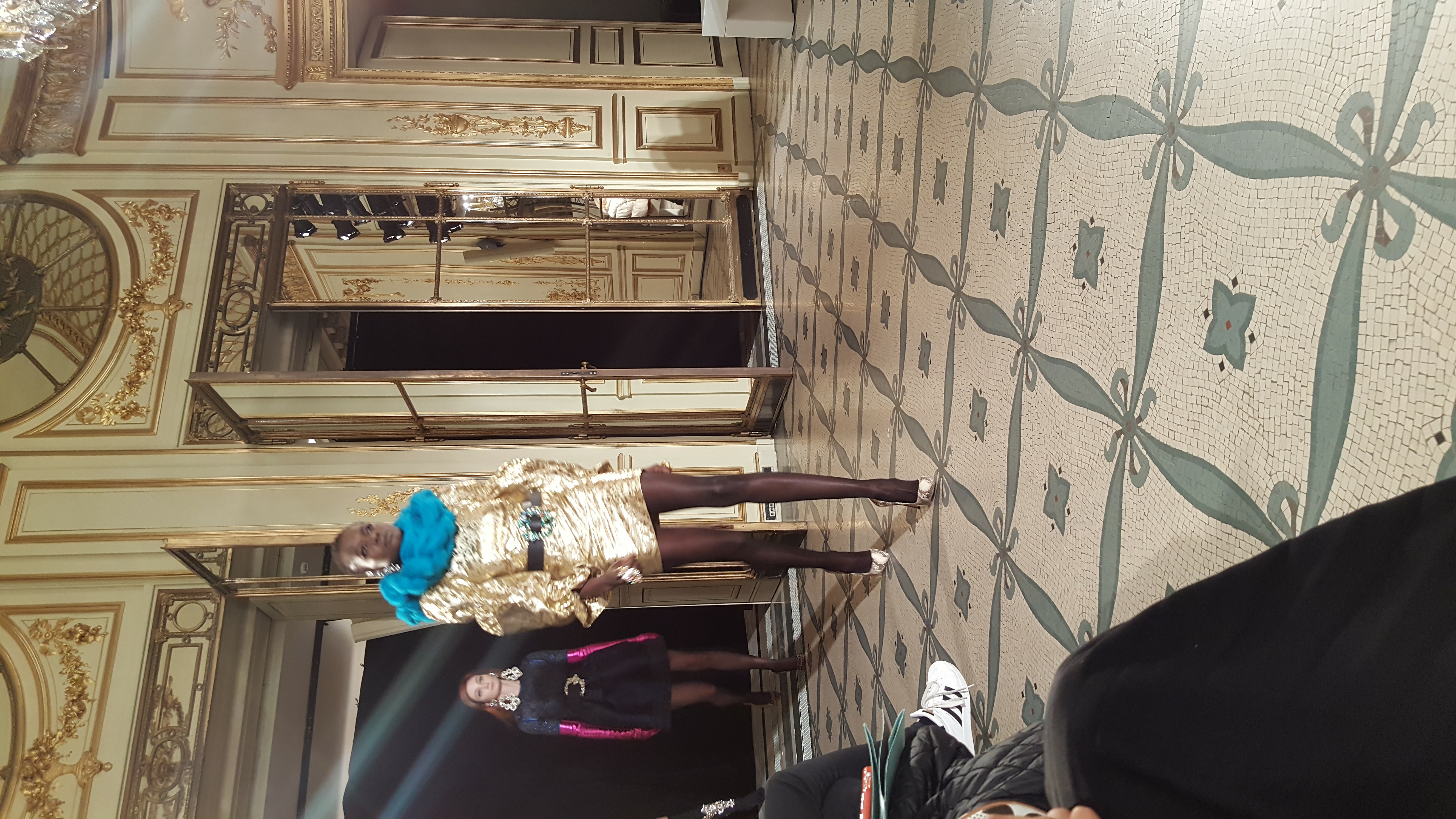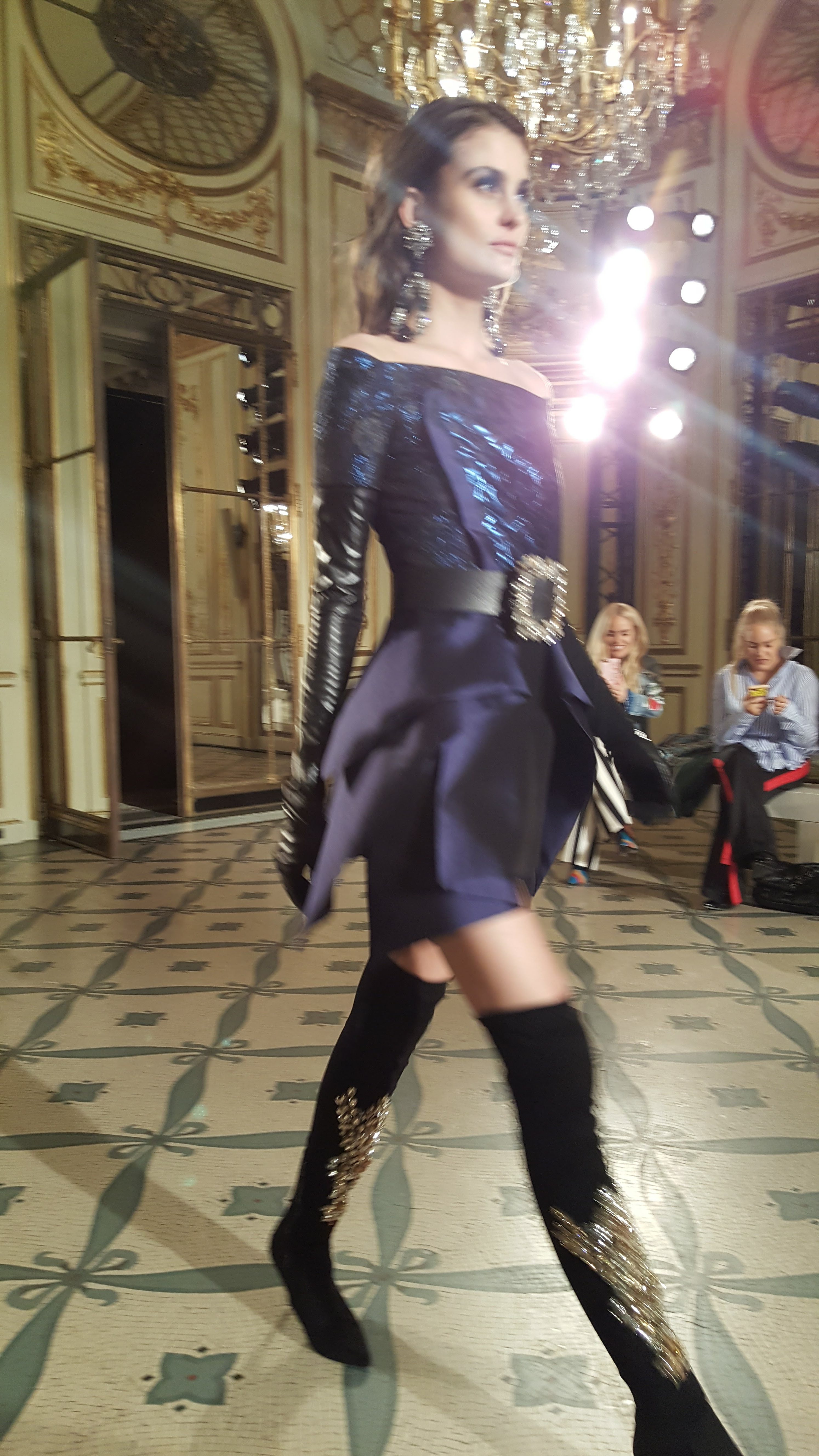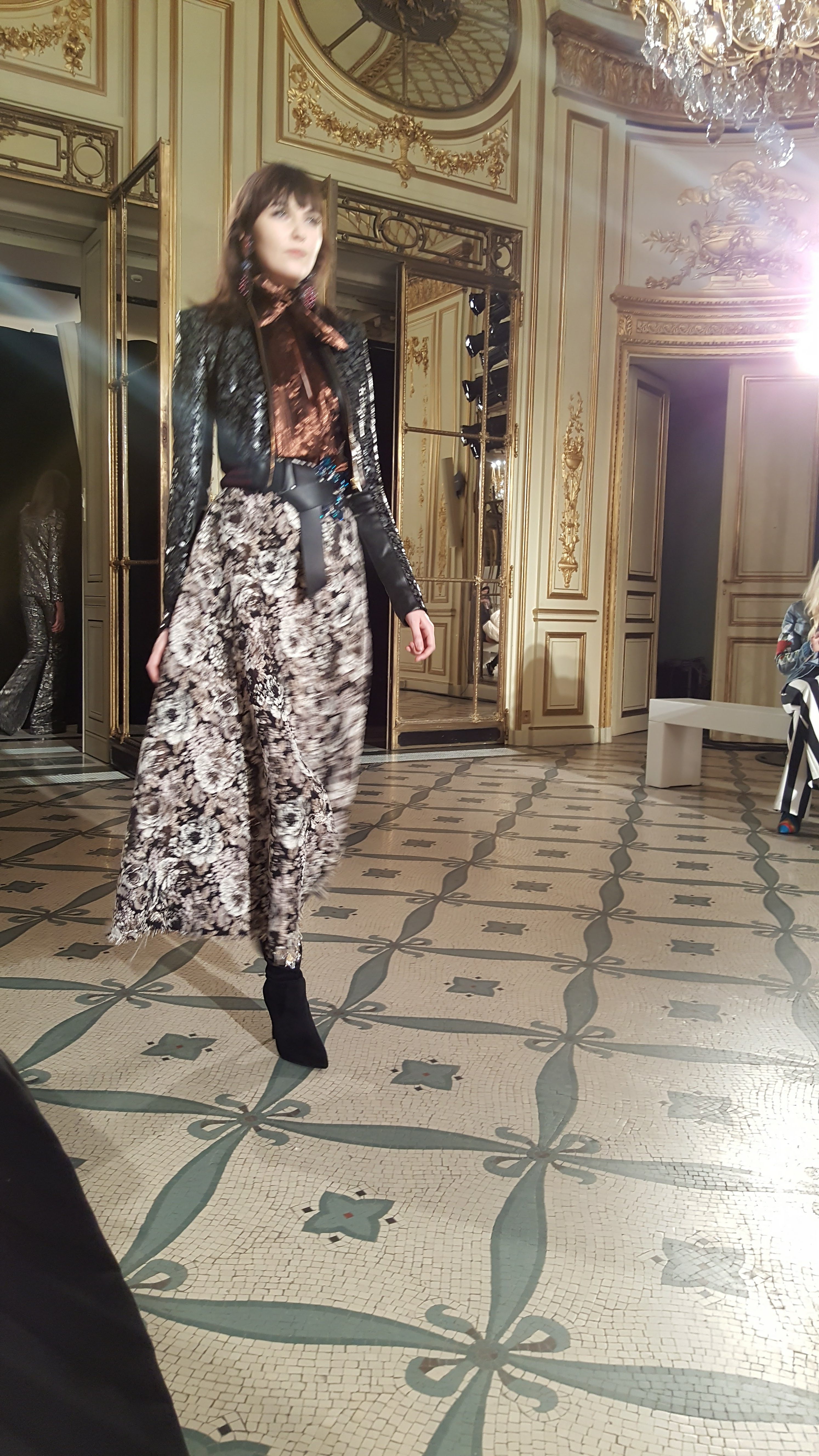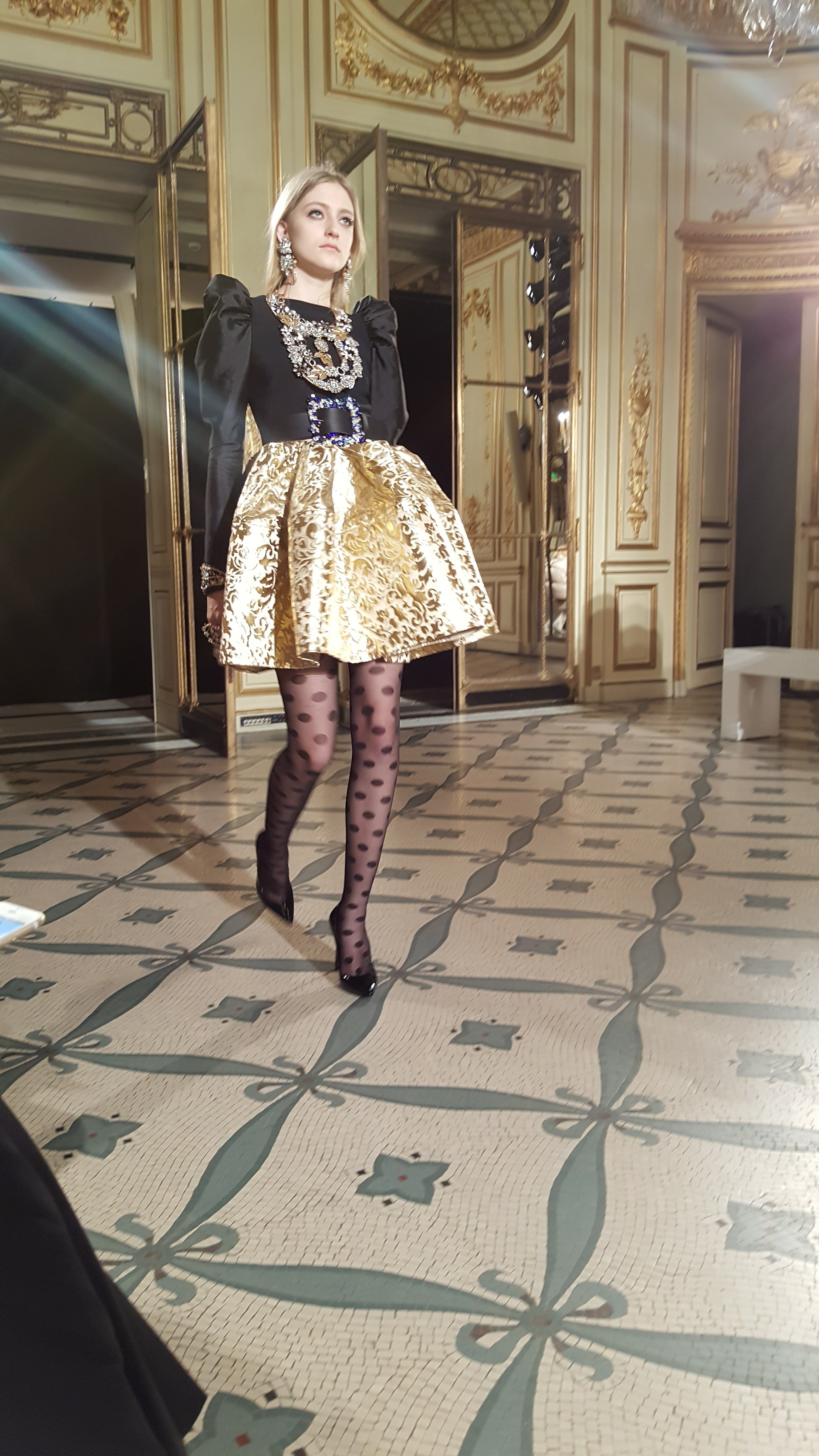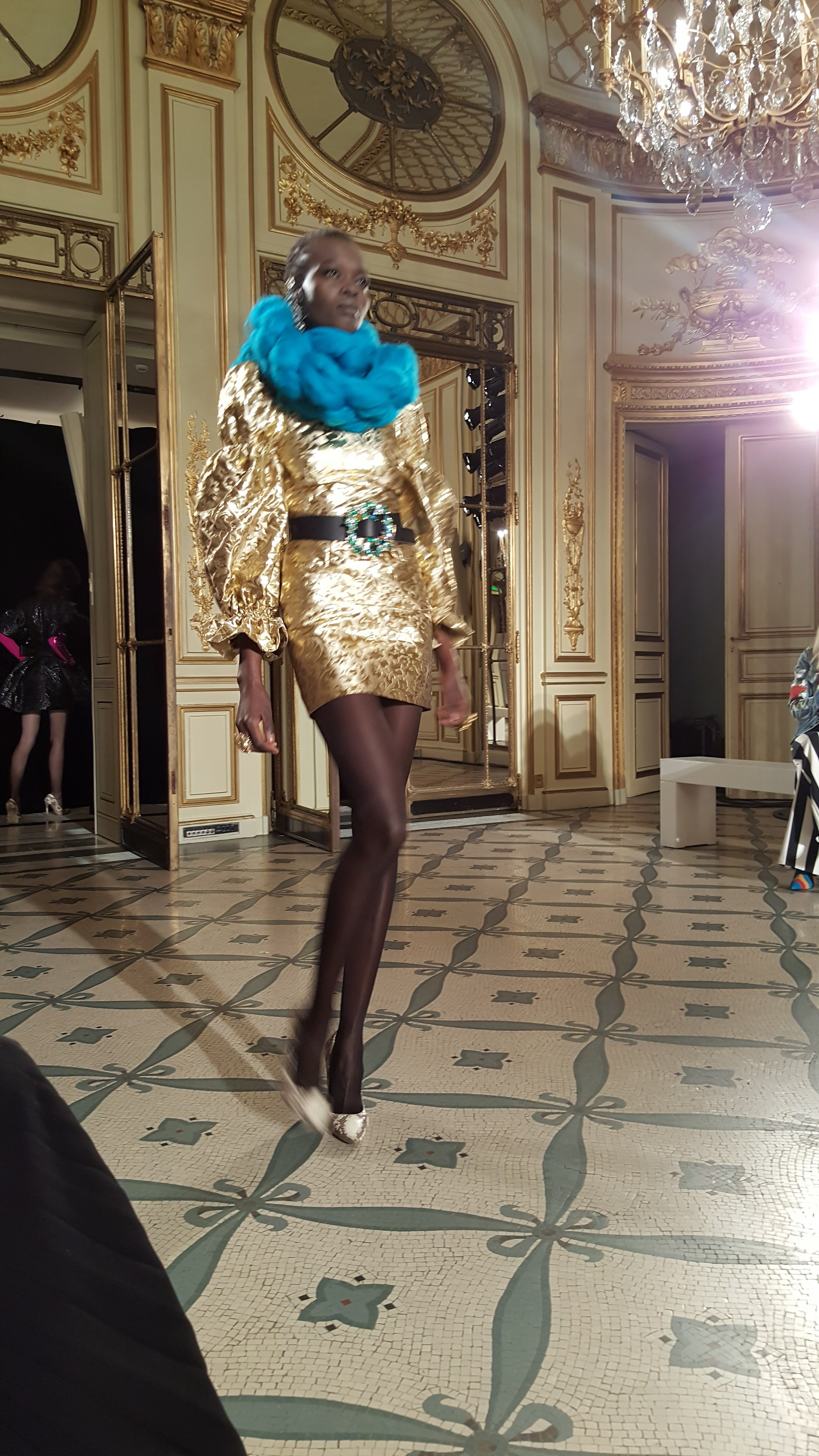 Les volants sont omniprésents sur les manches et les épaules, tandis que les plis d’origami ornent un certain nombre de robes, courtes et longues. Les manteaux aux imprimés Paisley et les cristaux embellissent les créations pour une allure « cocktail du soir ». Les gants d’opéra aux nuances électriques de bleu et magenta accentuent l’apparence extravagante en y ajoutant une touche élégante.