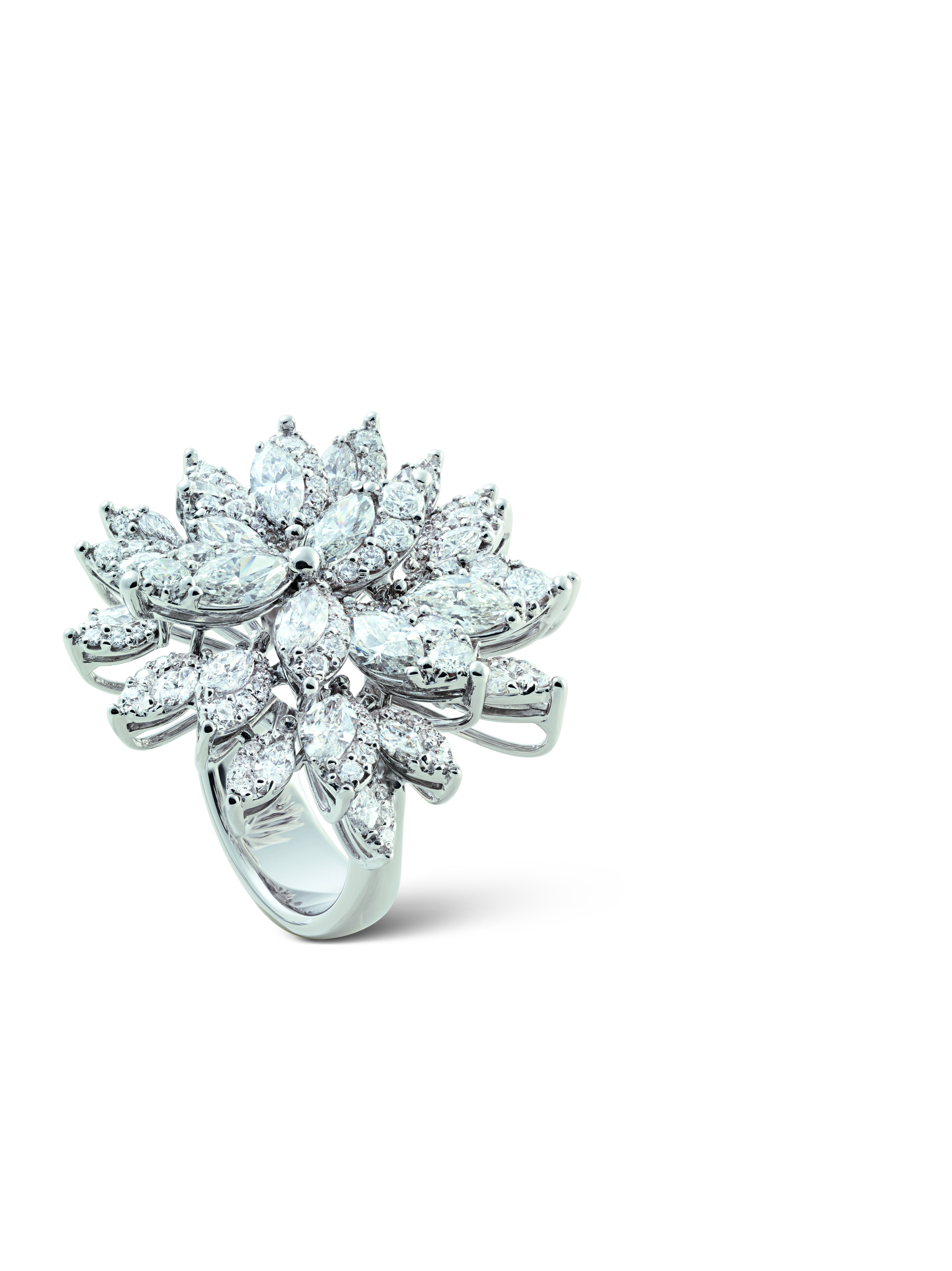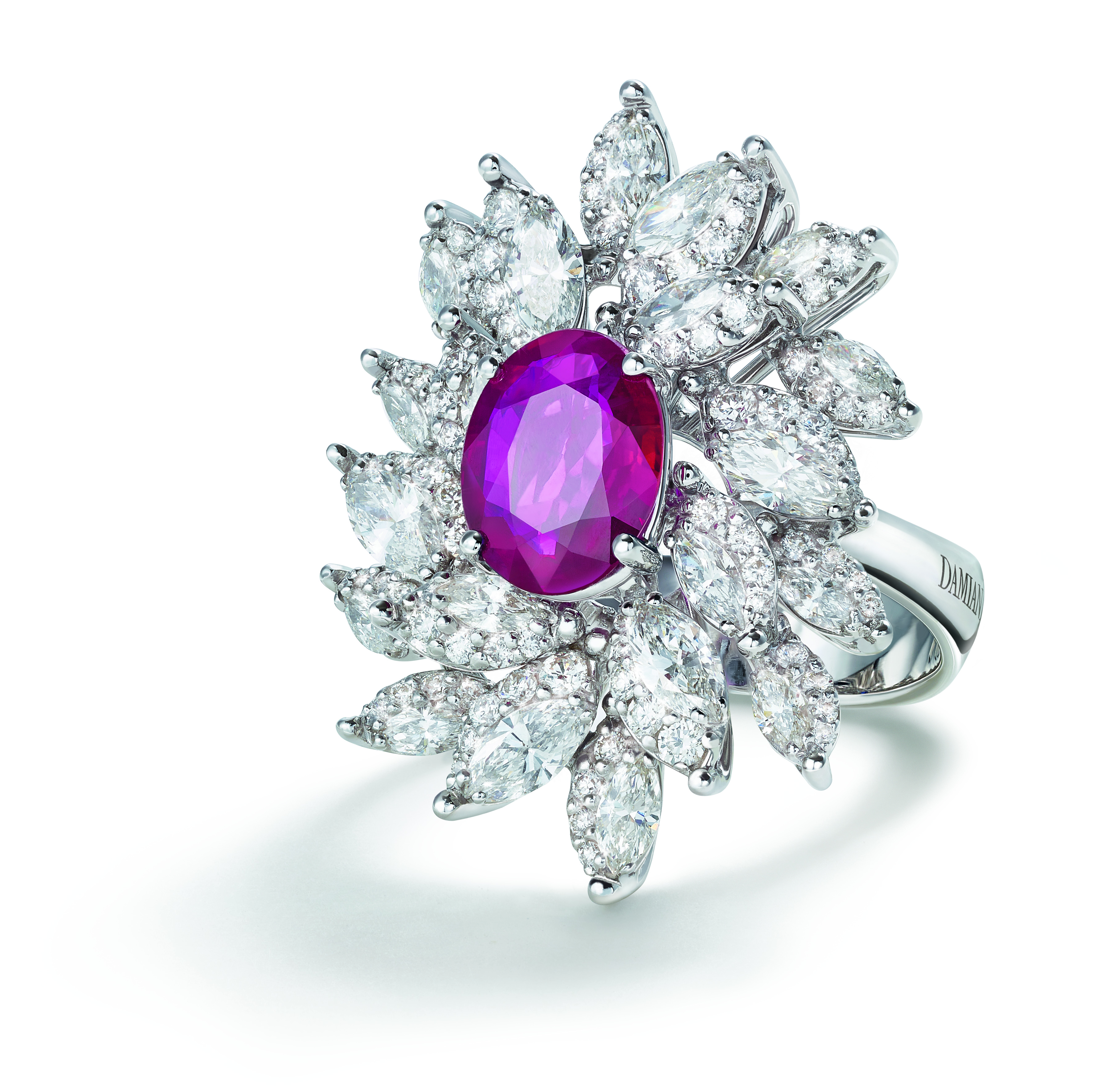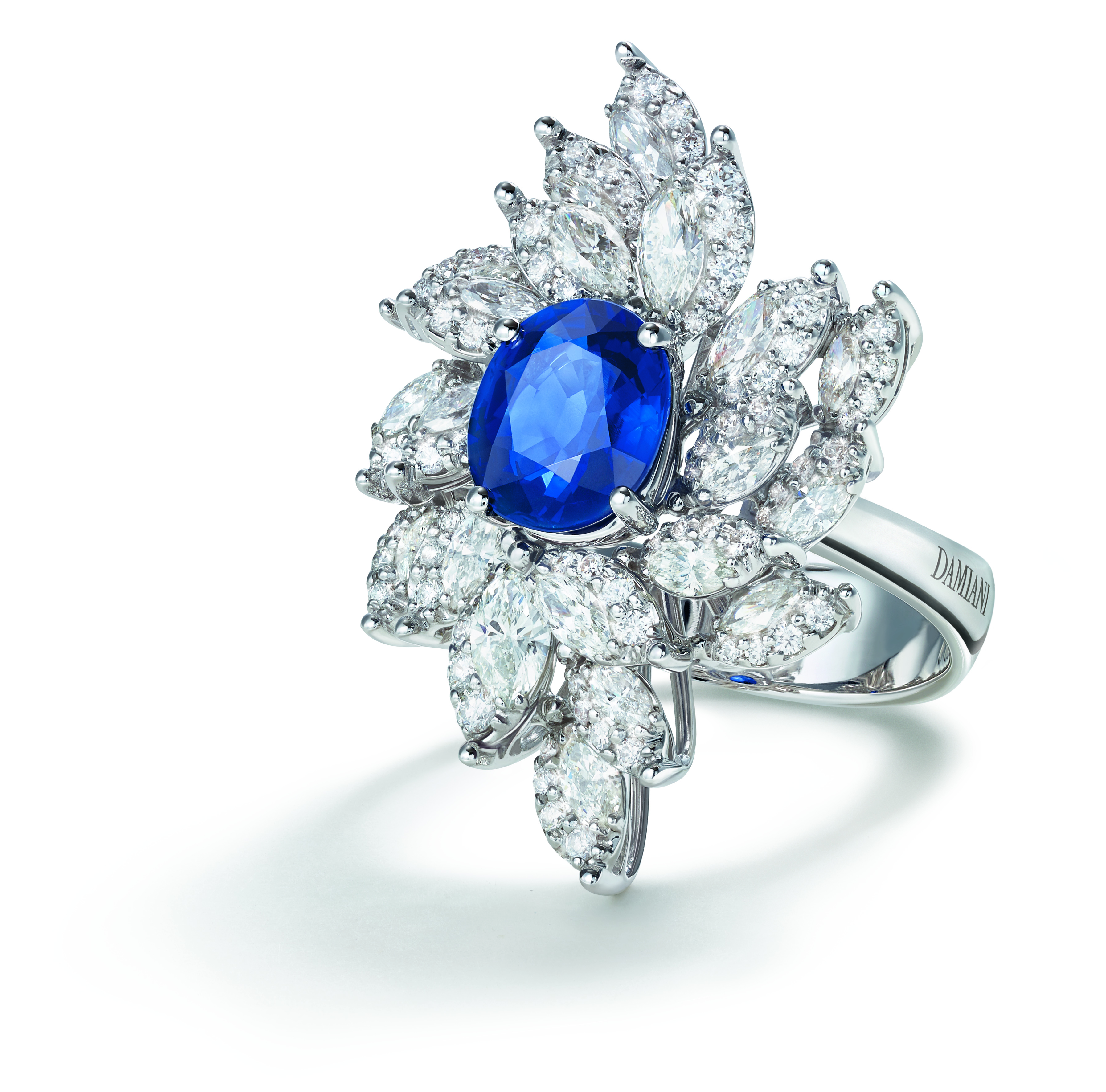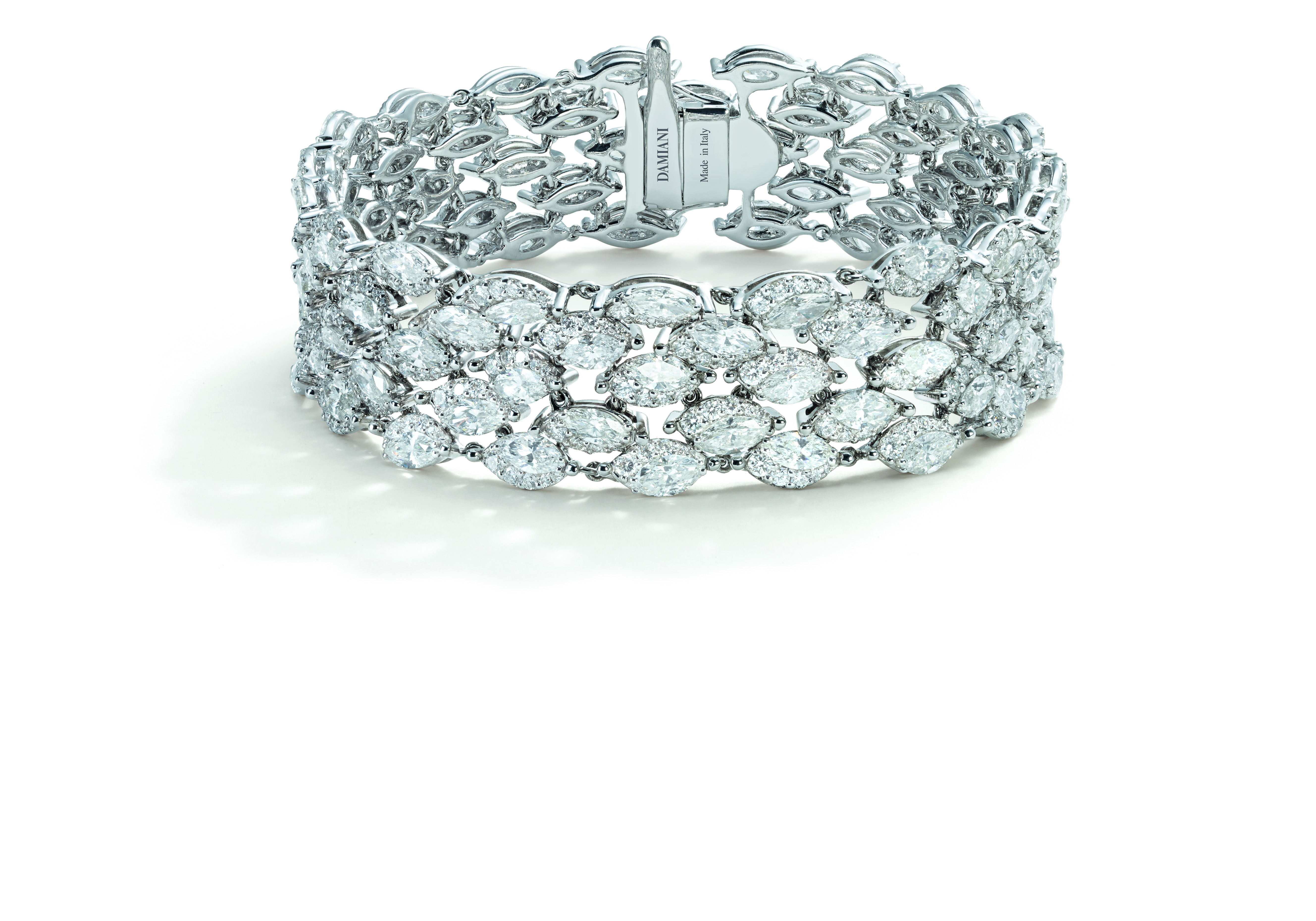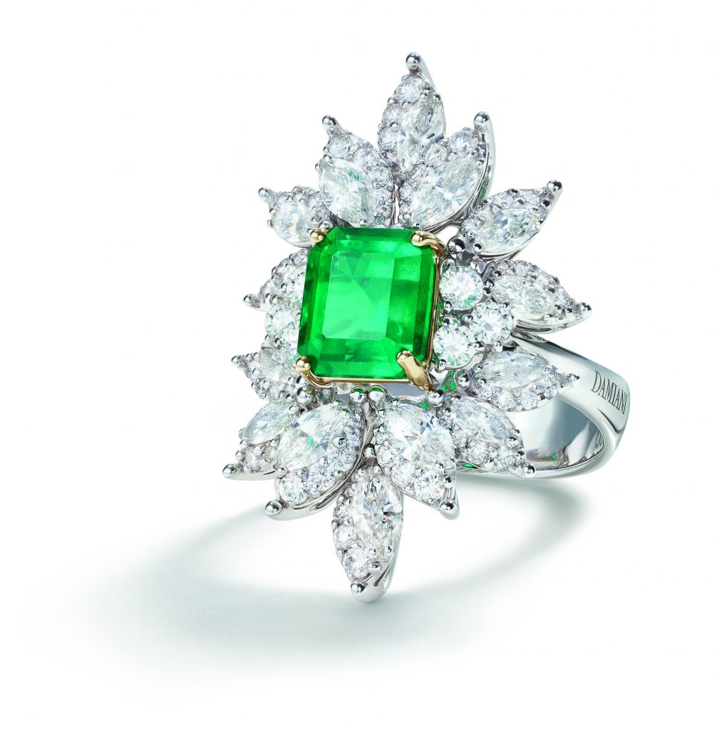 Les joailliers Damiani ont dû juxtaposer avec une grande expertise deux différentes techniques de sertissage, pour obtenir des bijoux capables de susciter l’« émotion » tant des personnes qui les portent que de celles qui les admirent. Ce travail particulièrement complexe et minutieux, permet de donner un rythme à l’alternance de diamants taille marquise, d’une grande pureté, entourés d’une rivière dégradée qui sublime leur brillance et leur perfection, pour former une composition de délicats pétales et de feuilles.
