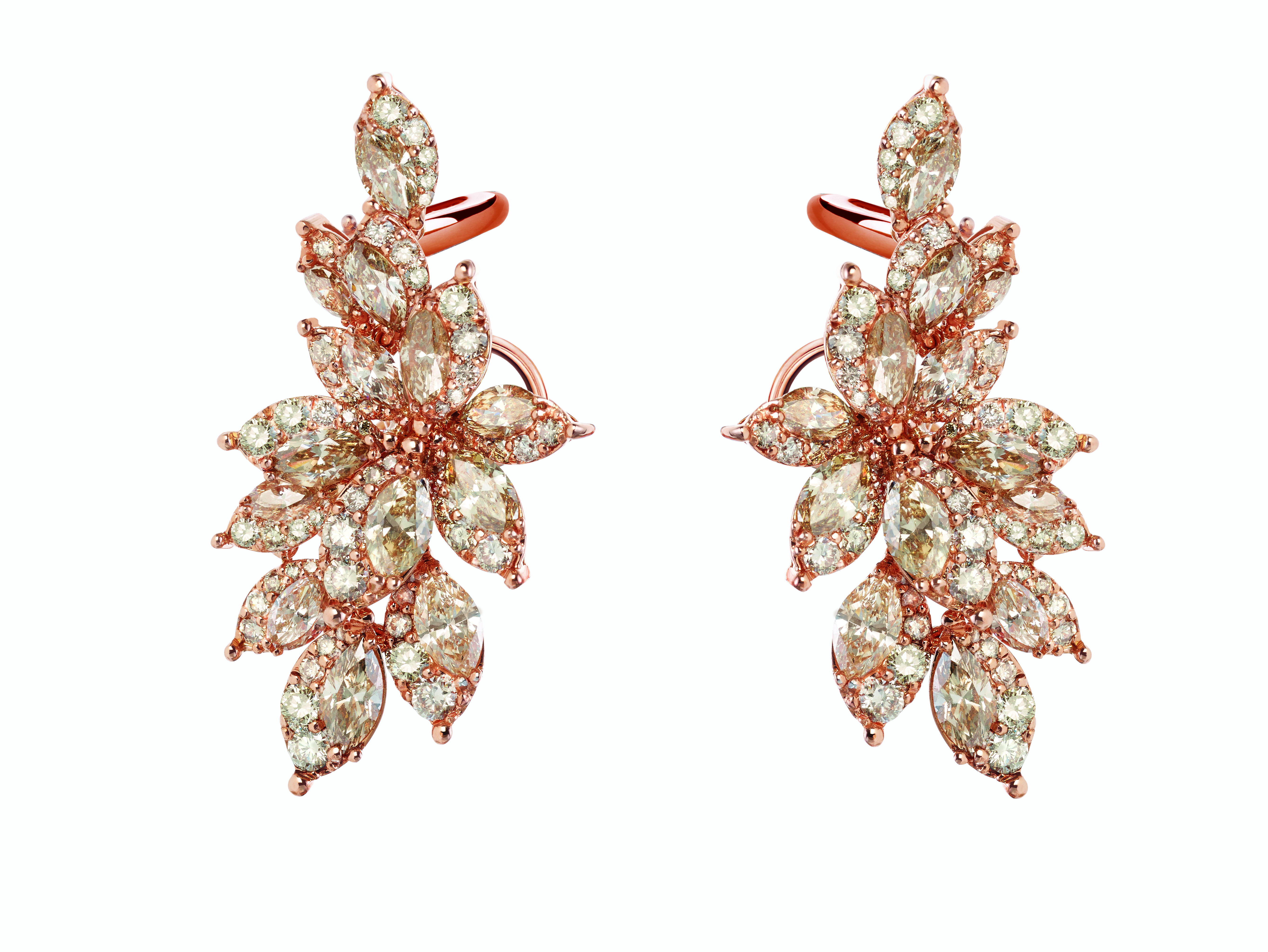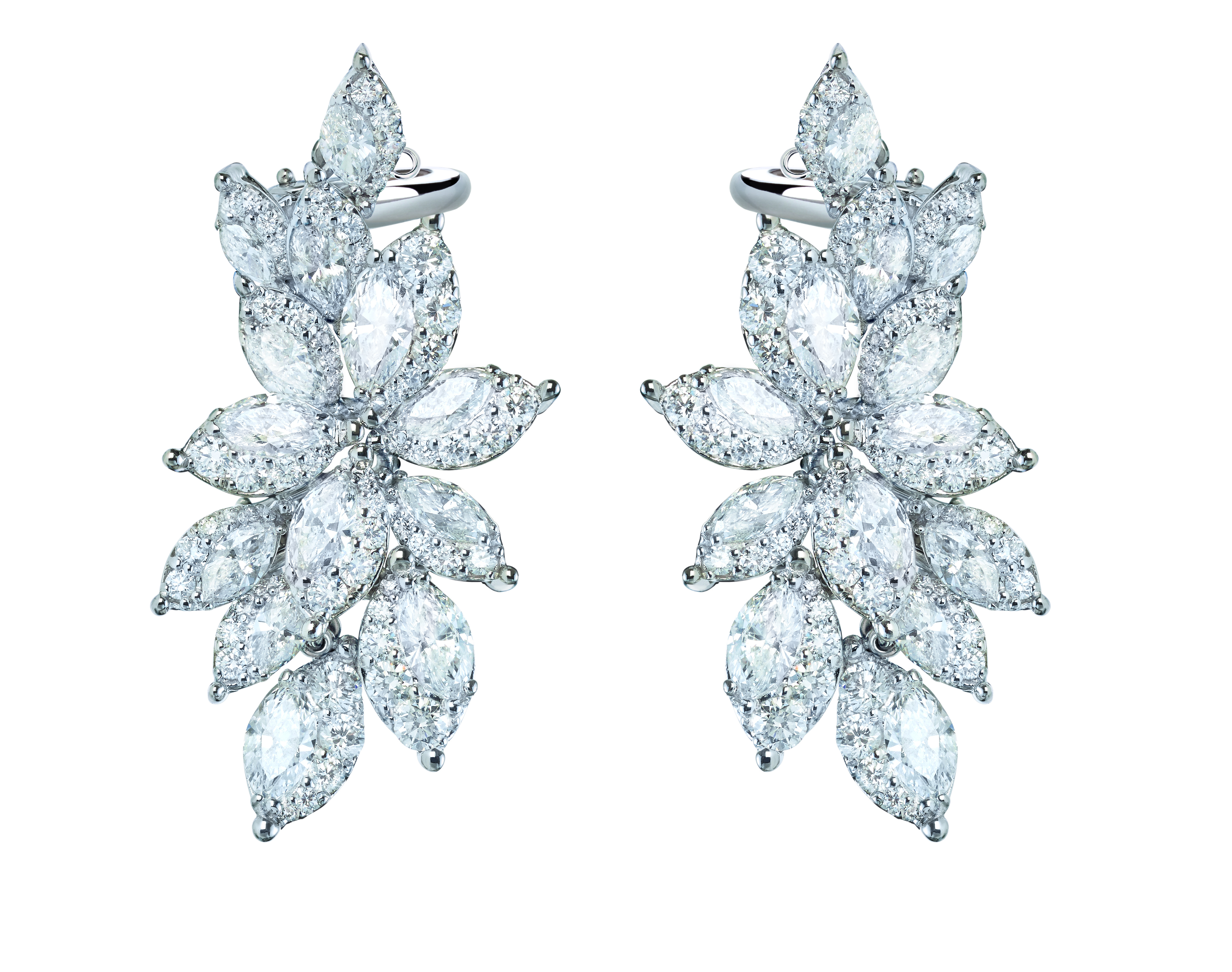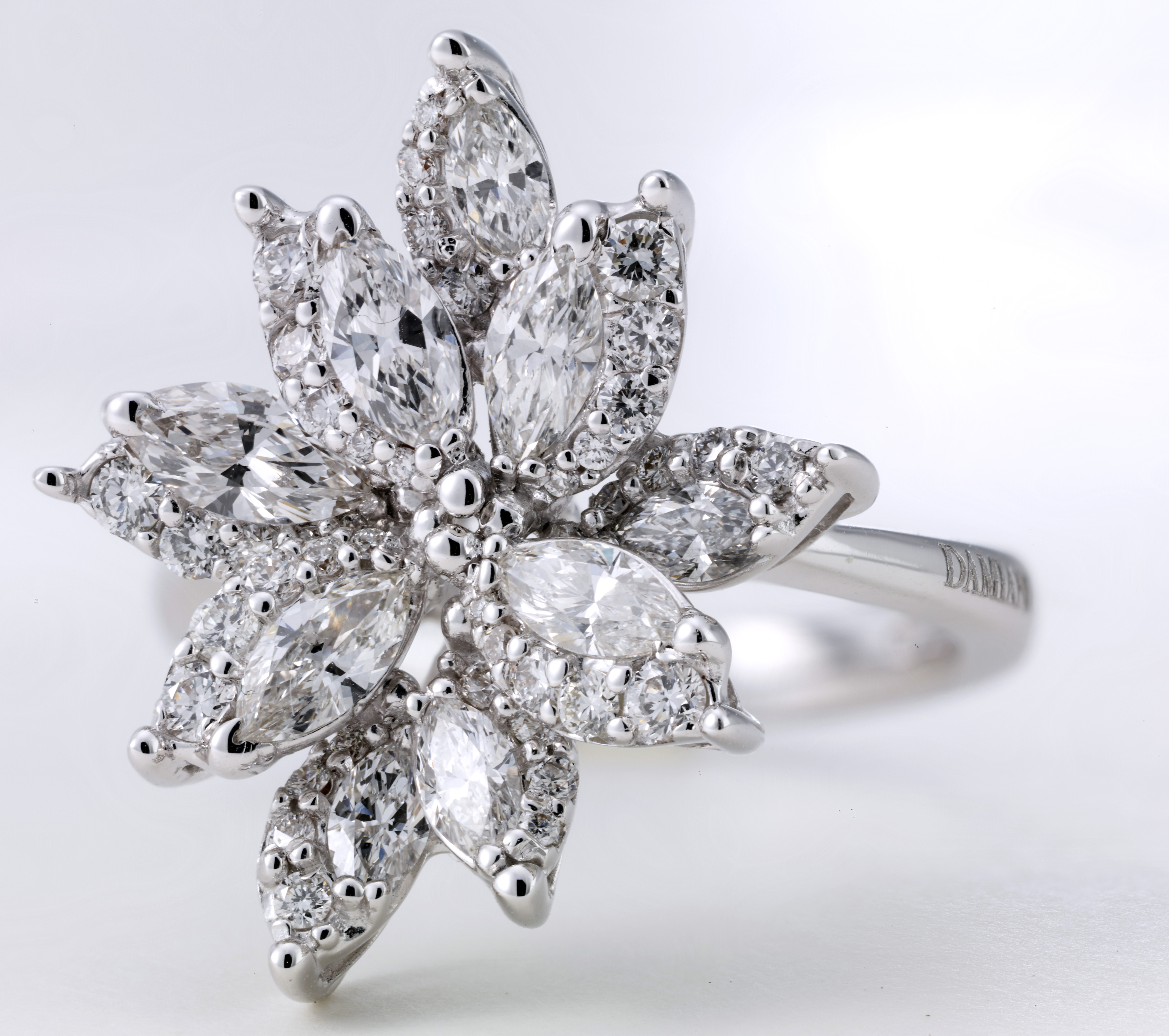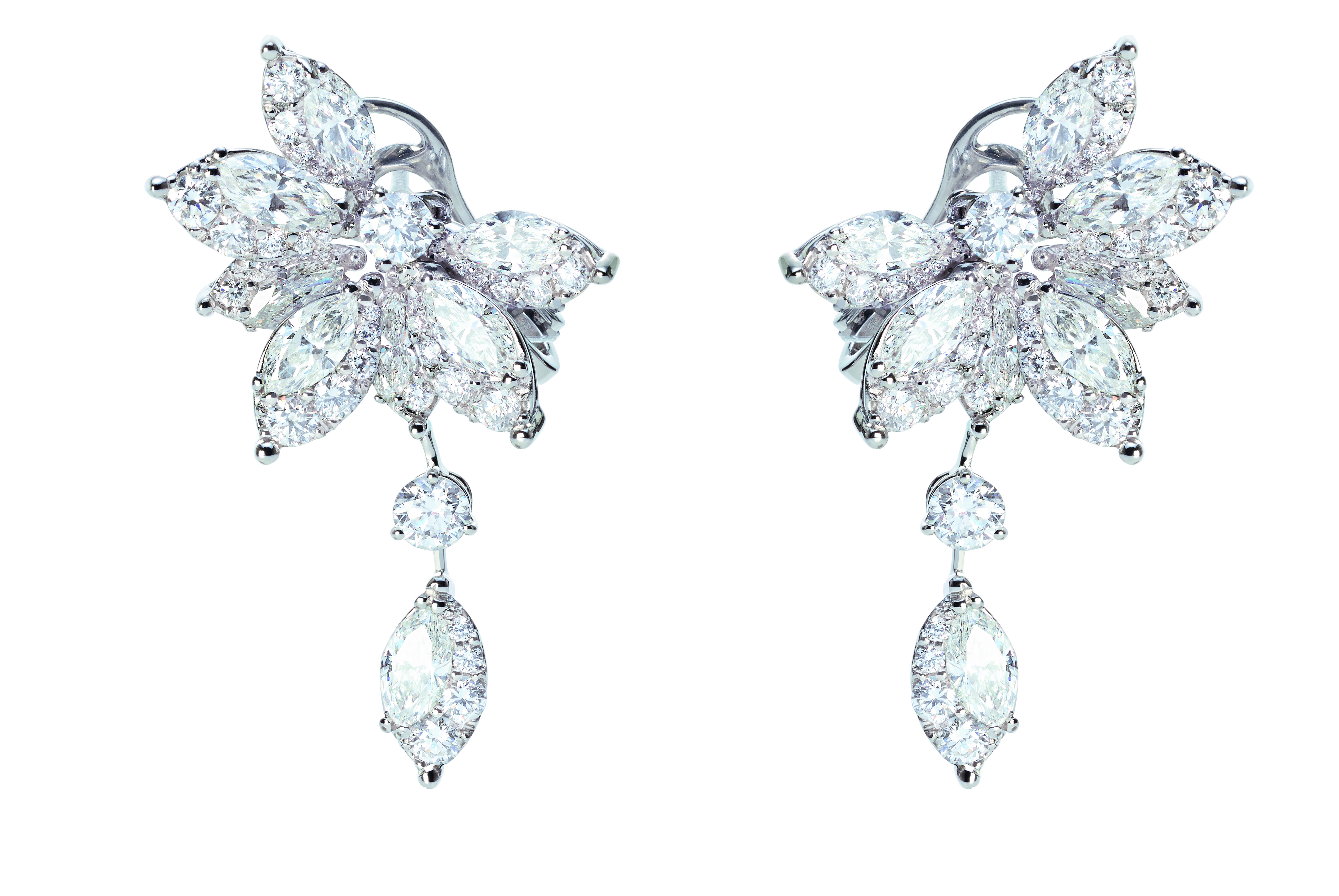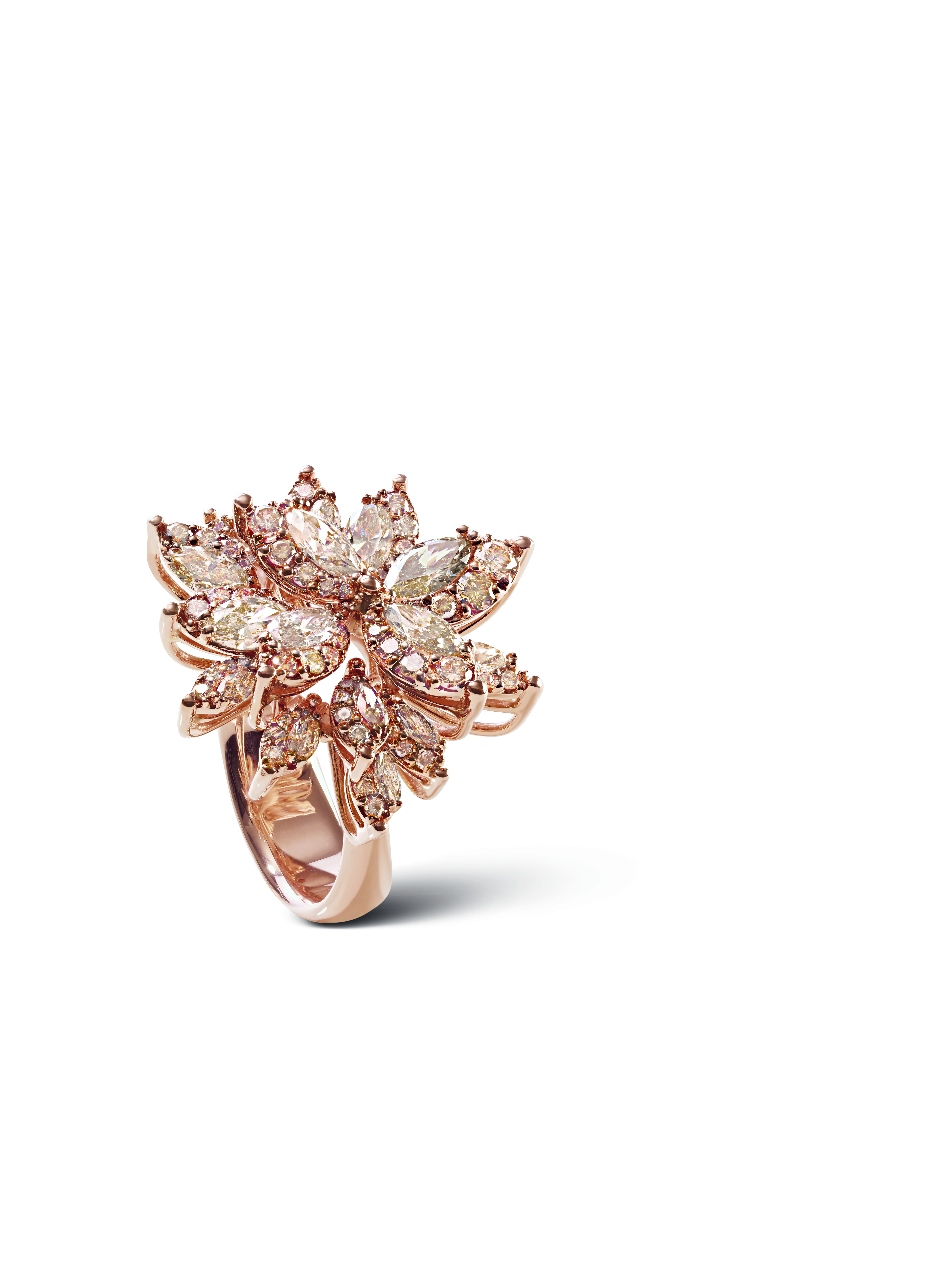 Les joailliers Damiani ont dû juxtaposer avec une grande expertise deux différentes techniques de sertissage, pour obtenir des bijoux capables de susciter l’« émotion » tant des personnes qui les portent que de celles qui les admirent. Ce travail particulièrement complexe et minutieux, permet de donner un rythme à l’alternance de diamants taille marquise, d’une grande pureté, entourés d’une rivière dégradée qui sublime leur brillance et leur perfection, pour former une composition de délicats pétales et de feuilles.