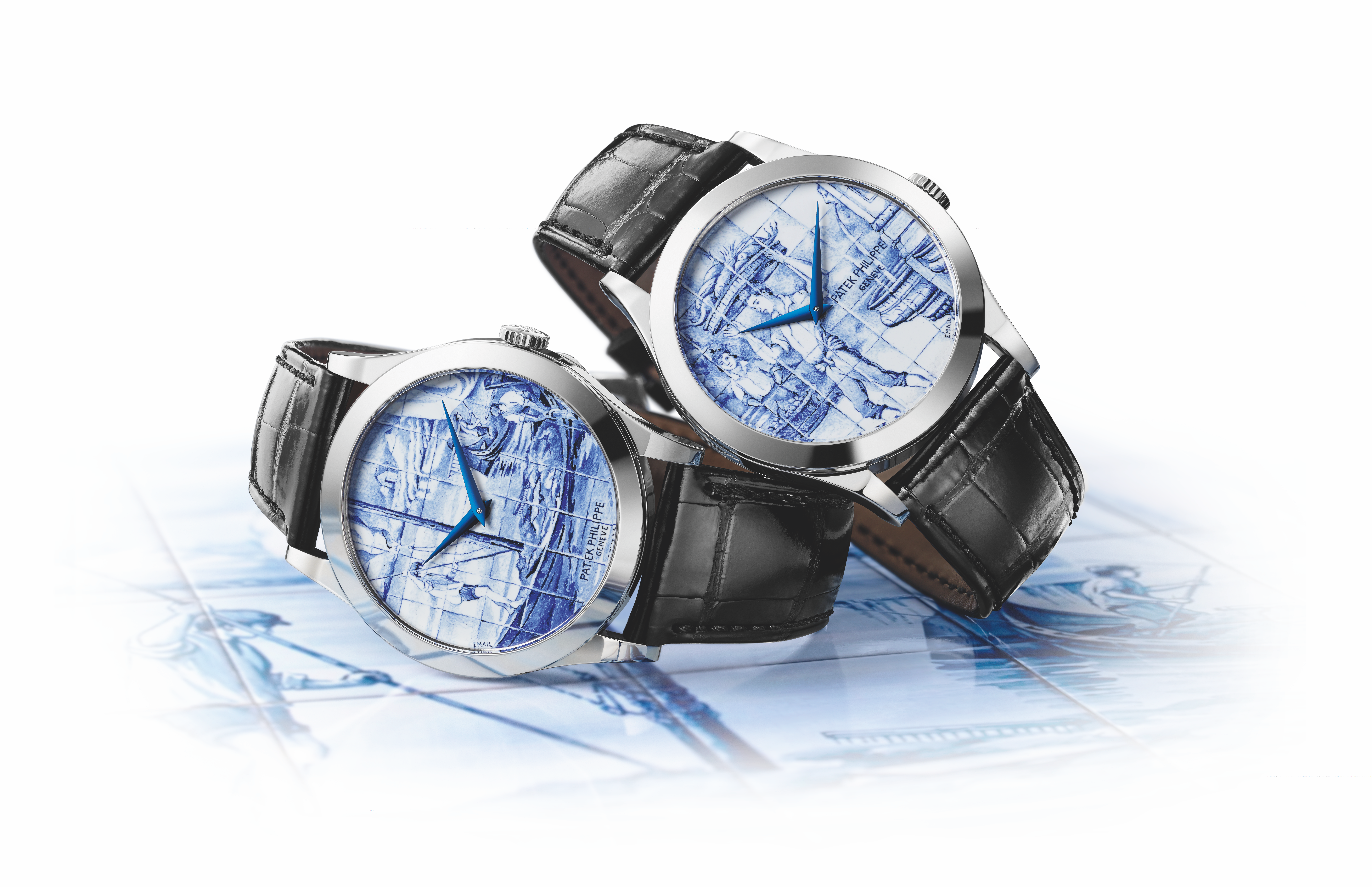 Les montres fabriquées en petites séries Calatrava «Azulejos» référence 5089G proposent pour la toute première fois des cadrans en peinture miniature sur émail reproduisant des azulejos – ces fameux carreaux de faïence peints et émaillés, très répandus au Portugal, que l’on assemble comme une mosaïque pour revêtir parfois des parois entières.