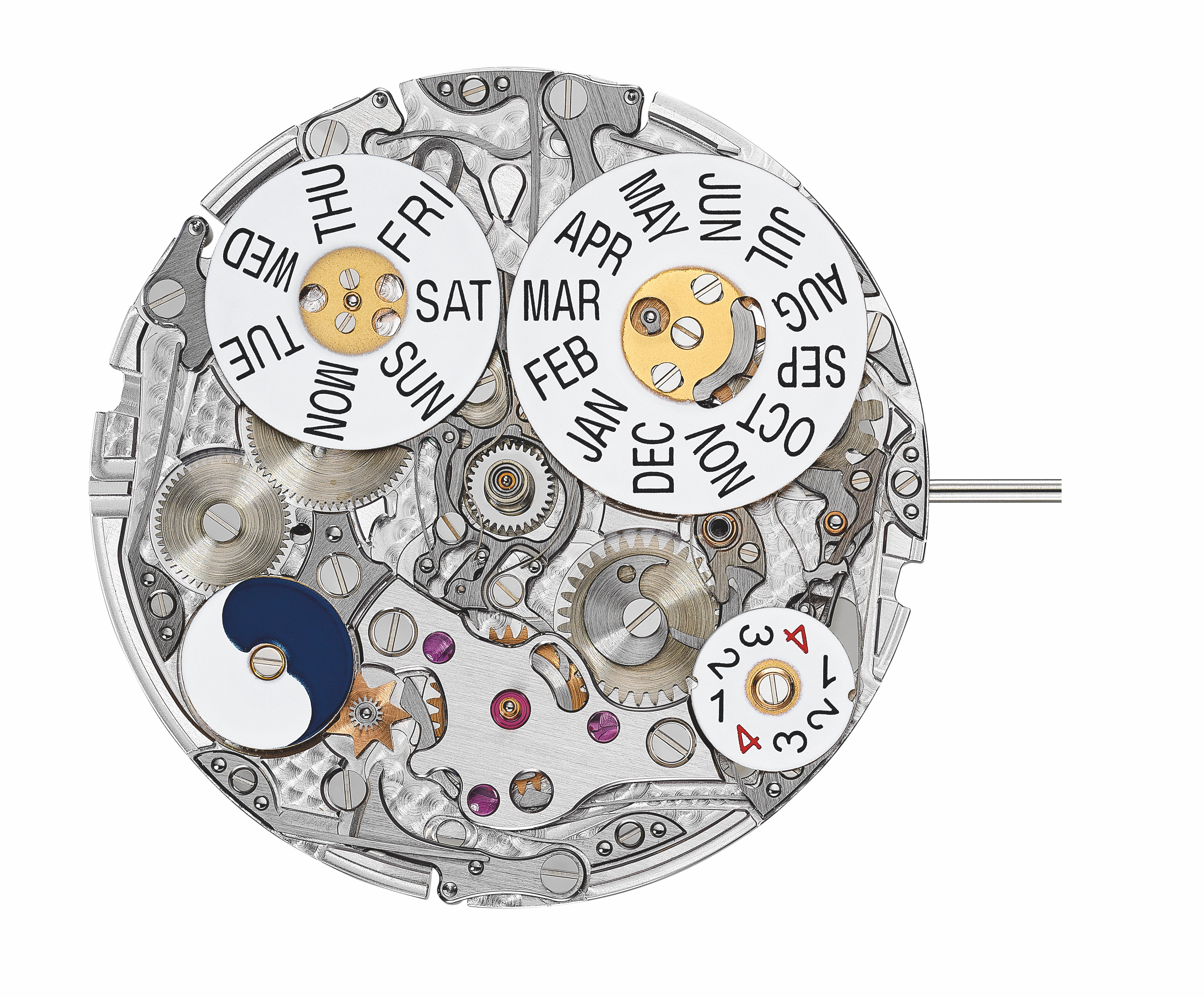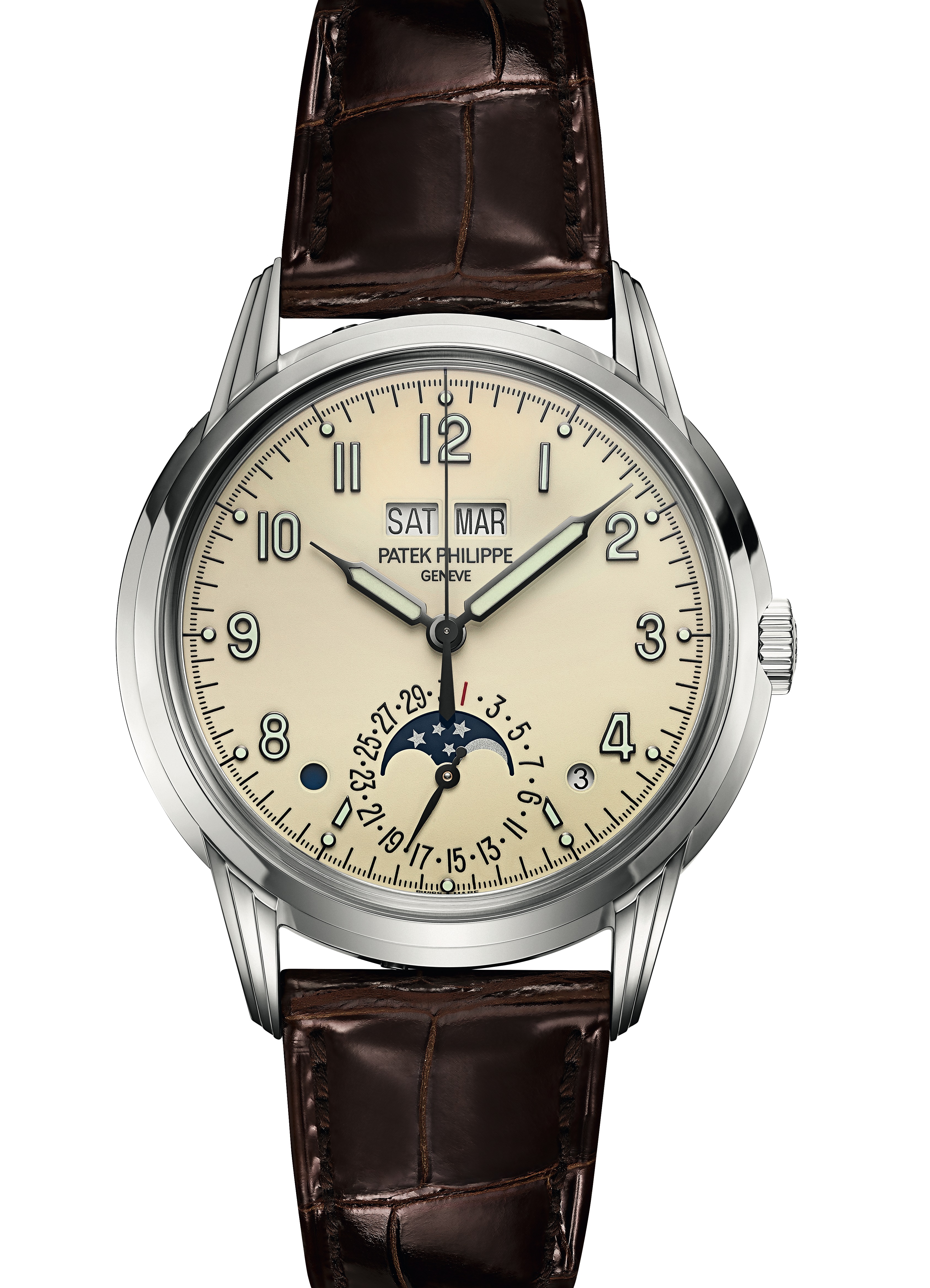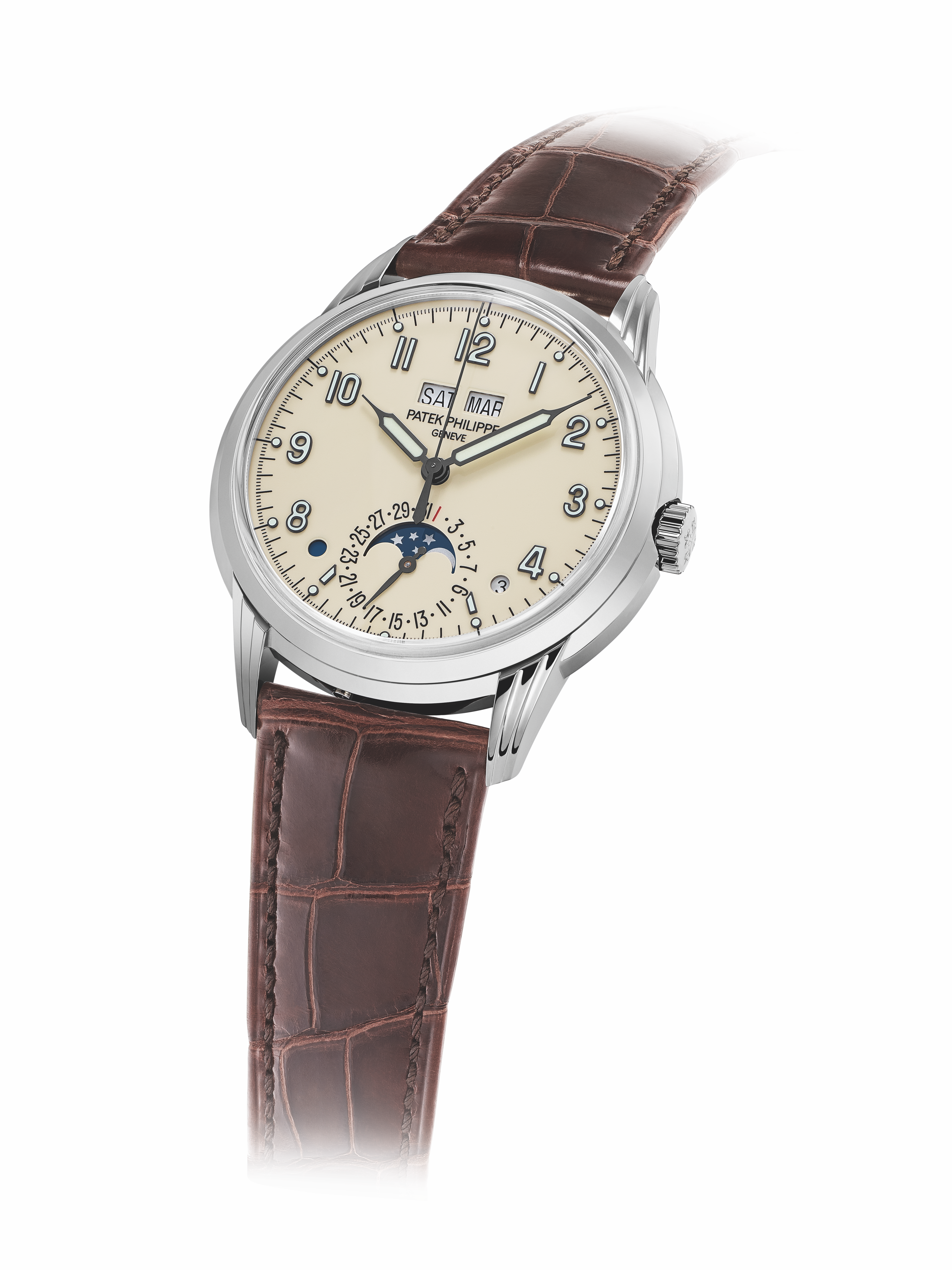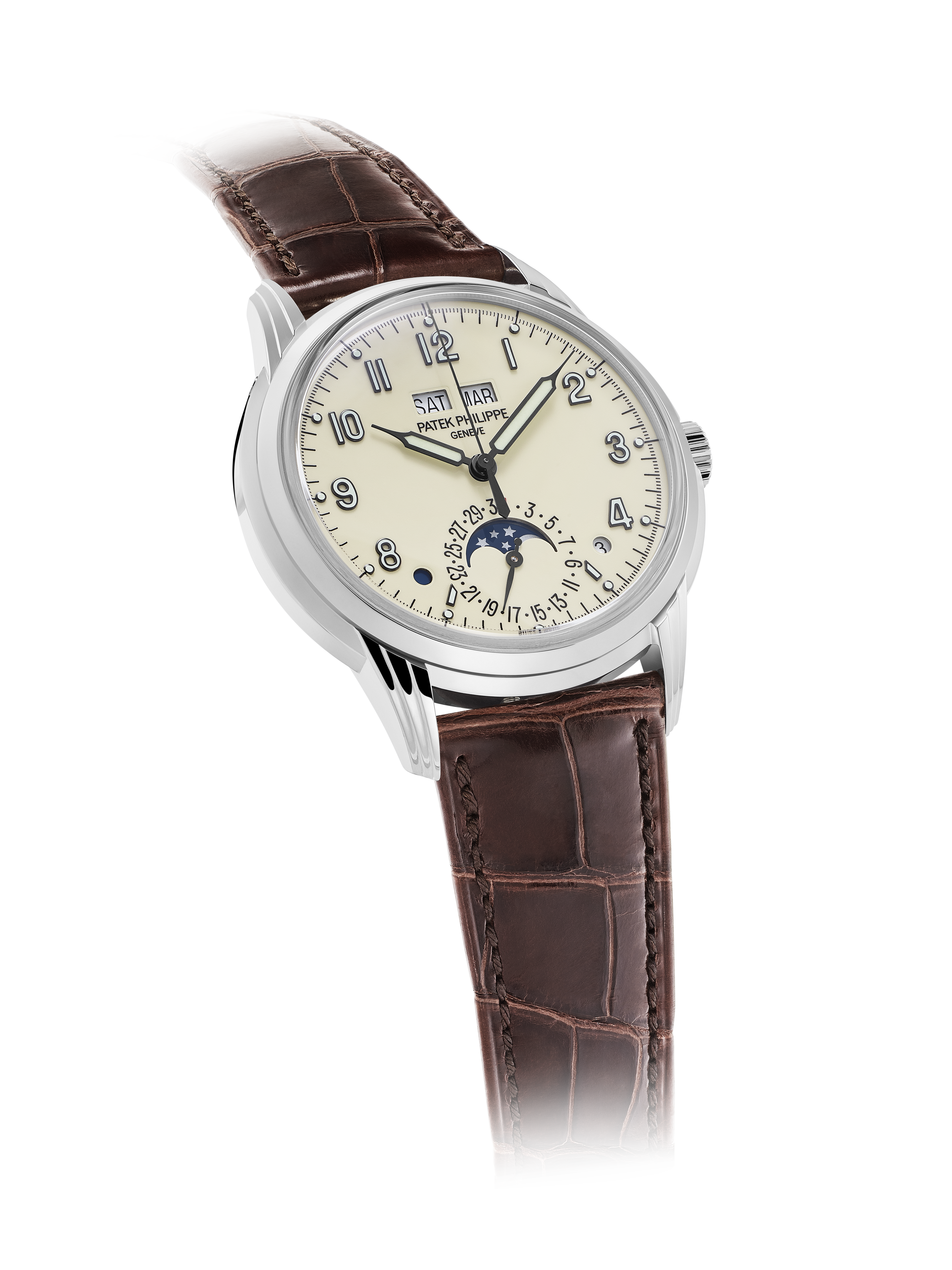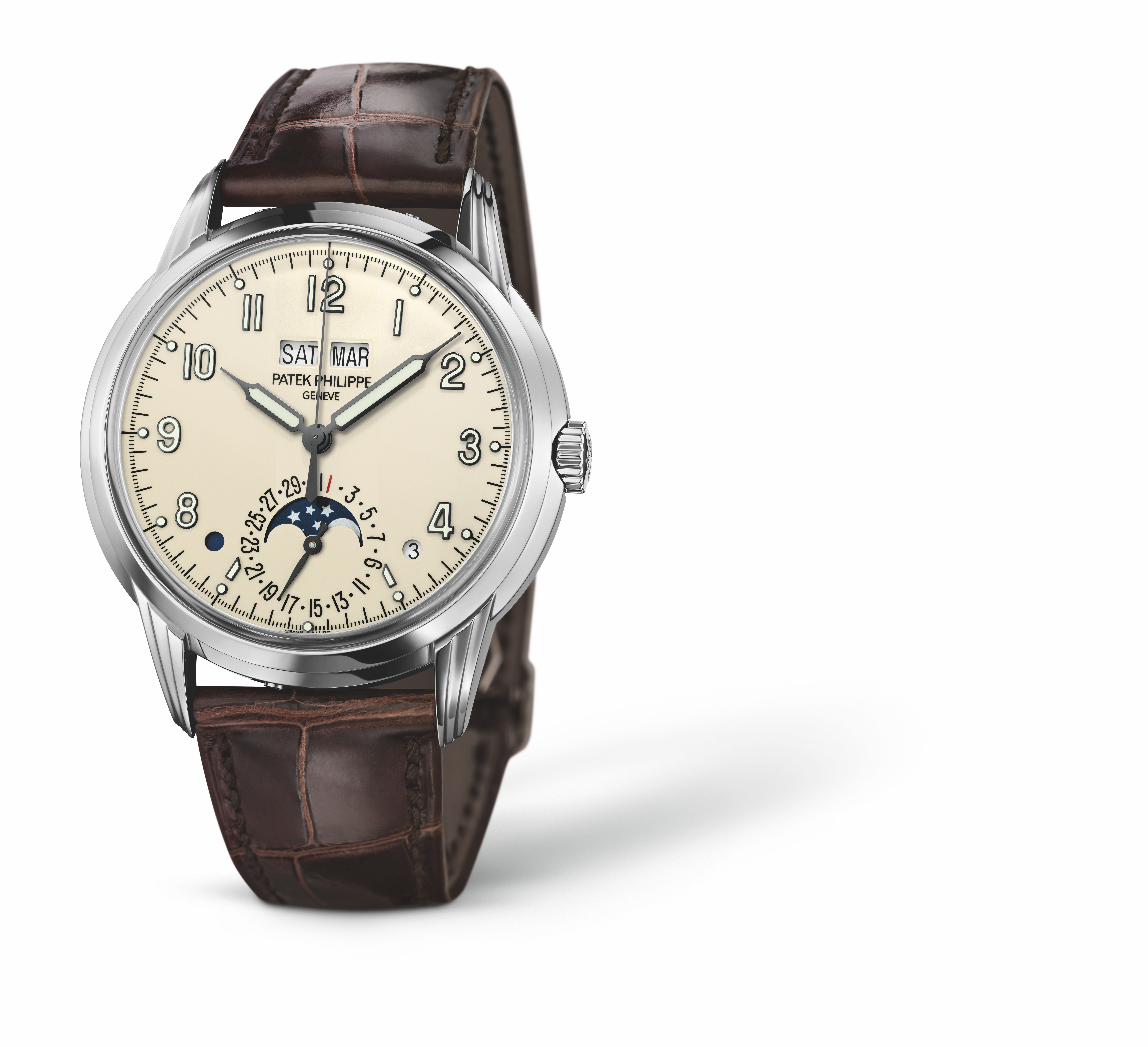 Sous ce décor original et précieux bat le calibre 240. Avec le quantième perpétuel référence 5320G, Patek Philippe présente un nouveau modèle conçu pour l’éternité. Ce garde-temps sobre et élégant arbore le même visage avec lequel la manufacture a établi depuis 1941 l’archétype du quantième perpétuel – soit un double guichet pour le jour et le mois à 12h et un cadran auxiliaire mariant quantième à aiguille et guichet des phases de lune à 6h – complétés aujourd’hui par des petits guichets ronds pour l’indication jour/nuit et le cycle des années bissextiles. Le boîtier en or gris de style «vintage» contemporain reprend des éléments de design empruntés à des montres légendaires des années 1950, dont des attaches au profil original à triples godrons. Il abrite un calibre 324 S Q à remontage automatique avec nouveau module de calendrier et seconde centrale.