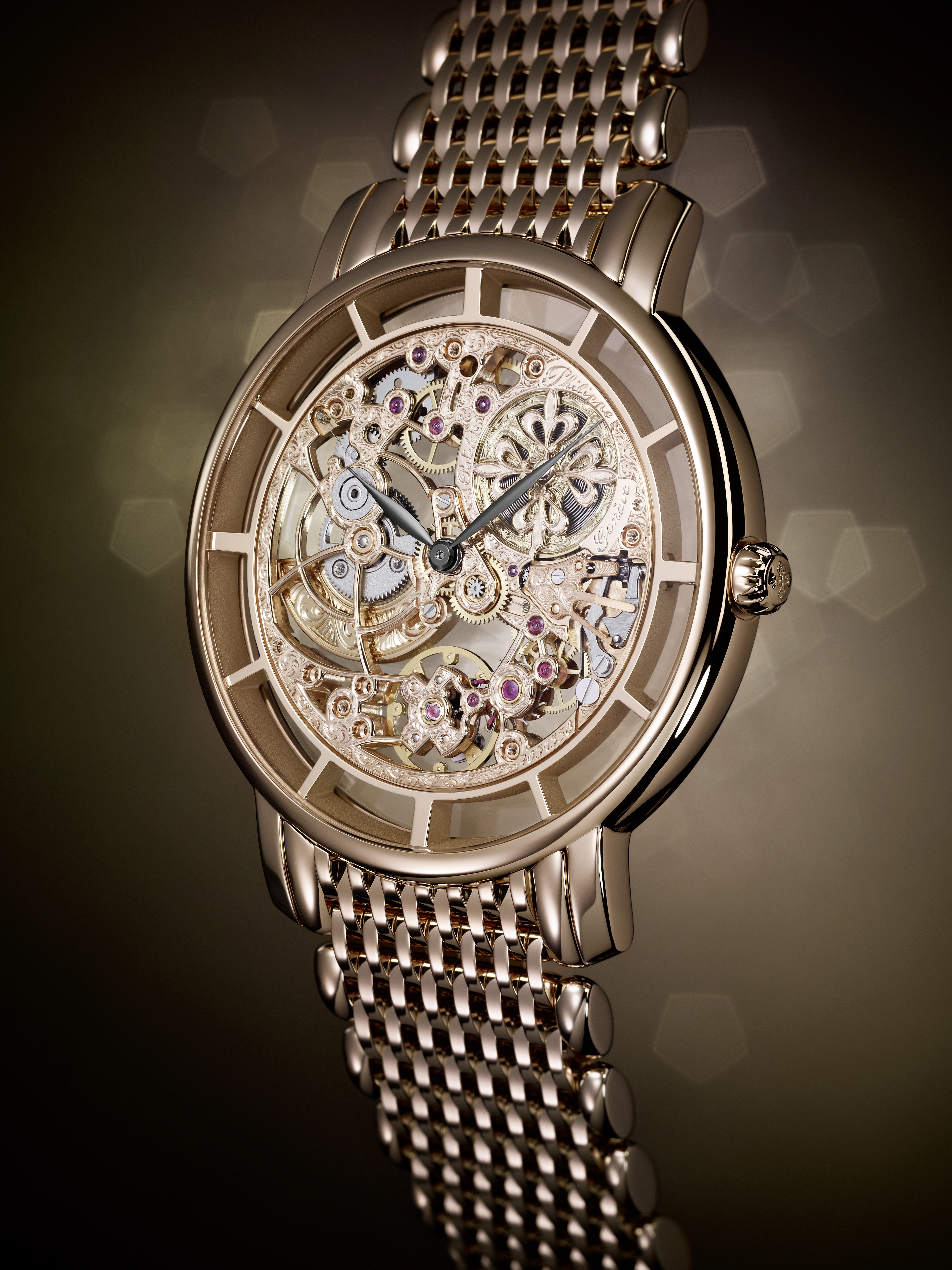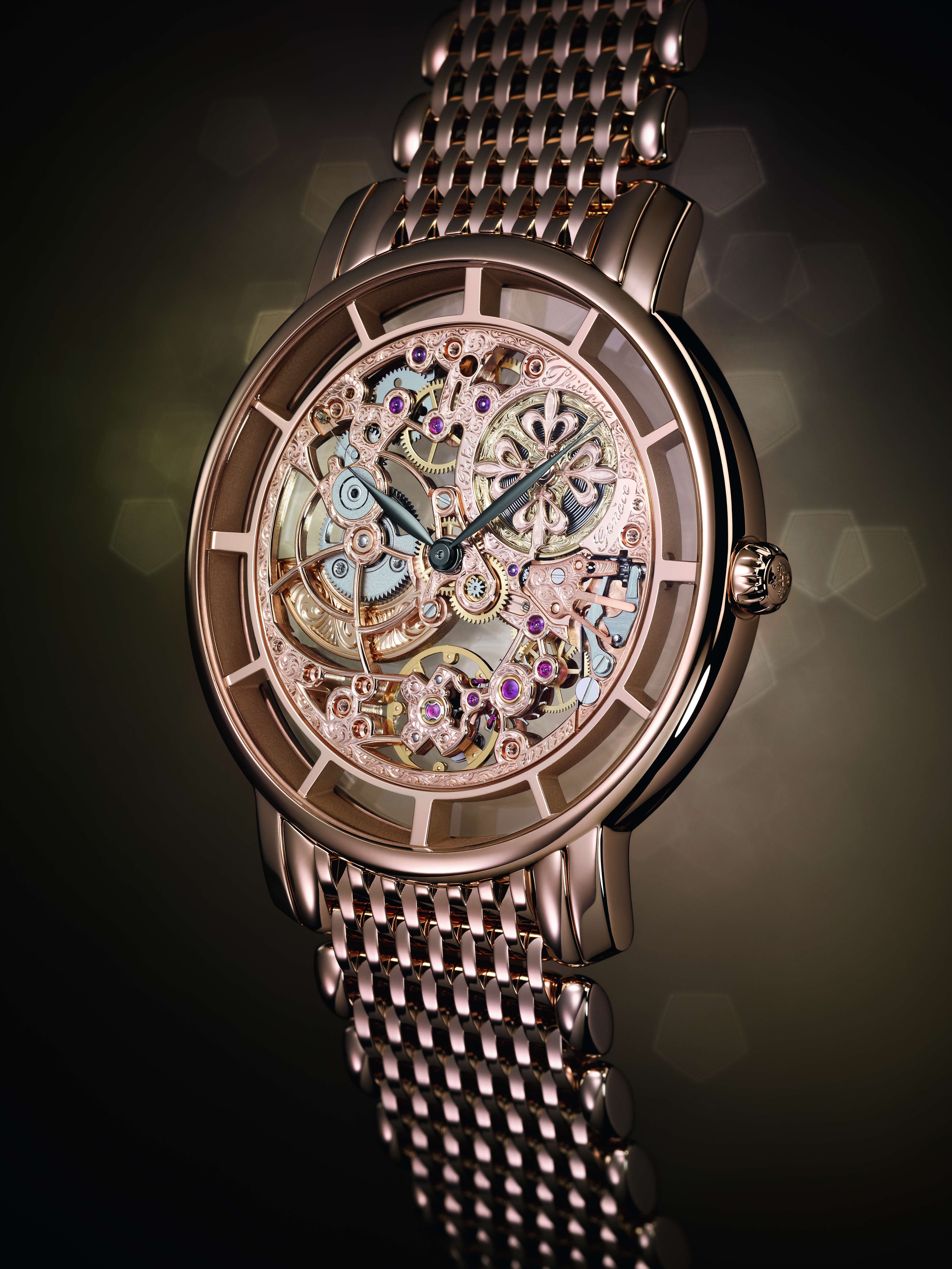 La nouvelle Calatrava «Squelette» référence 5180/1R en or rose 18 carats 5N offre un coup d’œil inédit dans les arcanes du calibre 240 à remontage automatique, grâce à son mouvement aux composants spécialement ajourés au maximum, puis patiemment gravés à la main de volutes et d’arabesques.