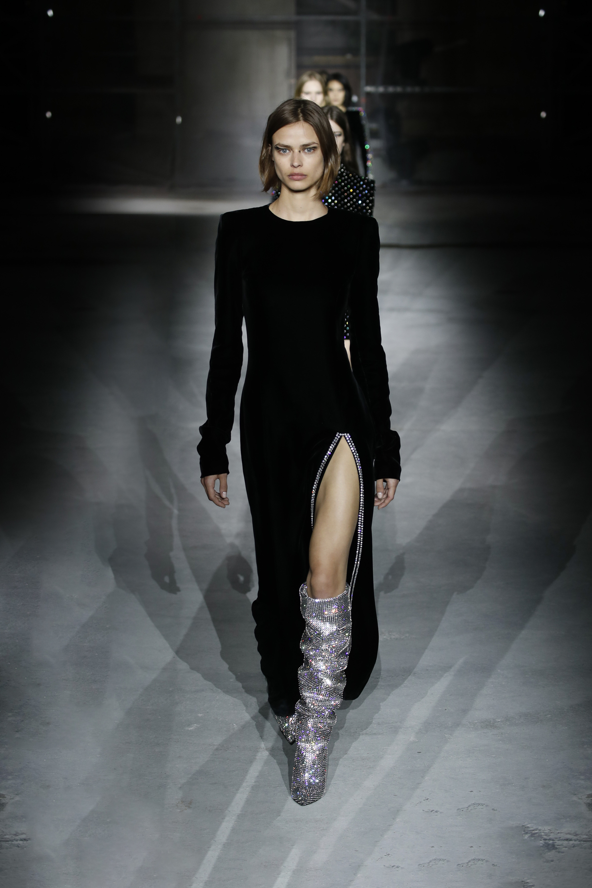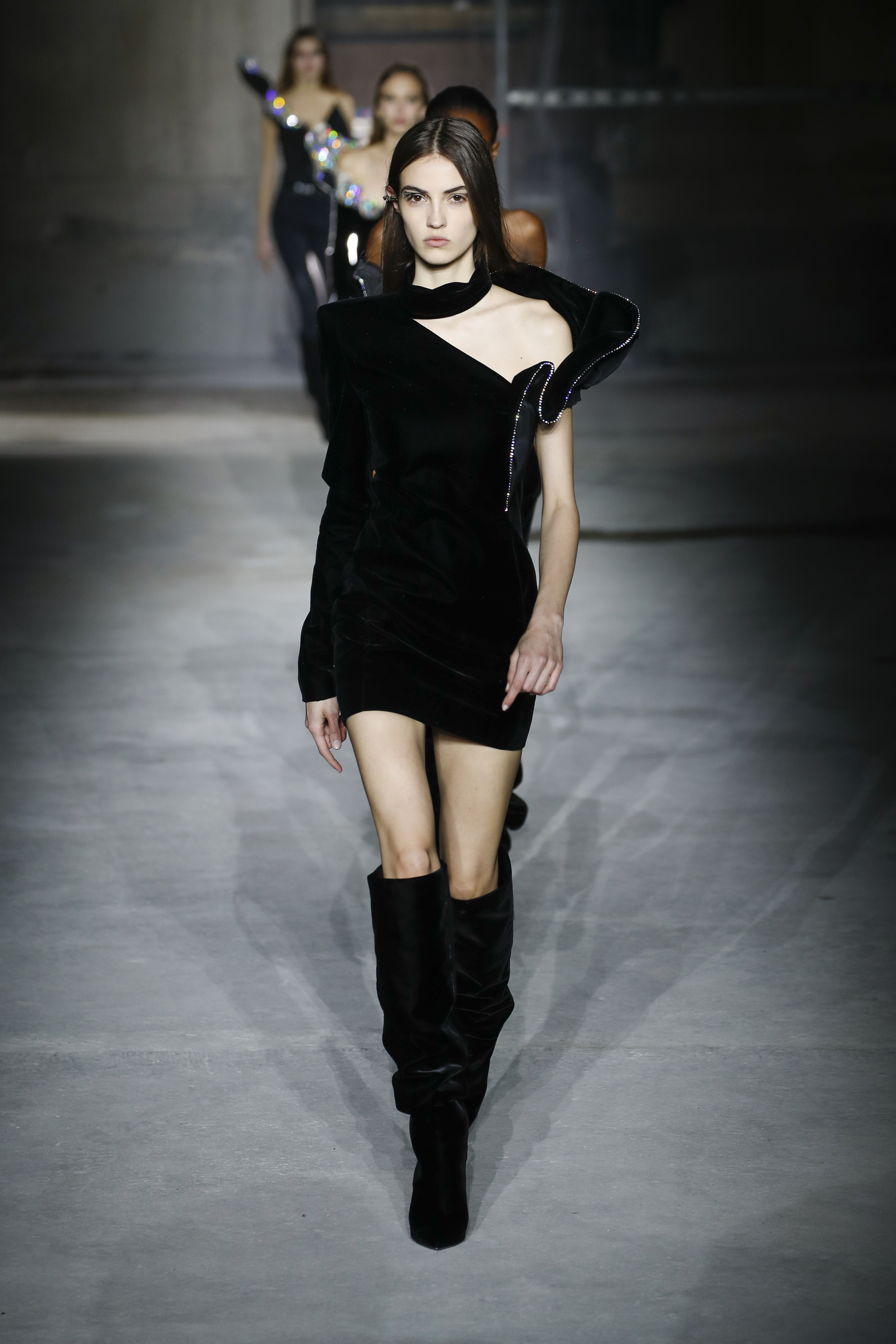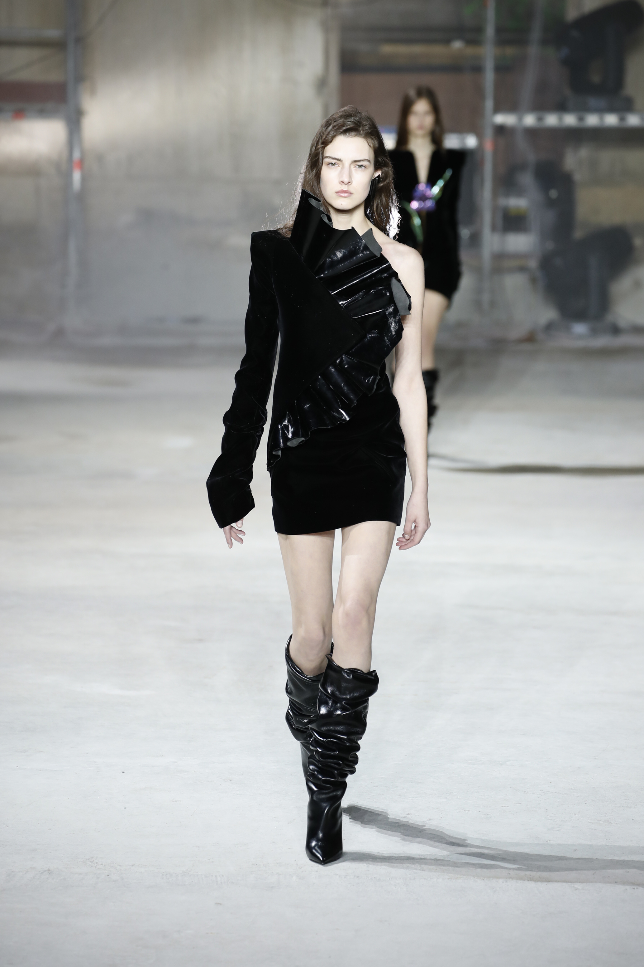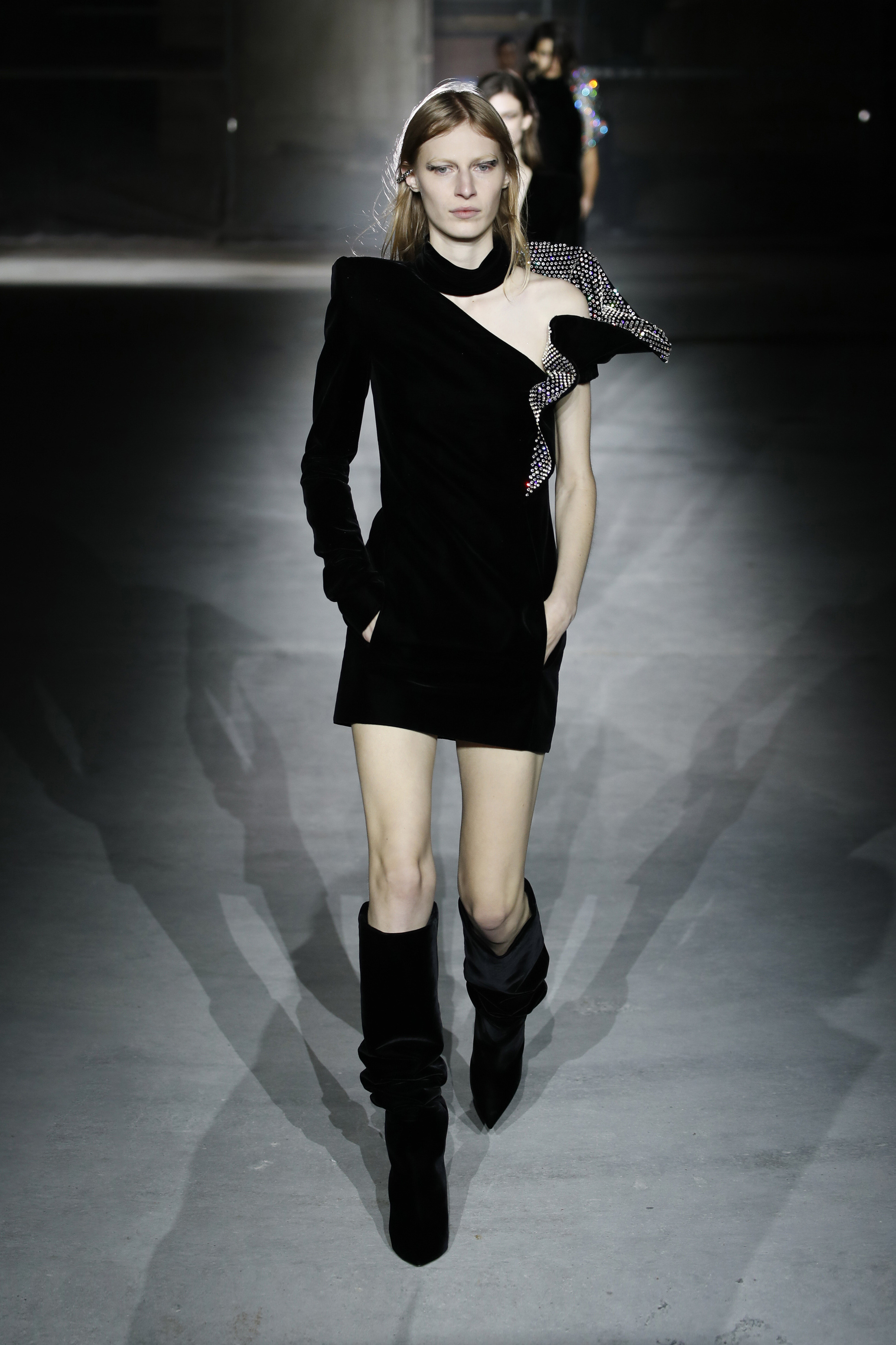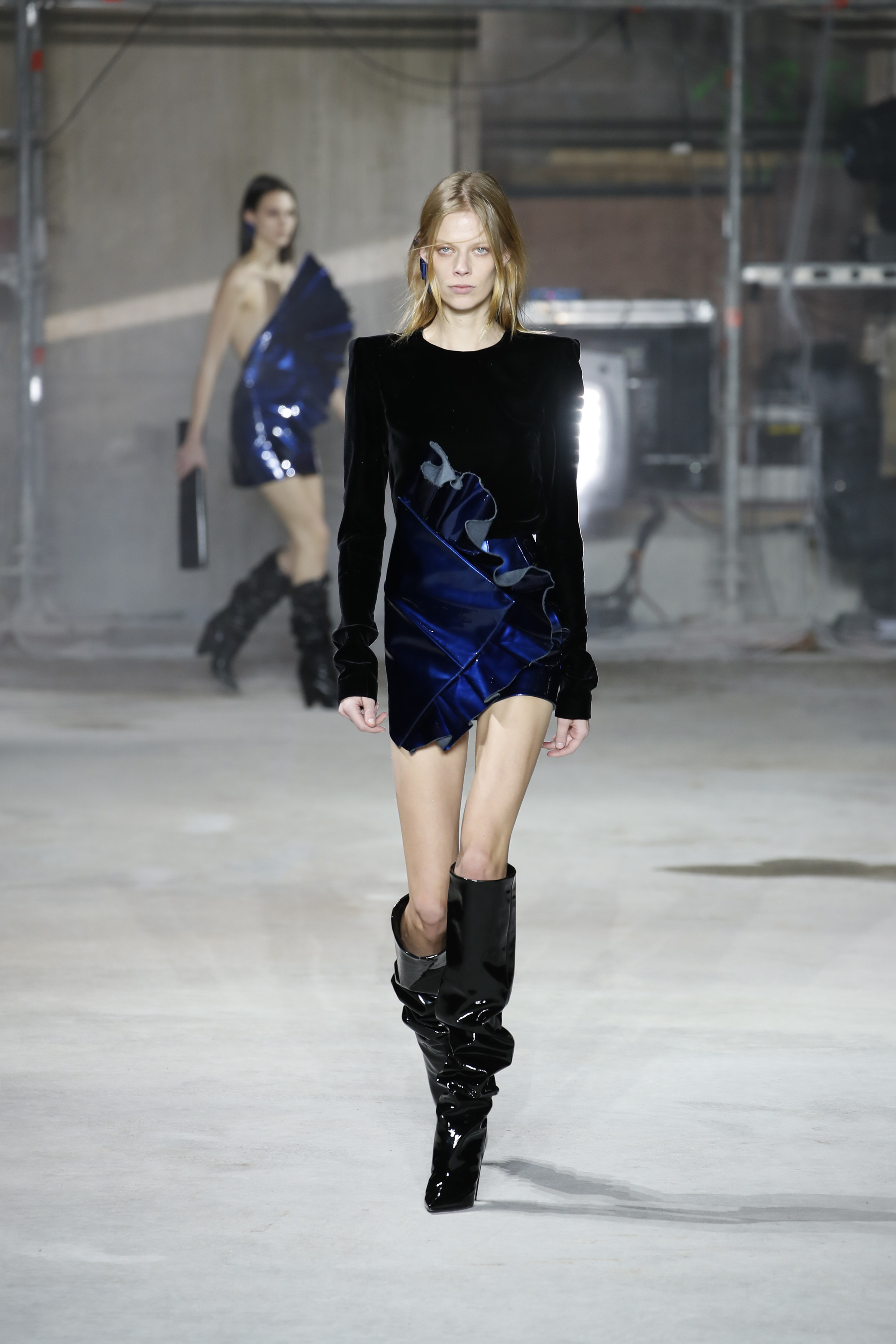 Anthony Vaccarello révèle le couturier à travers cette collection Automne/Hiver dans une atmosphère chic et festive : chemisiers transparents, drapés, tenues de soirée asymétriques, pièces de cuir, bottes froncées… La collection dévoile des silhouettes féminines, masculines et androgynes dans un décor brut.