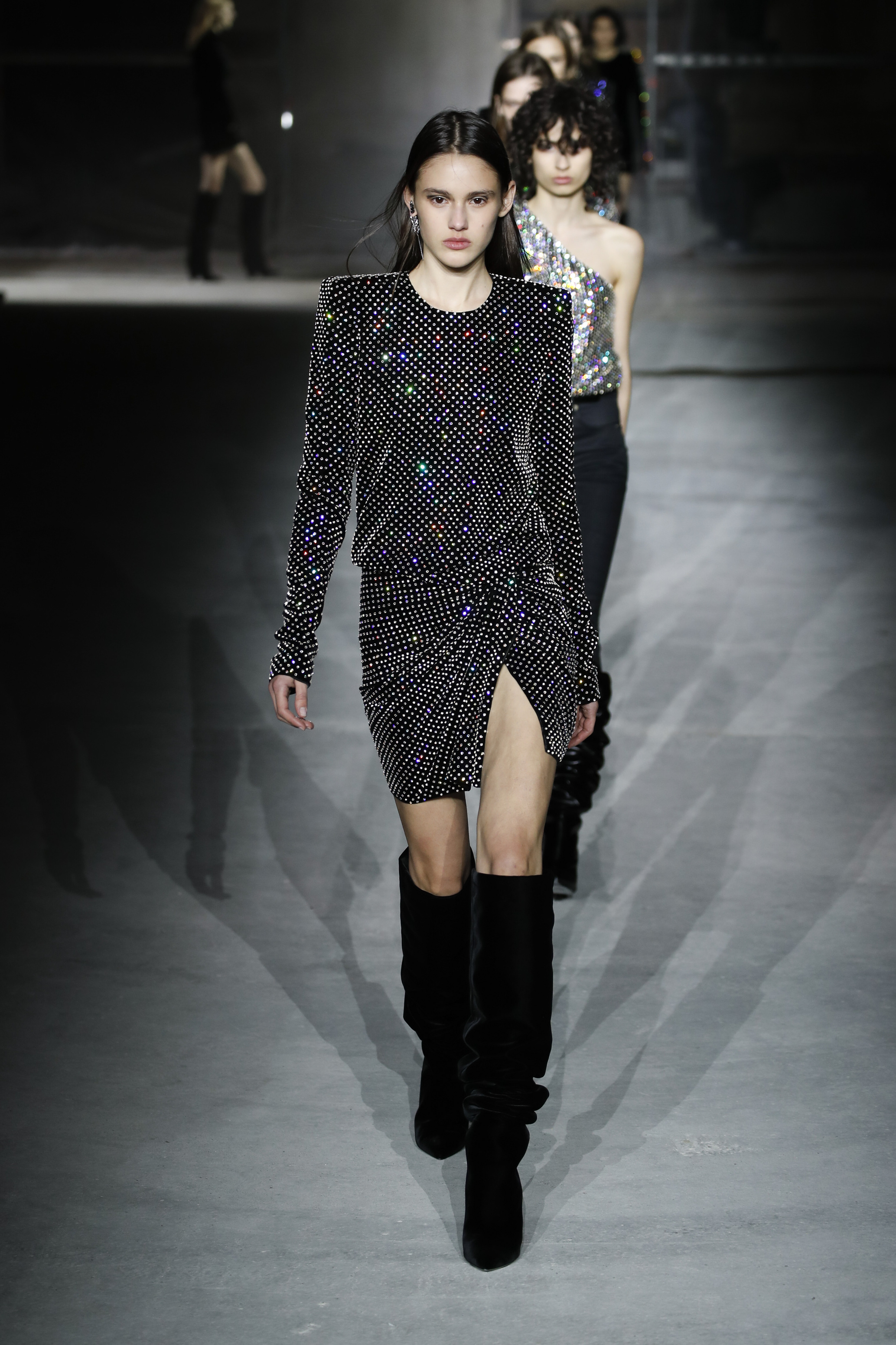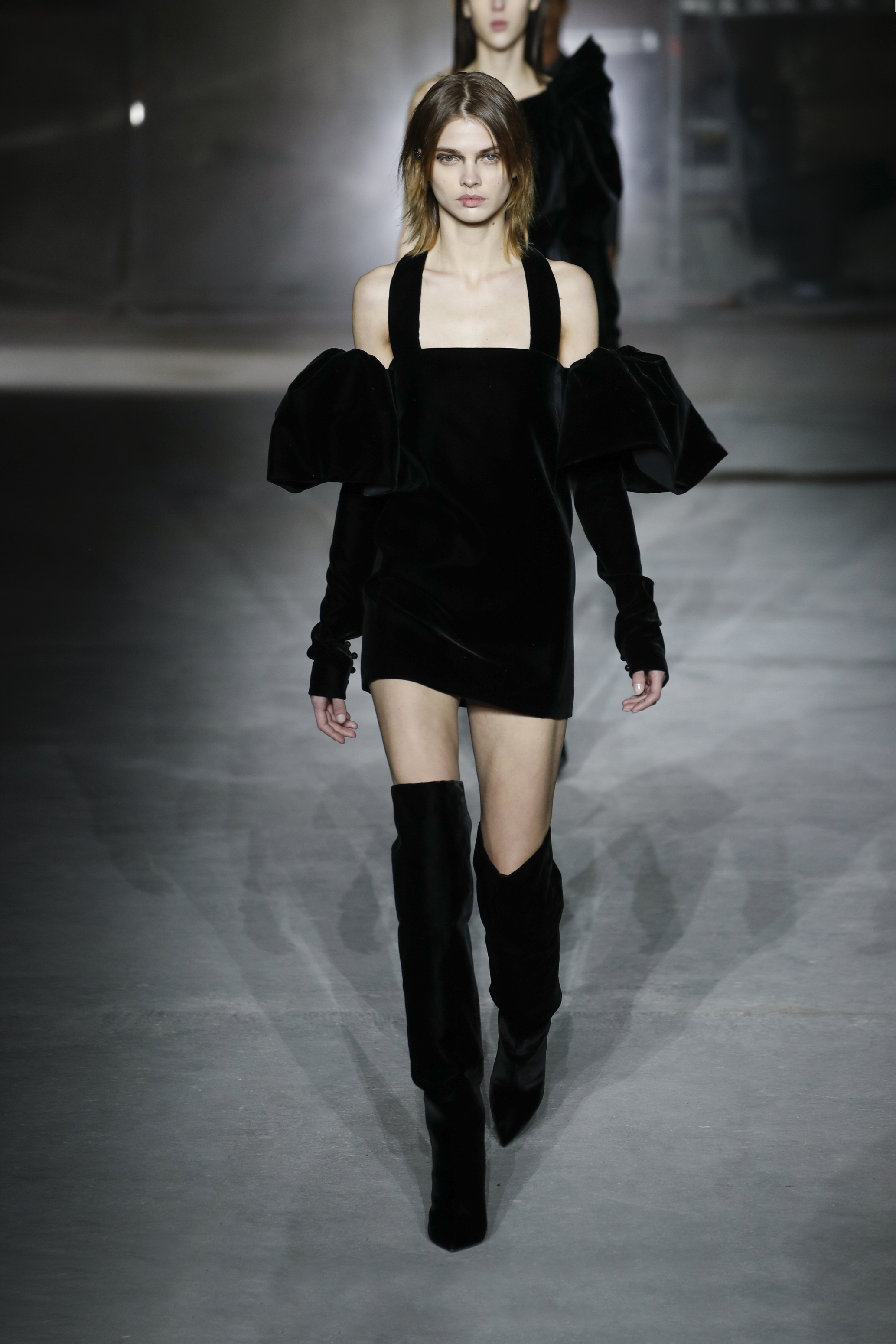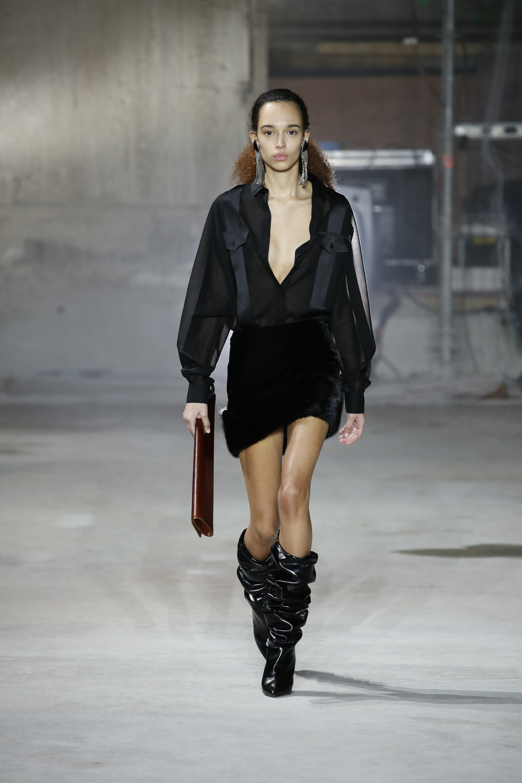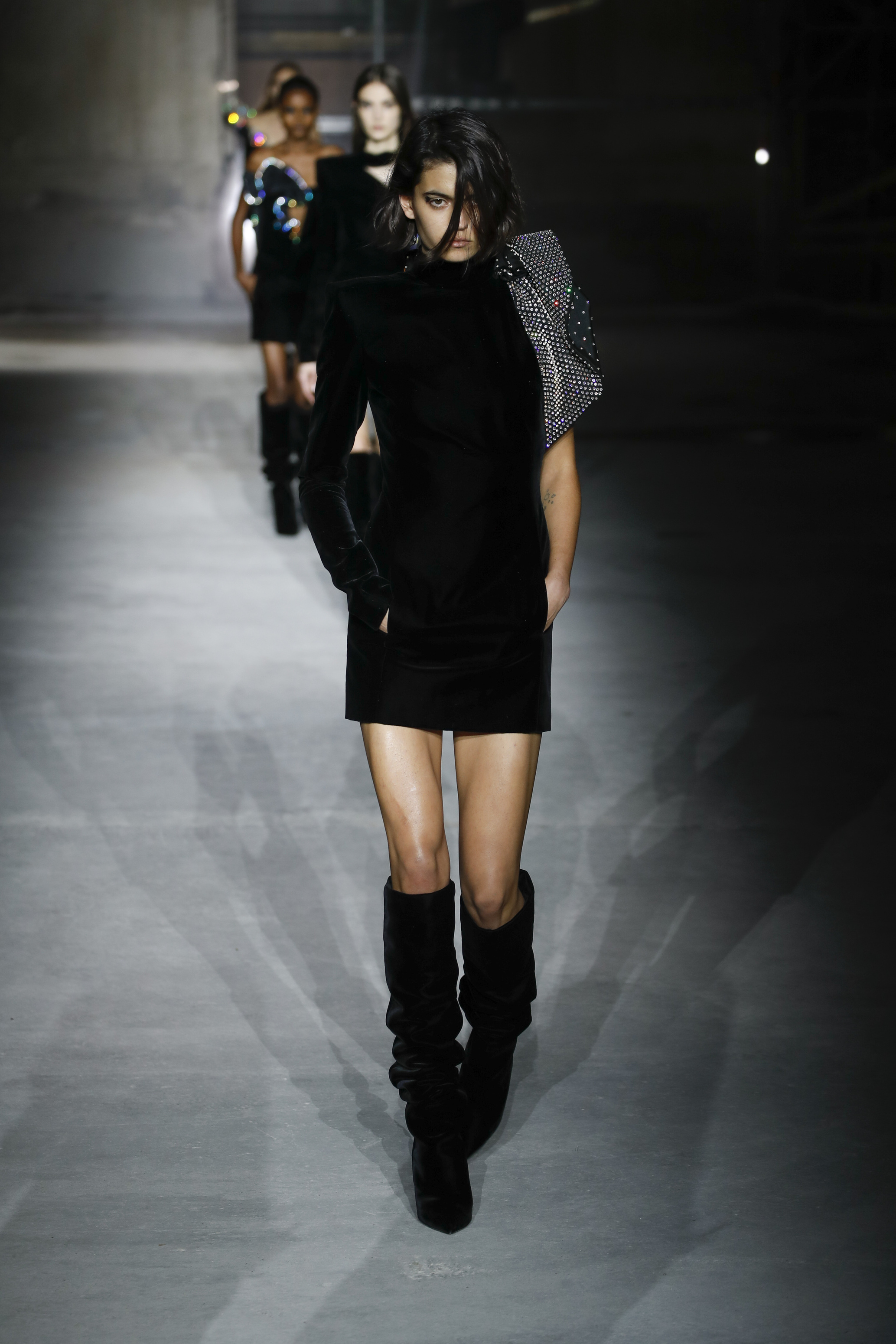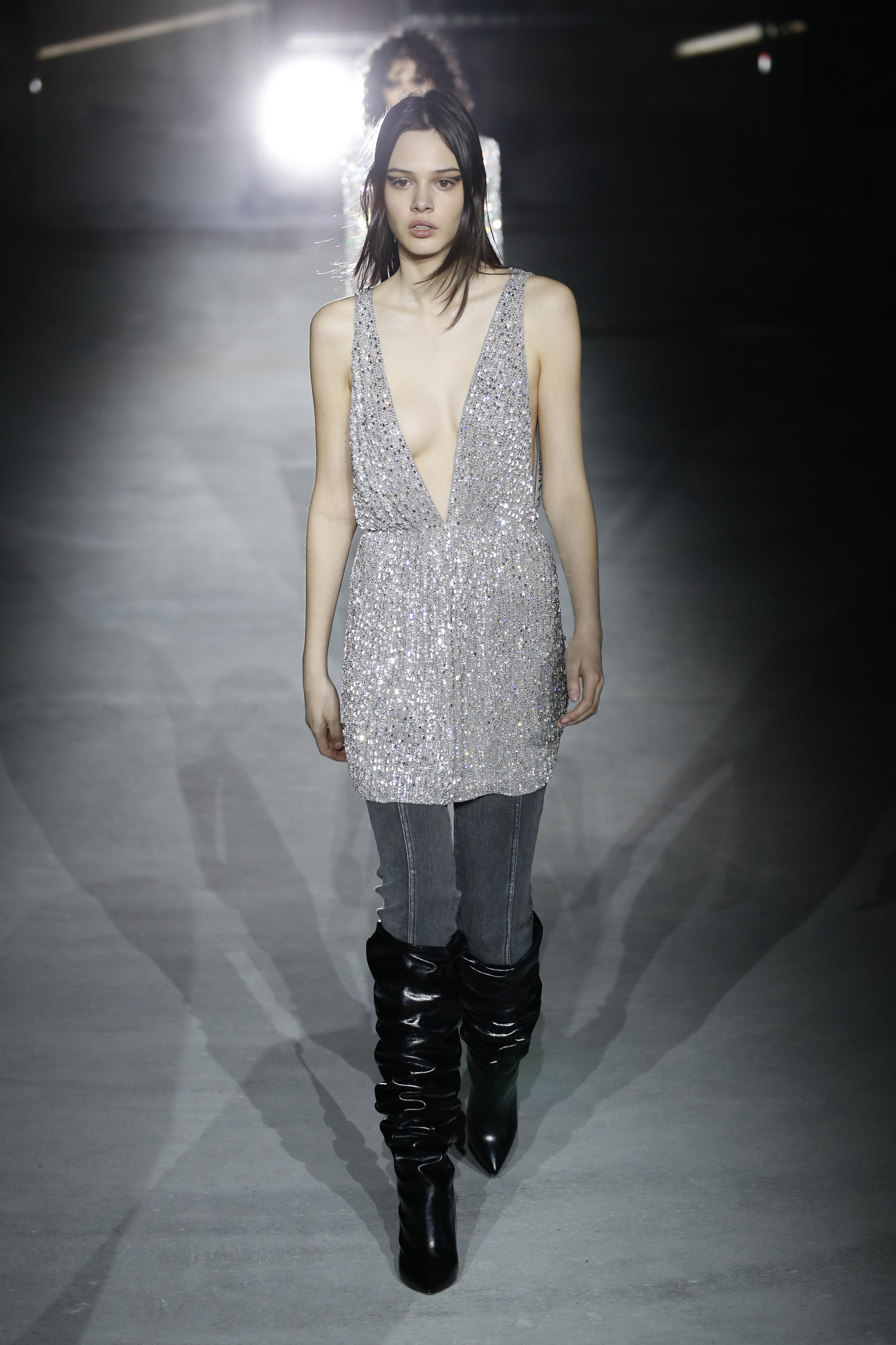 Anthony Vaccarello révèle le couturier à travers cette collection Automne/Hiver dans une atmosphère chic et festive : chemisiers transparents, drapés, tenues de soirée asymétriques, pièces de cuir, bottes froncées… La collection dévoile des silhouettes féminines, masculines et androgynes dans un décor brut.