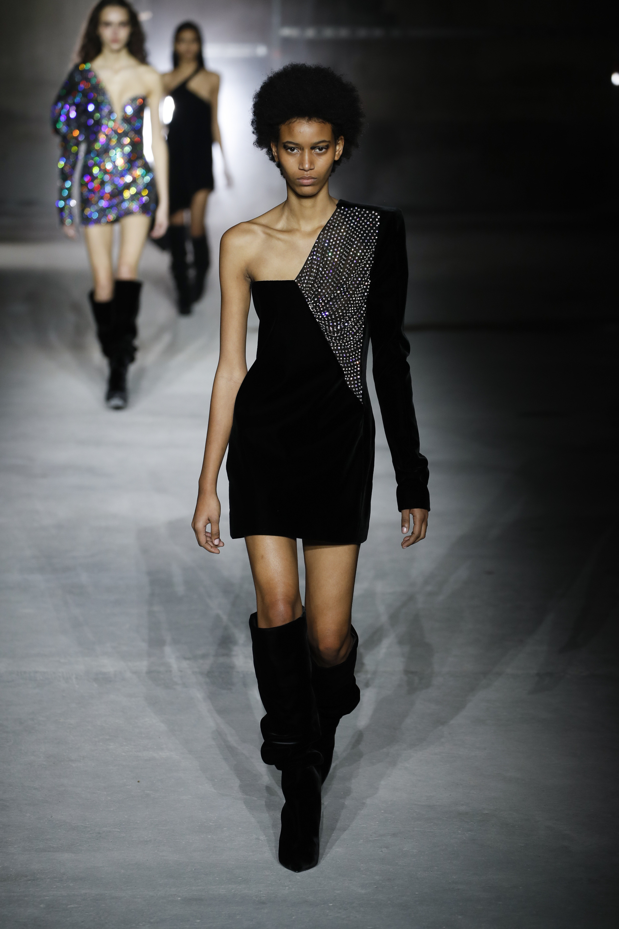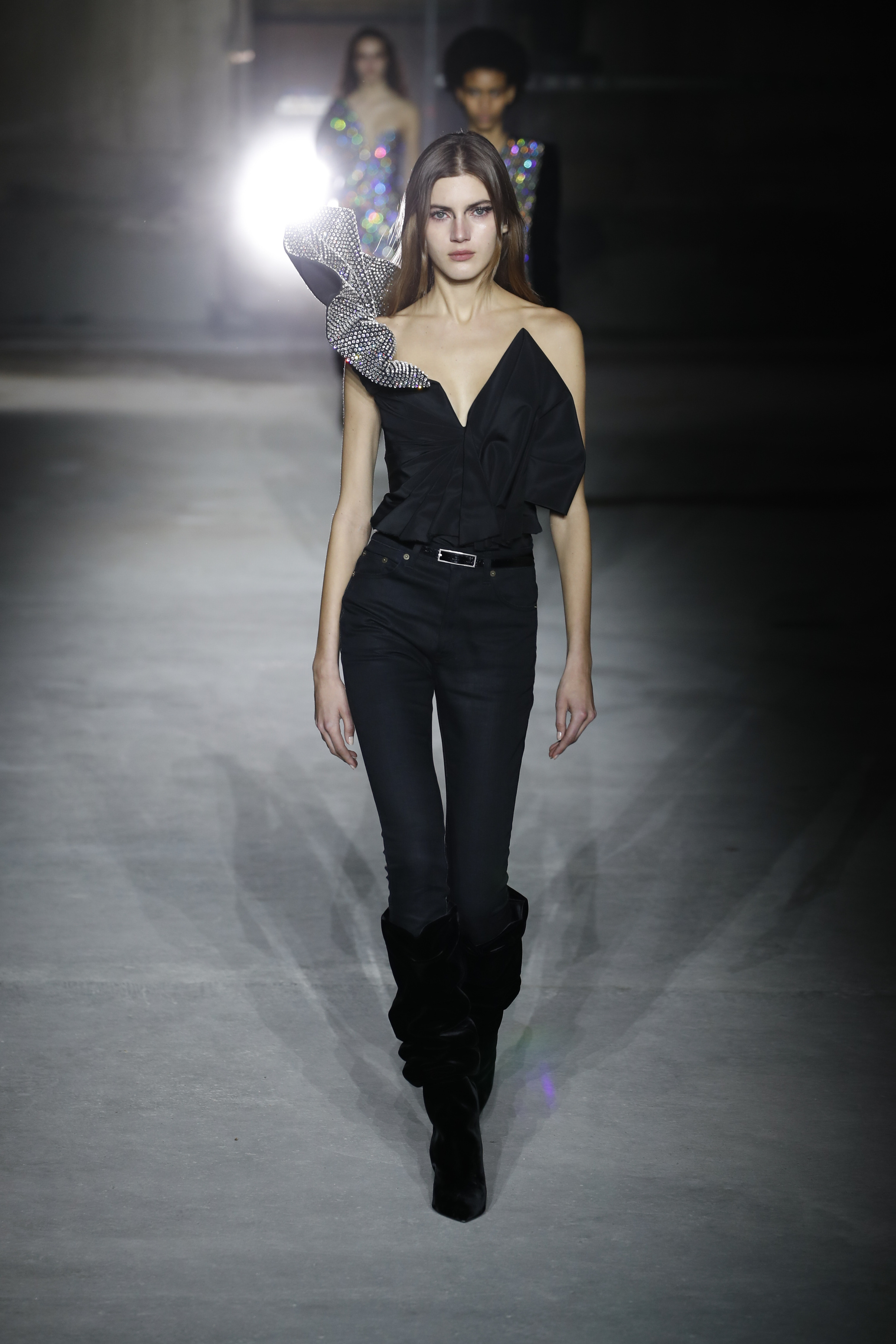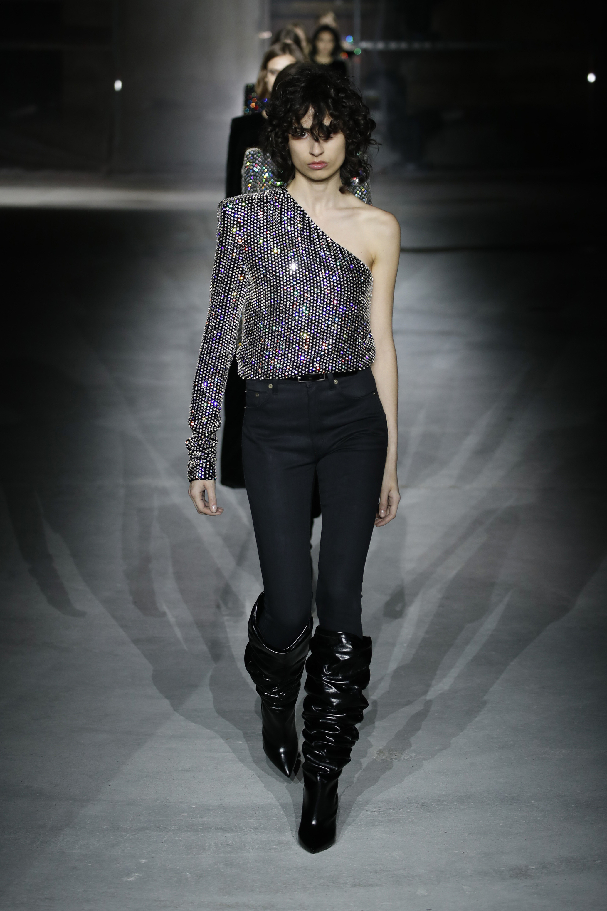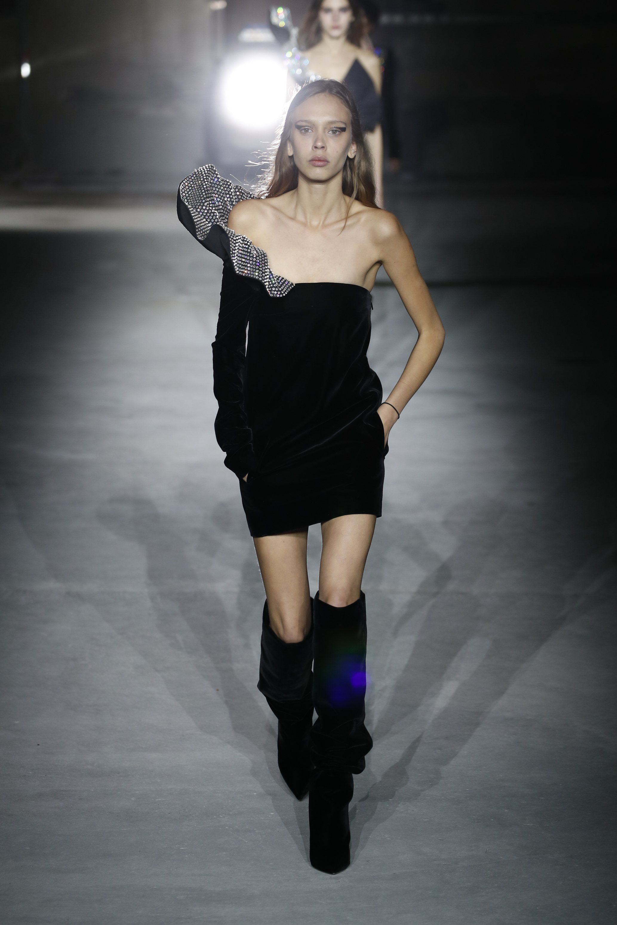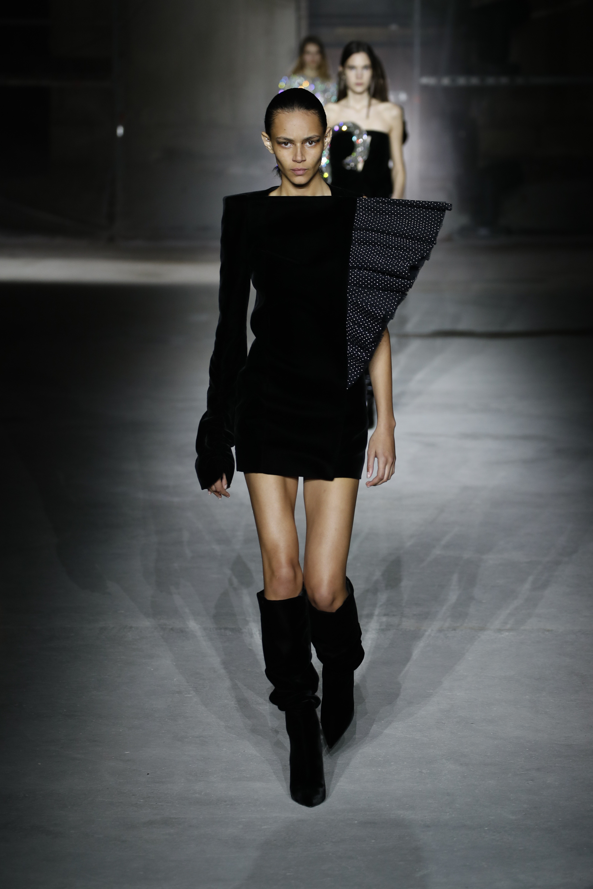 Anthony Vaccarello révèle le couturier à travers cette collection Automne/Hiver dans une atmosphère chic et festive : chemisiers transparents, drapés, tenues de soirée asymétriques, pièces de cuir, bottes froncées… La collection dévoile des silhouettes féminines, masculines et androgynes dans un décor brut.