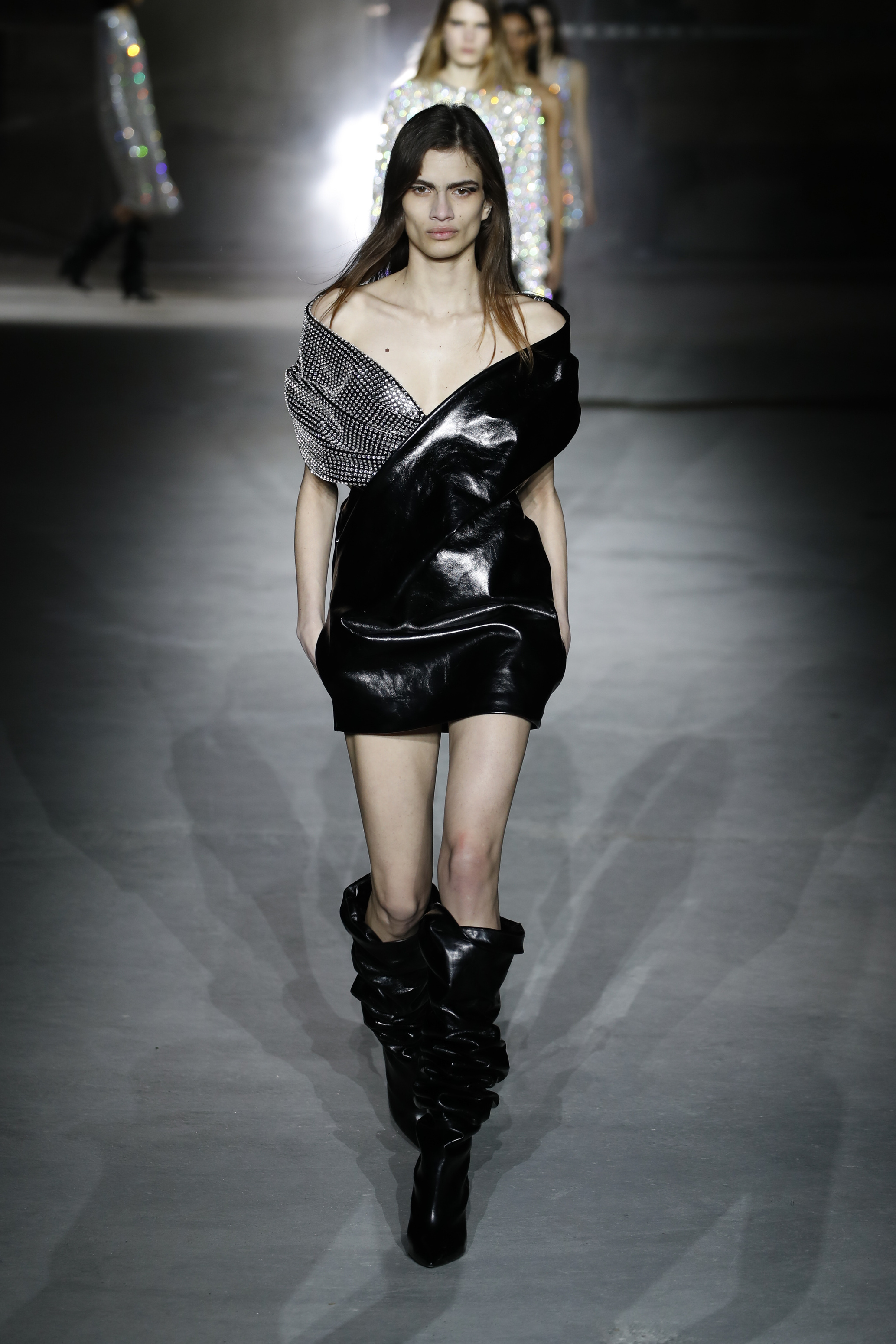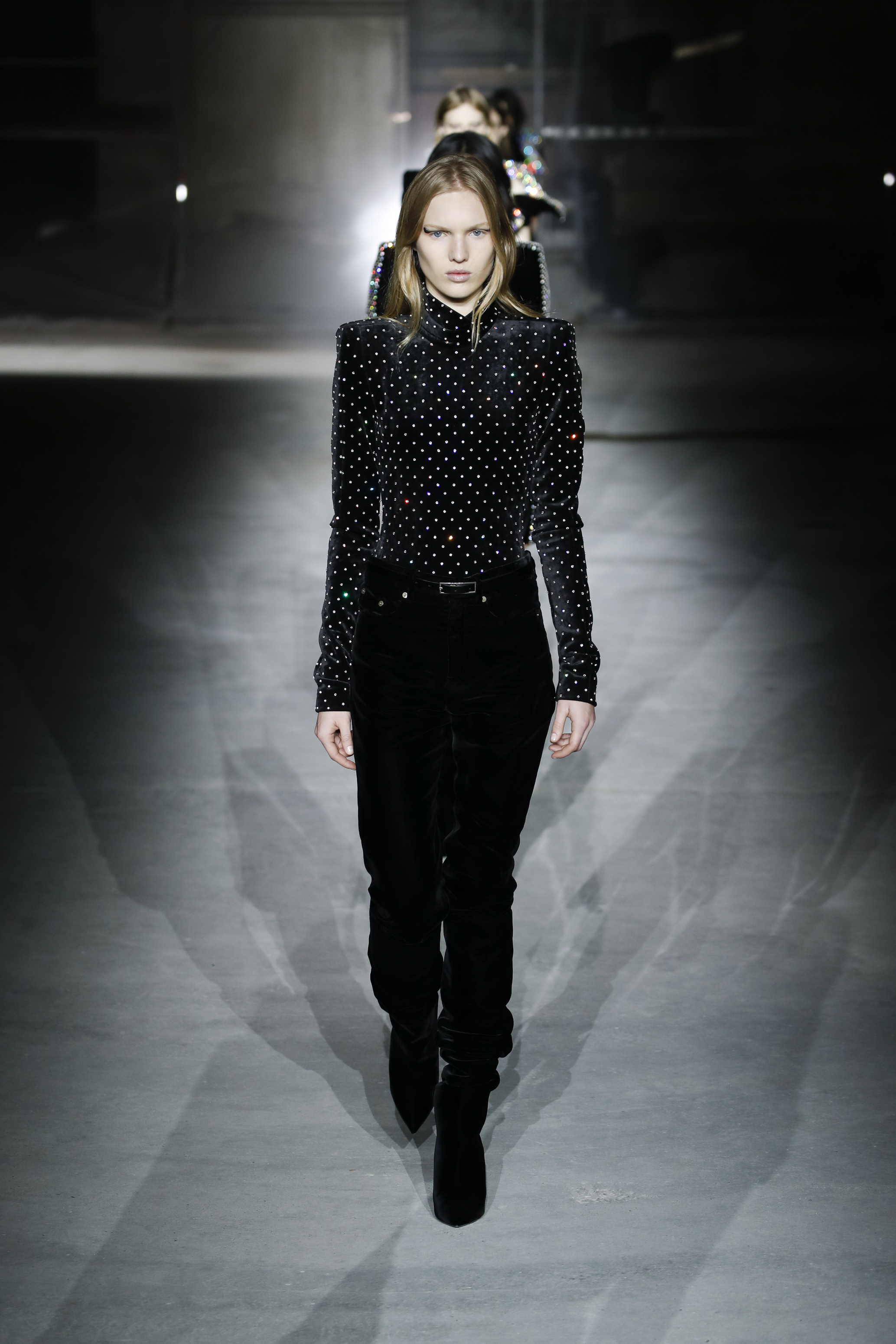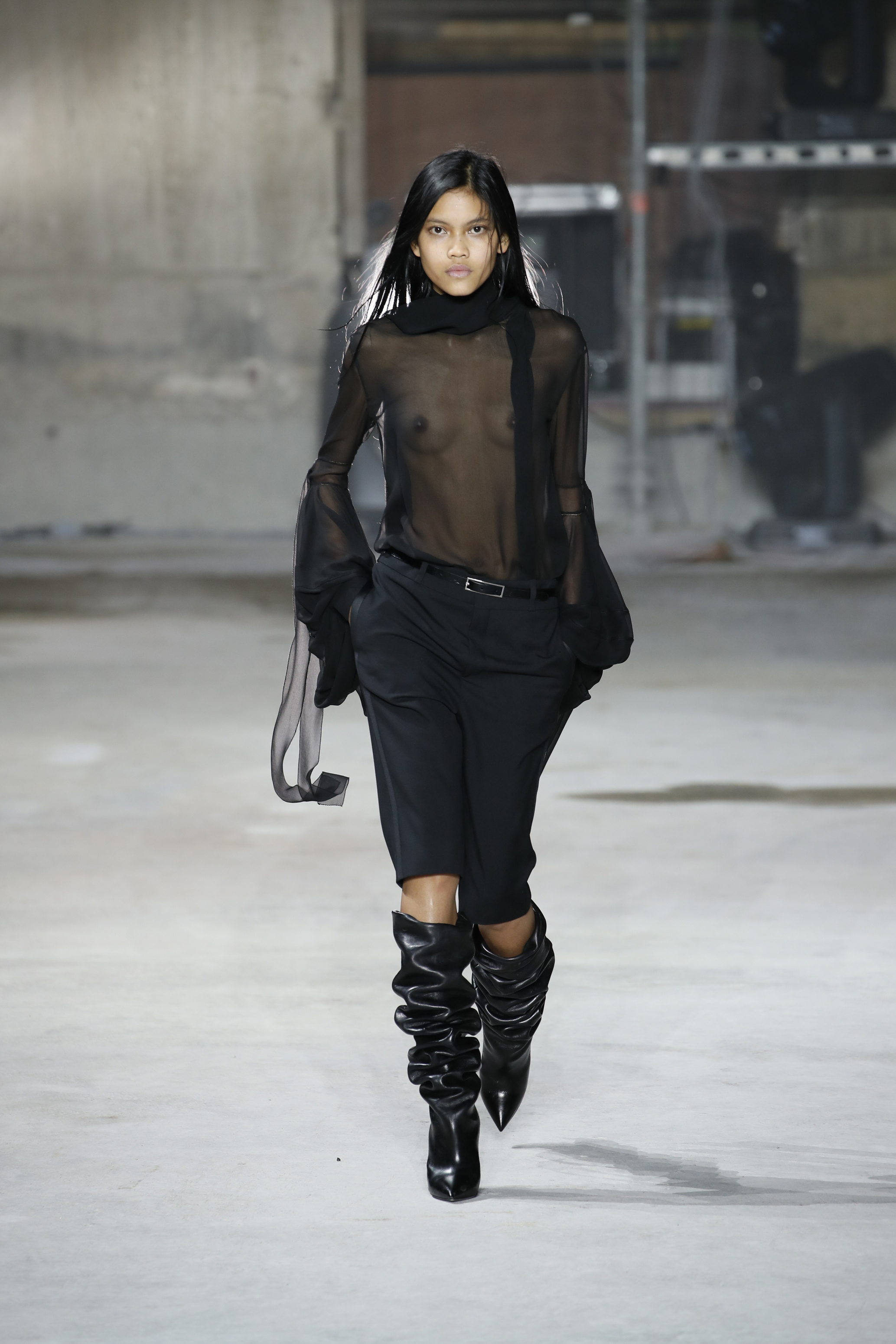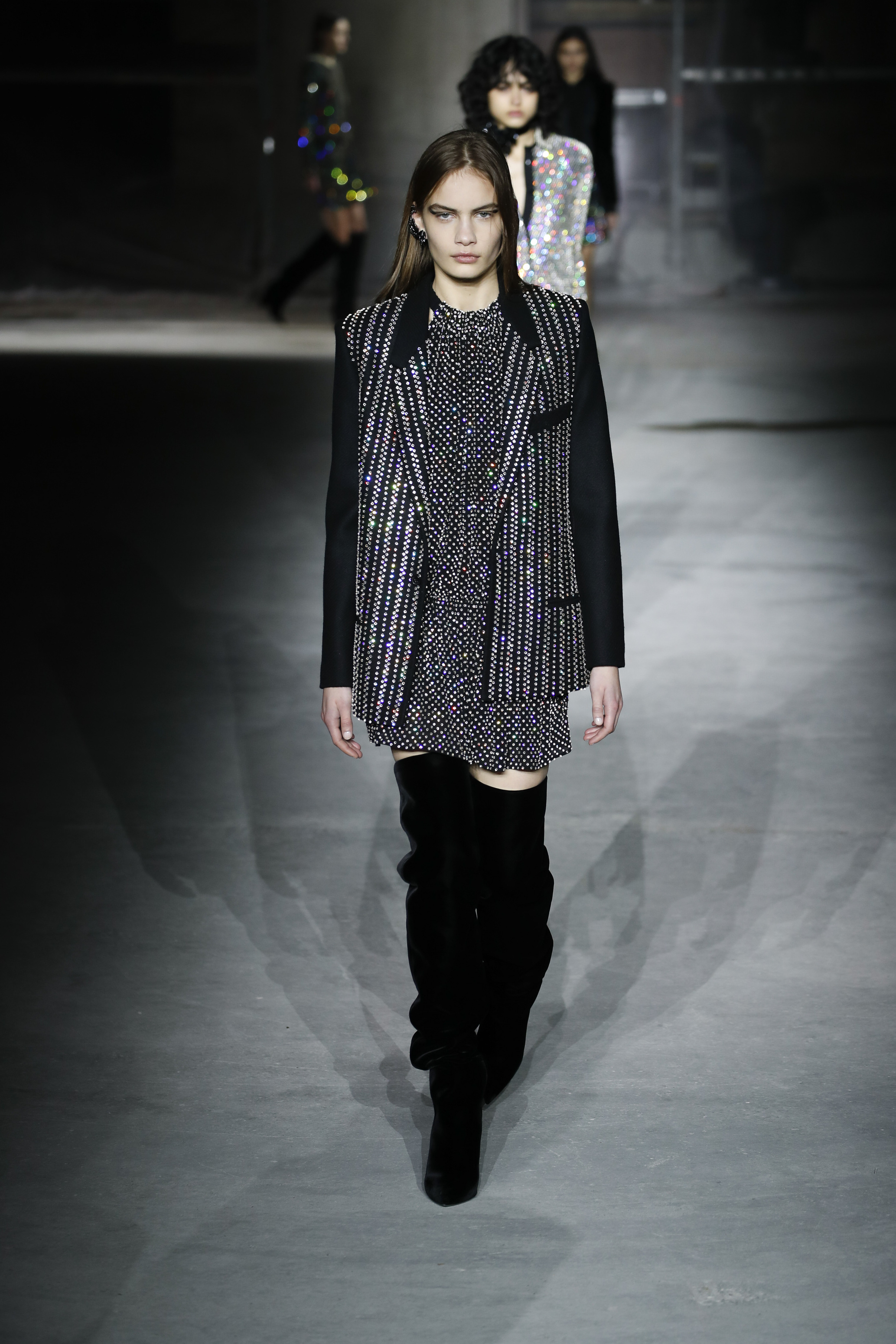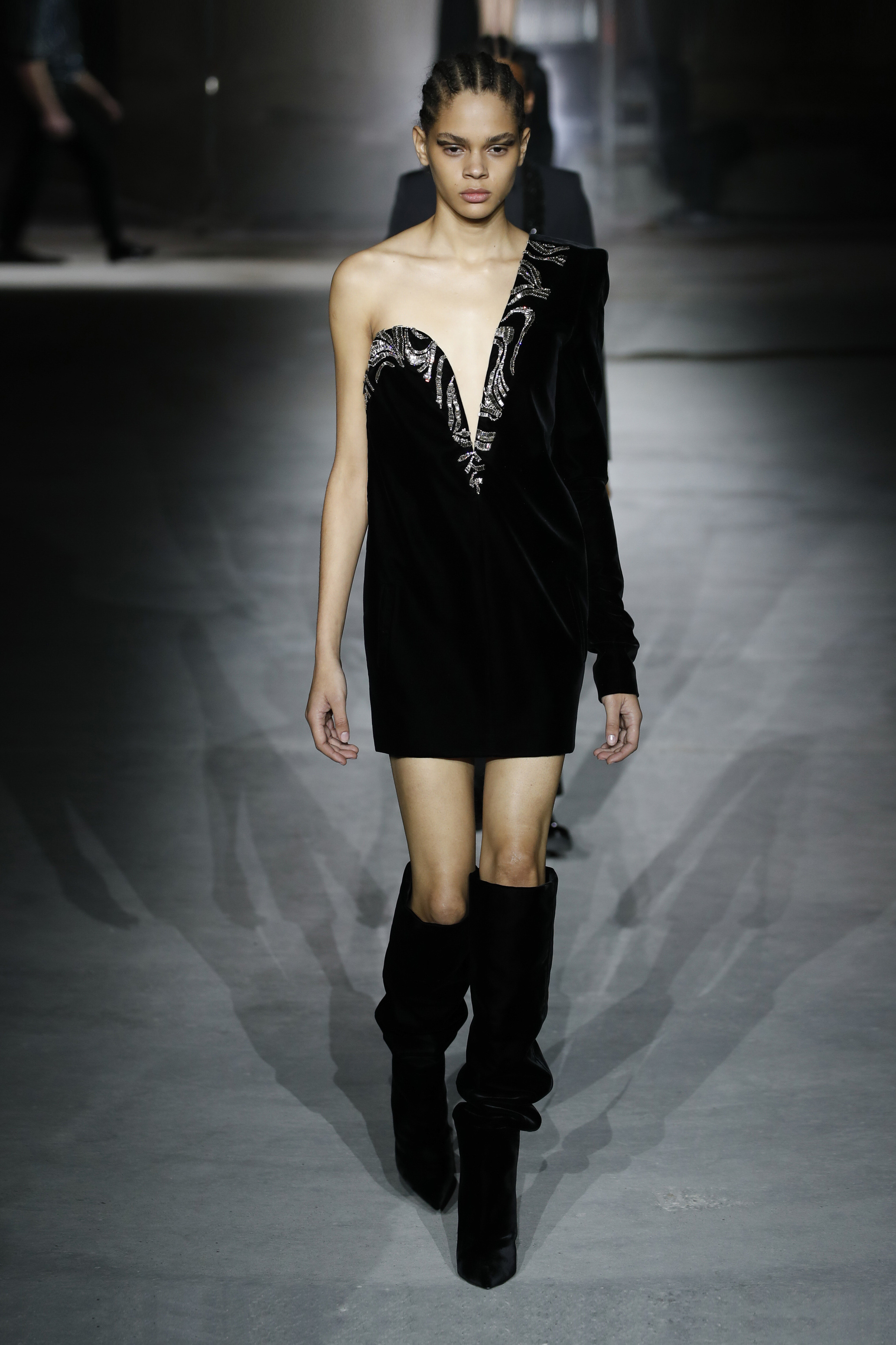 Anthony Vaccarello révèle le couturier à travers cette collection Automne/Hiver dans une atmosphère chic et festive : chemisiers transparents, drapés, tenues de soirée asymétriques, pièces de cuir, bottes froncées… La collection dévoile des silhouettes féminines, masculines et androgynes dans un décor brut.