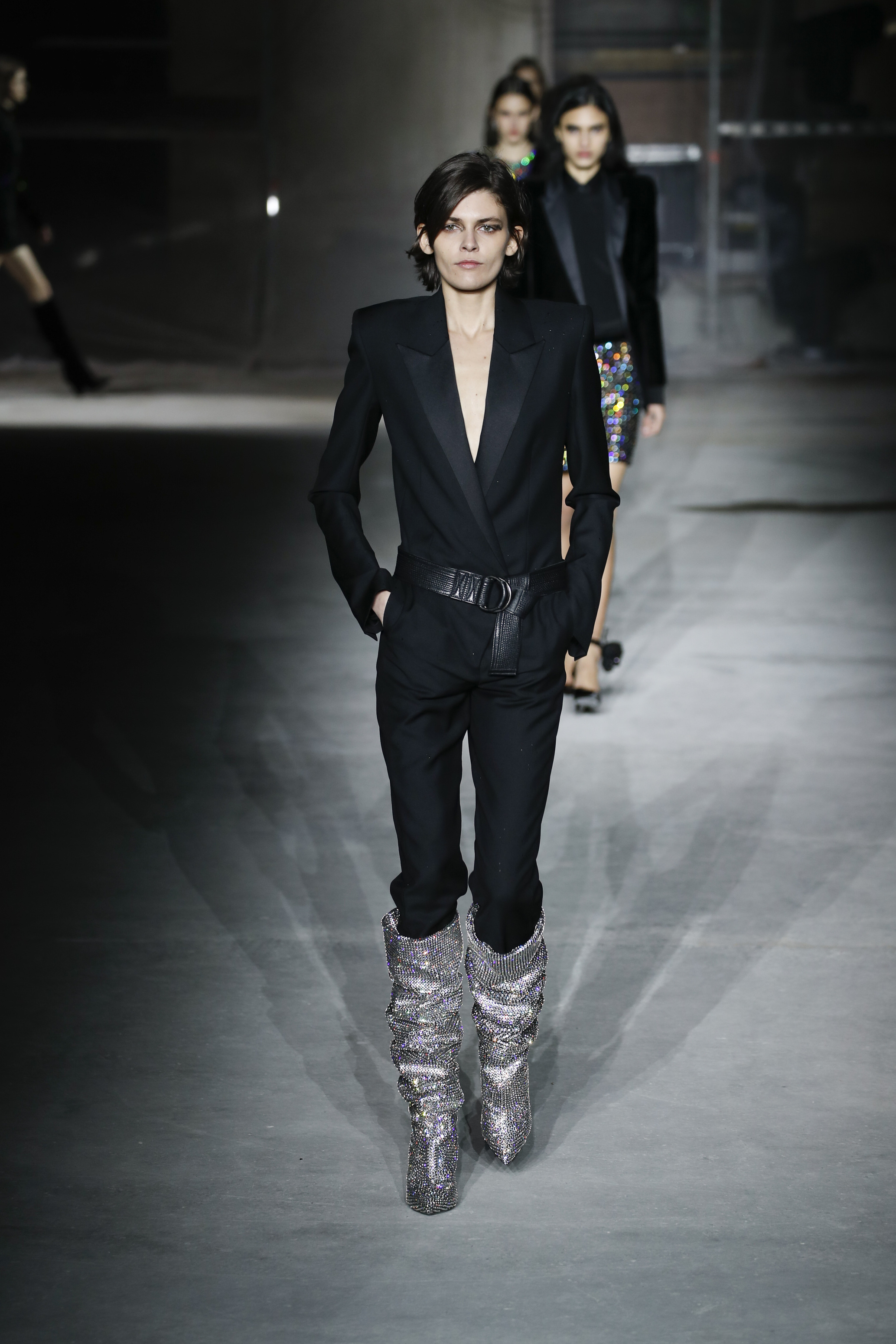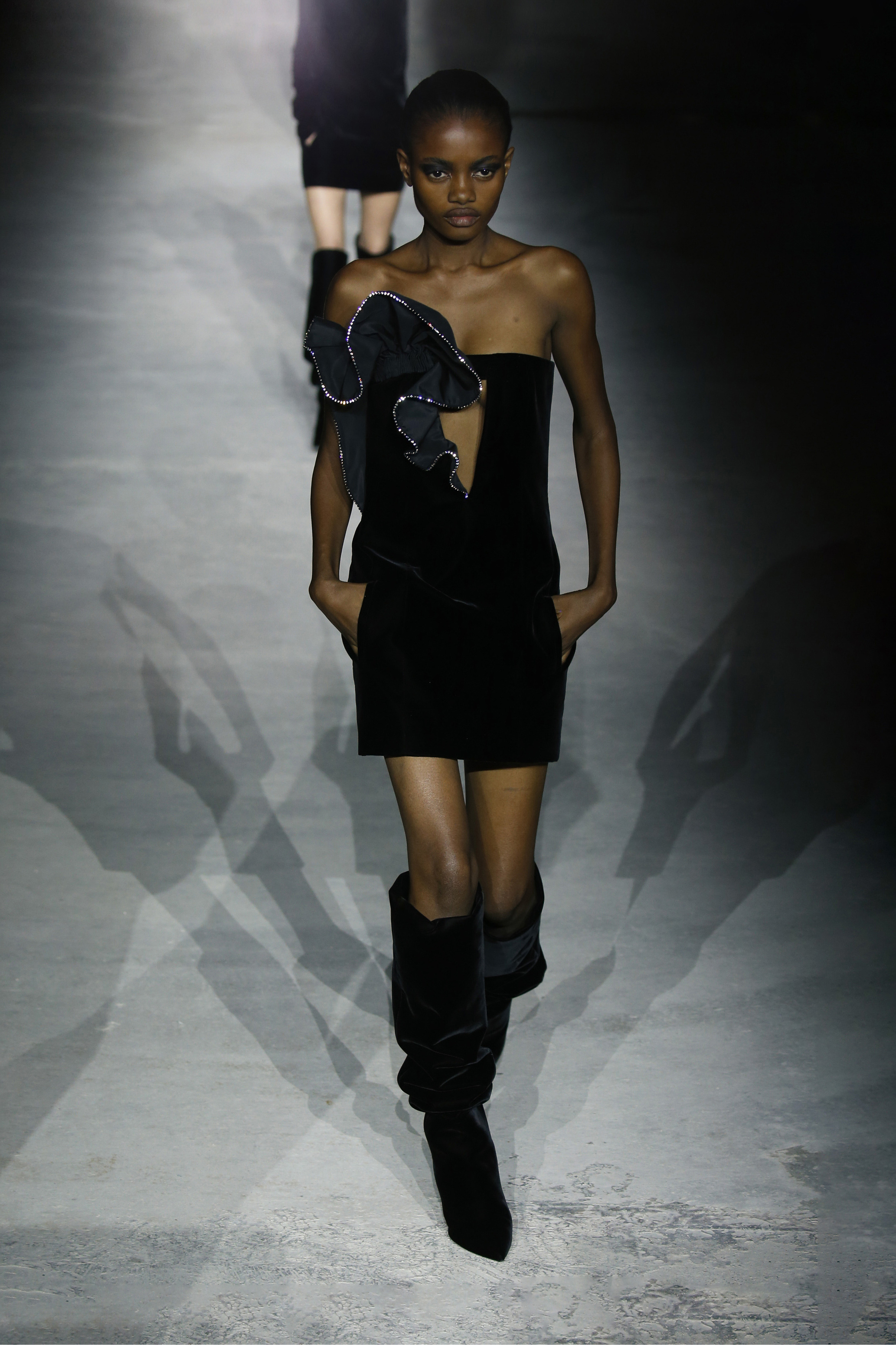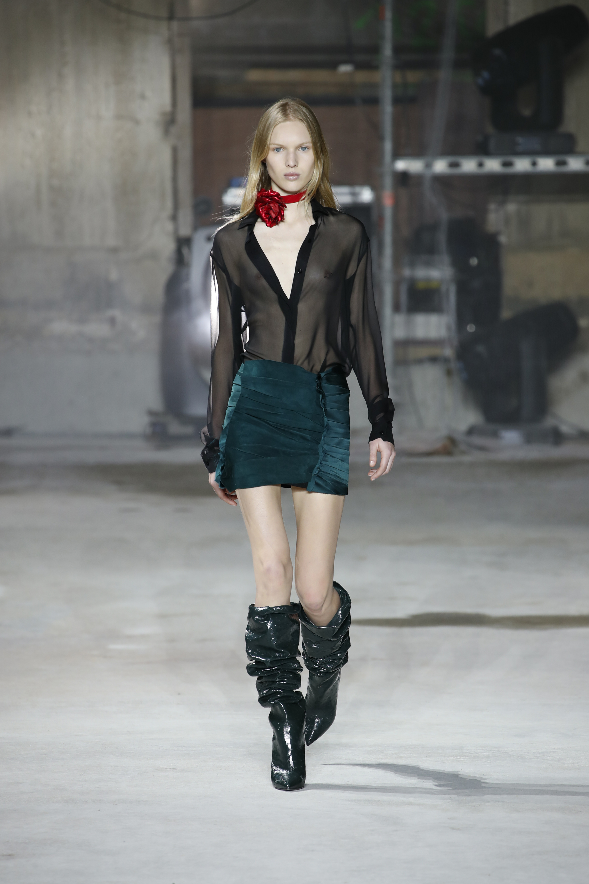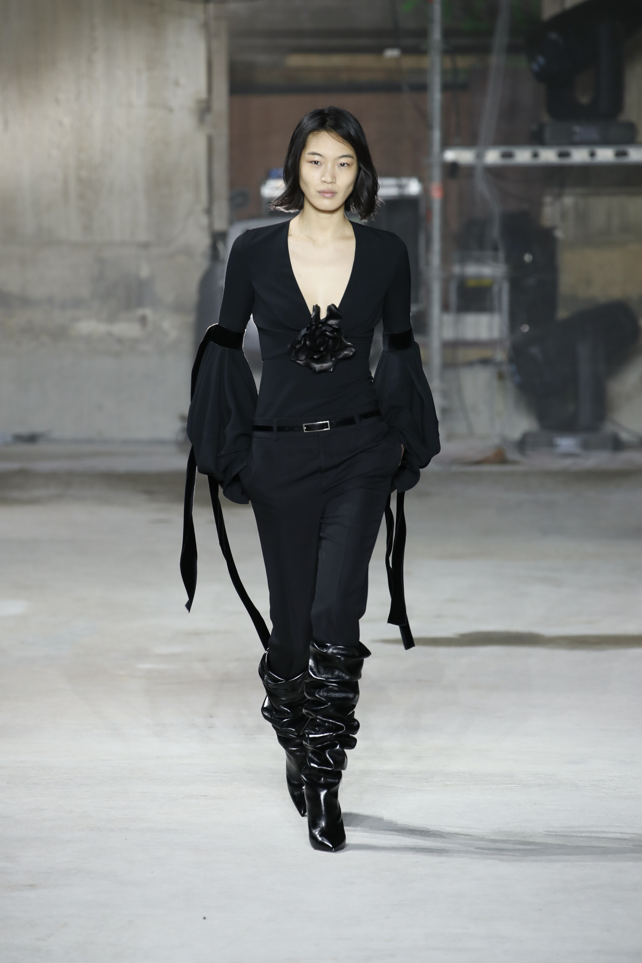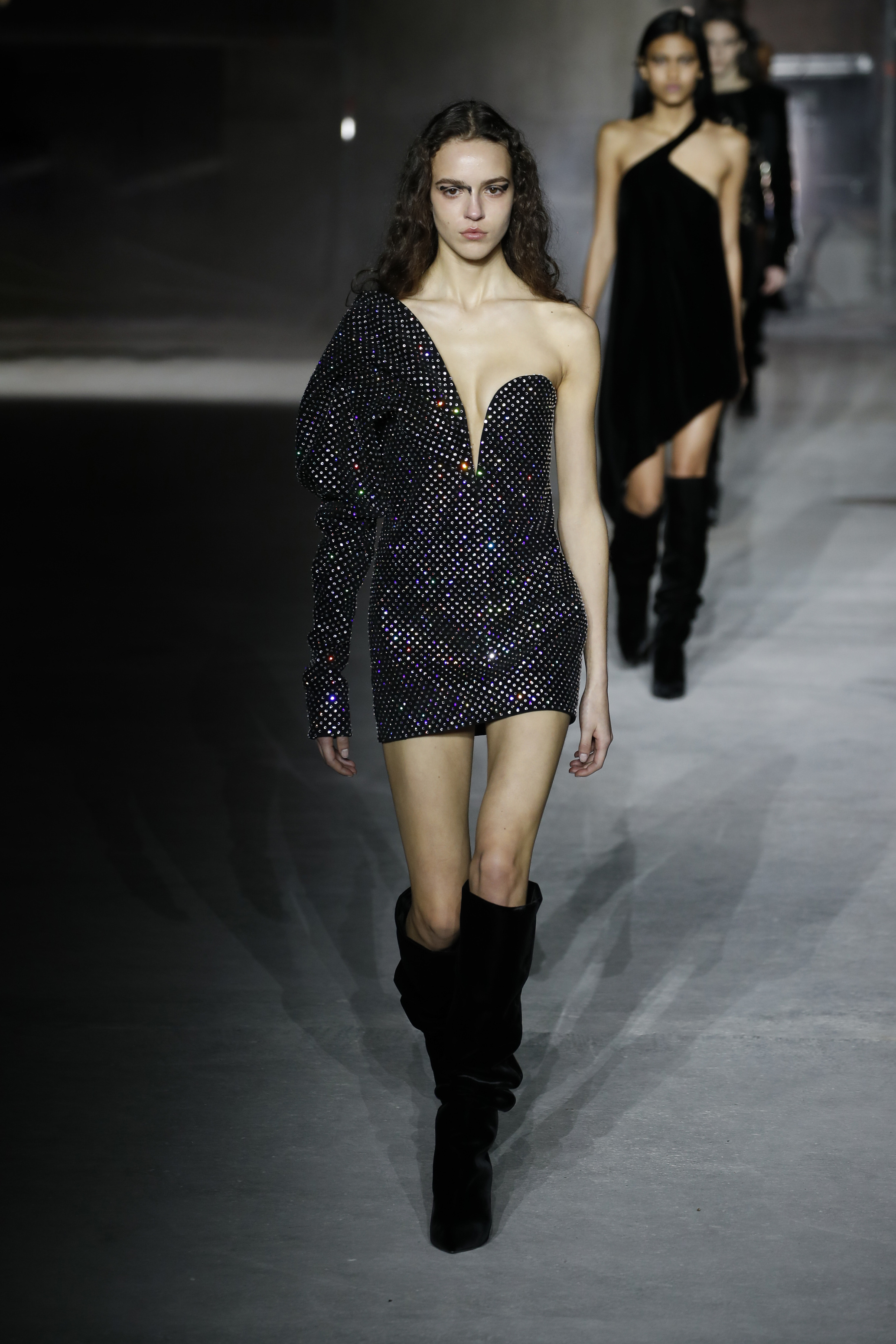 Anthony Vaccarello révèle le couturier à travers cette collection Automne/Hiver dans une atmosphère chic et festive : chemisiers transparents, drapés, tenues de soirée asymétriques, pièces de cuir, bottes froncées… La collection dévoile des silhouettes féminines, masculines et androgynes dans un décor brut.