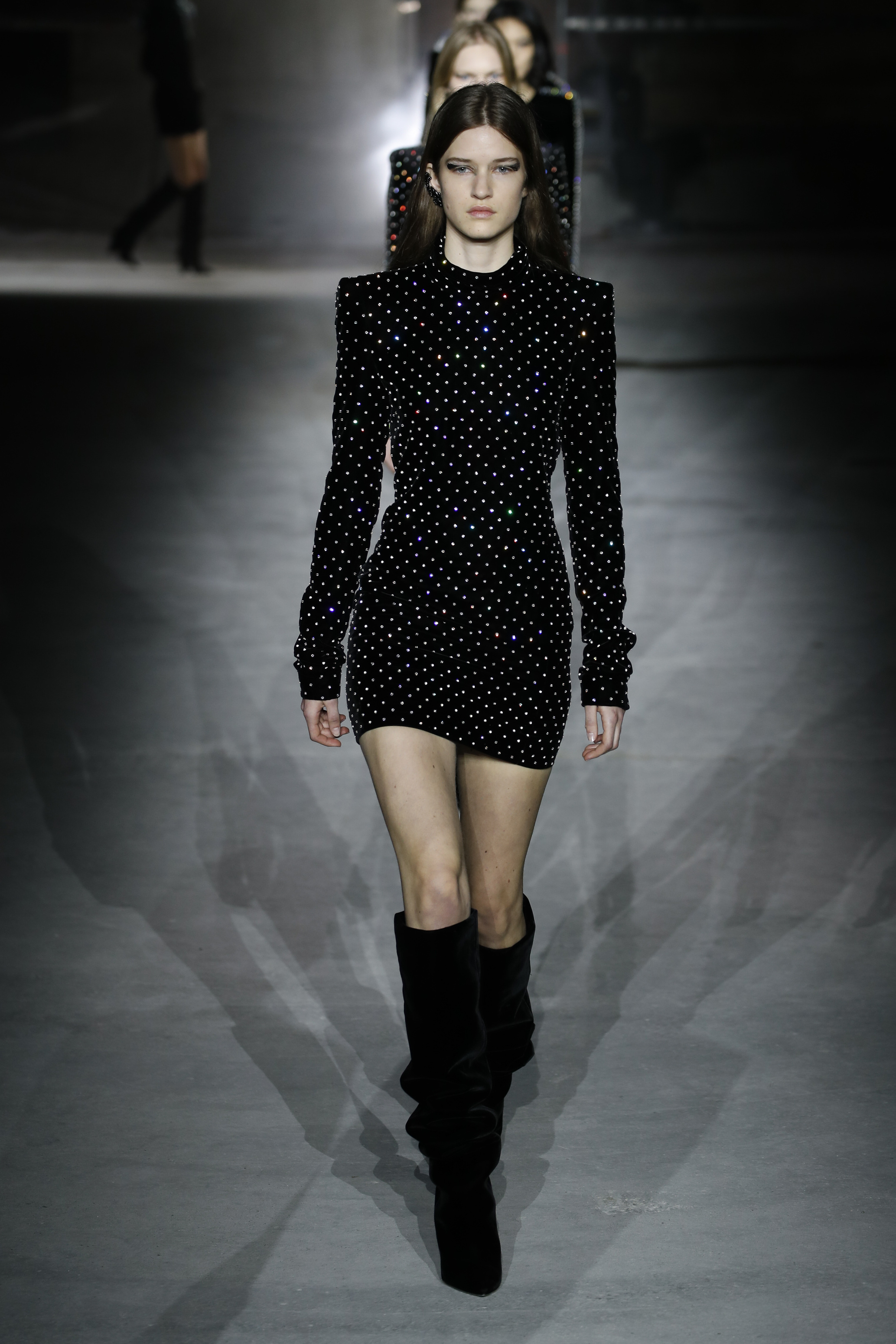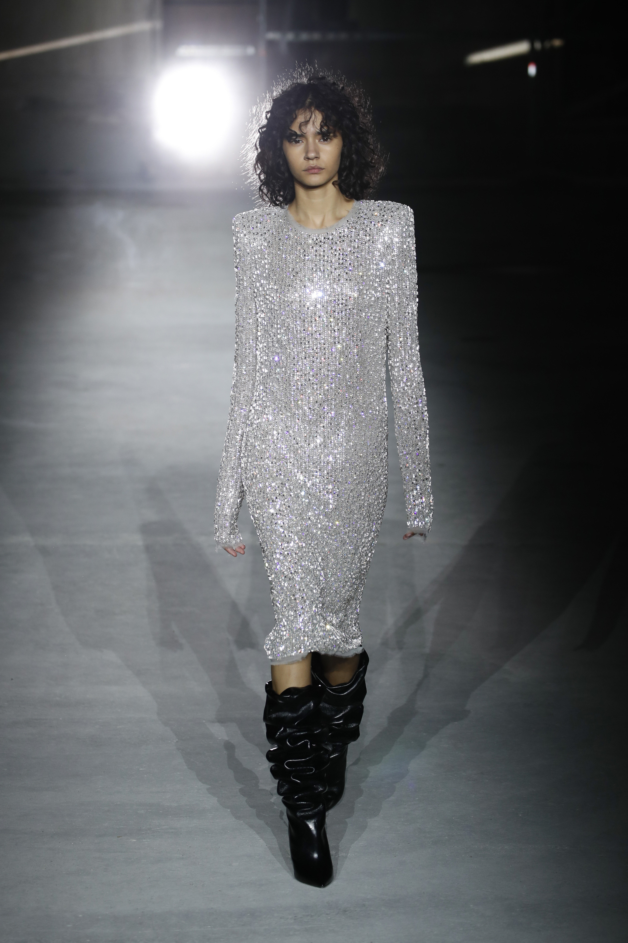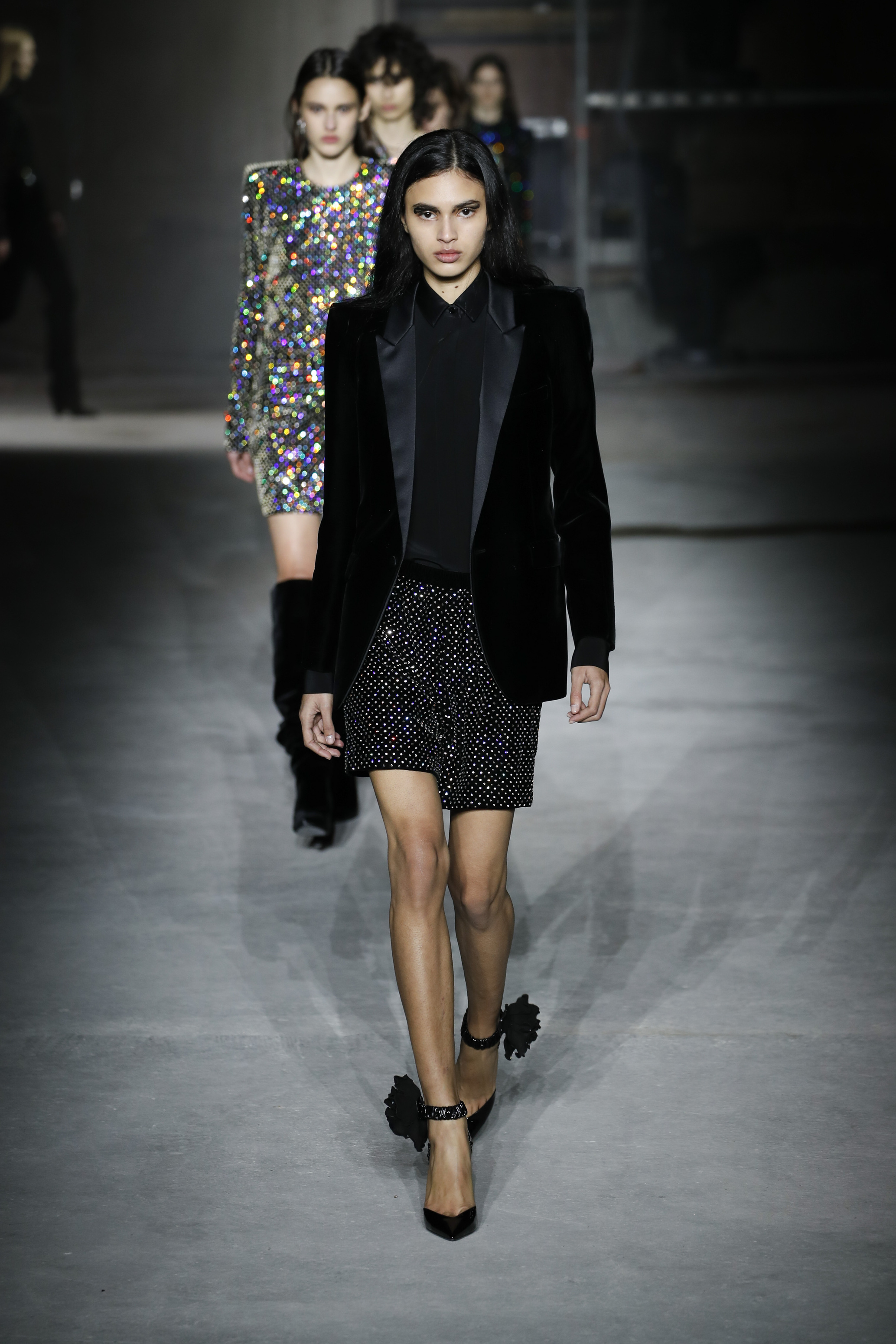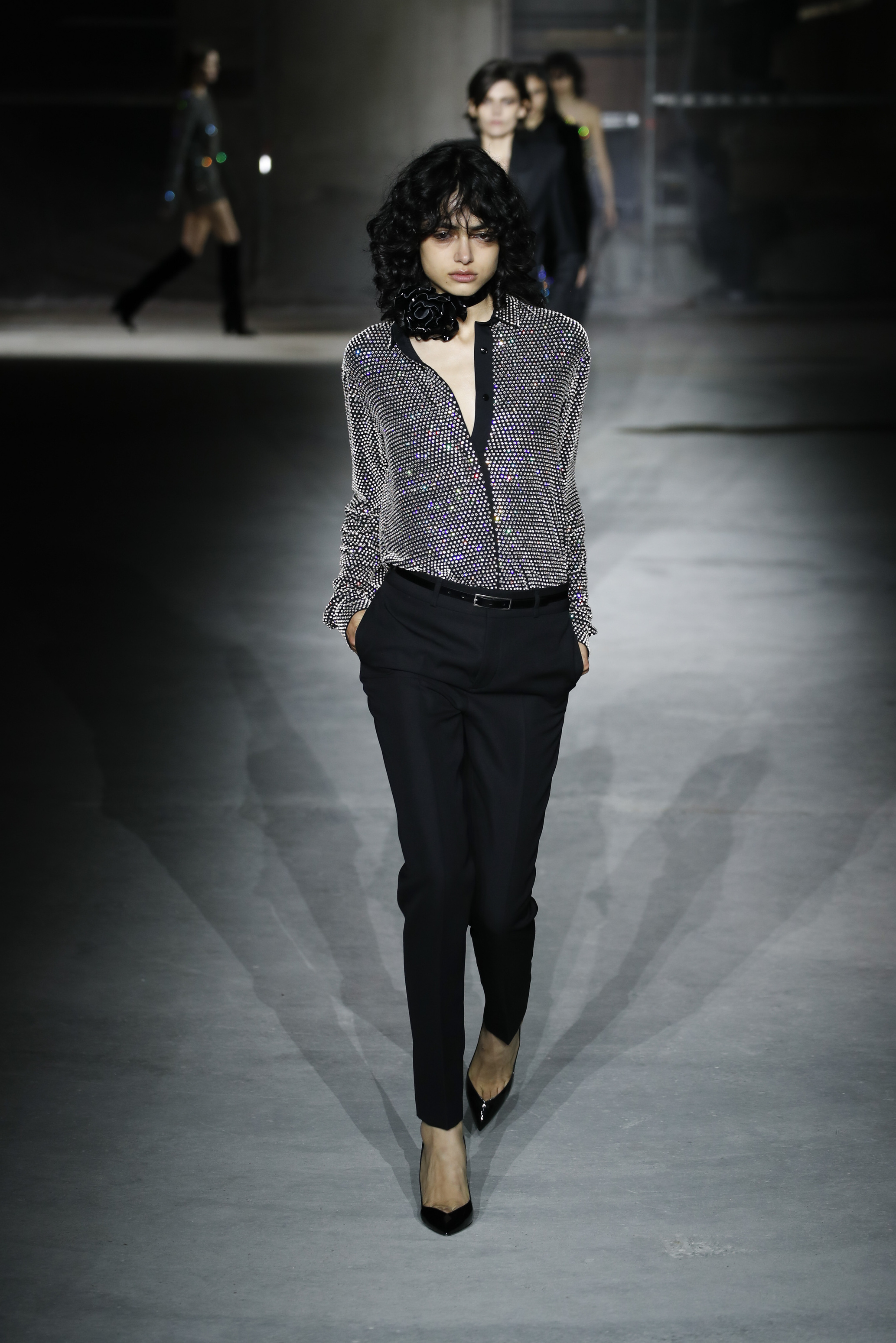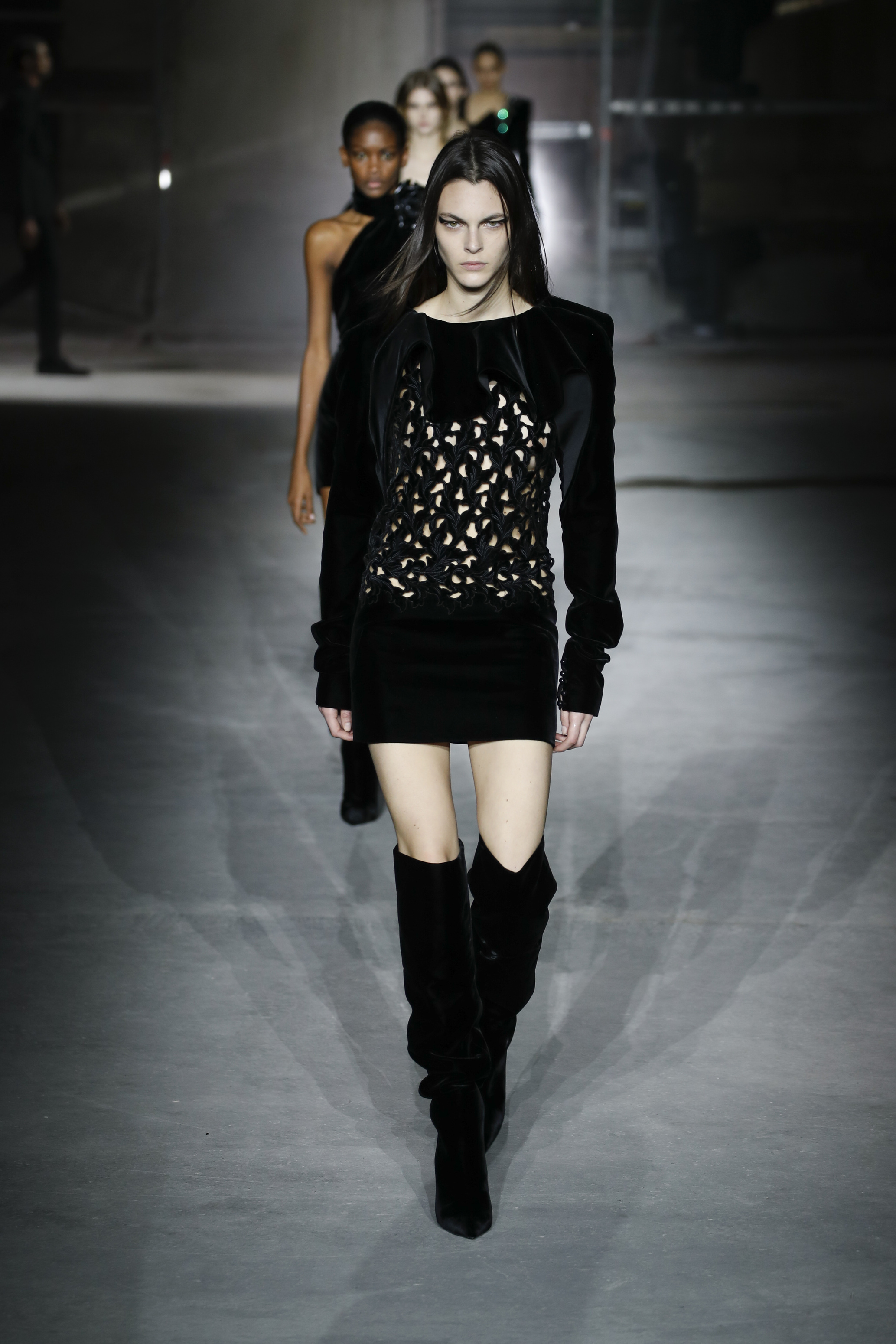 Anthony Vaccarello révèle le couturier à travers cette collection Automne/Hiver dans une atmosphère chic et festive : chemisiers transparents, drapés, tenues de soirée asymétriques, pièces de cuir, bottes froncées… La collection dévoile des silhouettes féminines, masculines et androgynes dans un décor brut.