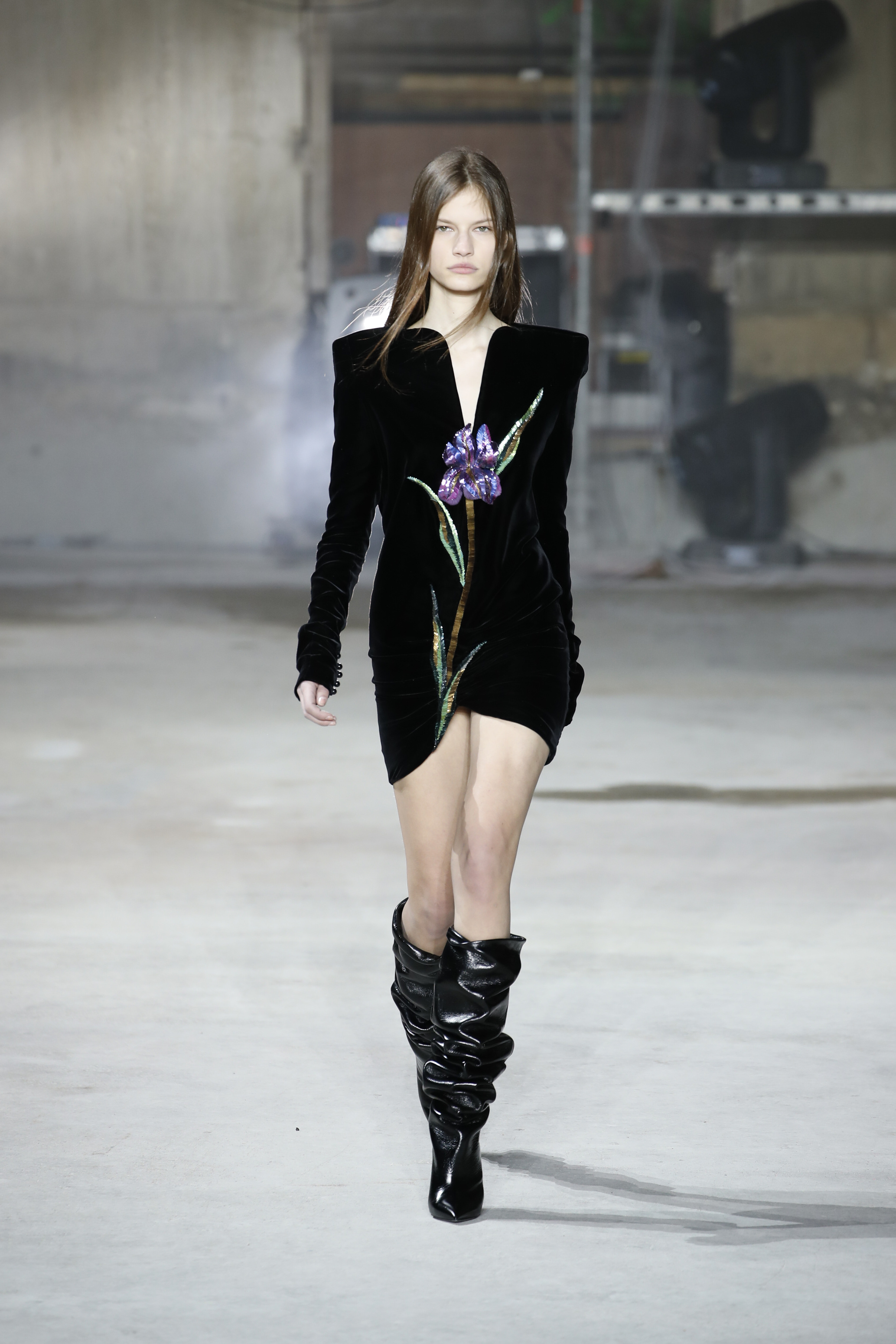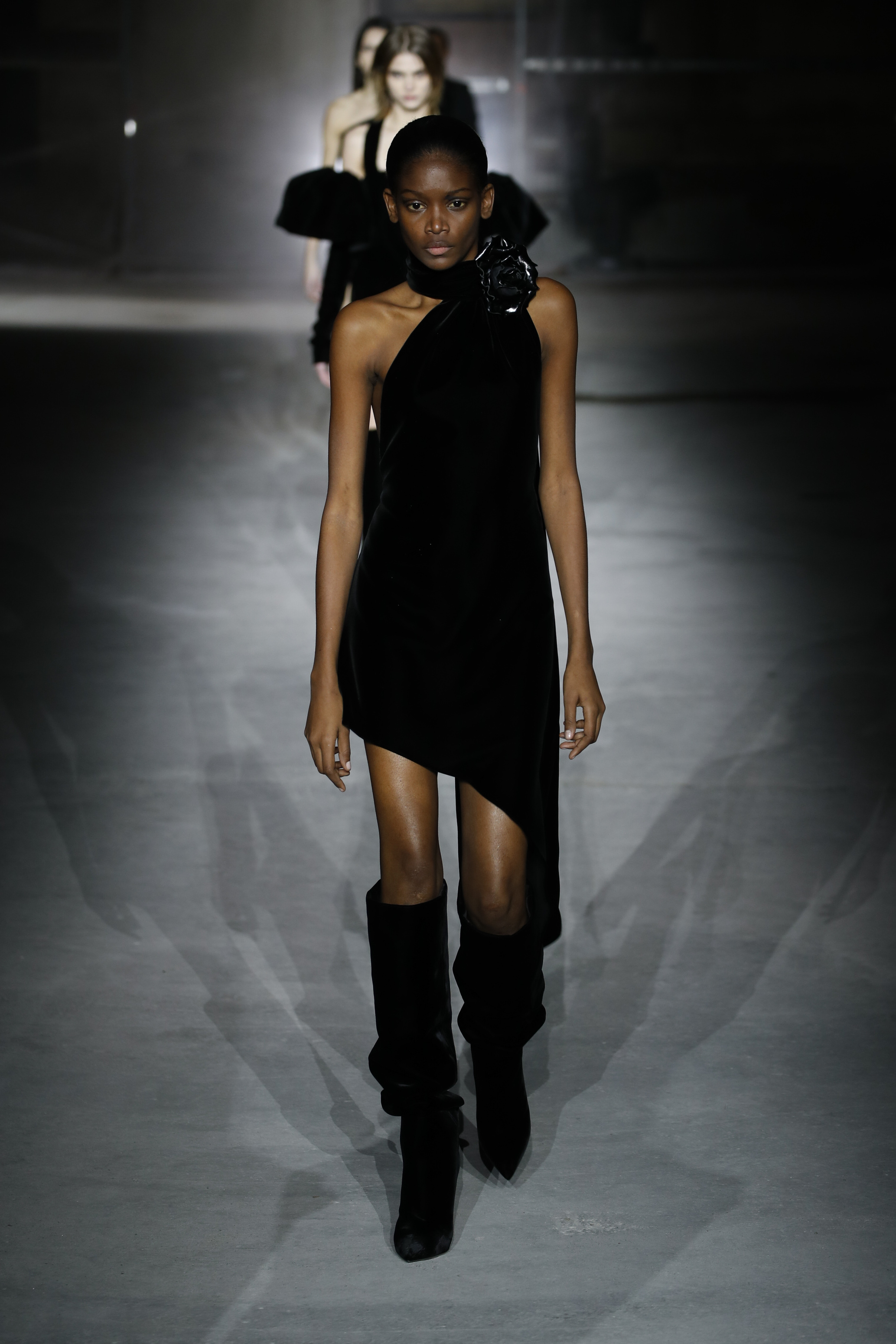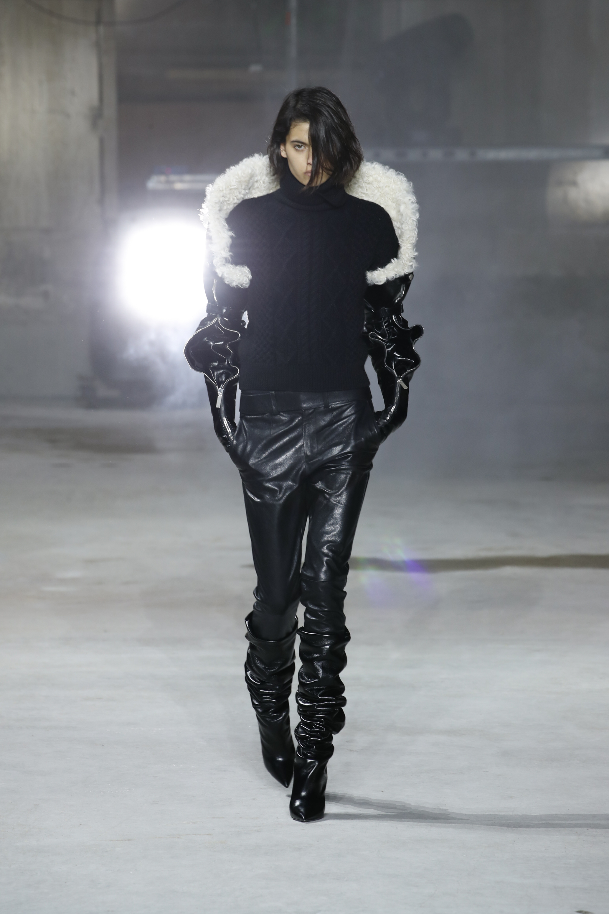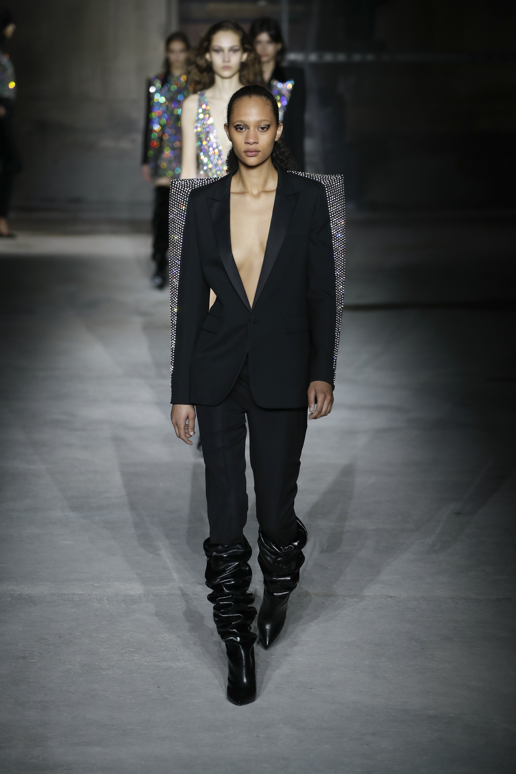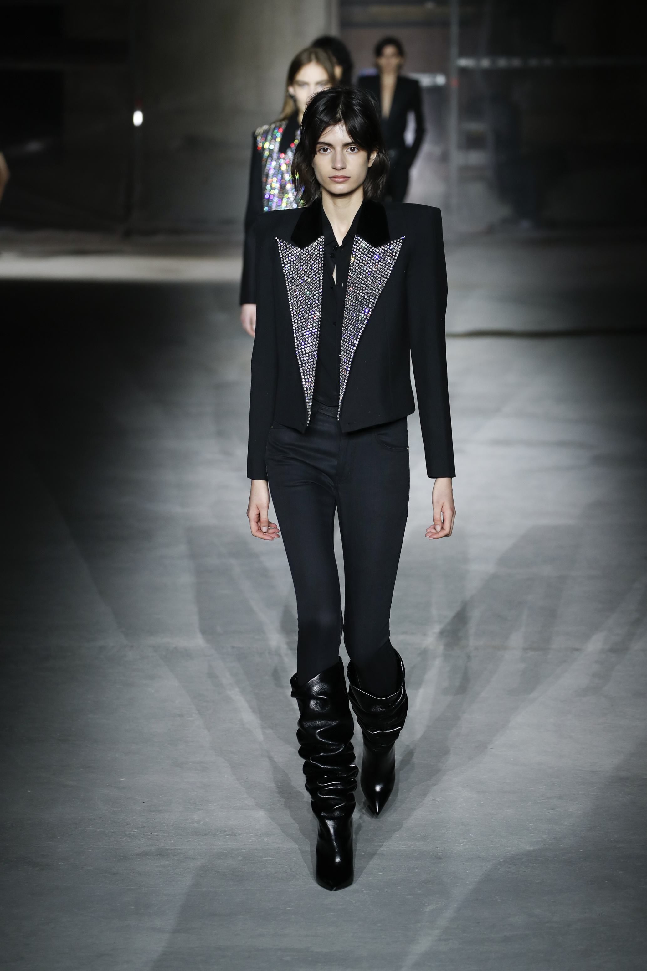 Anthony Vaccarello révèle le couturier à travers cette collection Automne/Hiver dans une atmosphère chic et festive : chemisiers transparents, drapés, tenues de soirée asymétriques, pièces de cuir, bottes froncées… La collection dévoile des silhouettes féminines, masculines et androgynes dans un décor brut.