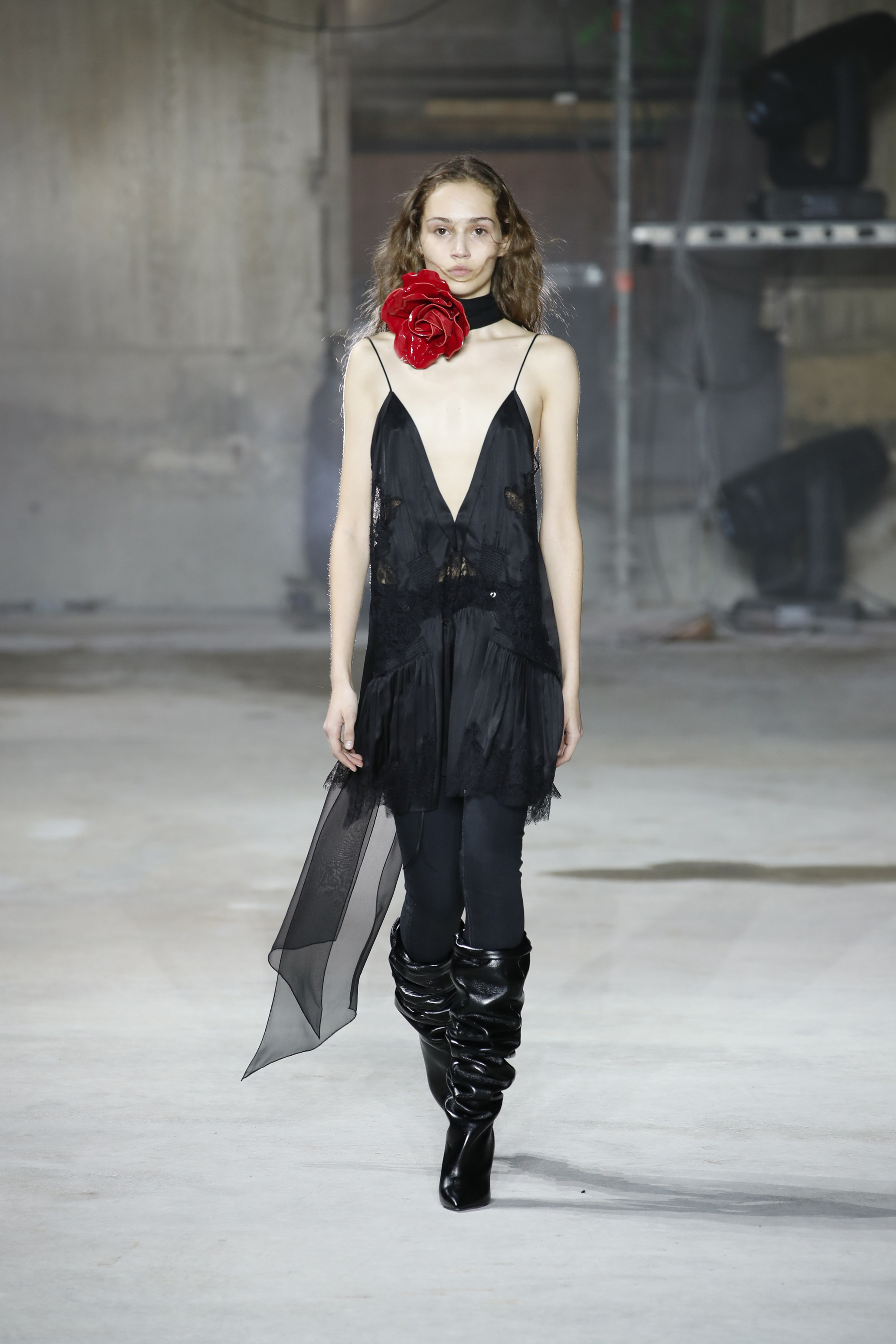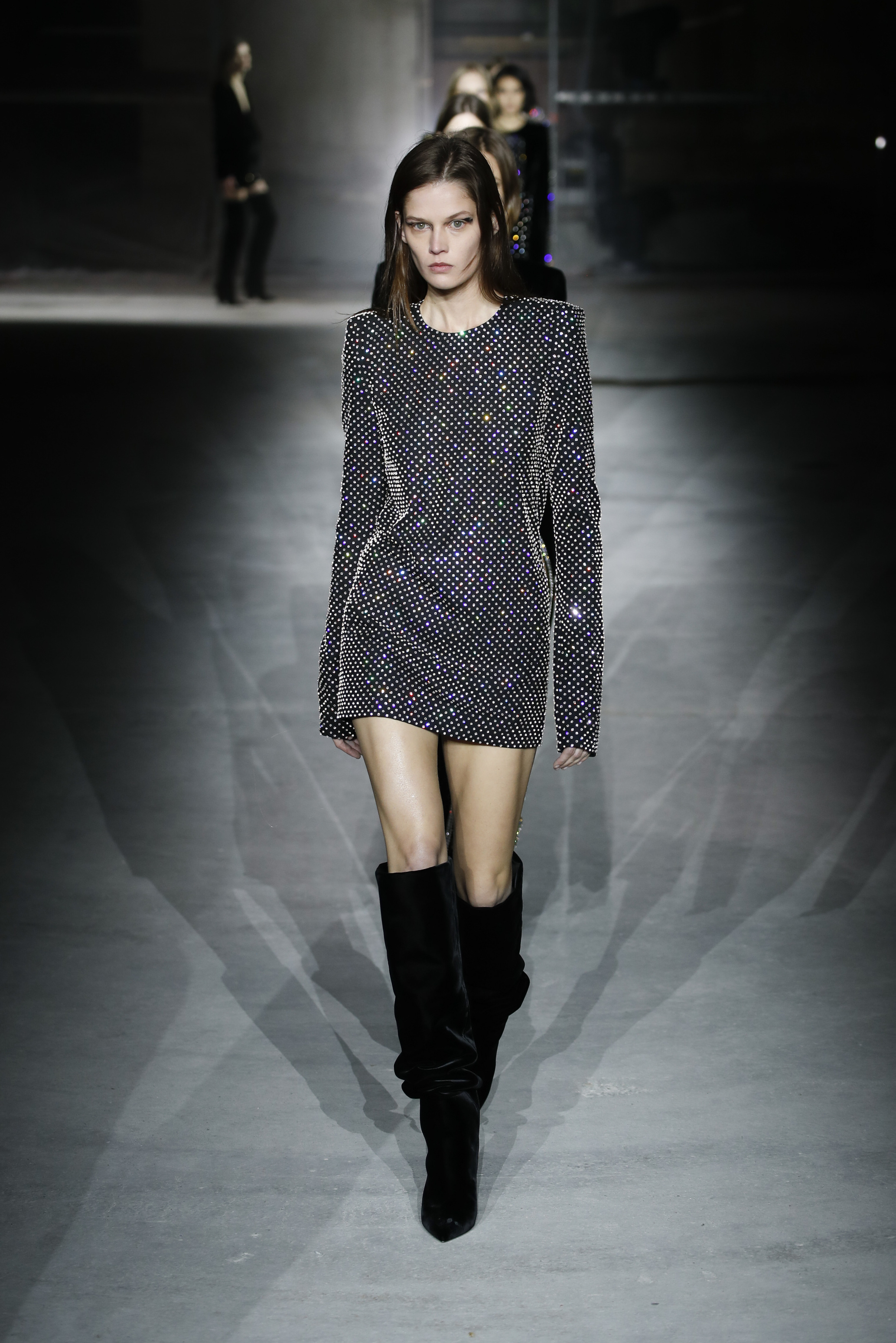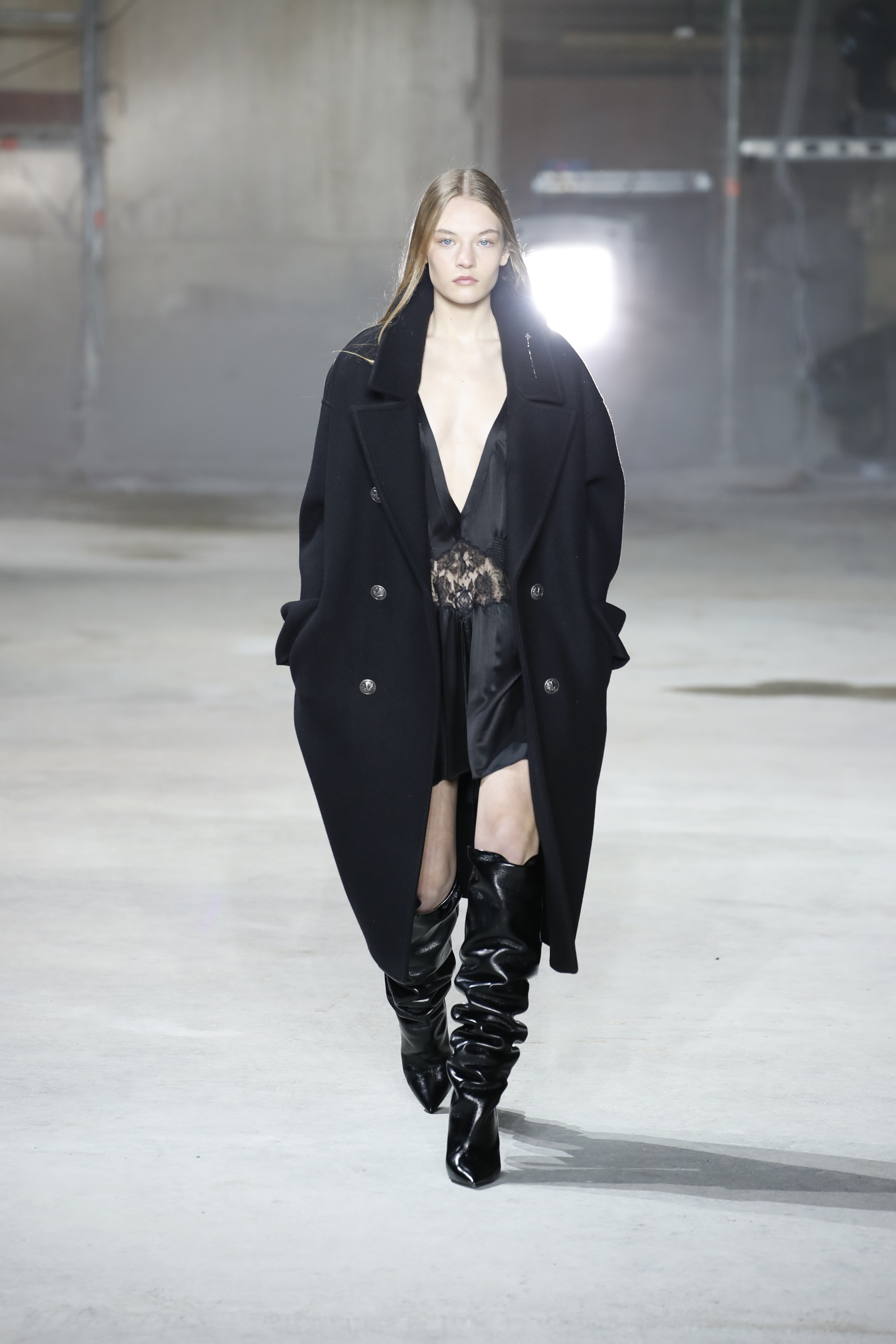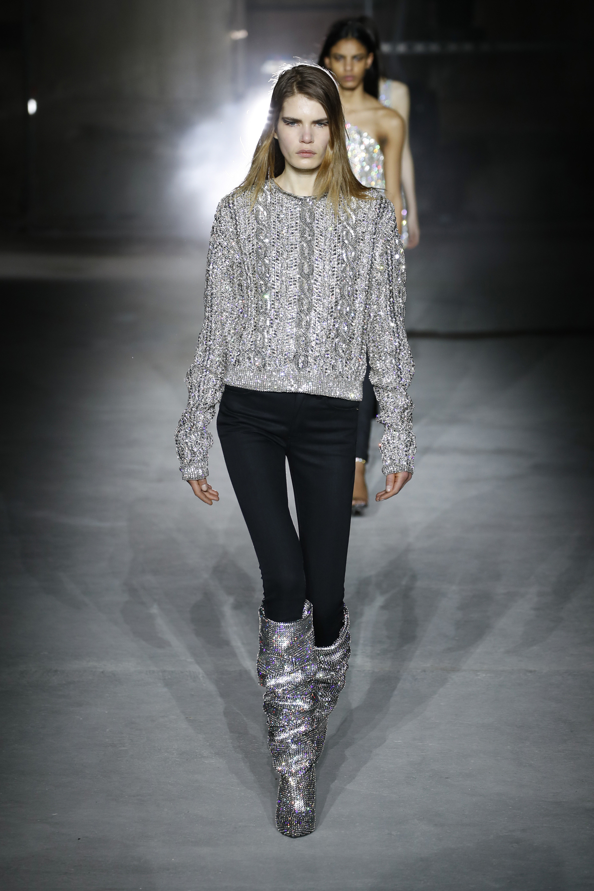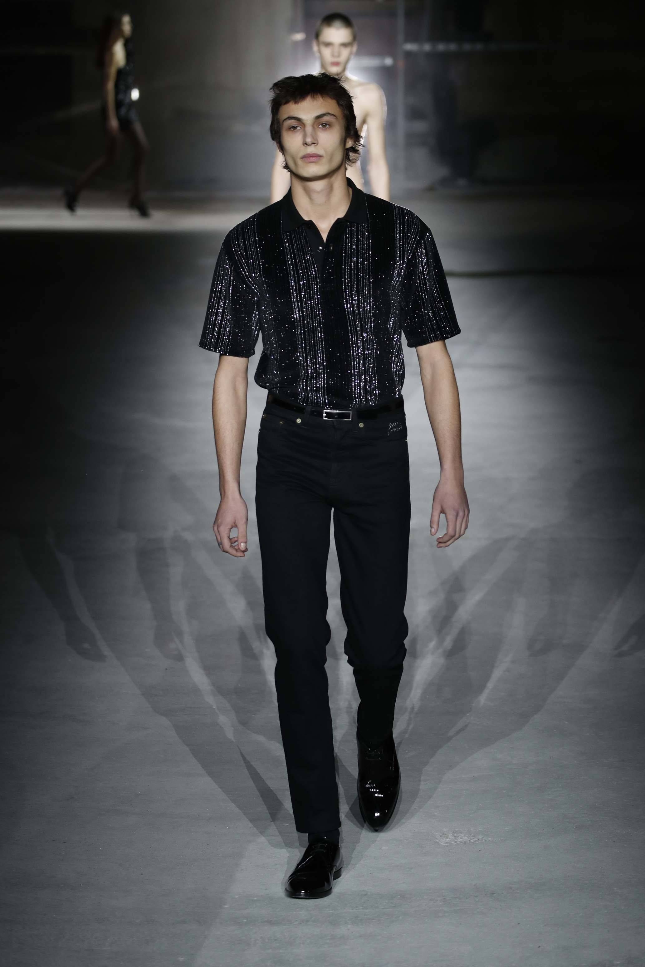 Anthony Vaccarello révèle le couturier à travers cette collection Automne/Hiver dans une atmosphère chic et festive : chemisiers transparents, drapés, tenues de soirée asymétriques, pièces de cuir, bottes froncées… La collection dévoile des silhouettes féminines, masculines et androgynes dans un décor brut.