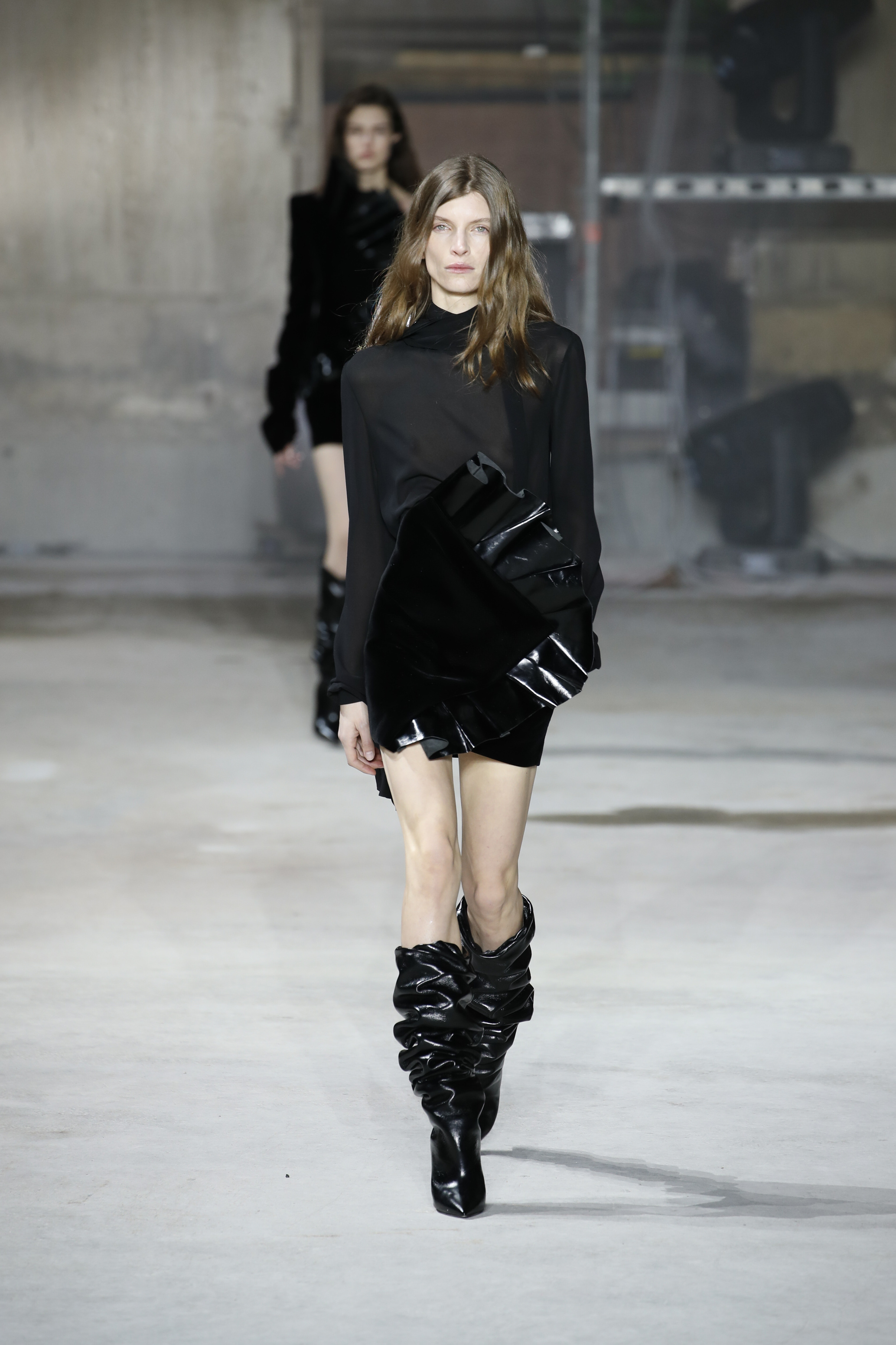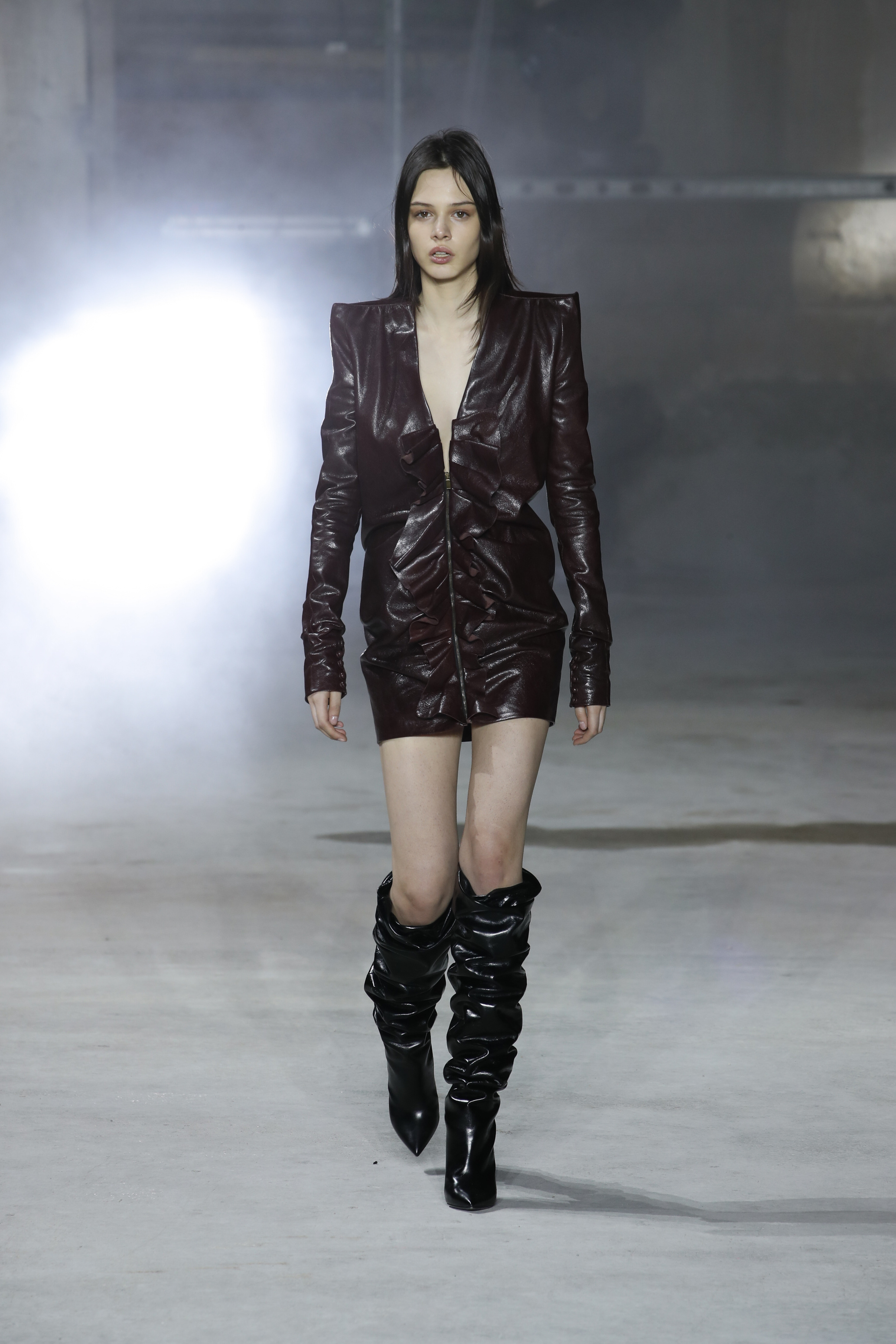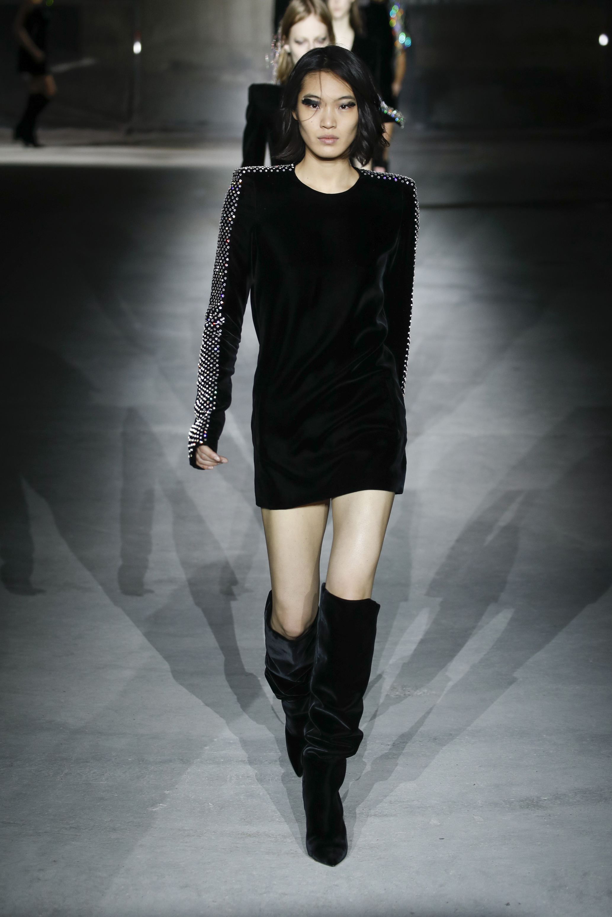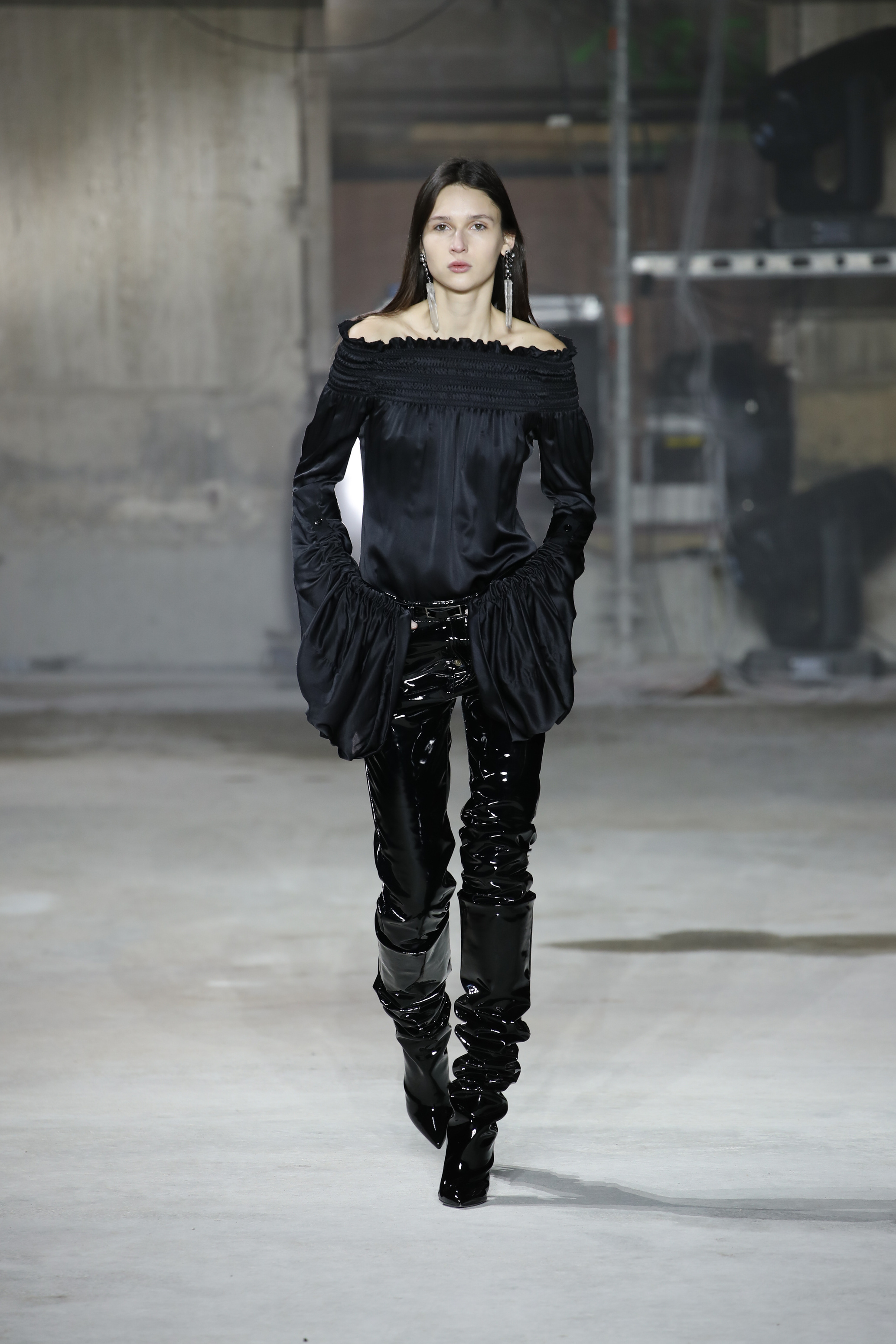 Anthony Vaccarello révèle le couturier à travers cette collection Automne/Hiver dans une atmosphère chic et festive : chemisiers transparents, drapés, tenues de soirée asymétriques, pièces de cuir, bottes froncées… La collection dévoile des silhouettes féminines, masculines et androgynes dans un décor brut.