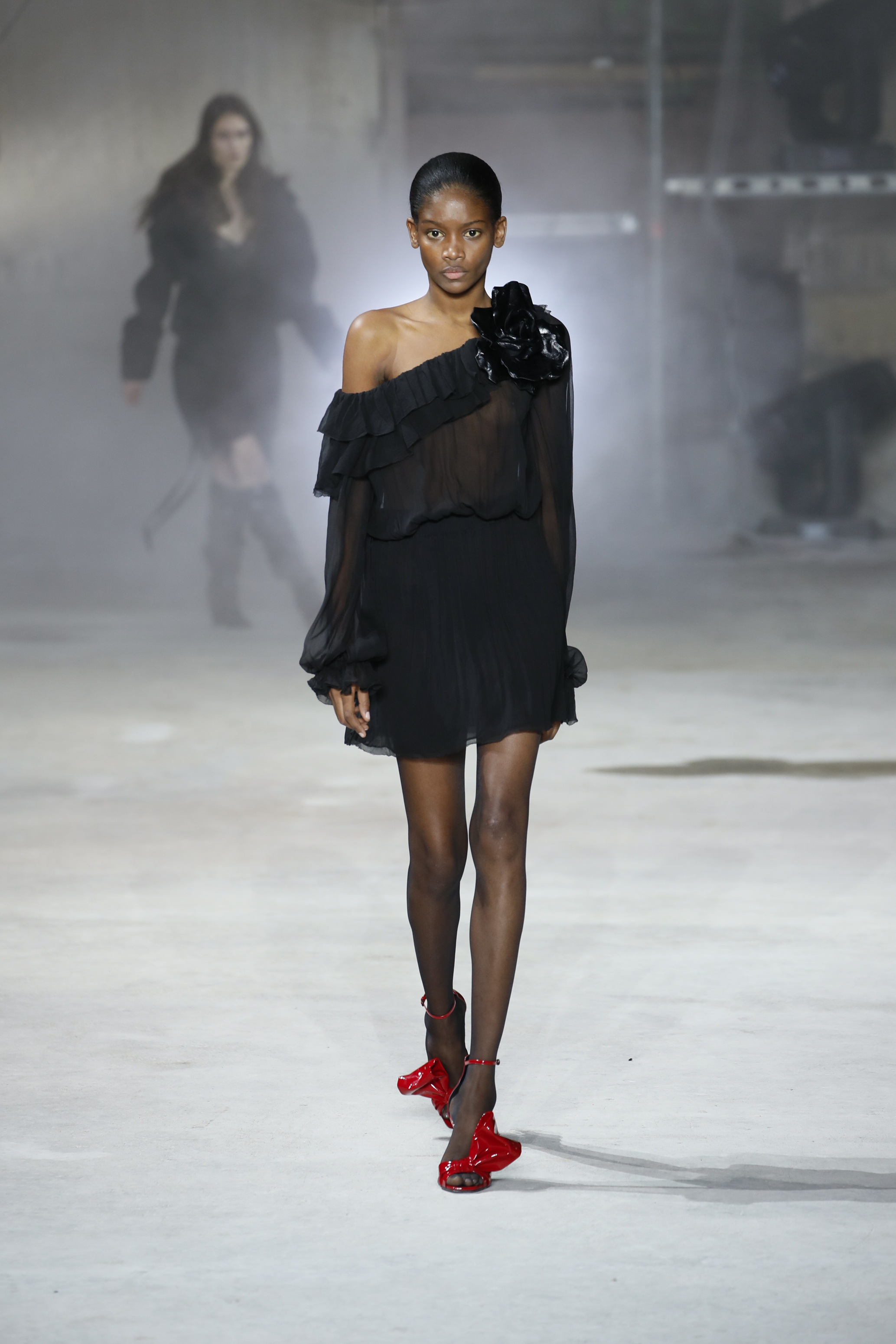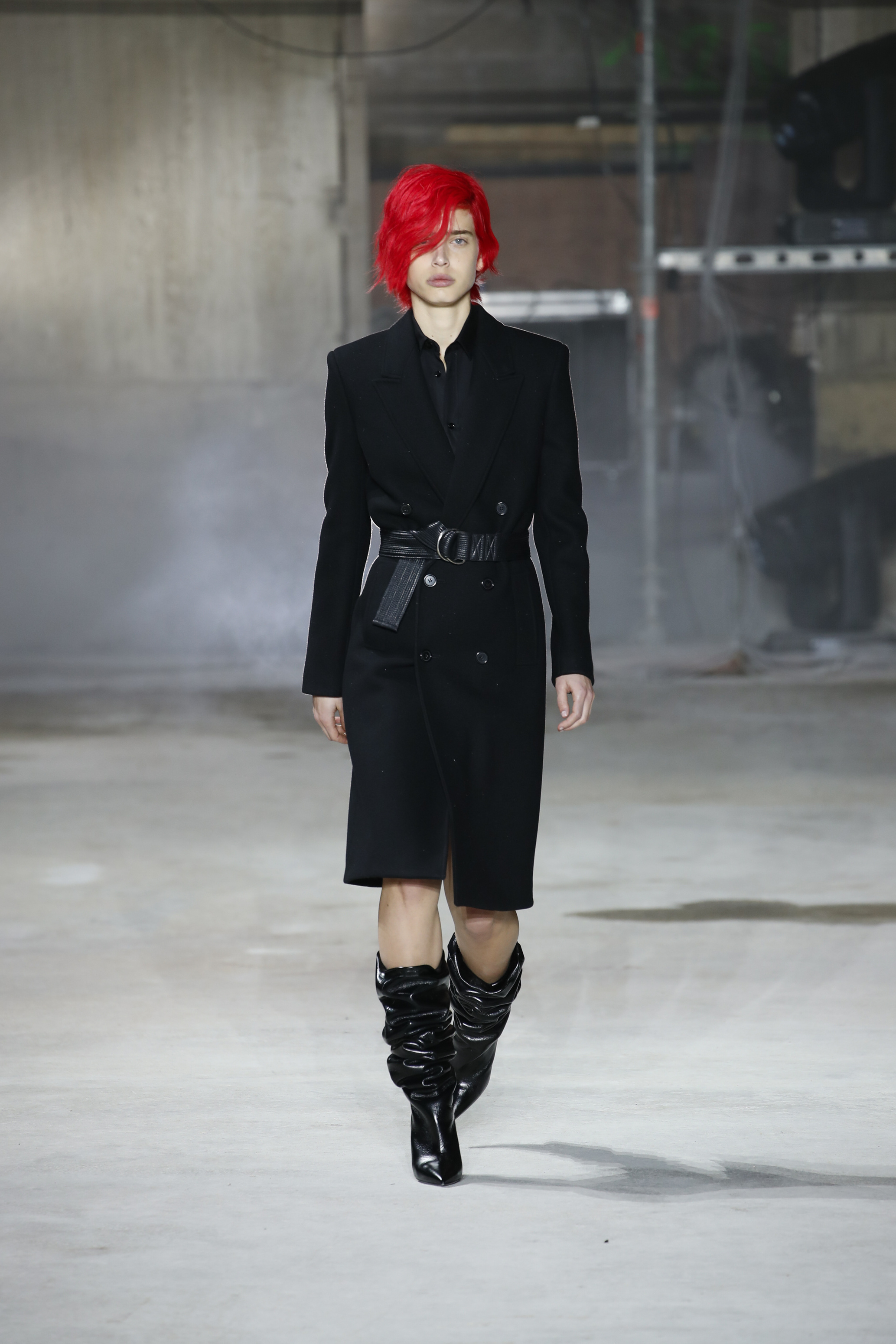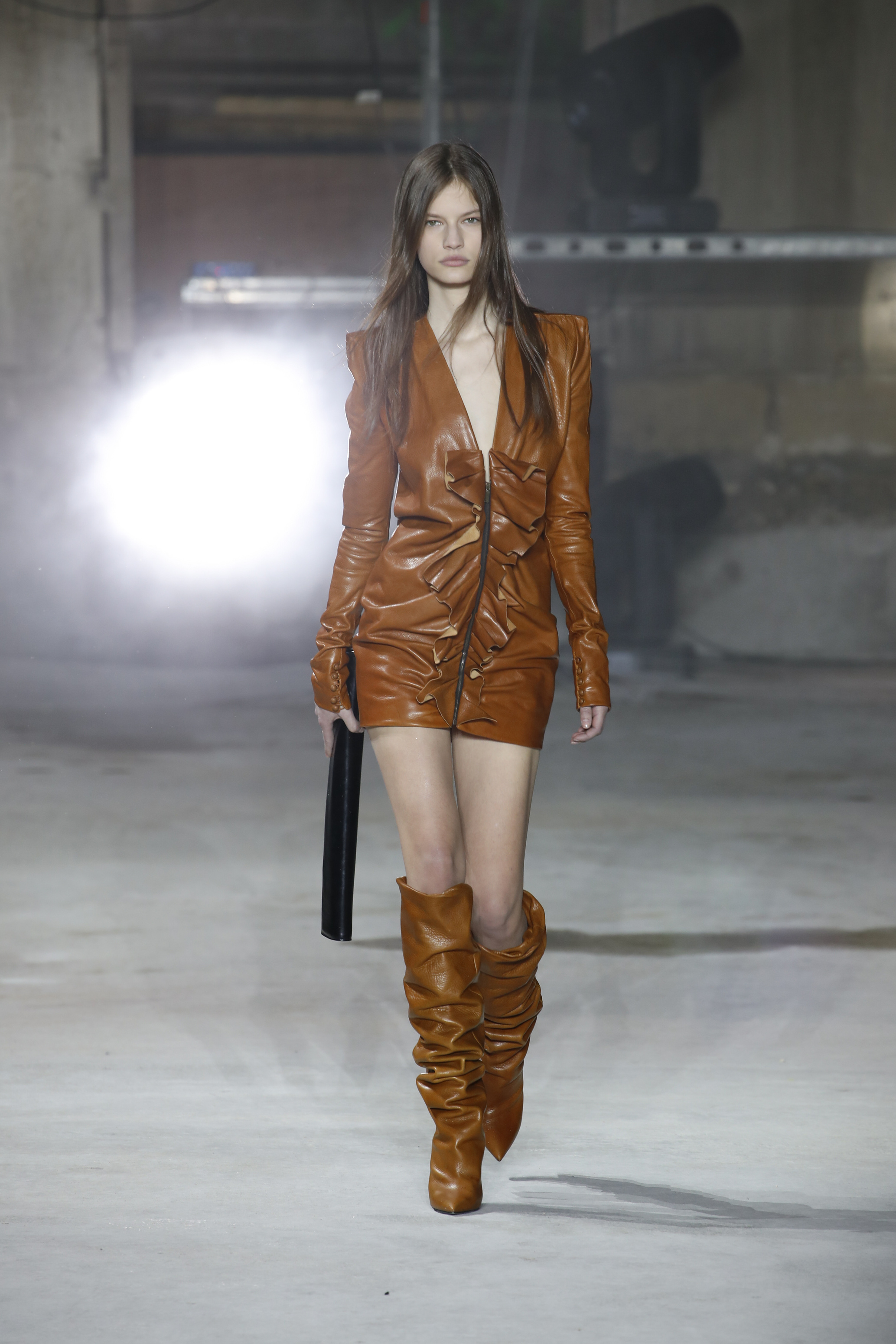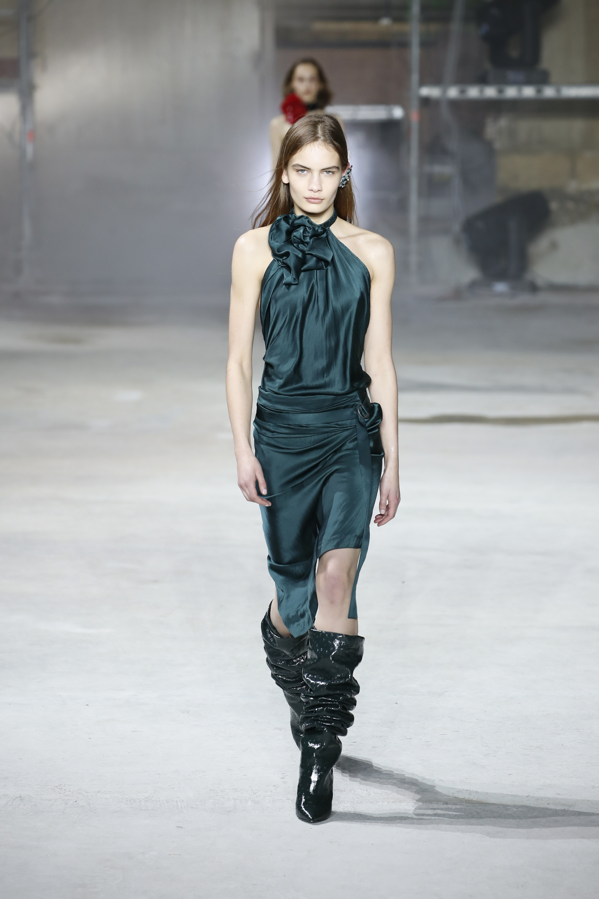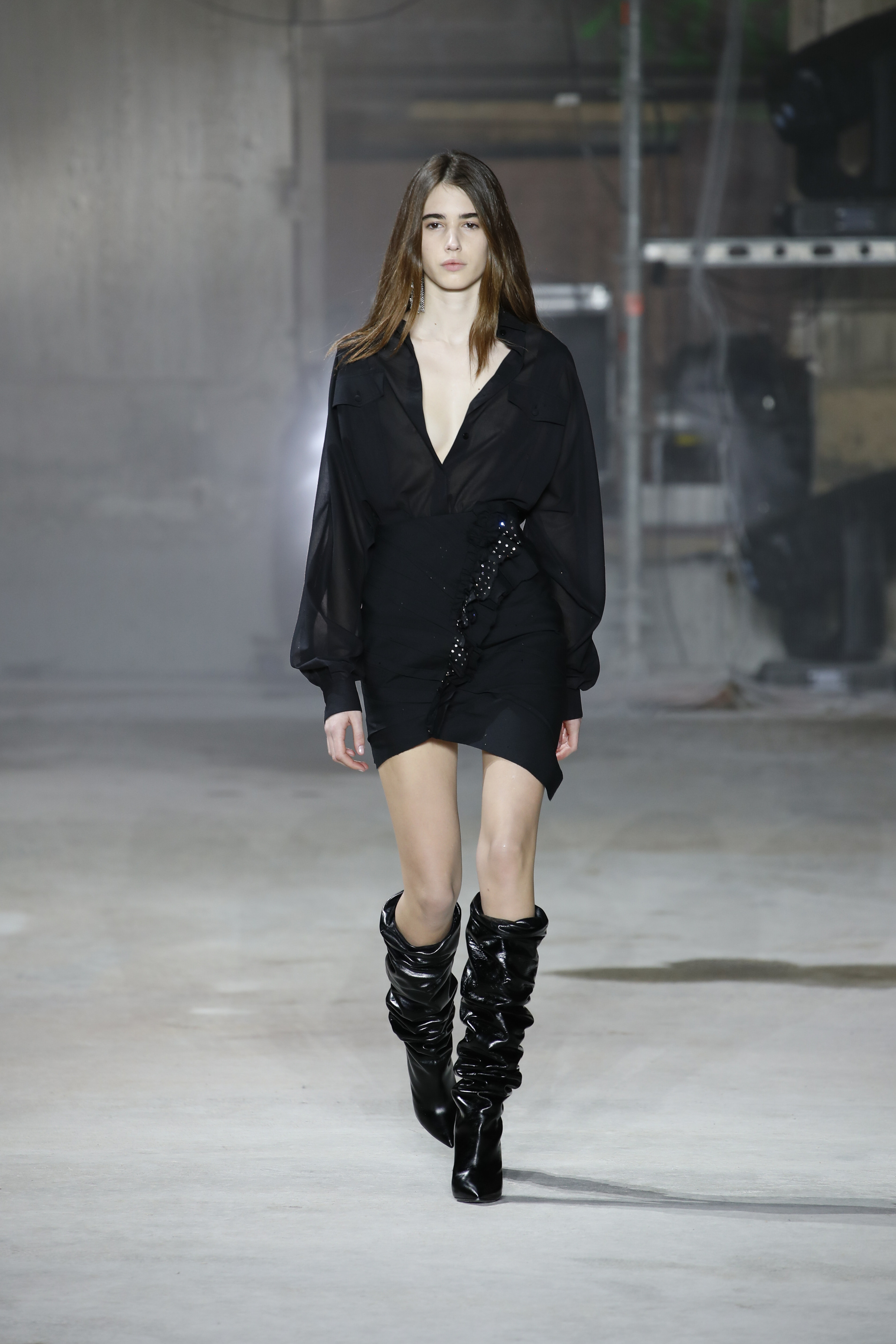 Anthony Vaccarello révèle le couturier à travers cette collection Automne/Hiver dans une atmosphère chic et festive : chemisiers transparents, drapés, tenues de soirée asymétriques, pièces de cuir, bottes froncées… La collection dévoile des silhouettes féminines, masculines et androgynes dans un décor brut.