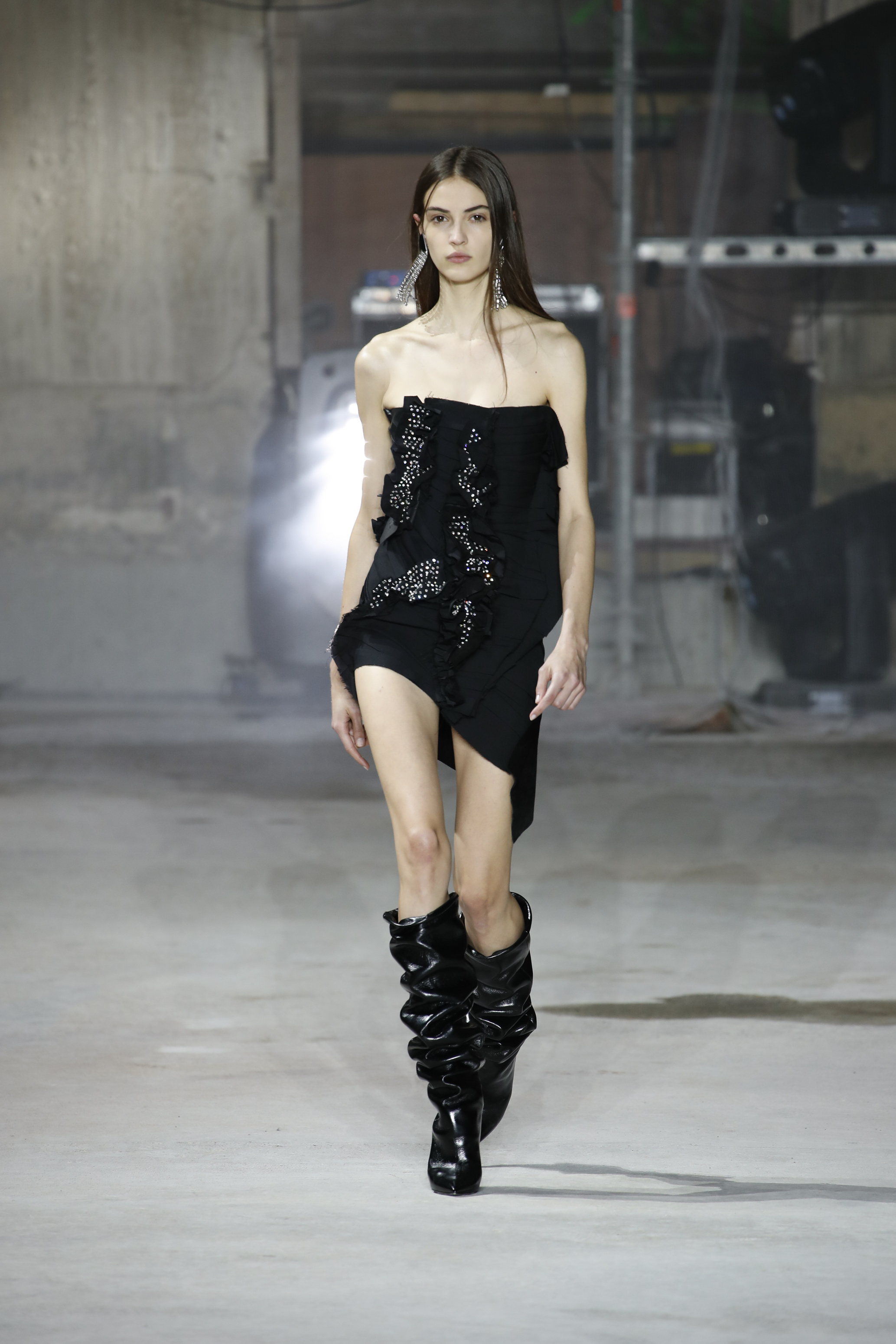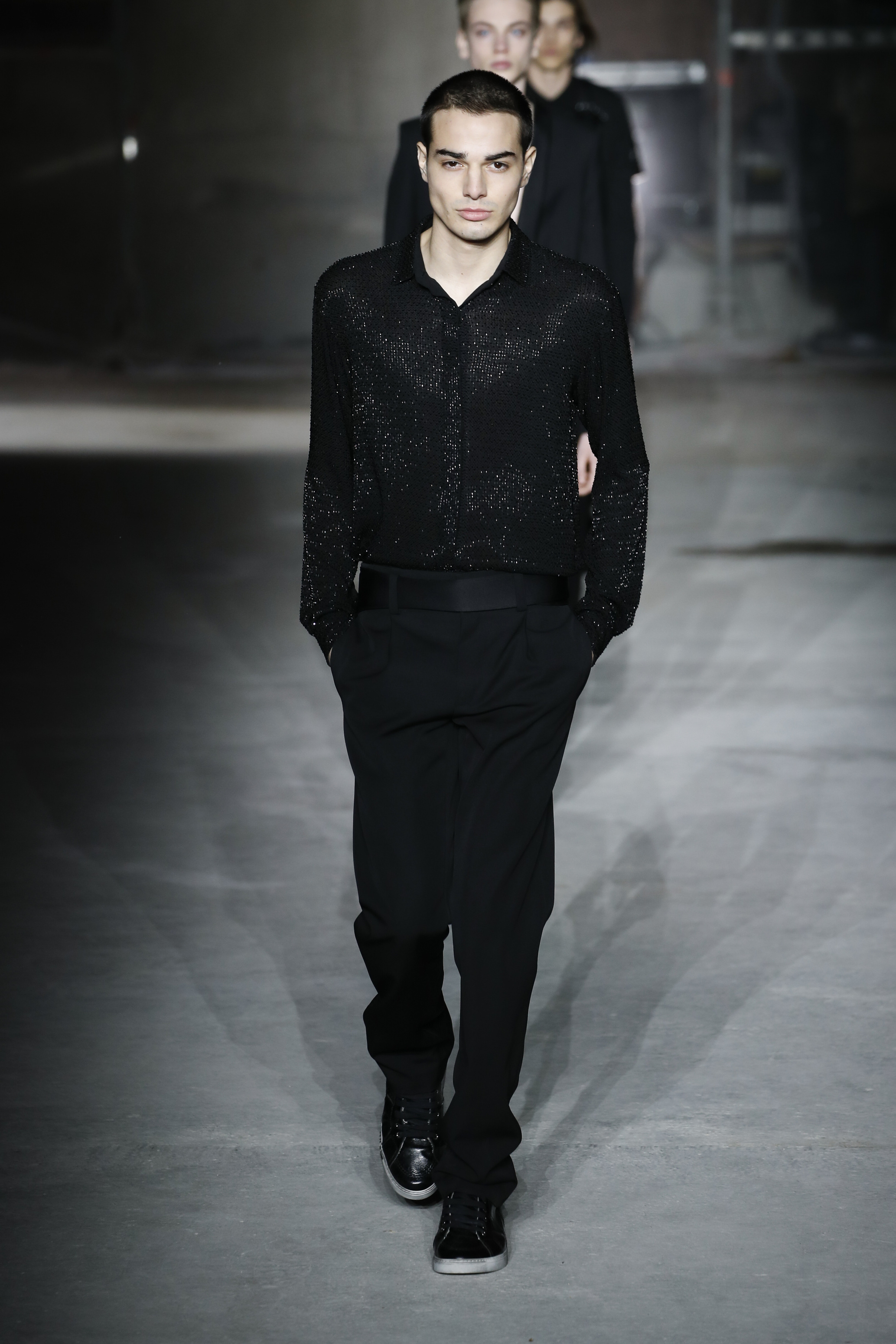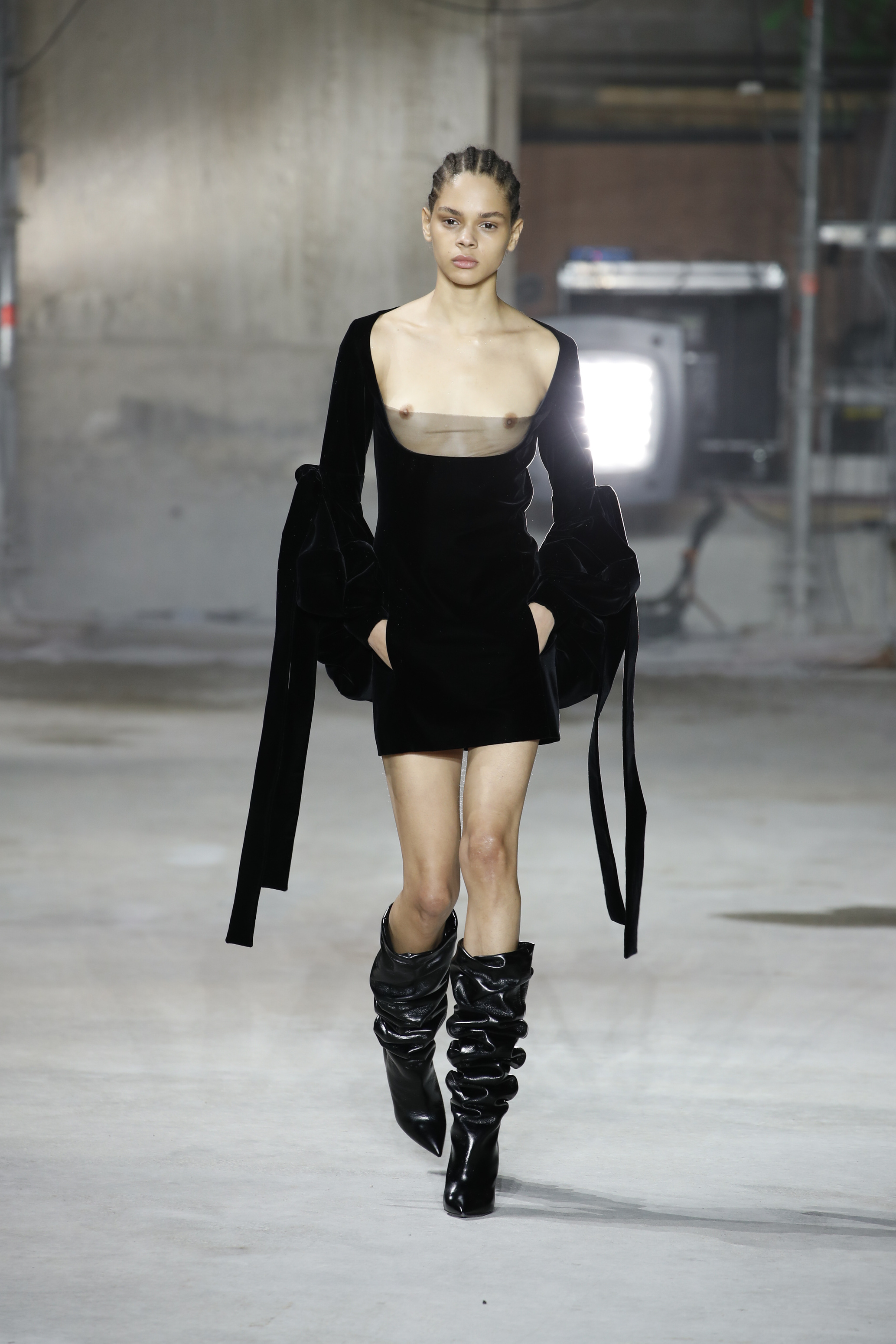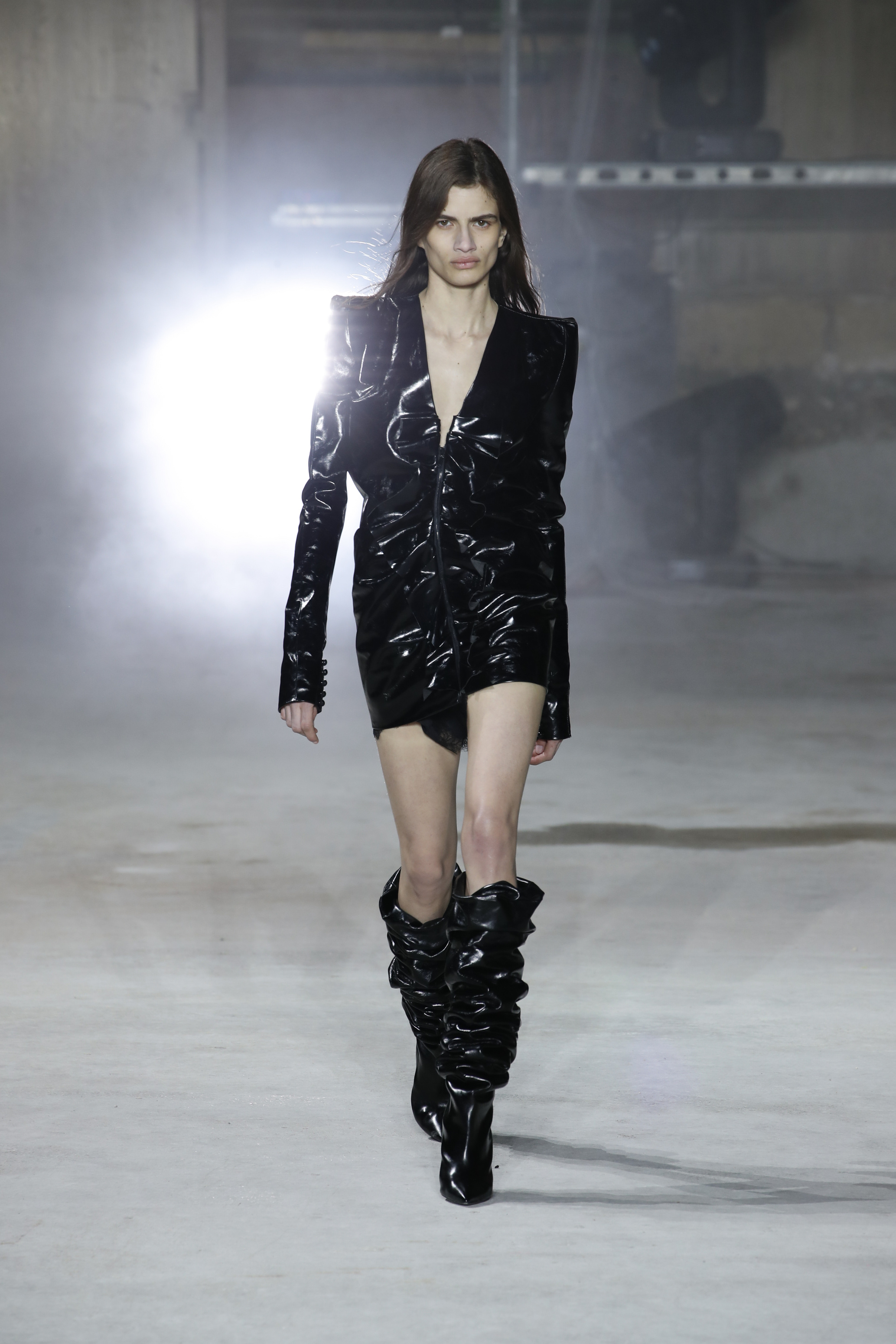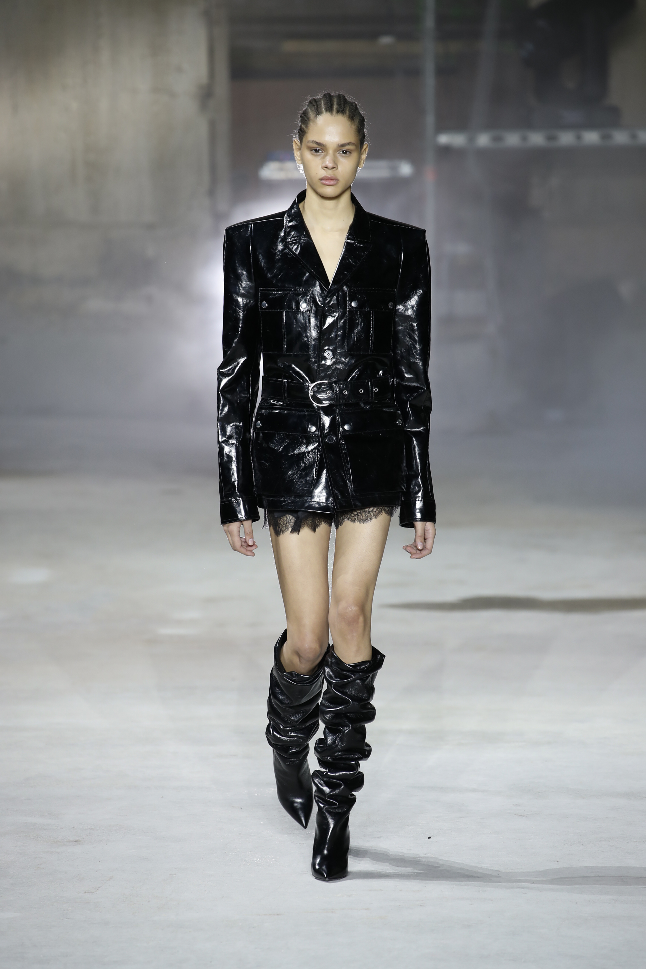 Anthony Vaccarello révèle le couturier à travers cette collection Automne/Hiver dans une atmosphère chic et festive : chemisiers transparents, drapés, tenues de soirée asymétriques, pièces de cuir, bottes froncées… La collection dévoile des silhouettes féminines, masculines et androgynes dans un décor brut.